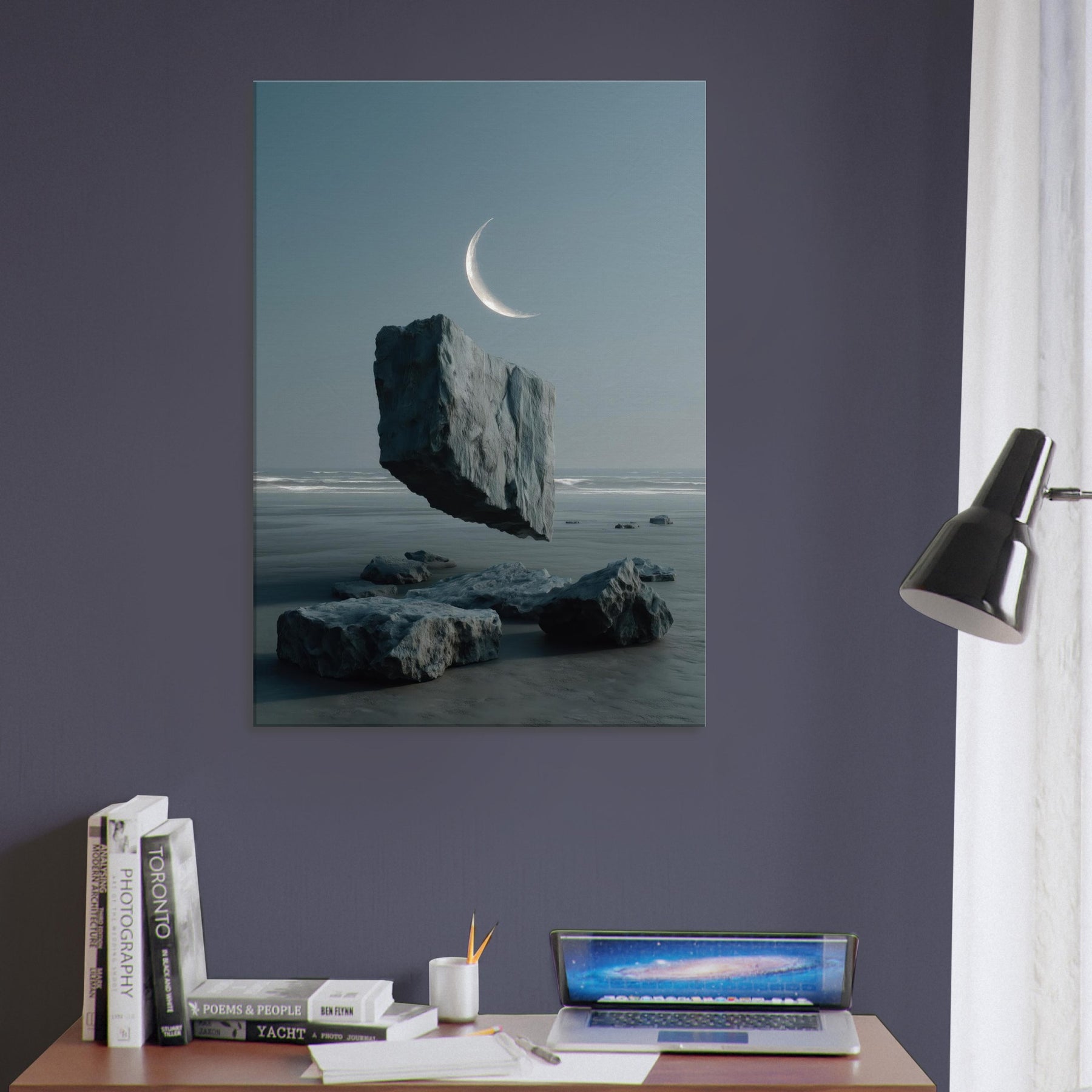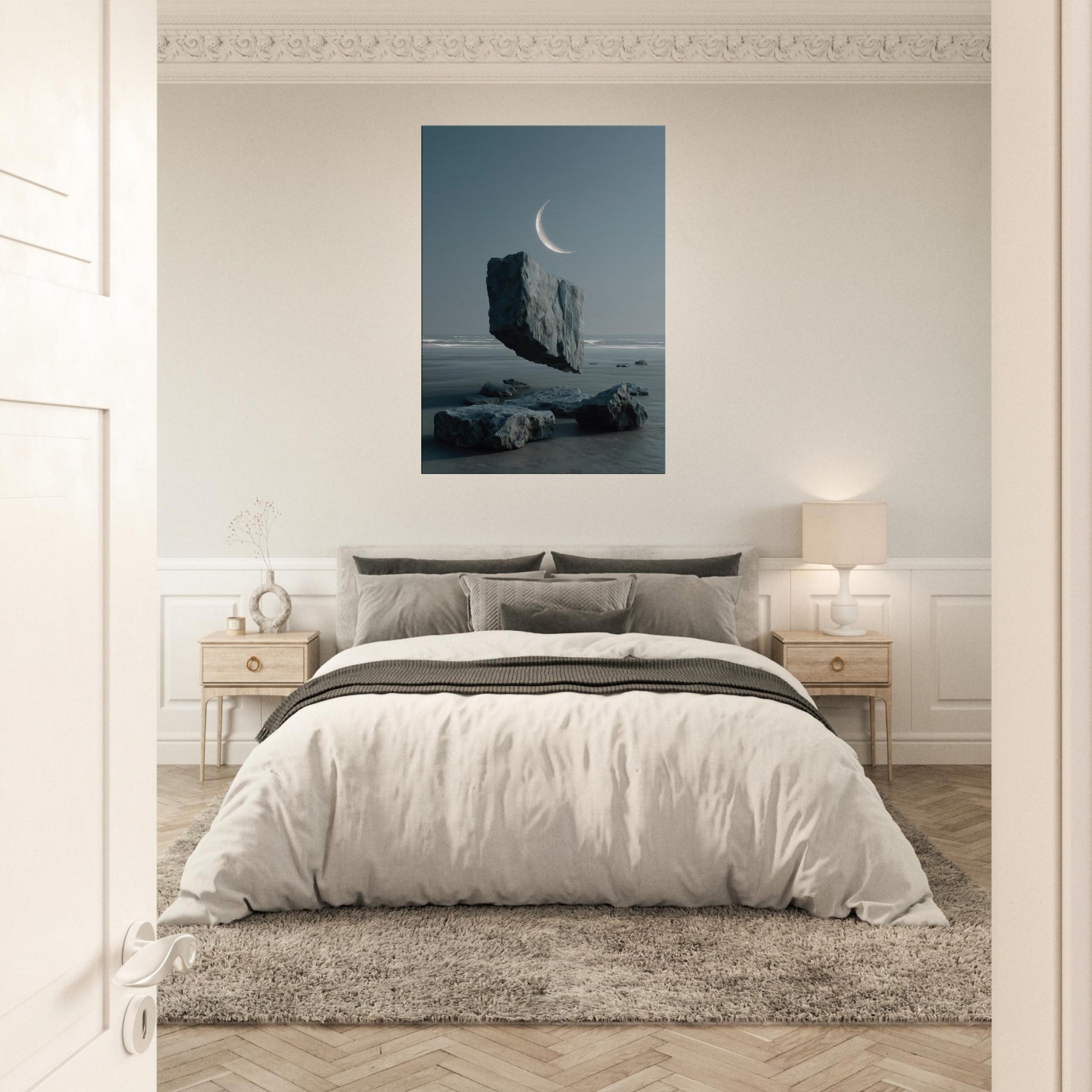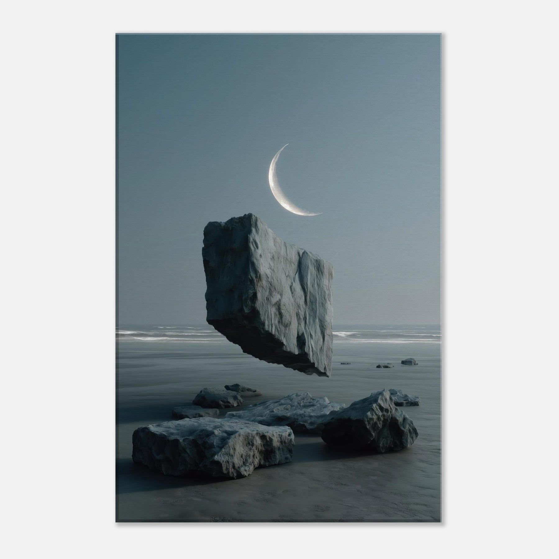 Under a whisper of wind, Savannah appears in a dreamscape where a solitary boulder floats above glassy water, tethered to the horizon by a pale crescent. This surreal moment fuses earth and sky, inviting calm contemplation and a breath of salt air into the room. The cool blues and muted grays glow with quiet imagination, turning any living space into a shoreline of memory expansive, serene, and beautifully balanced.