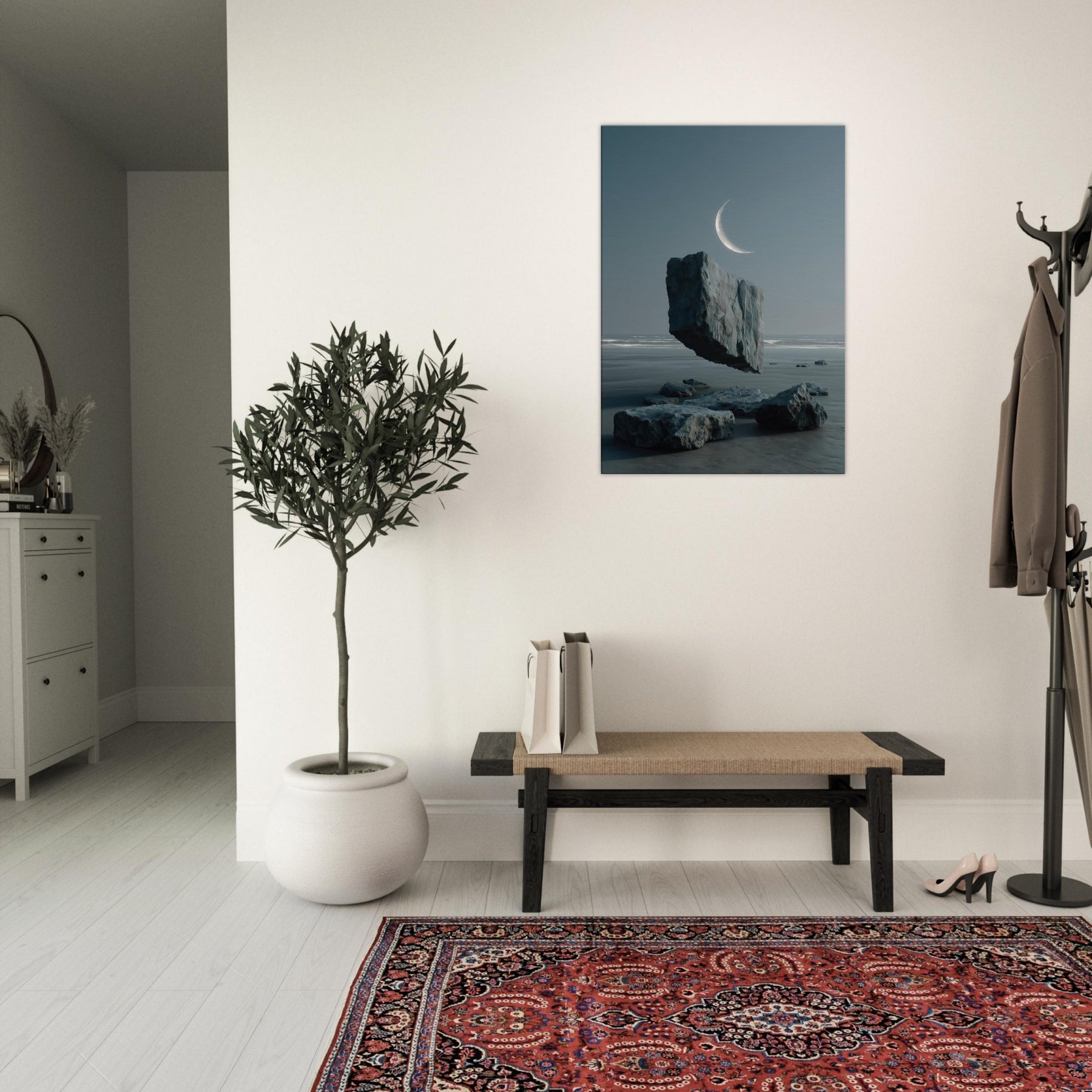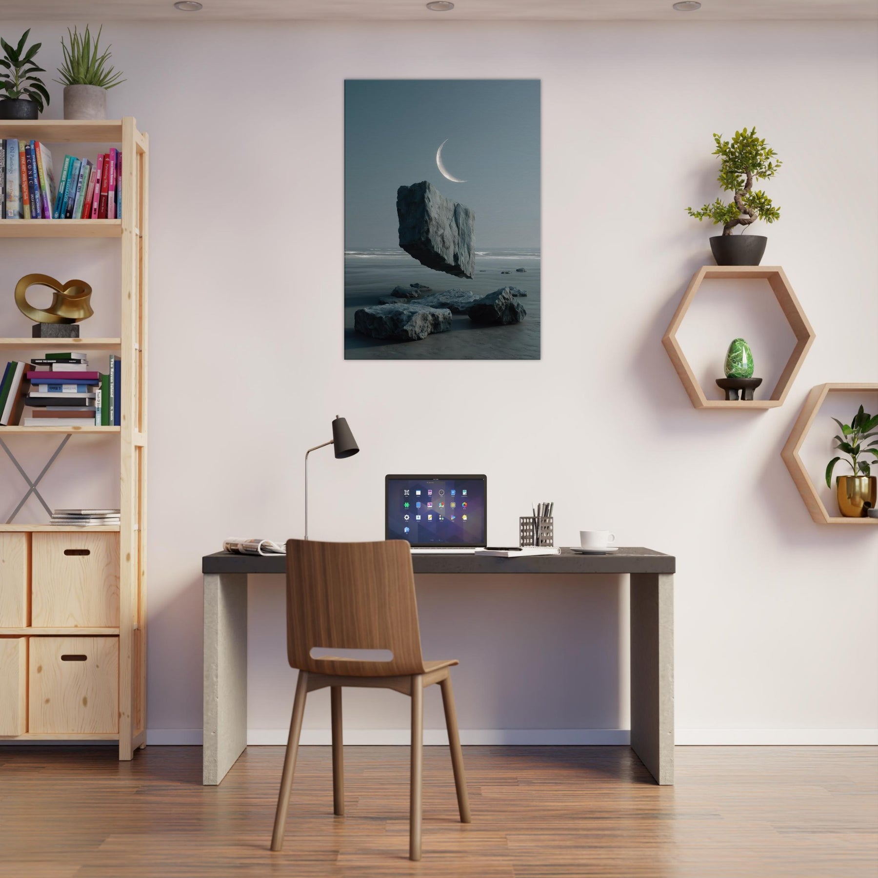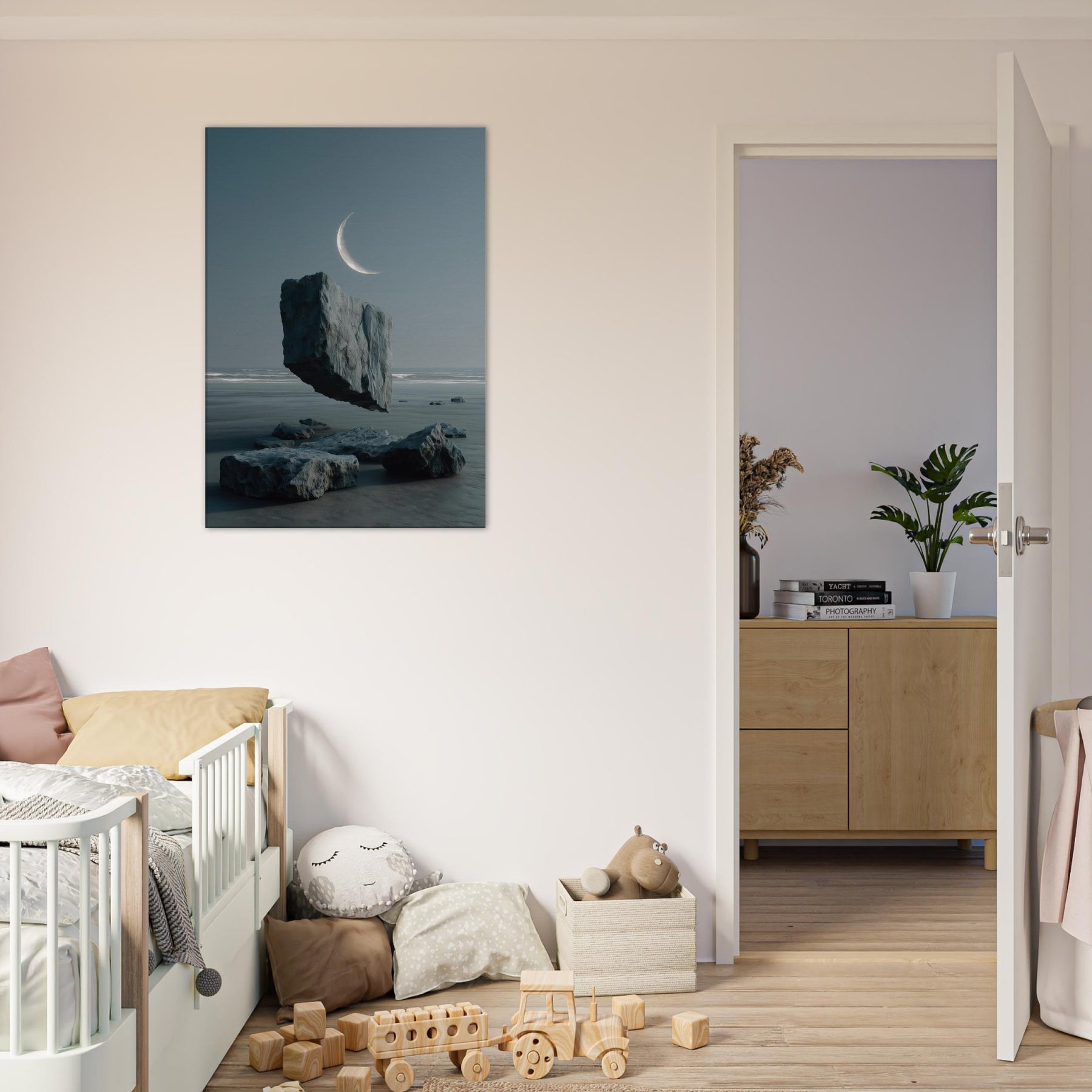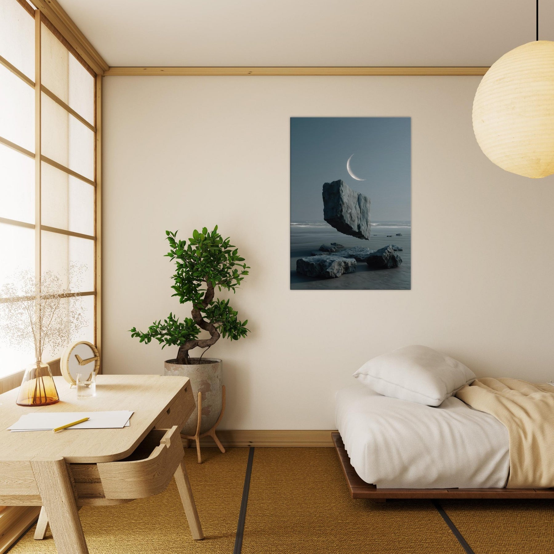 Under a whisper of wind, Savannah appears in a dreamscape where a solitary boulder floats above glassy water, tethered to the horizon by a pale crescent. This surreal moment fuses earth and sky, inviting calm contemplation and a breath of salt air into the room. The cool blues and muted grays glow with quiet imagination, turning any living space into a shoreline of memory expansive, serene, and beautifully balanced.
