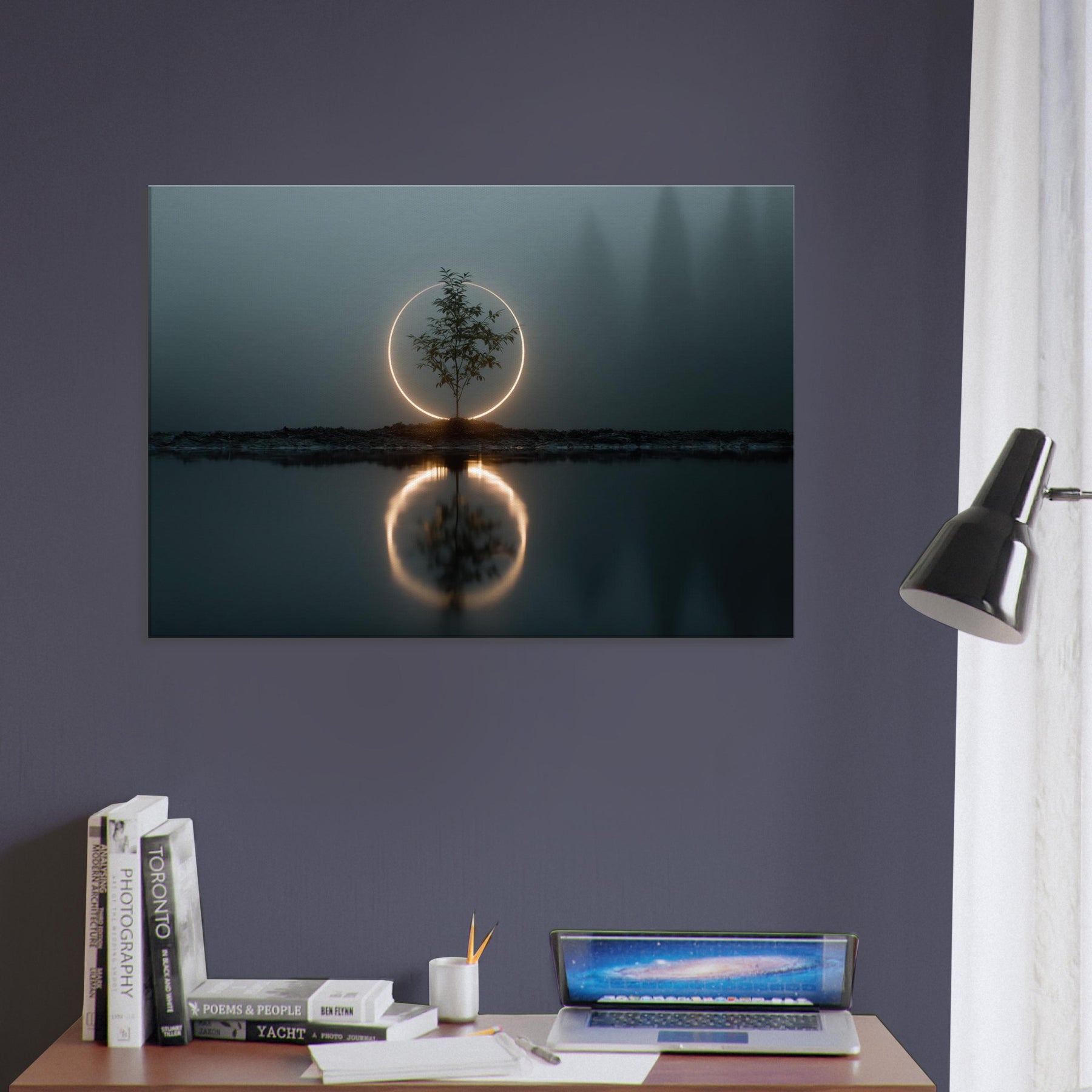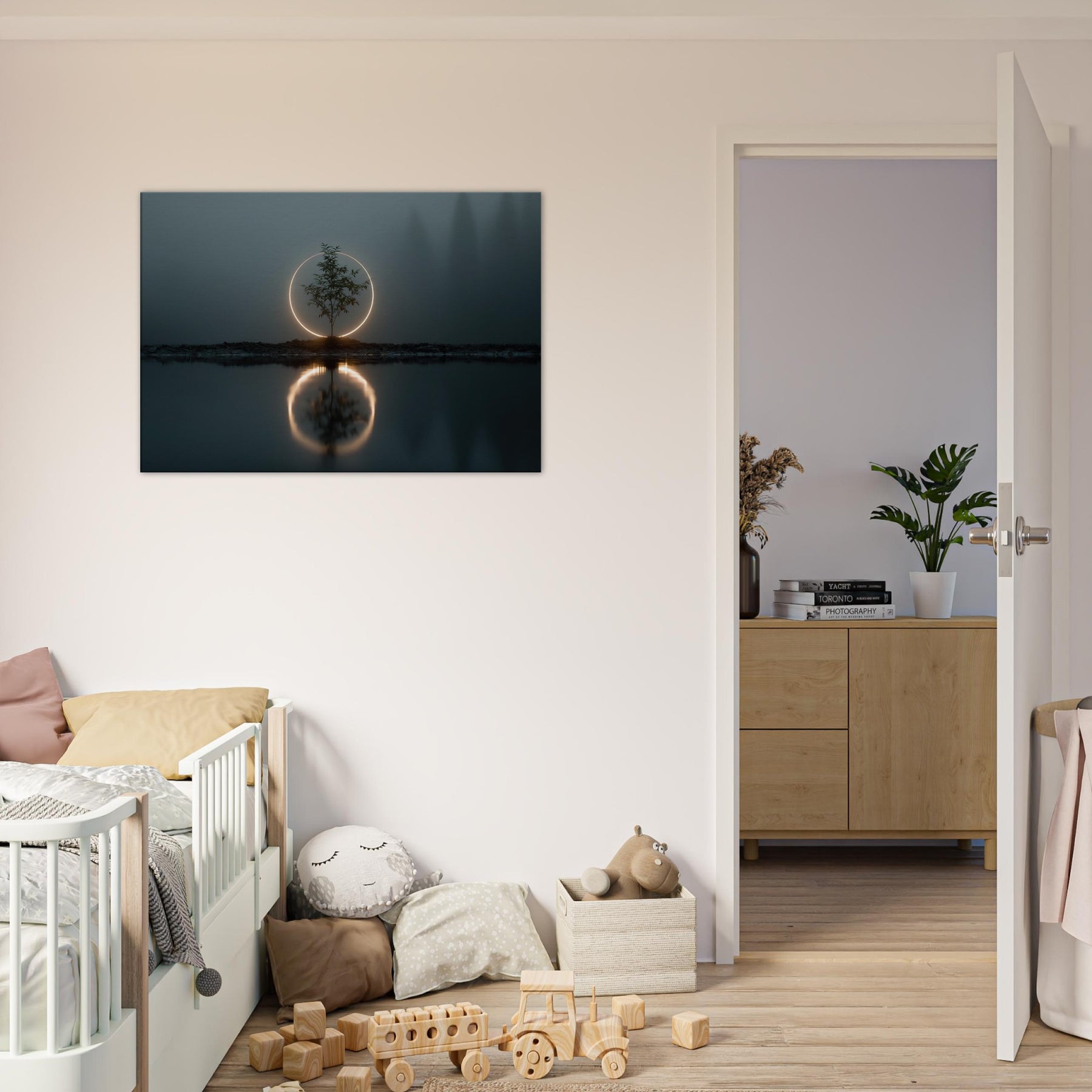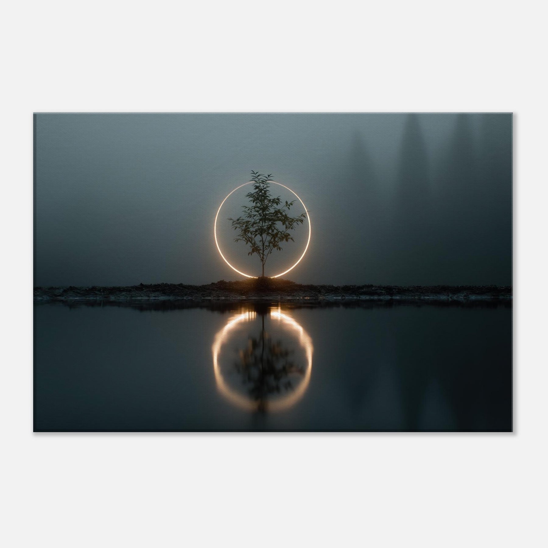 Seed of Life blooms in a quiet circle of light, where a lone tree rises from earth like a whispered covenant. The Surrealism inspired scene folds time and space, inviting a meditative calm into any living room. Its warm halo and cool water reflection conjure a sacred mirror a place to pause, breathe, and dream. Hang this piece where soft dusk meets a steady glow, and watch the atmosphere shift from everyday chatter to a murmur of secrets held in stillness.