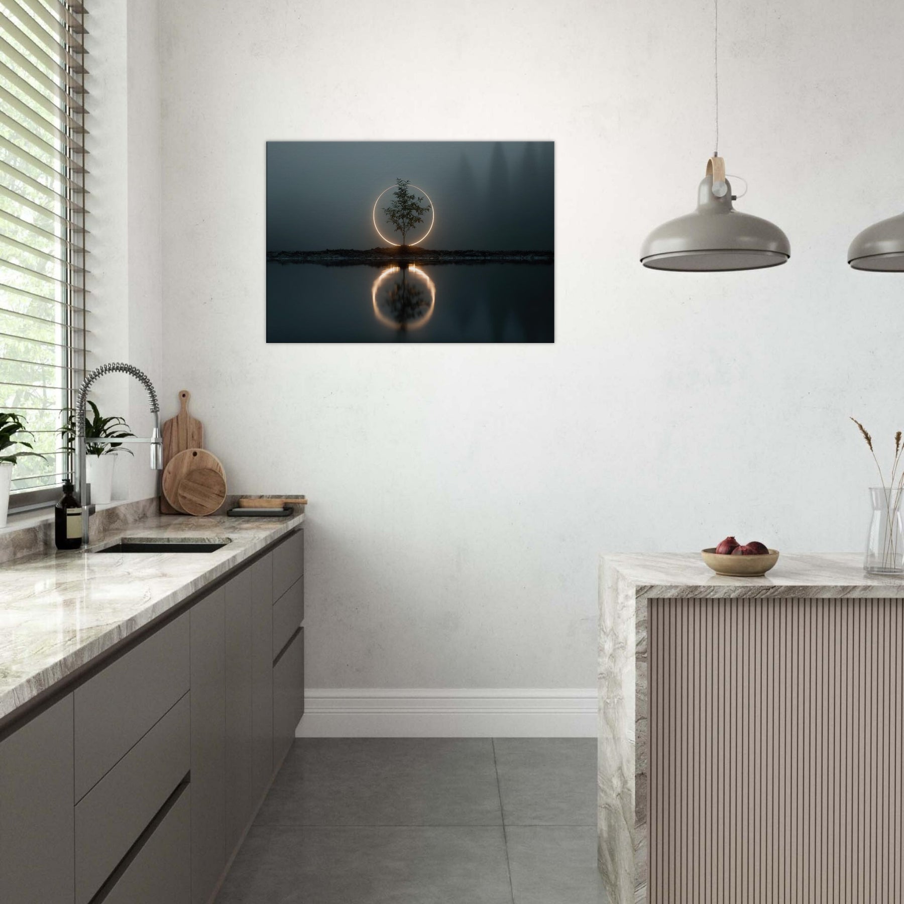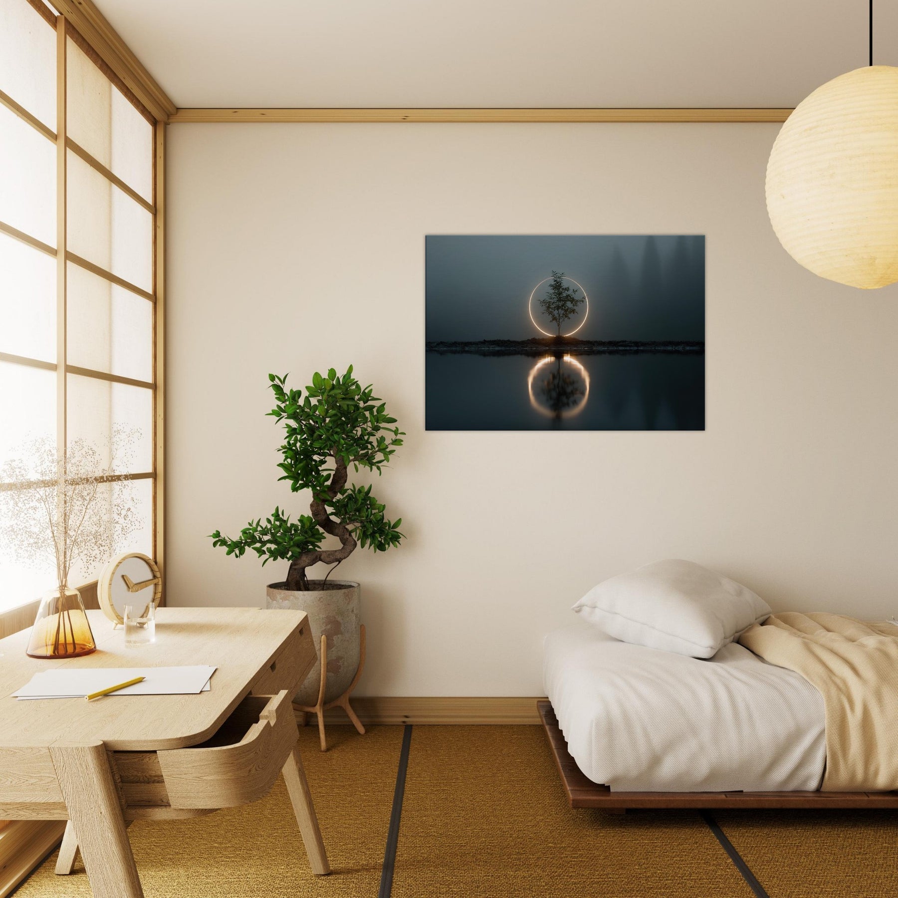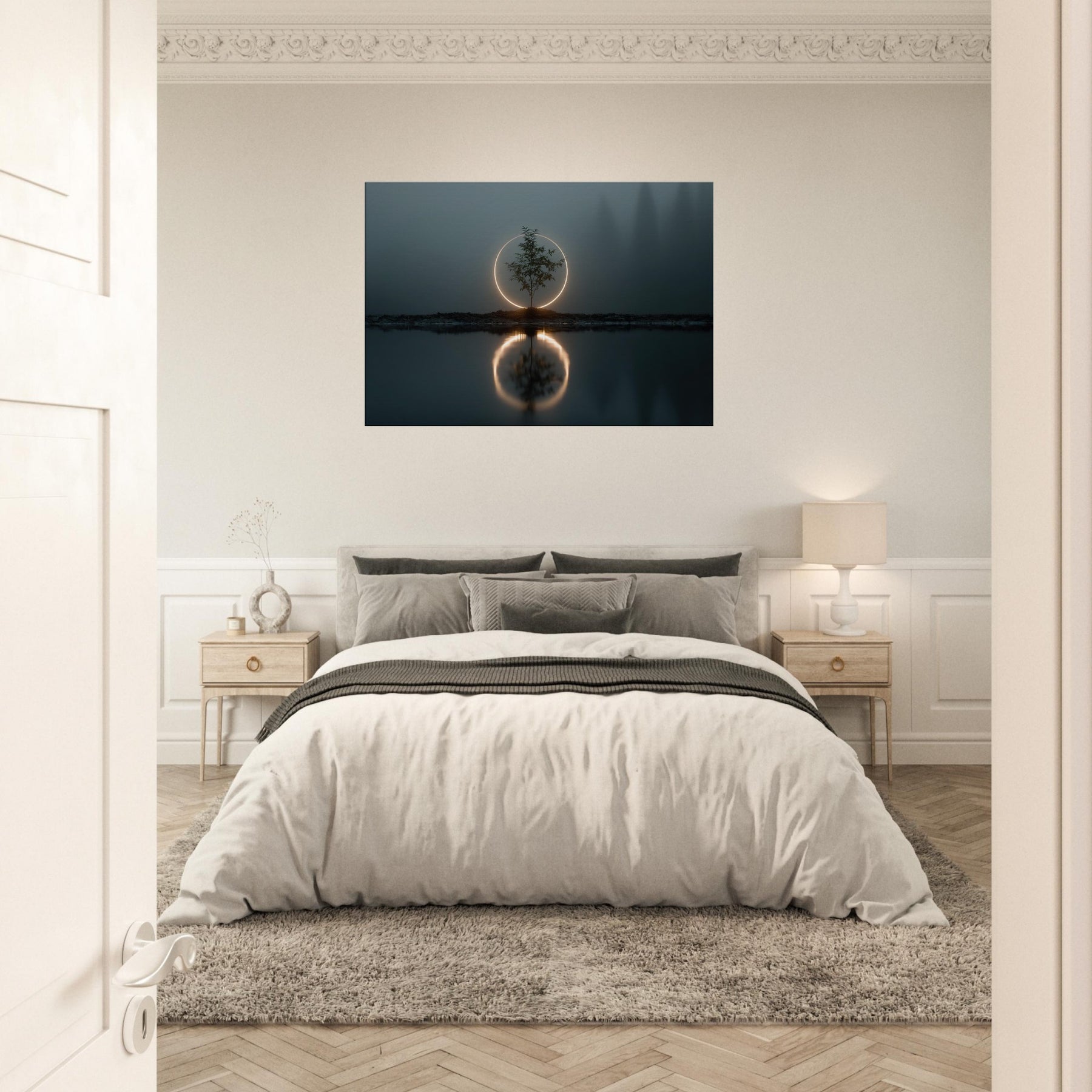 Seed of Life blooms in a quiet circle of light, where a lone tree rises from earth like a whispered covenant. The Surrealism inspired scene folds time and space, inviting a meditative calm into any living room. Its warm halo and cool water reflection conjure a sacred mirror a place to pause, breathe, and dream. Hang this piece where soft dusk meets a steady glow, and watch the atmosphere shift from everyday chatter to a murmur of secrets held in stillness.