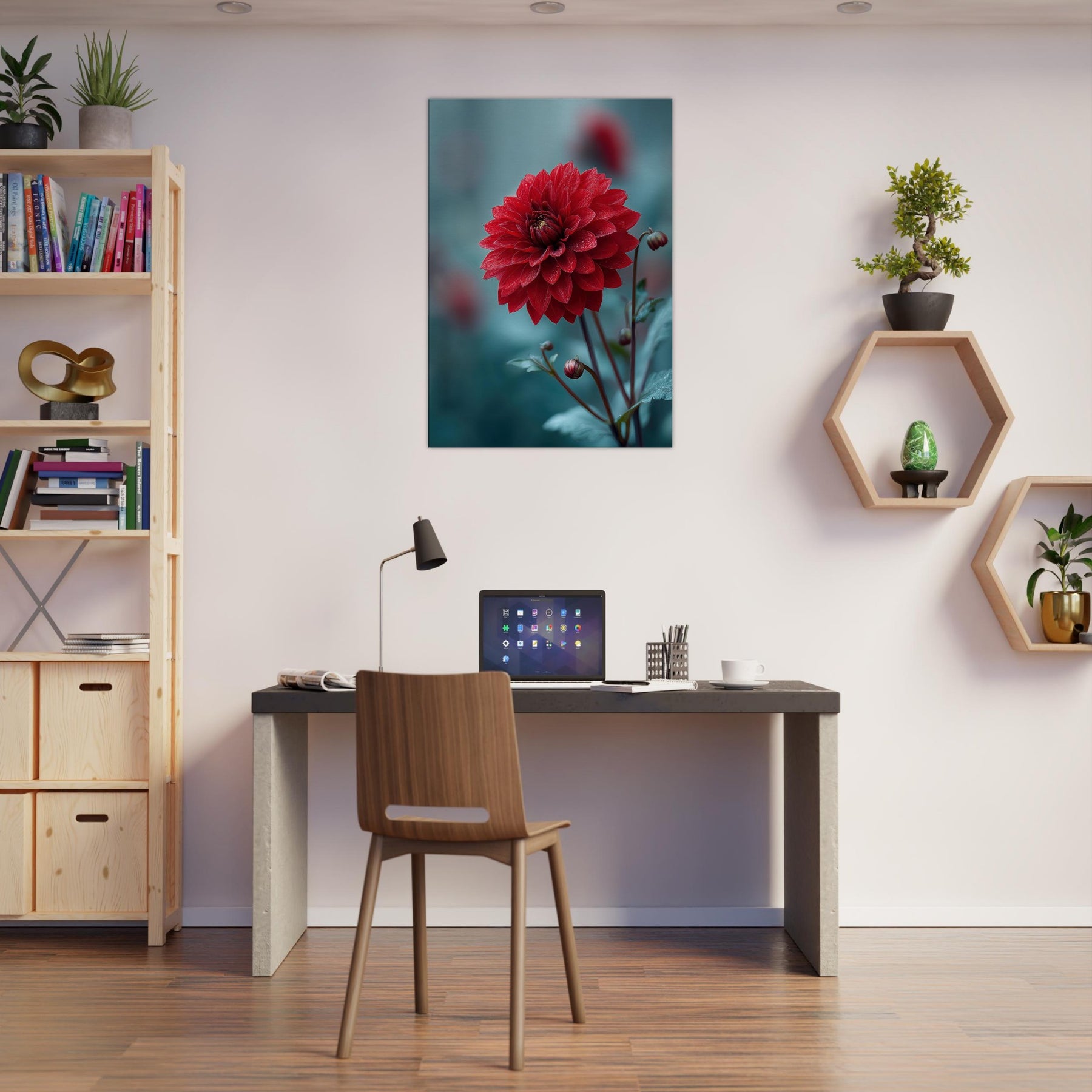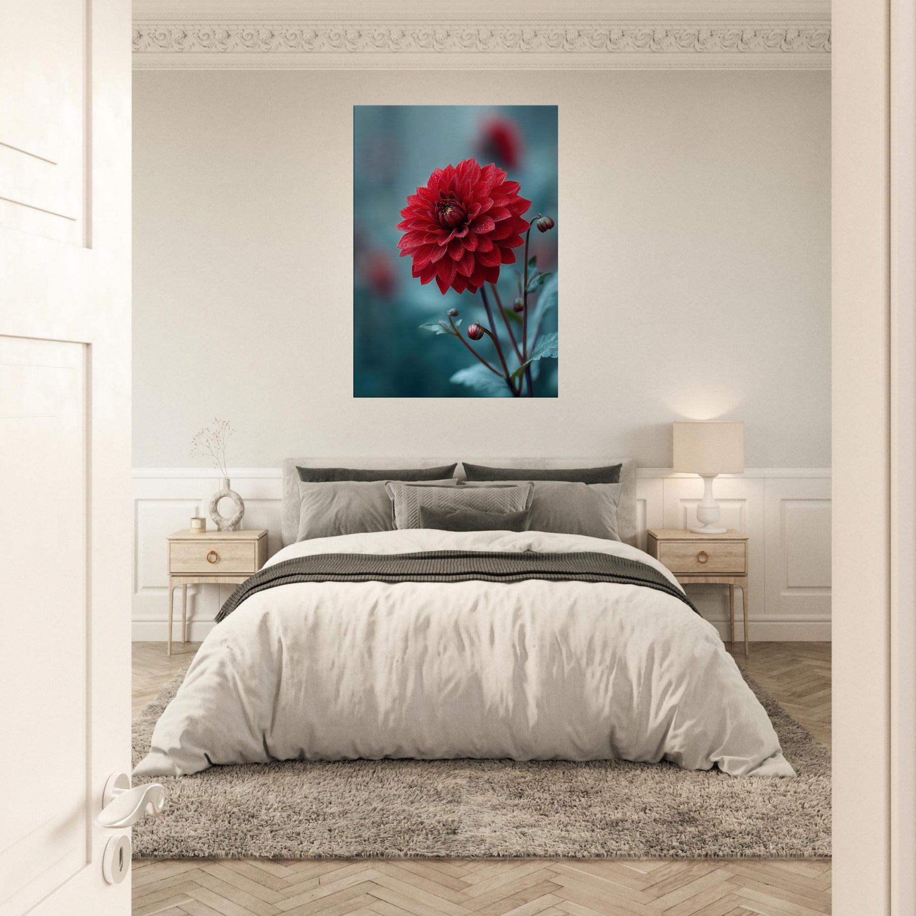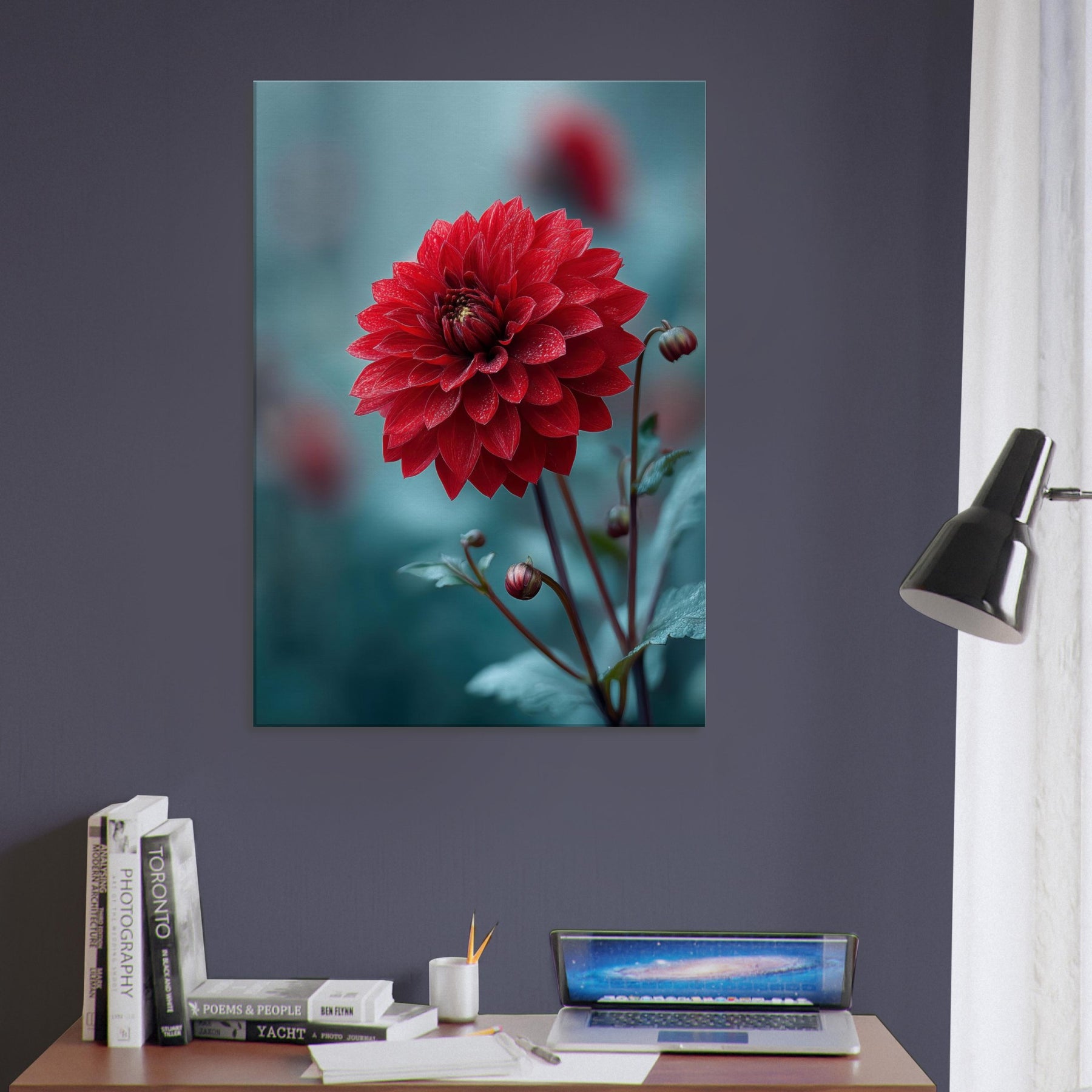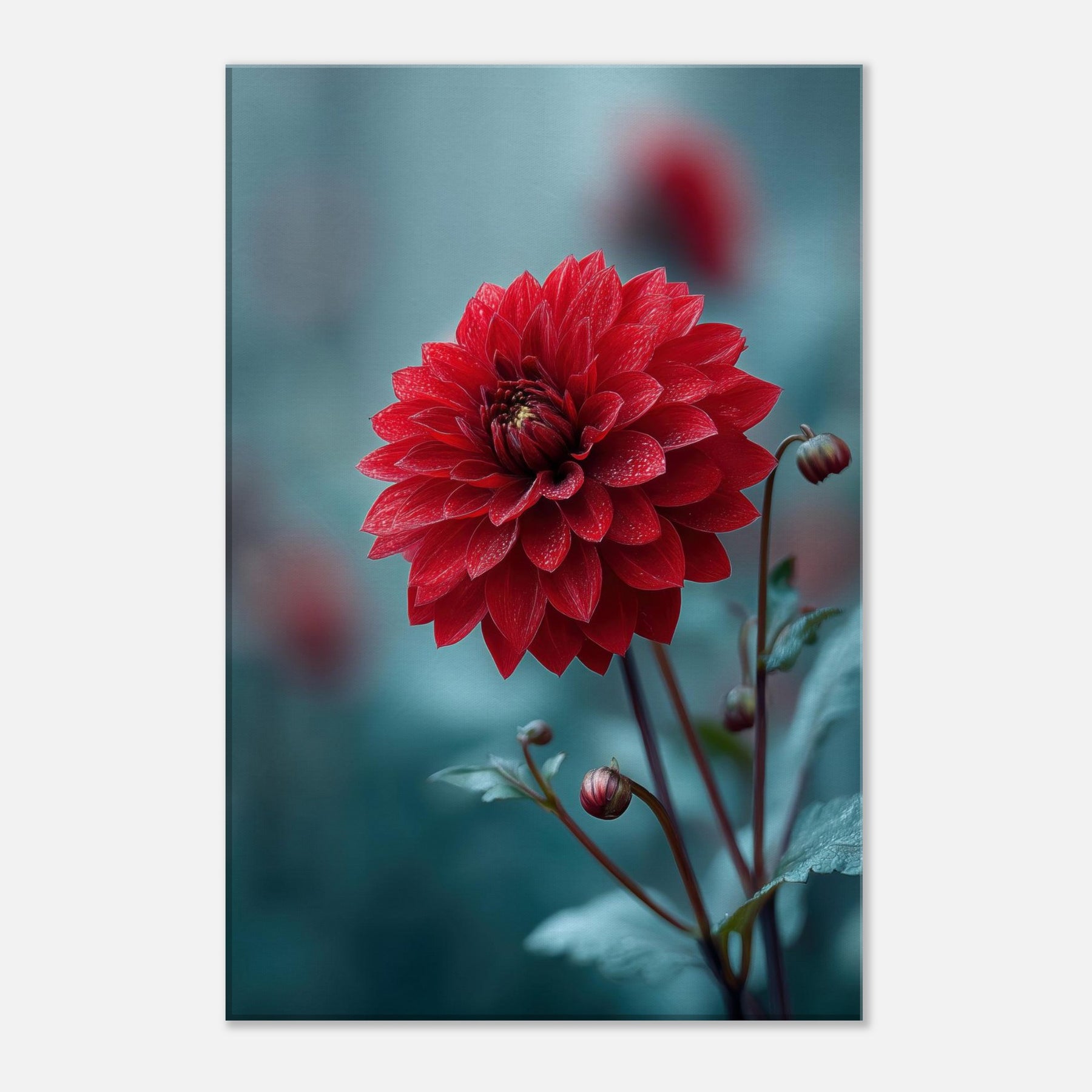 Where the Dahlia unspools its velvet petals into dreamlike horizons, this surreal study invites stillness to bloom in your room. Rich crimson layers drift against a cool, cerulean backdrop, as if a quiet garden refracted through memory. The piece radiates warmth and mystery at once, catching morning light and evening shadow to transform walls into a living . It pairs with minimal furniture or bold accents, elevating a space with poetry, depth, and a gentle, nature infused pulse.