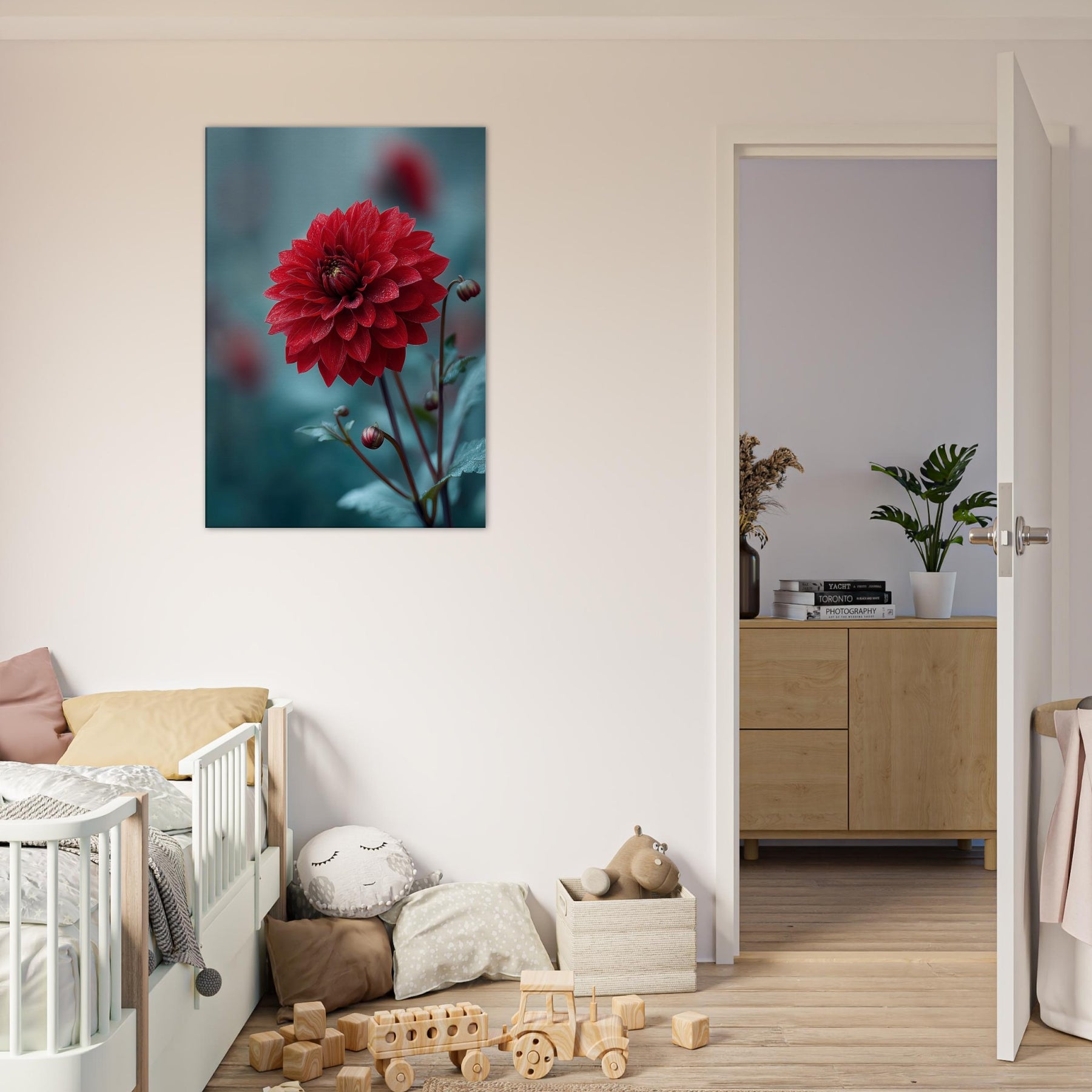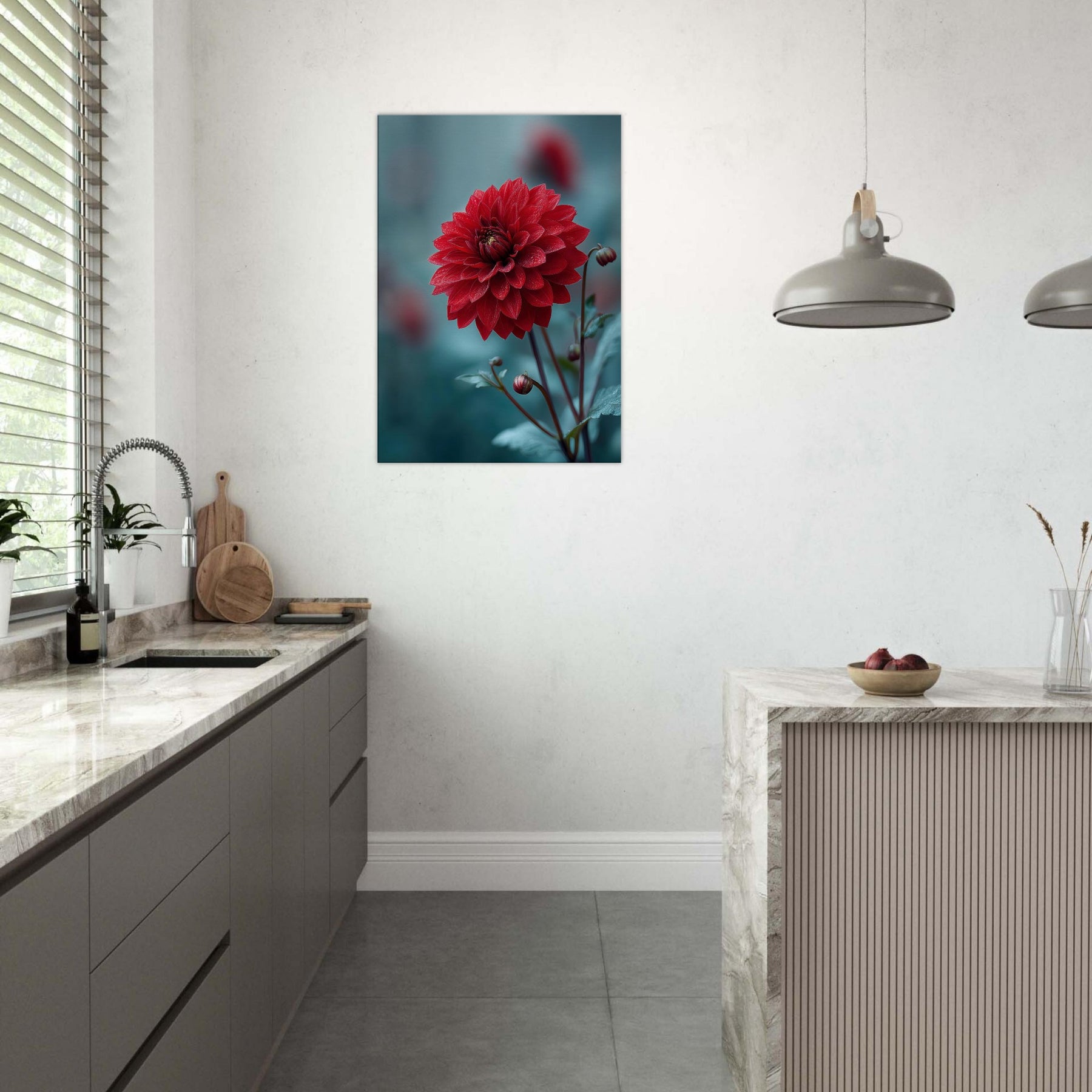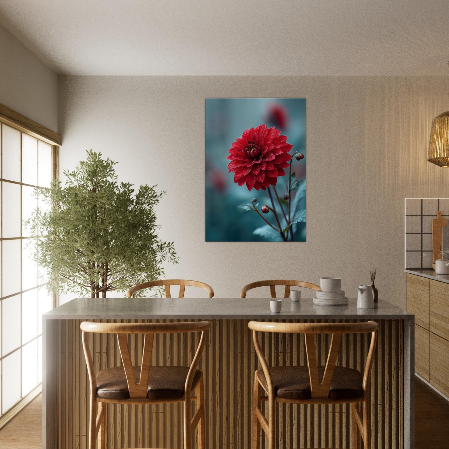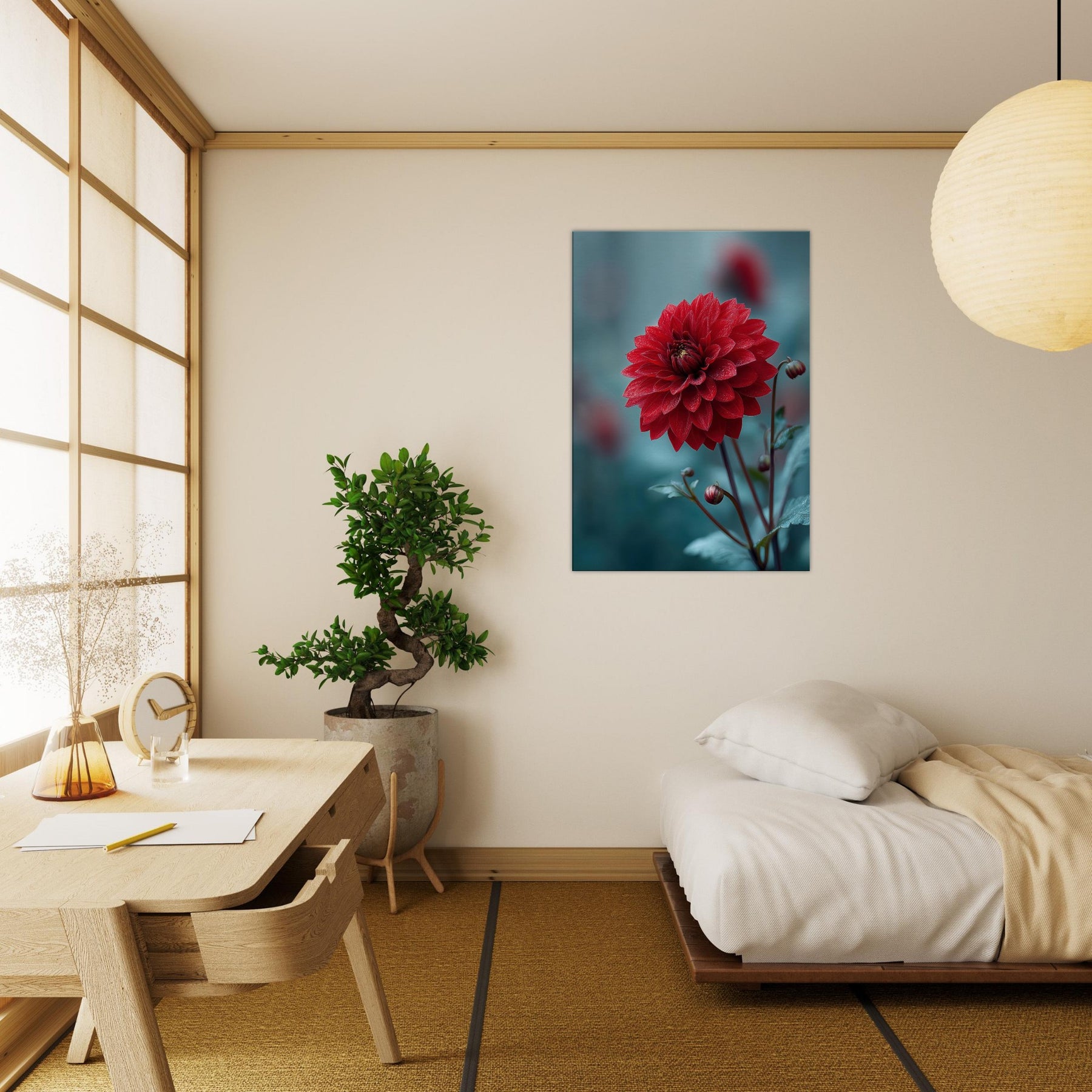 Where the Dahlia unspools its velvet petals into dreamlike horizons, this surreal study invites stillness to bloom in your room. Rich crimson layers drift against a cool, cerulean backdrop, as if a quiet garden refracted through memory. The piece radiates warmth and mystery at once, catching morning light and evening shadow to transform walls into a living . It pairs with minimal furniture or bold accents, elevating a space with poetry, depth, and a gentle, nature infused pulse.
