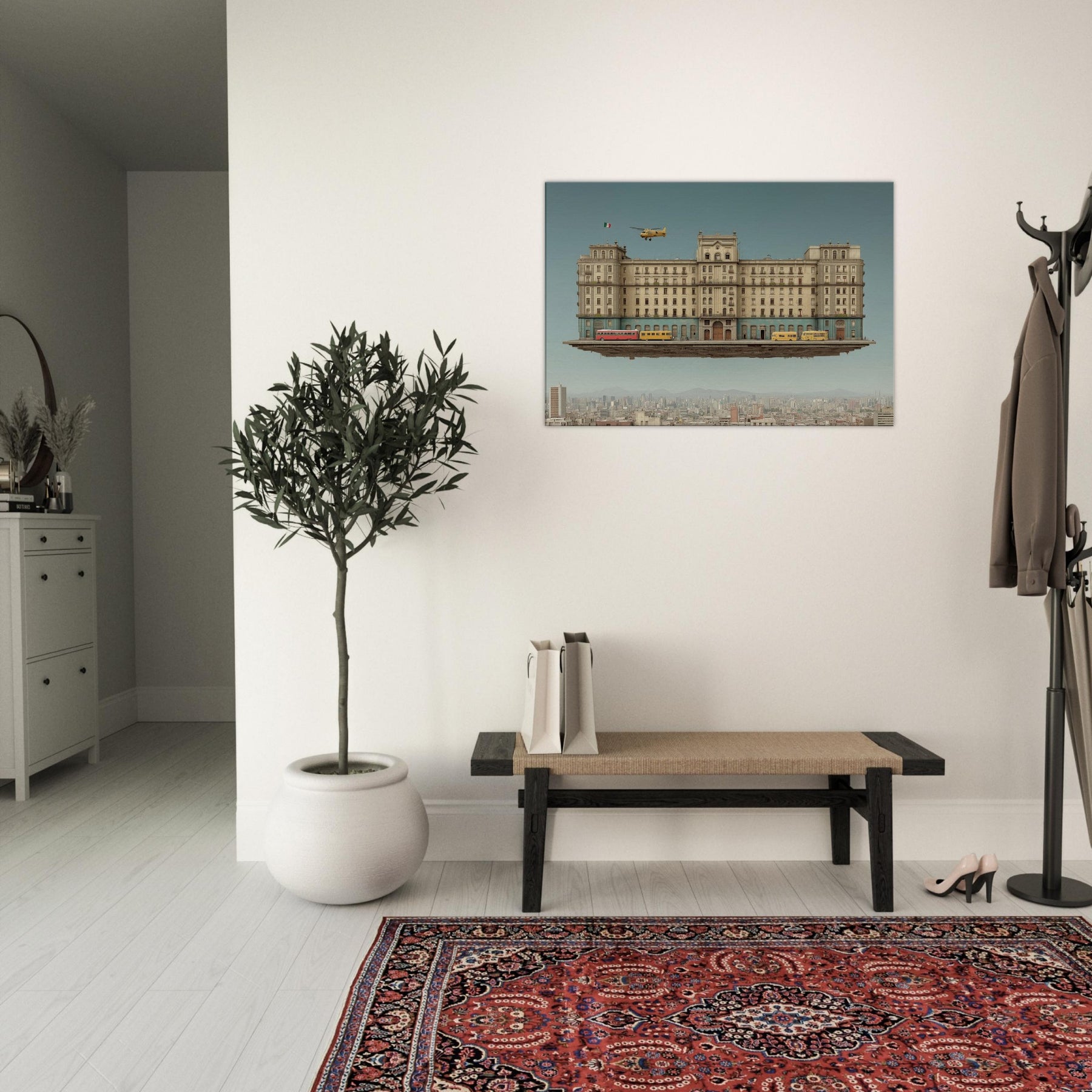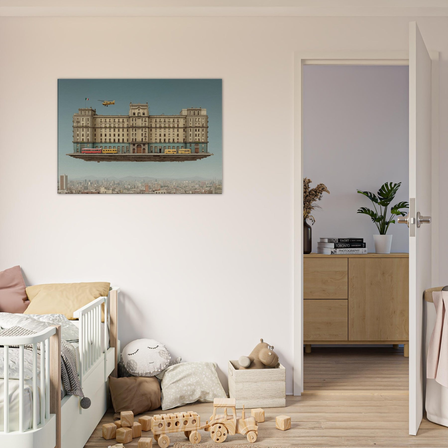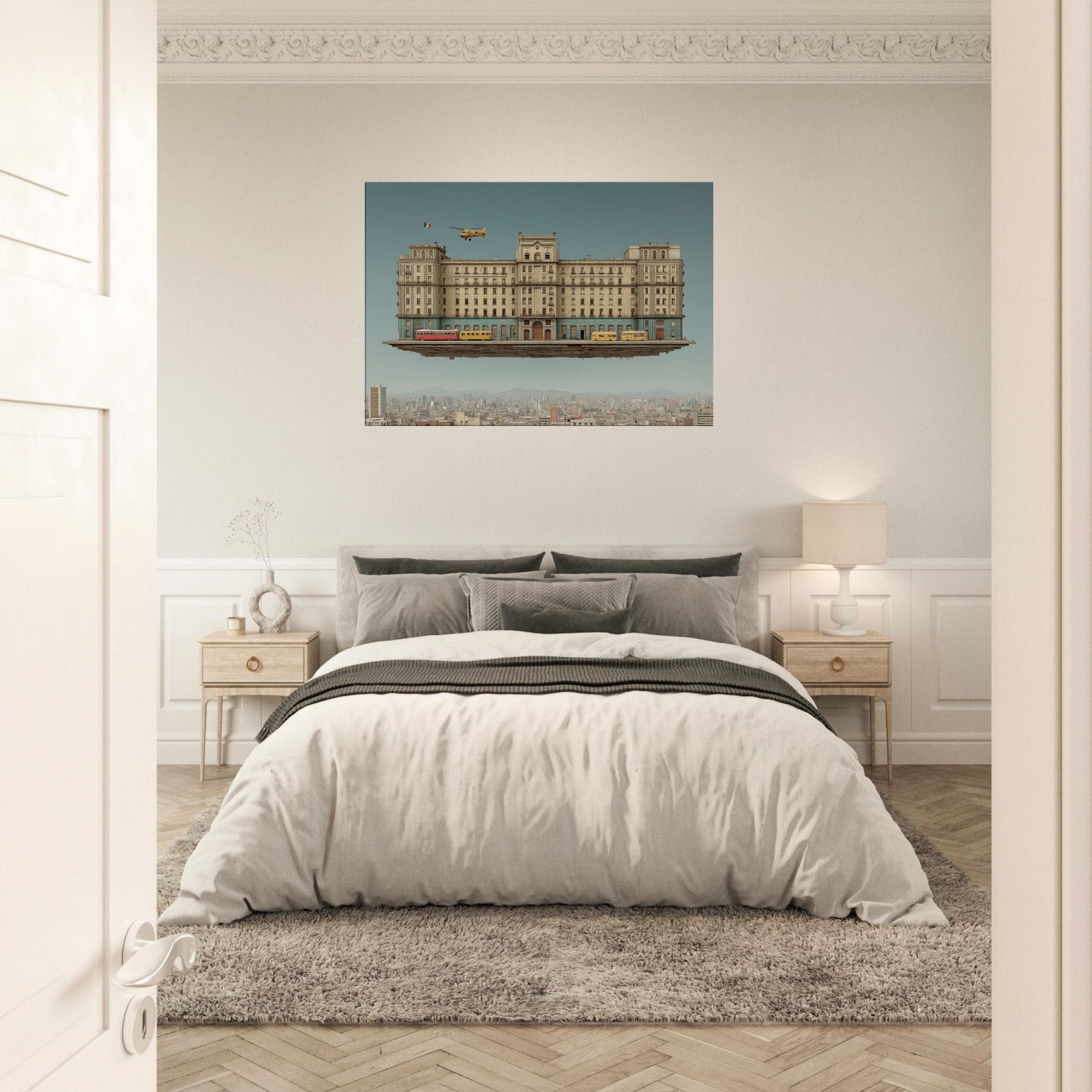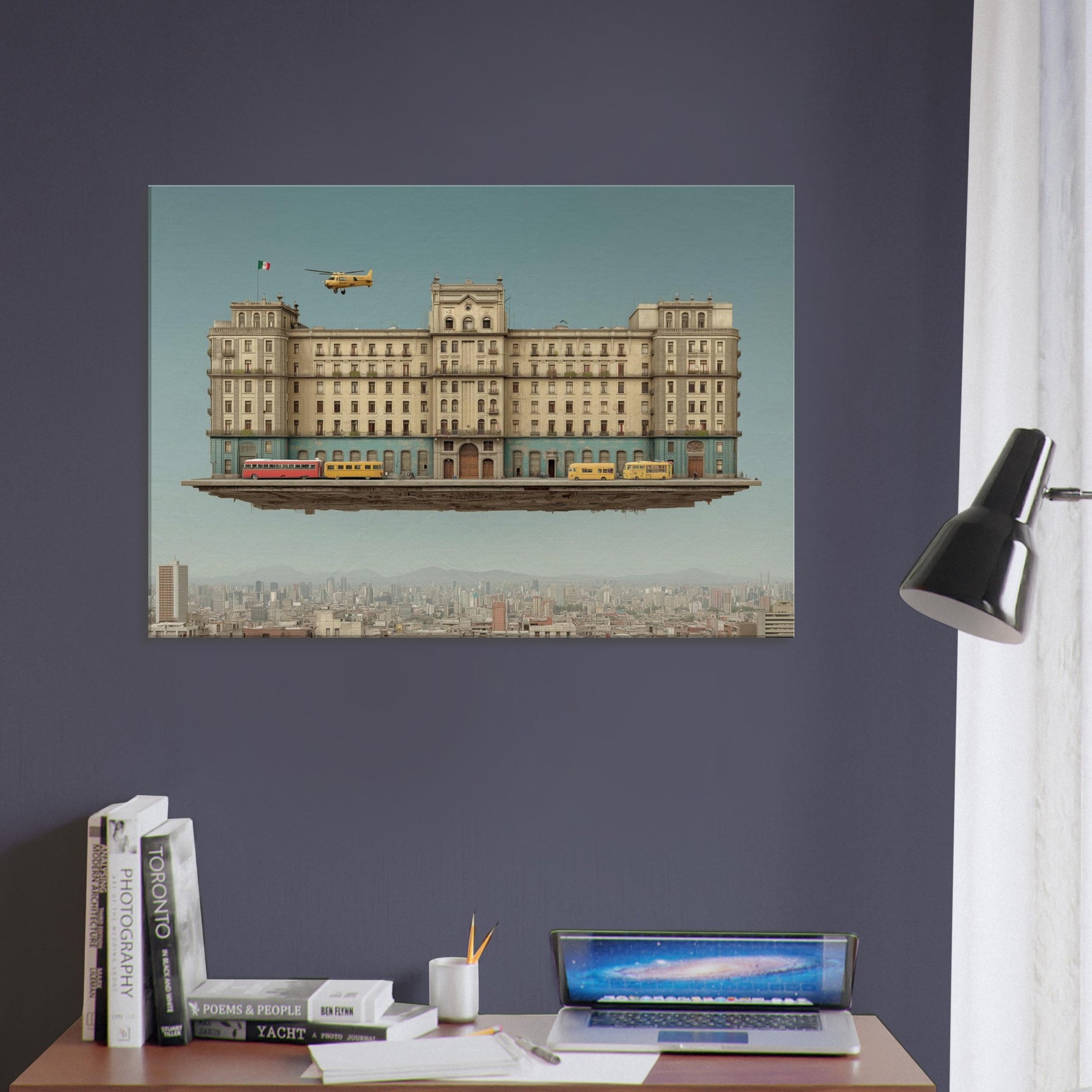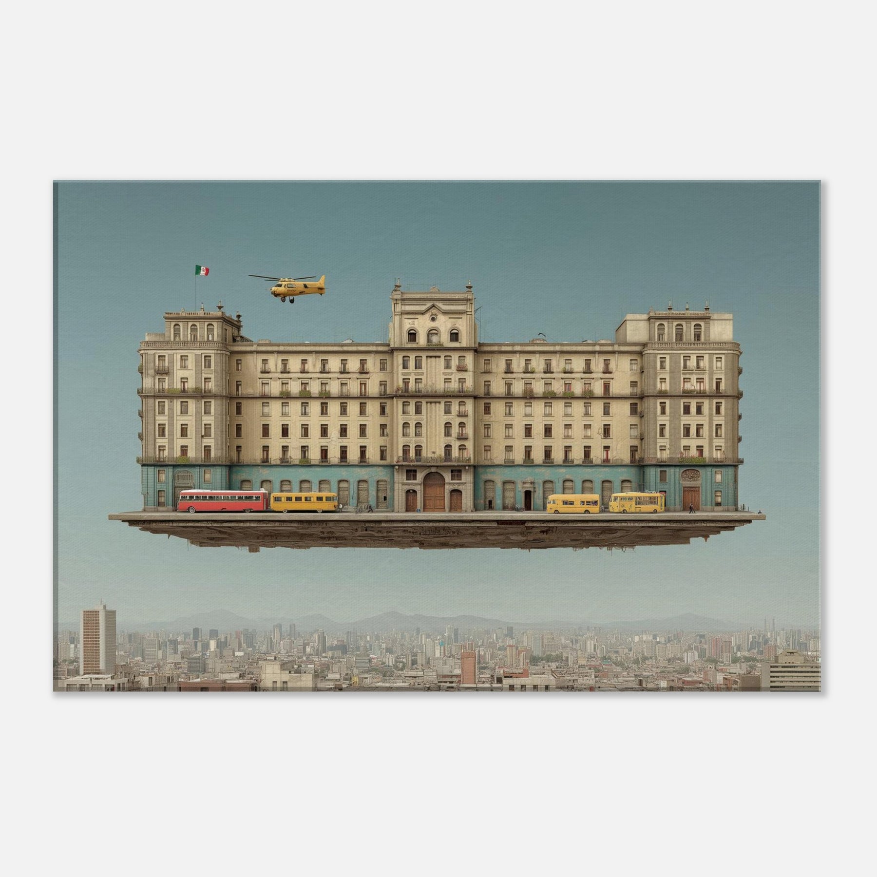 Mexico City unfurls as a dream anchored in gravity and longing. This surreal panorama suspends a grand, weathered edifice above a living metropolis, where buses idle on a floating street and a lone helicopter drifts past arched windows. The palette sun washed ochre, cobalt stone, and warm terracotta invites touch and memory, turning any wall into a doorway. In a living room or study, it fosters quiet wonder, a conversation between texture and light, urban memory, and the scent of rain after dusk.