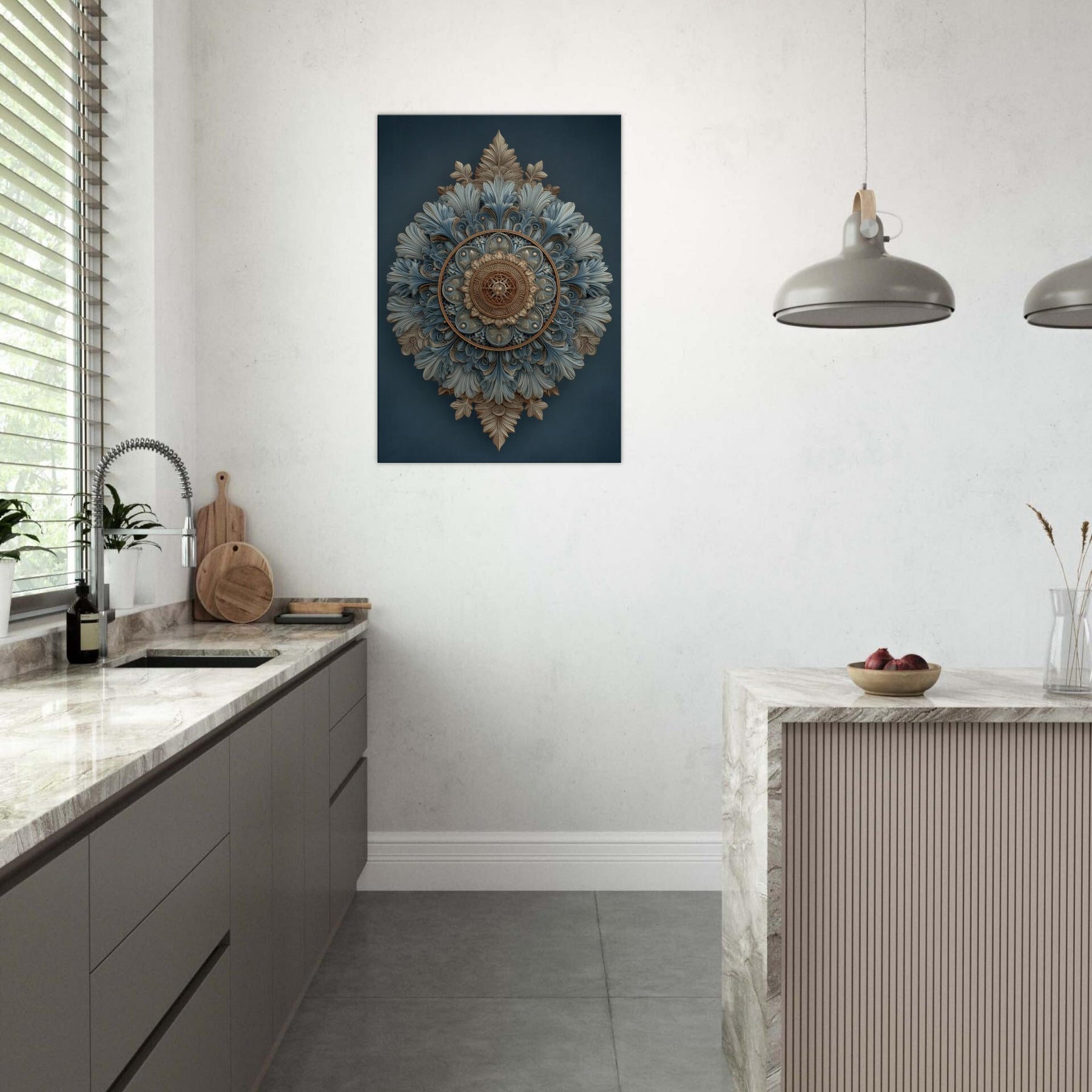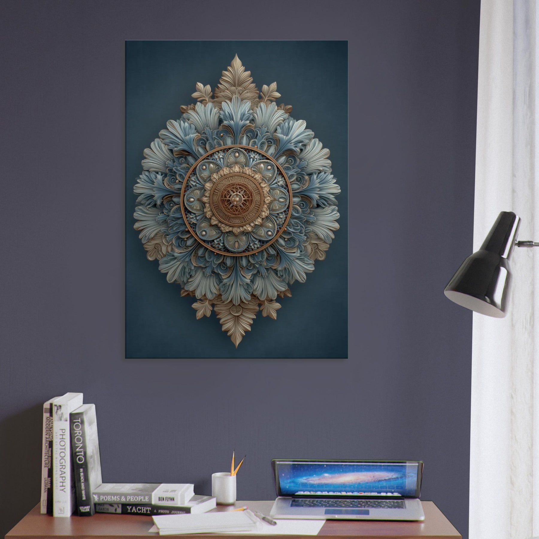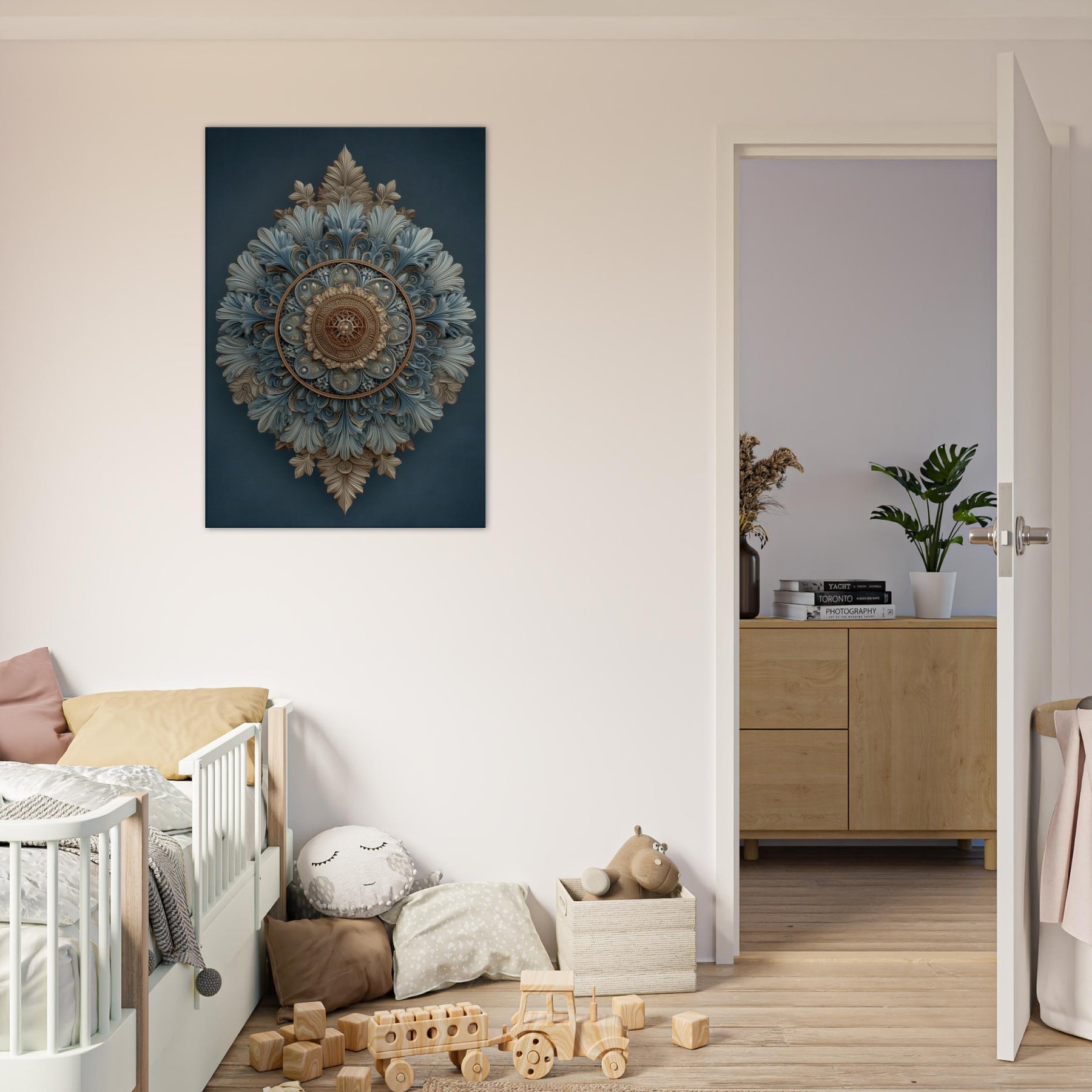 Metatron’s Cube radiates as a living mandala, a dreamlike lattice that circles inward to a bronze core. Surreal, tactile petals unfold in blues and golds, inviting the eye to drift and discover hidden constellations within. The piece breathes with the hush of a meditation chamber, transforming a wall into a chamber of contemplation. Hung in a living room or study, it lends a luminous, spiritual atmosphere an invitation to slow time and let space unfold around you. The artwork becomes a focal point for quiet wonder and conversation.