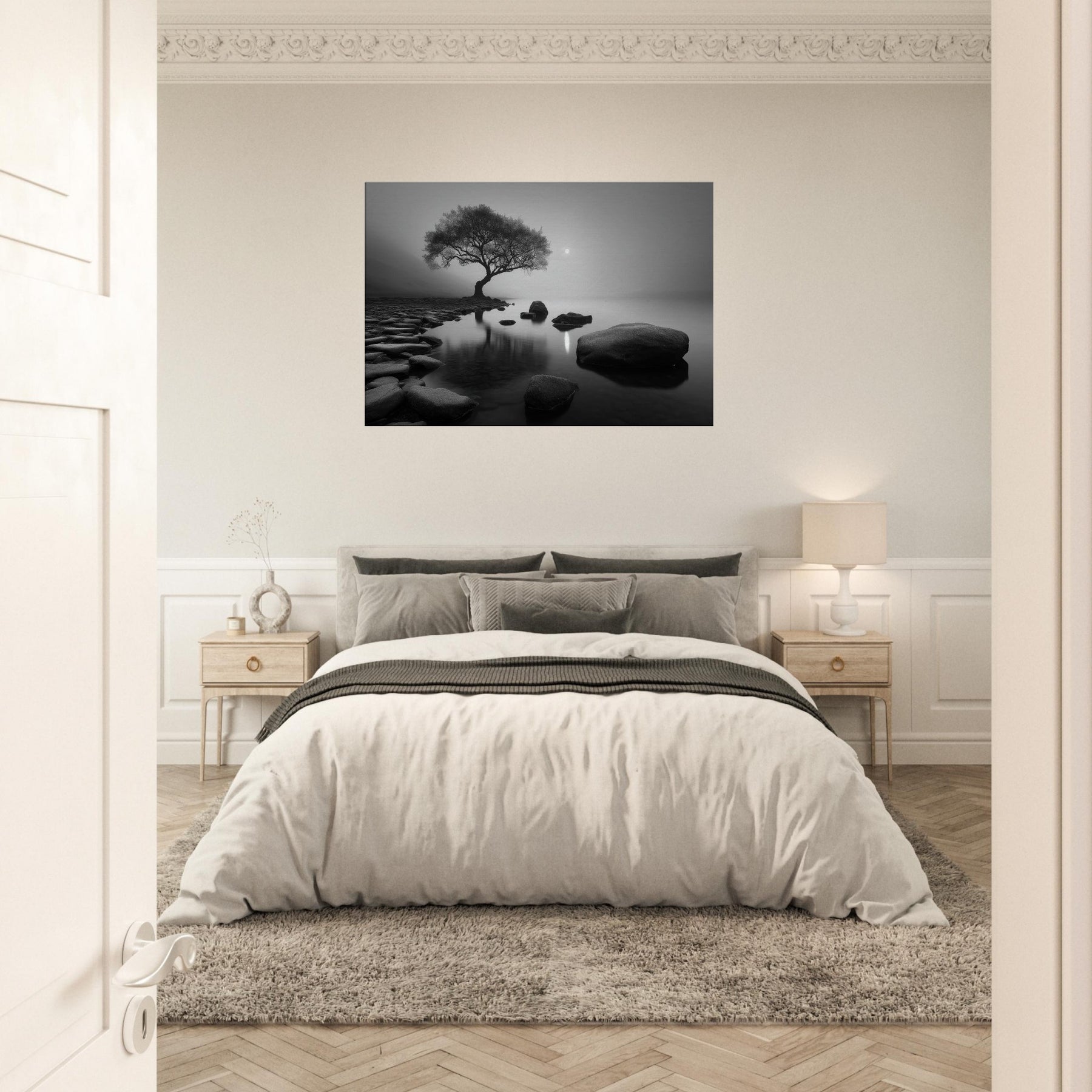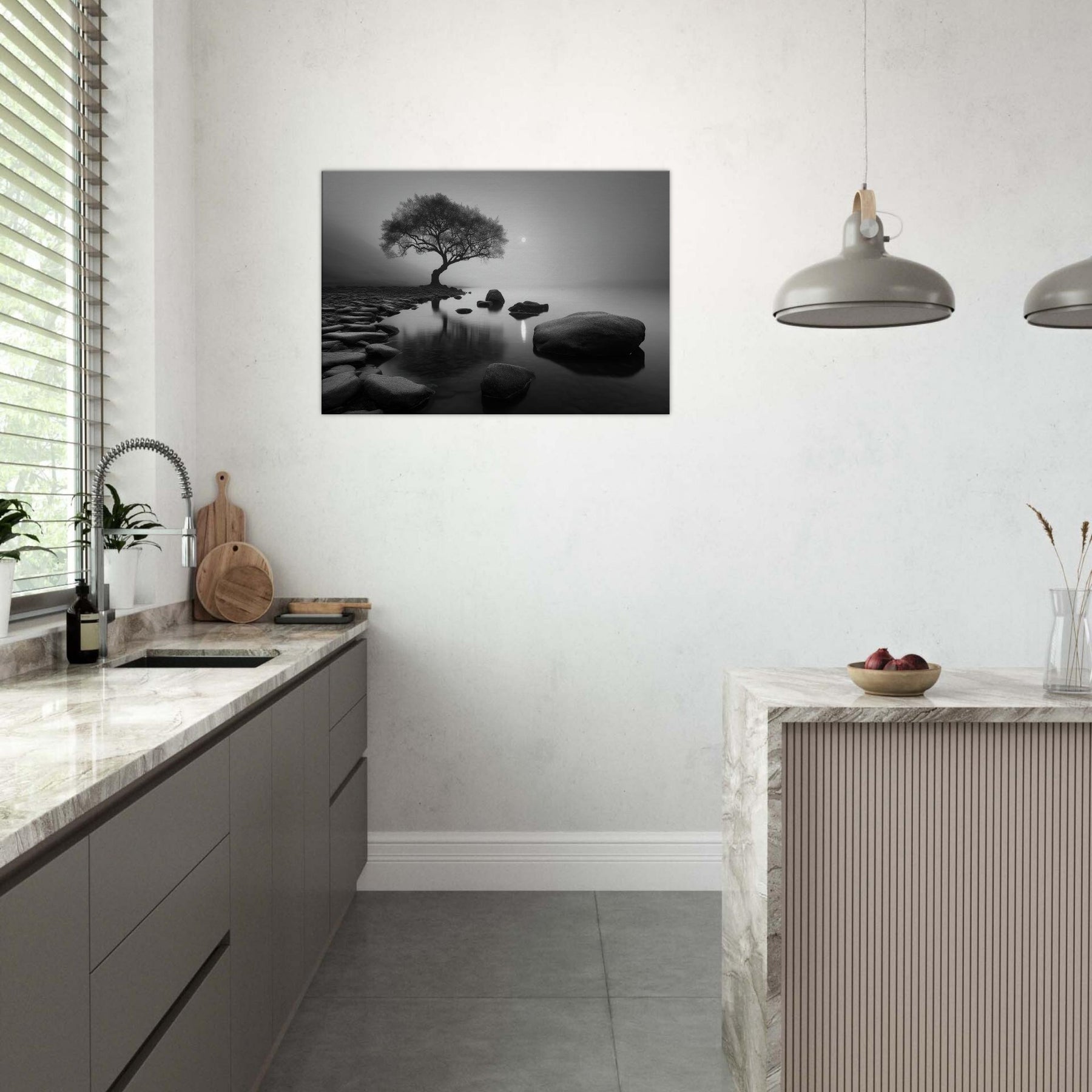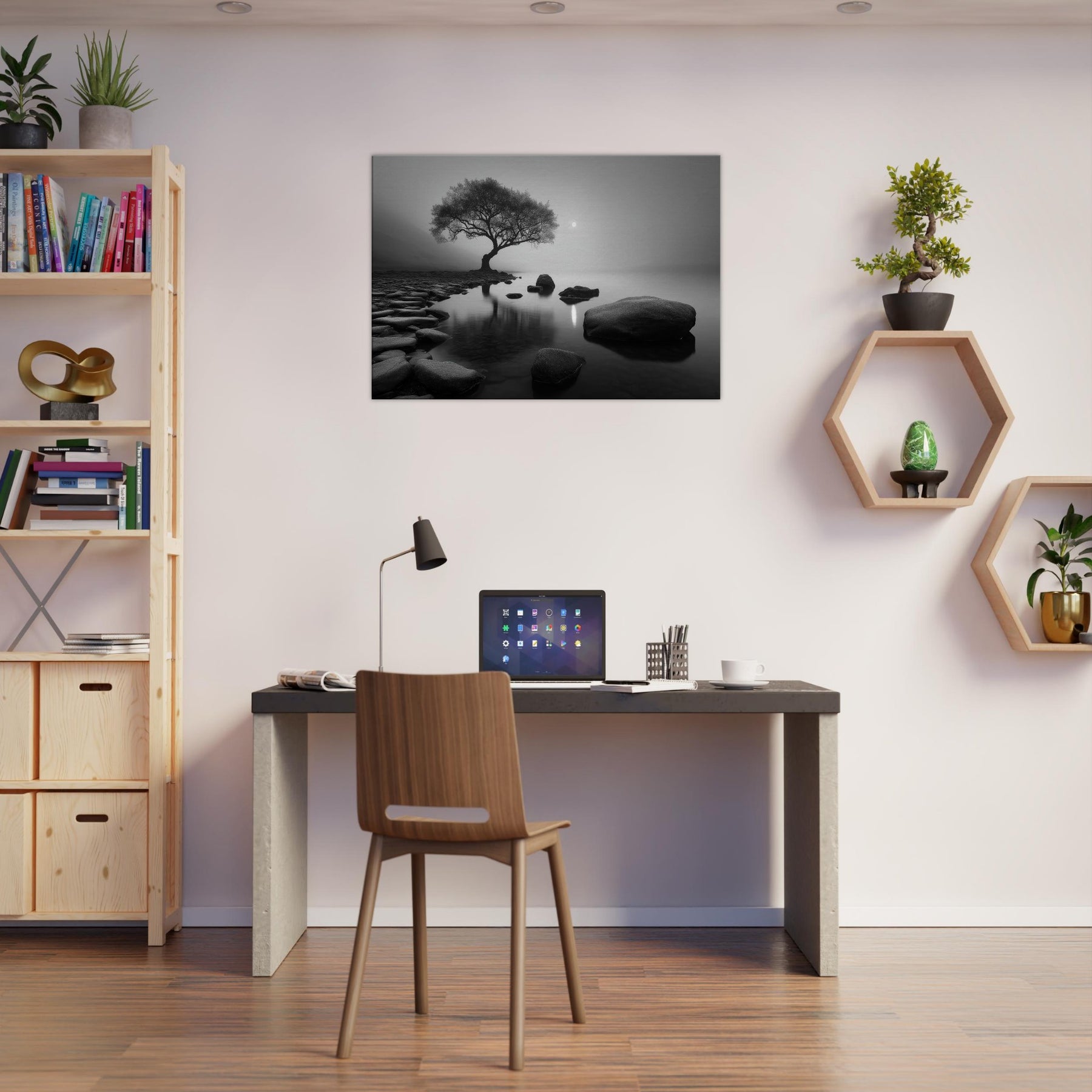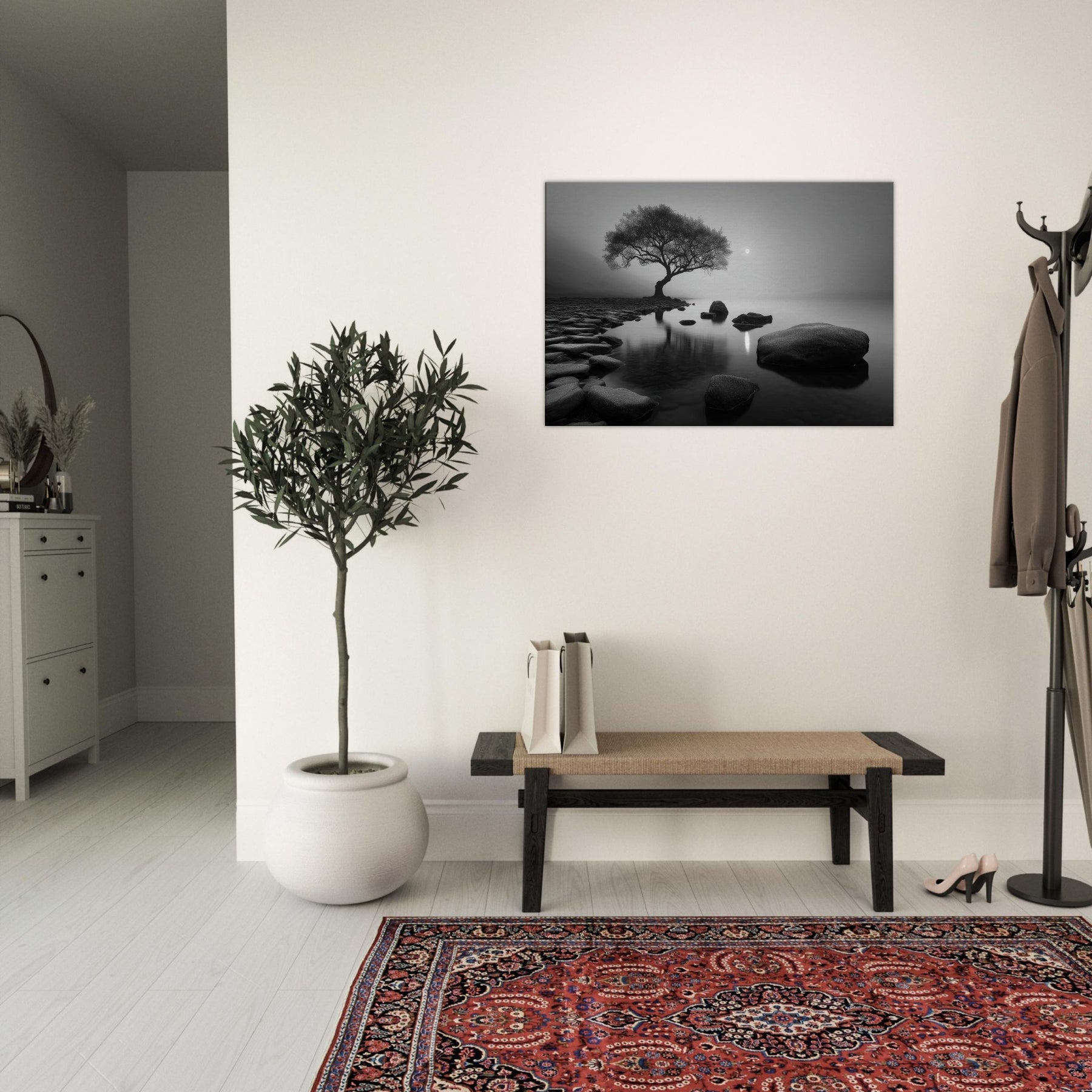 On the edge of still water, the Lone Tree leans toward the horizon, its branches tracing the quiet in a dreamlike gray. The scene feels suspended between memory and possibility, where rocks become stepping stones and the light hovers like a soft memory. This piece invites meditative calm into any room, turning a living space into a shoreline of contemplation. Its restrained luminosity and tactile textures invite touch, echoing solitude, resilience, and the subtle poetry of nature.
