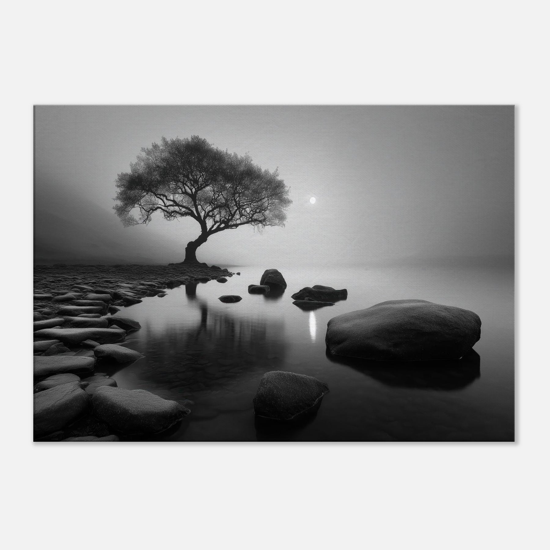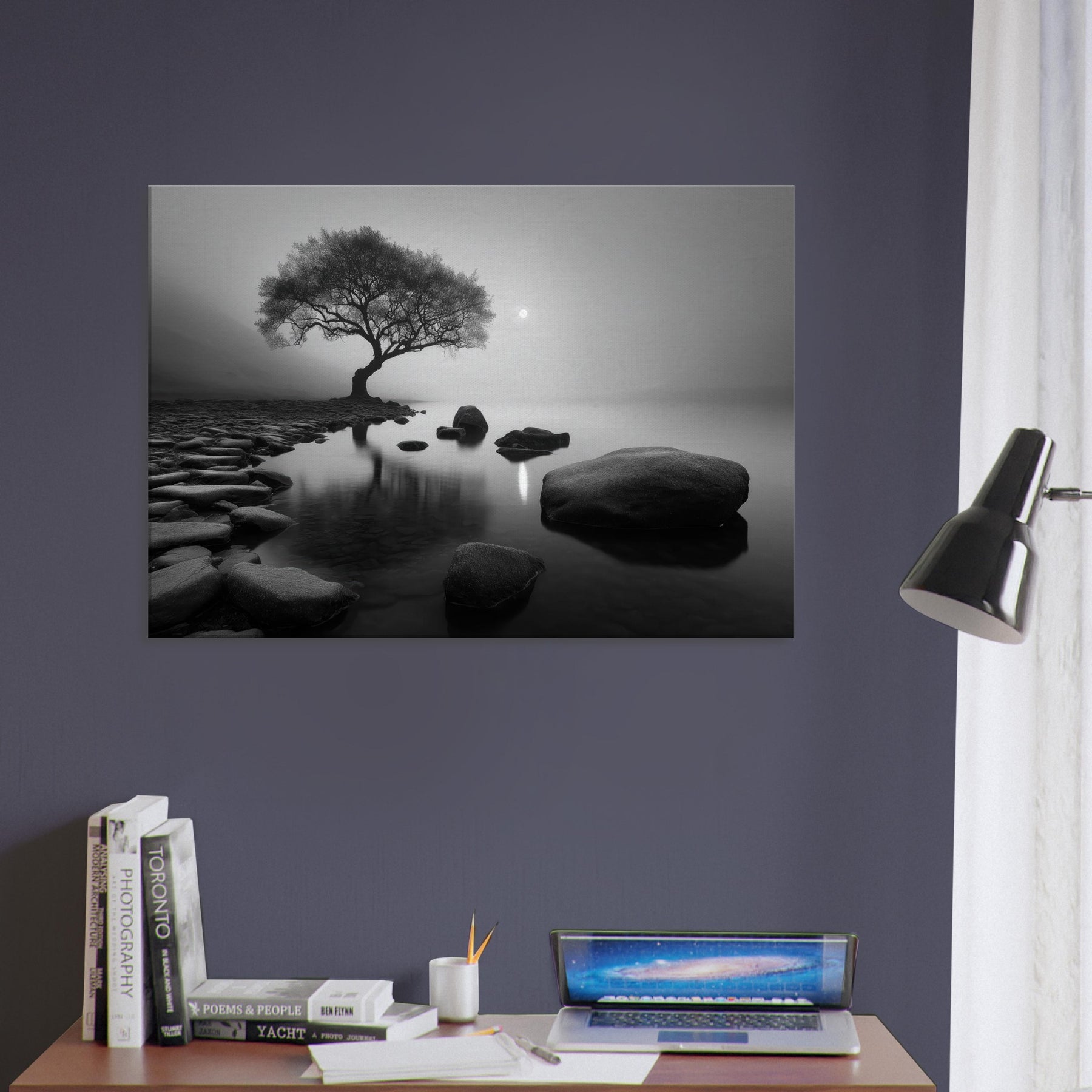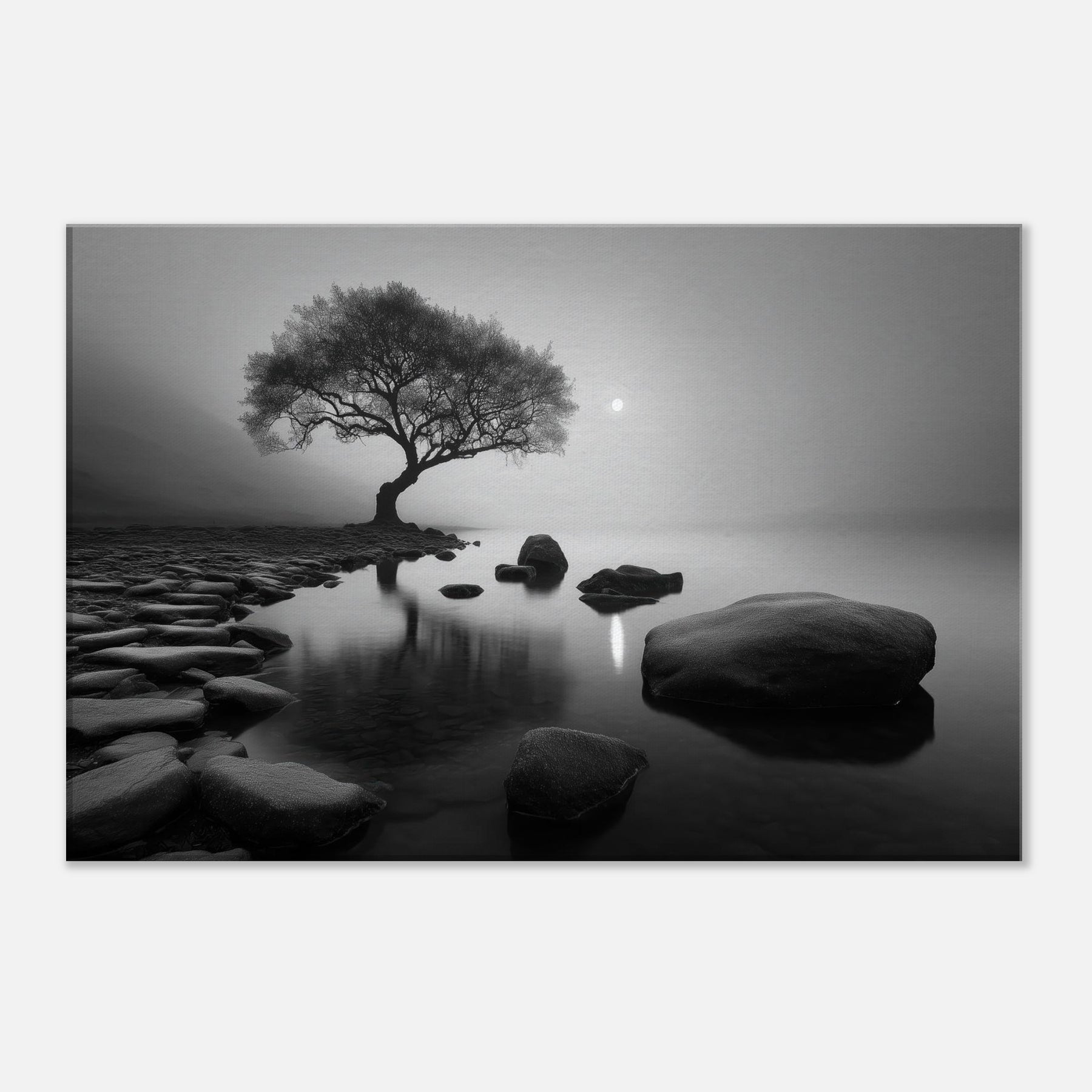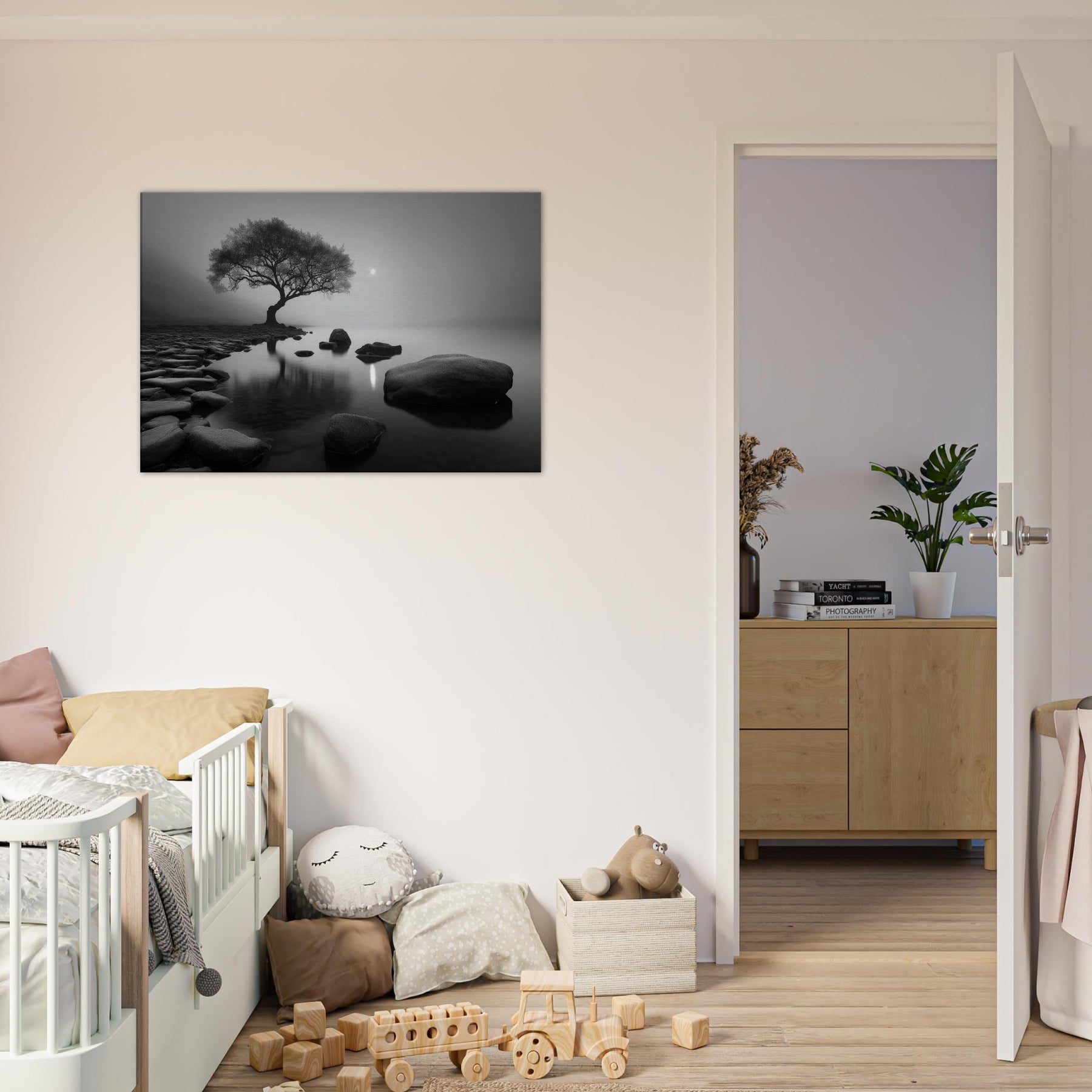 On the edge of still water, the Lone Tree leans toward the horizon, its branches tracing the quiet in a dreamlike gray. The scene feels suspended between memory and possibility, where rocks become stepping stones and the light hovers like a soft memory. This piece invites meditative calm into any room, turning a living space into a shoreline of contemplation. Its restrained luminosity and tactile textures invite touch, echoing solitude, resilience, and the subtle poetry of nature.