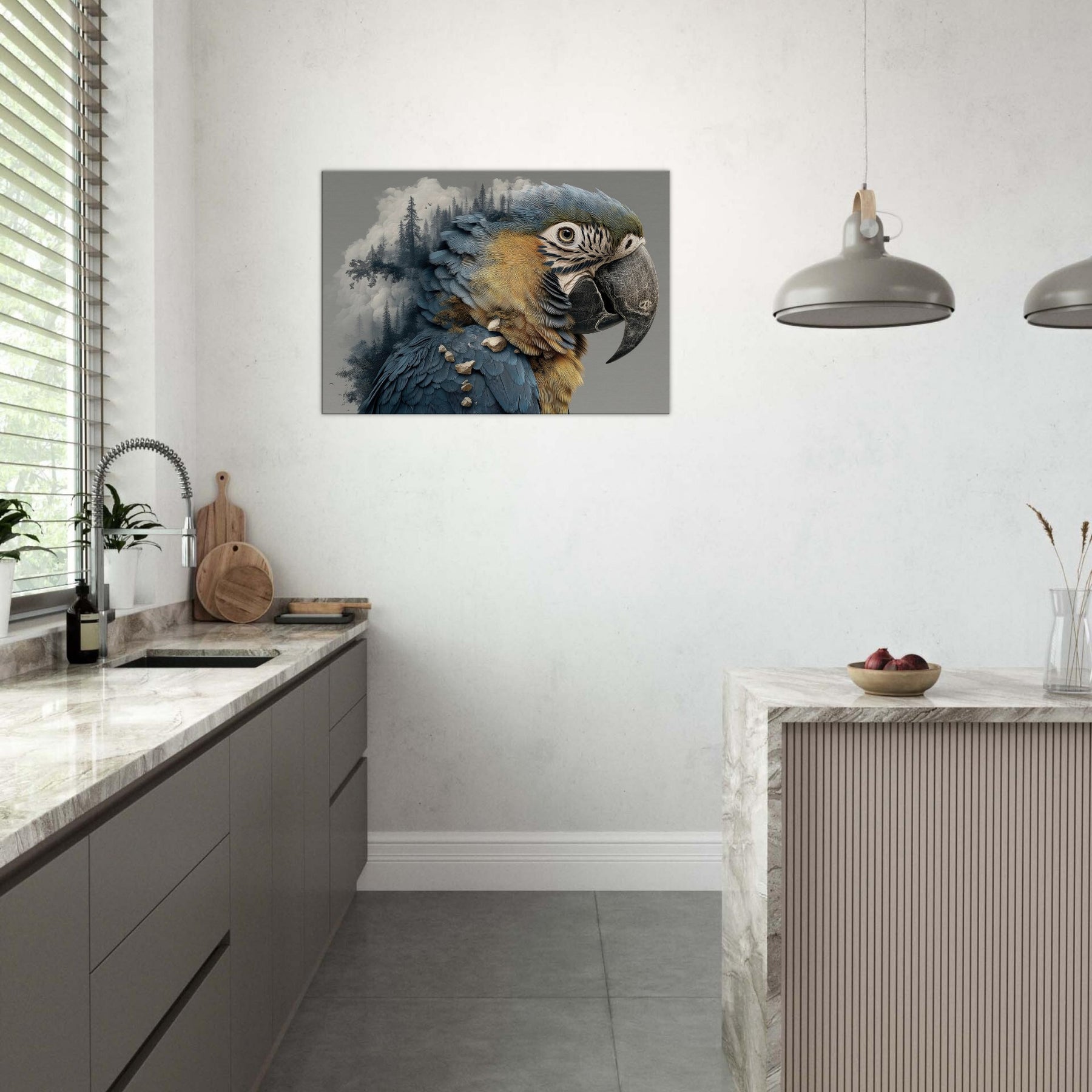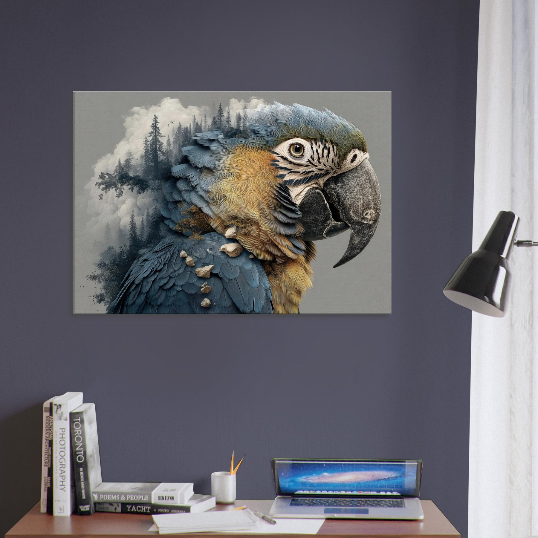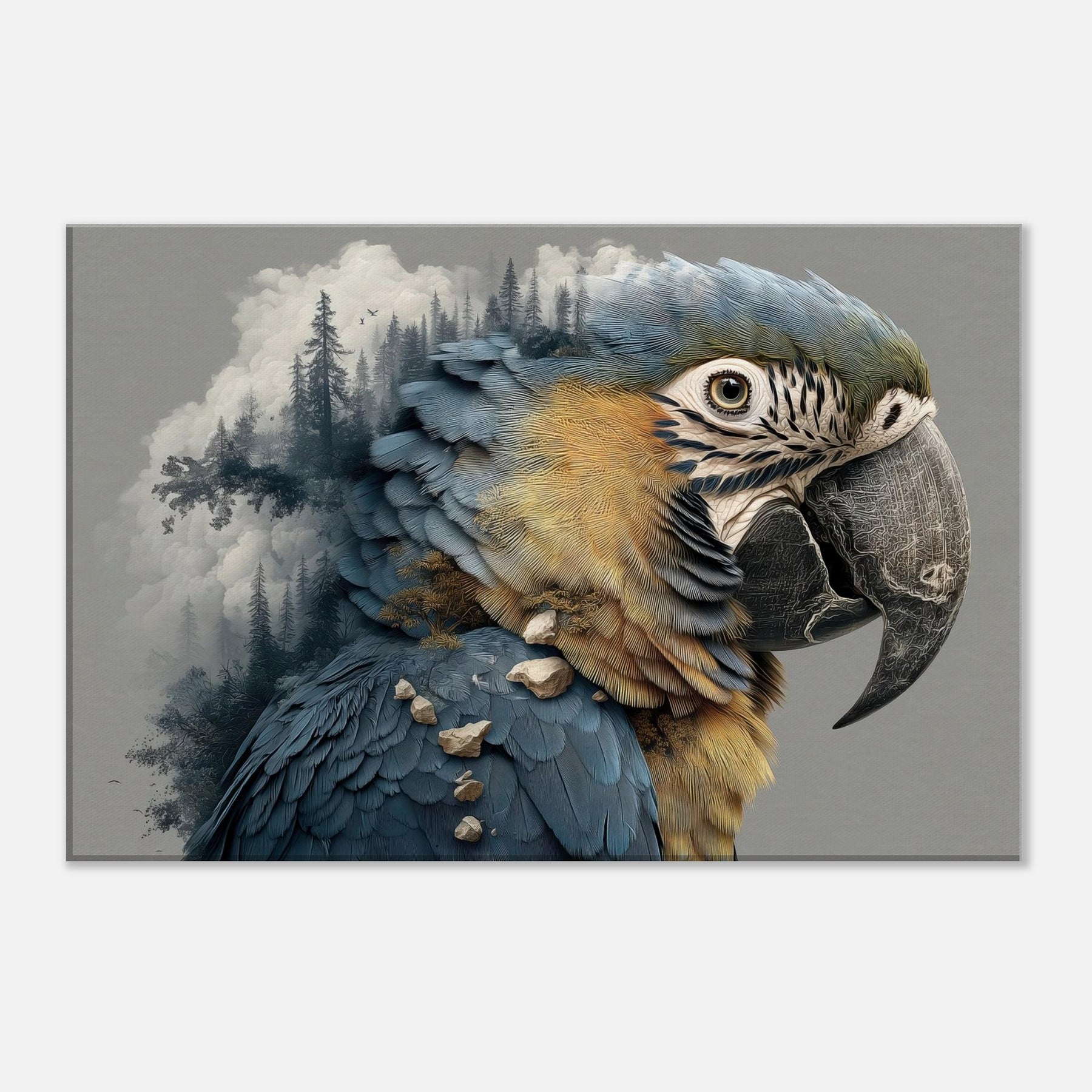Shaped in the mood of a dream, this Parrot dissolves into a forest of silhouettes and stone, its feathers turning to rivers of blue and gold that shimmer against a quiet wall. The surreal composition invites quiet awe, as mist and pine threads trace through the creature's form, echoing the hush of a personal sanctuary. Hang it in a living room or study to summon daylight, wonder, and a whisper of the wild into everyday interiors.