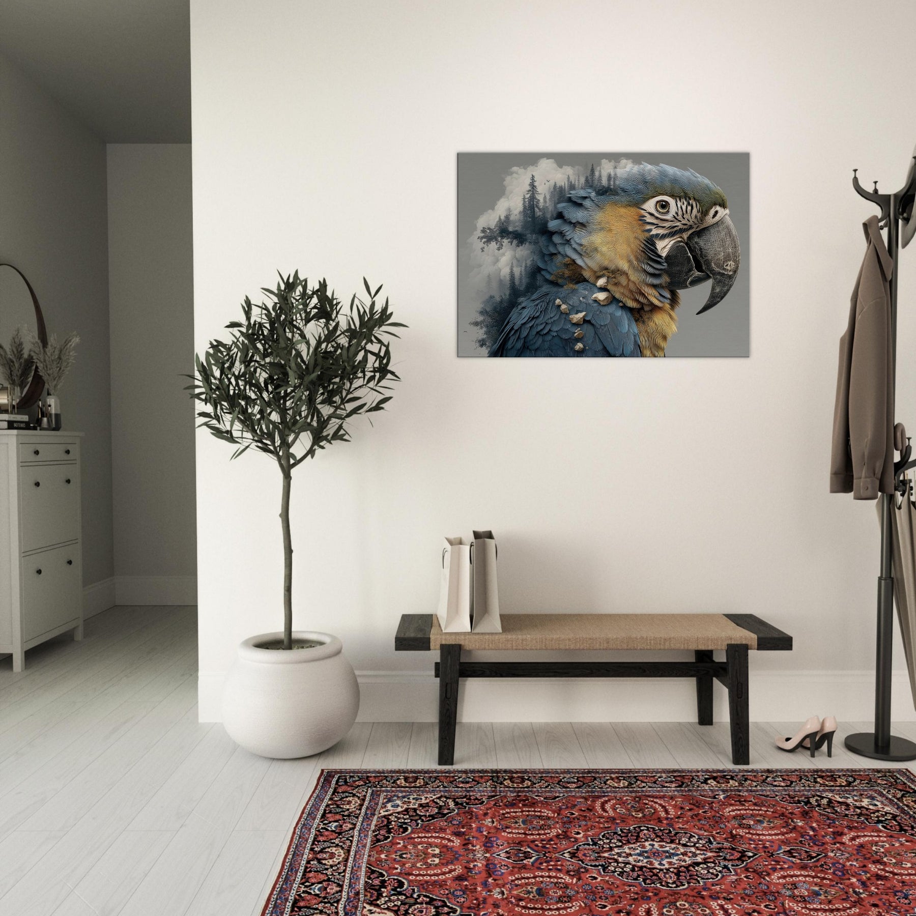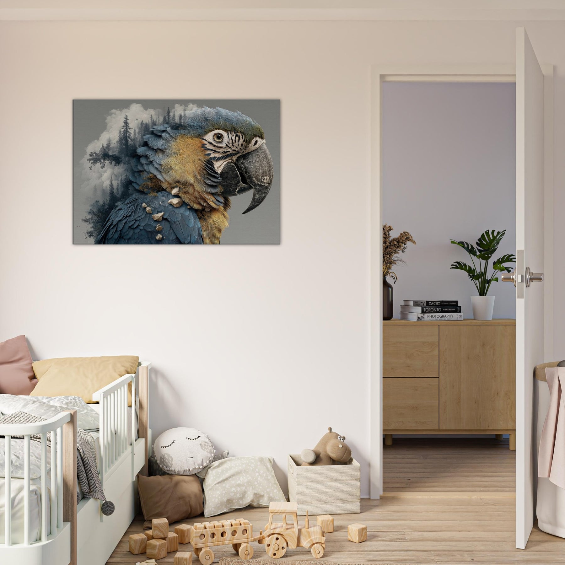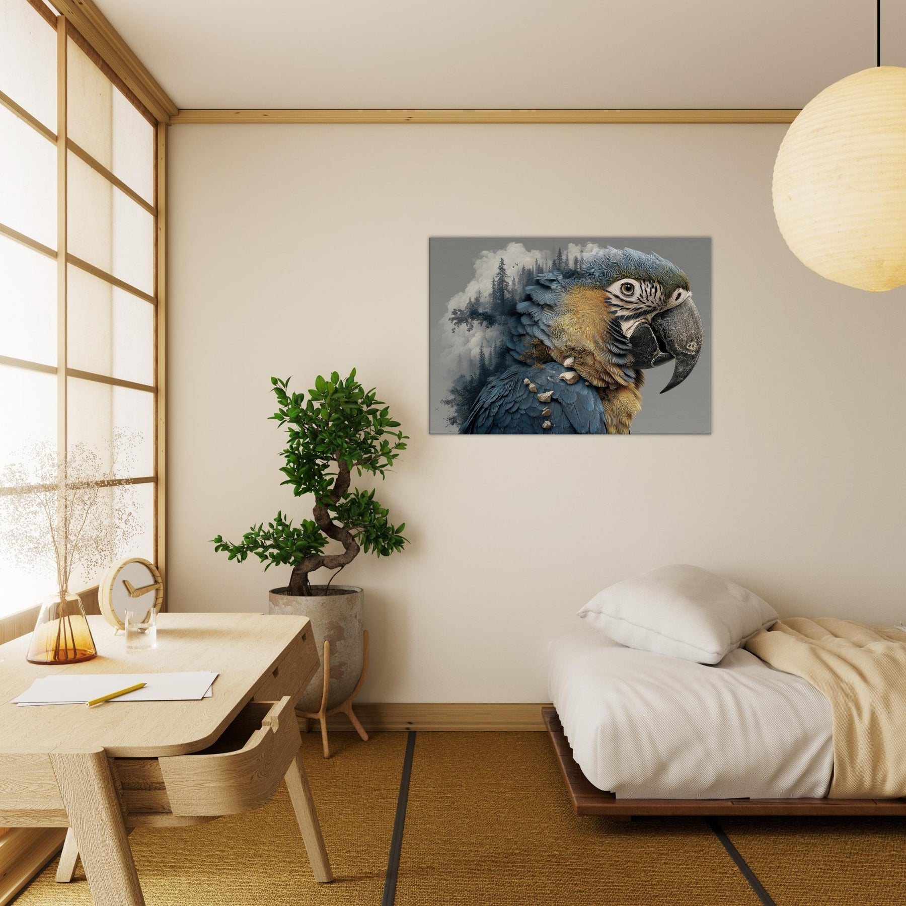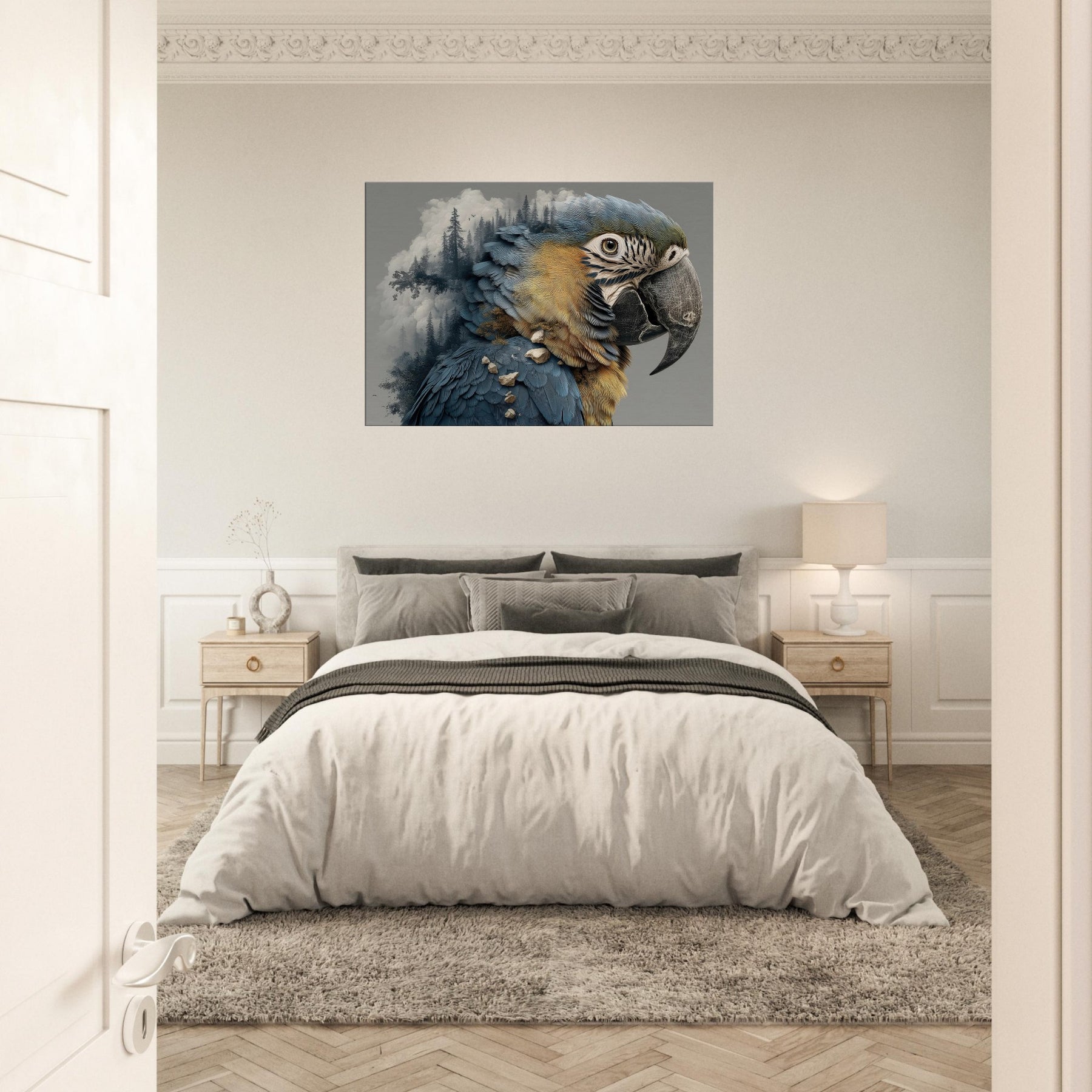 Shaped in the mood of a dream, this Parrot dissolves into a forest of silhouettes and stone, its feathers turning to rivers of blue and gold that shimmer against a quiet wall. The surreal composition invites quiet awe, as mist and pine threads trace through the creature's form, echoing the hush of a personal sanctuary. Hang it in a living room or study to summon daylight, wonder, and a whisper of the wild into everyday interiors.