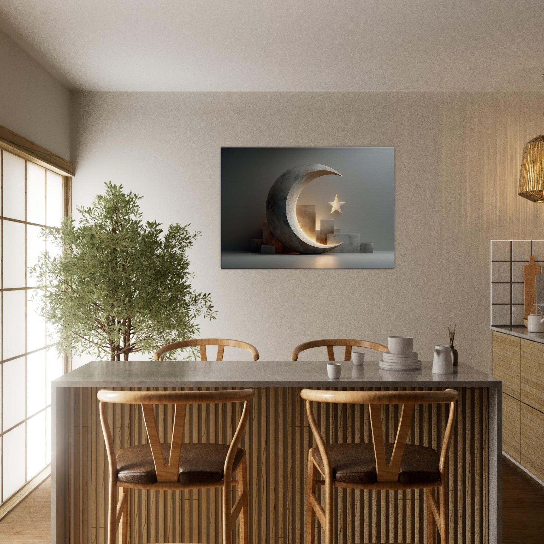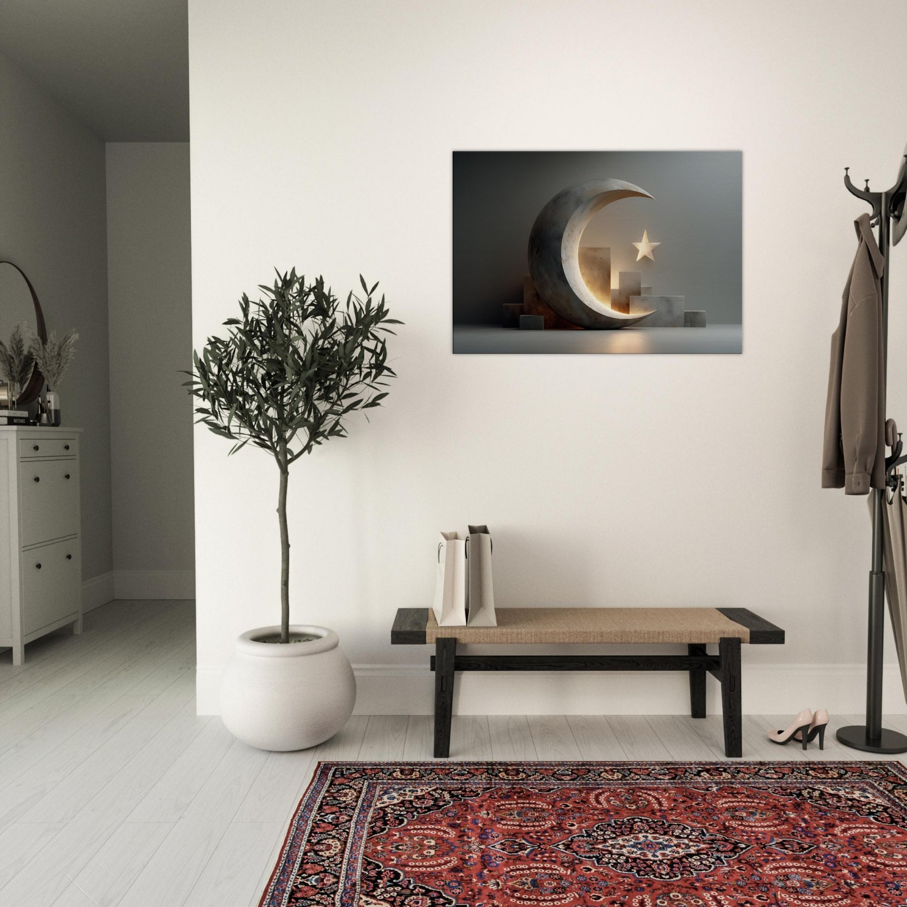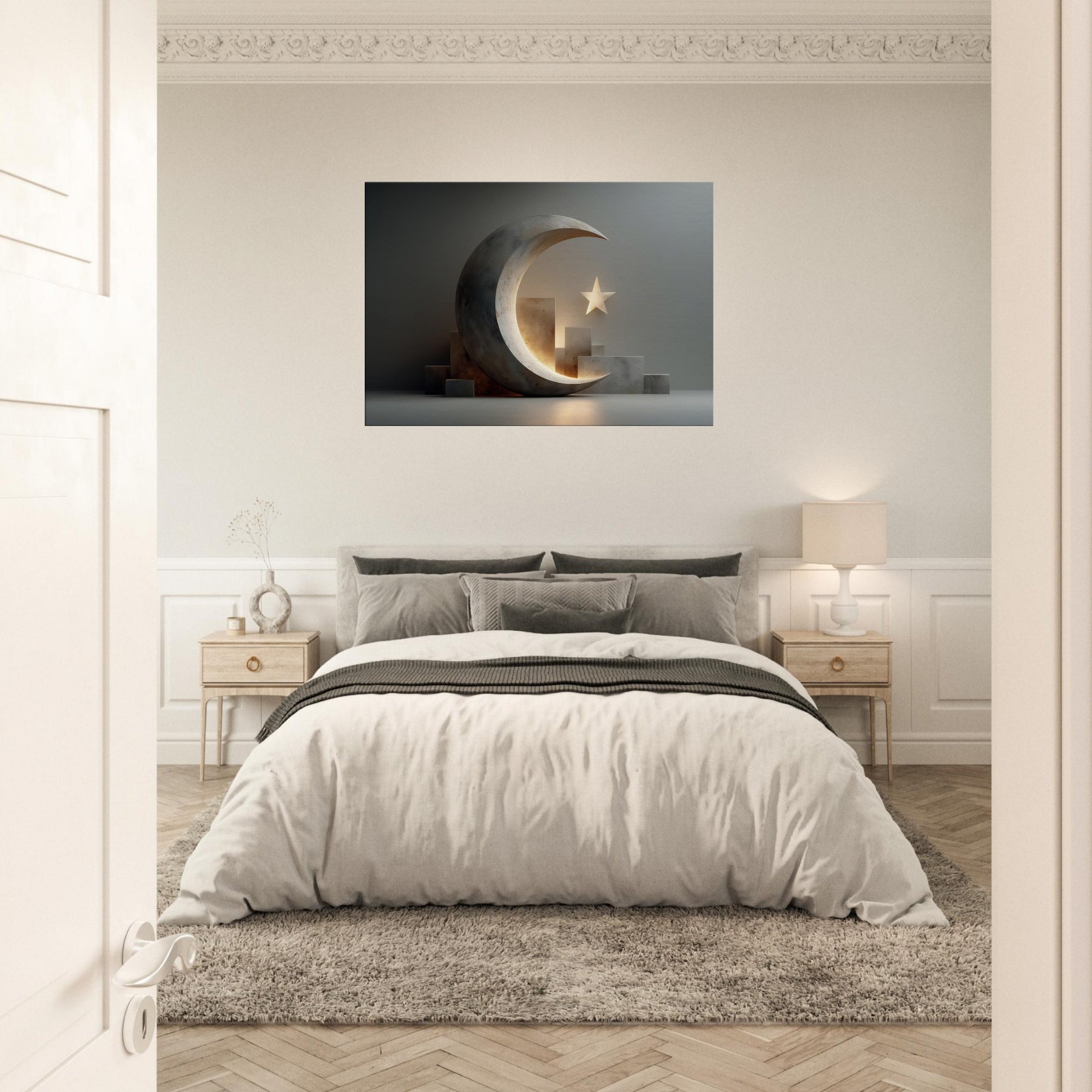 The Primary Subject, Crescent & Star (Minimal), anchors this surreal vignette with quiet gravity: a colossal crescent cradling a staircase of softly glowing blocks, while a star hovers in a warm amber glow. Light becomes a tactile presence, inviting reverie as shadows dive and rise across marble textures. The composition resolves a mystical mood that feels both ancient and newborn. In a living space, it lends a serene horizon calm, contemplative, and endlessly adaptable to furniture, color, and mood.