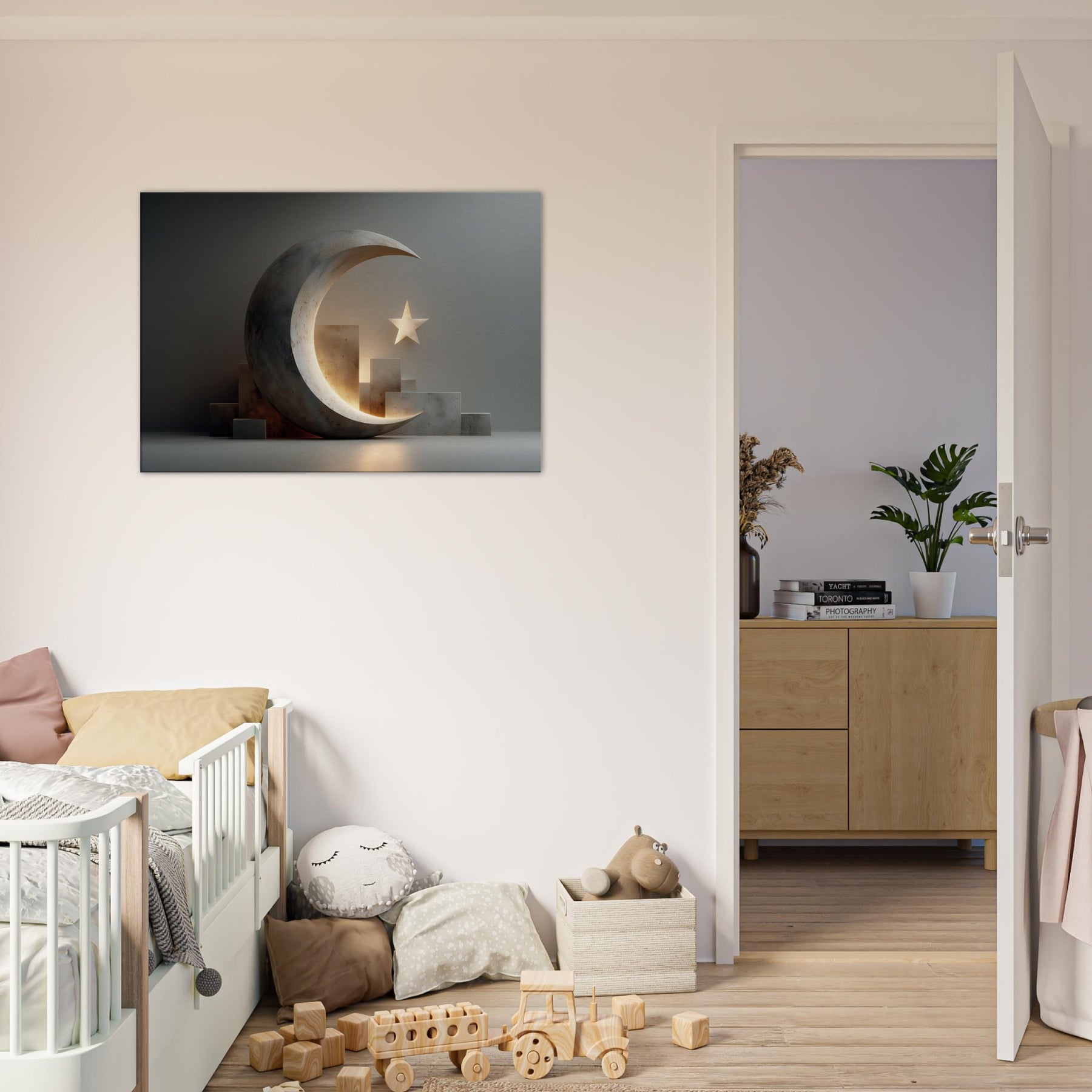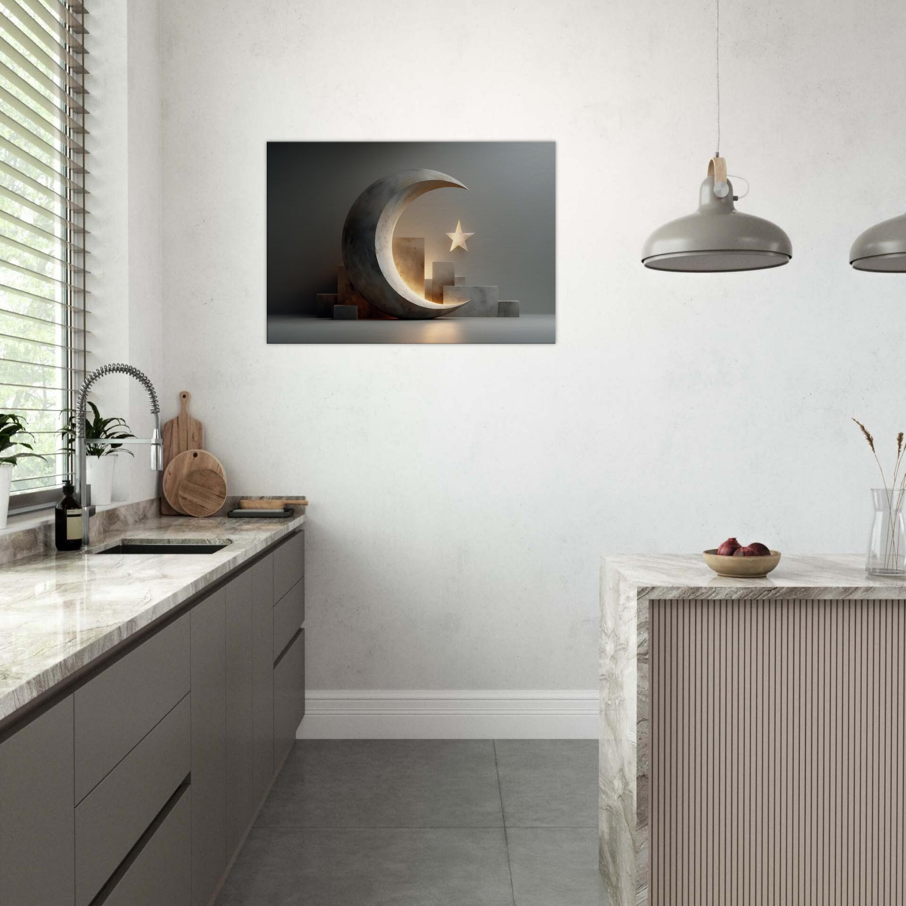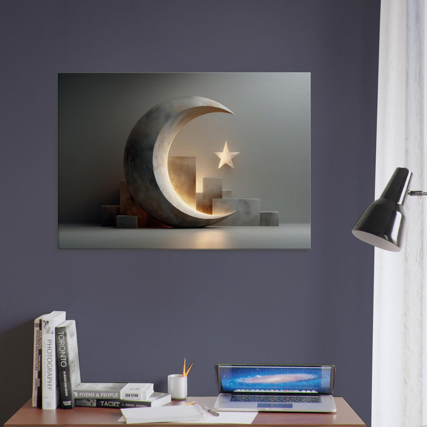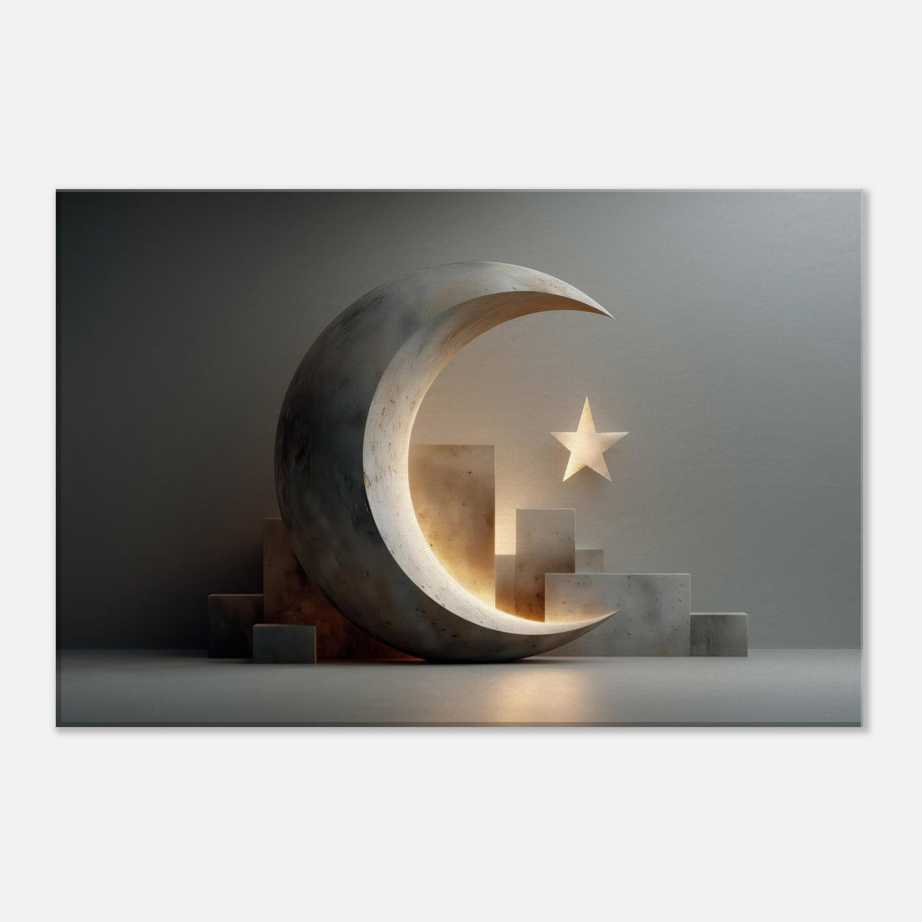 The Primary Subject, Crescent & Star (Minimal), anchors this surreal vignette with quiet gravity: a colossal crescent cradling a staircase of softly glowing blocks, while a star hovers in a warm amber glow. Light becomes a tactile presence, inviting reverie as shadows dive and rise across marble textures. The composition resolves a mystical mood that feels both ancient and newborn. In a living space, it lends a serene horizon calm, contemplative, and endlessly adaptable to furniture, color, and mood.