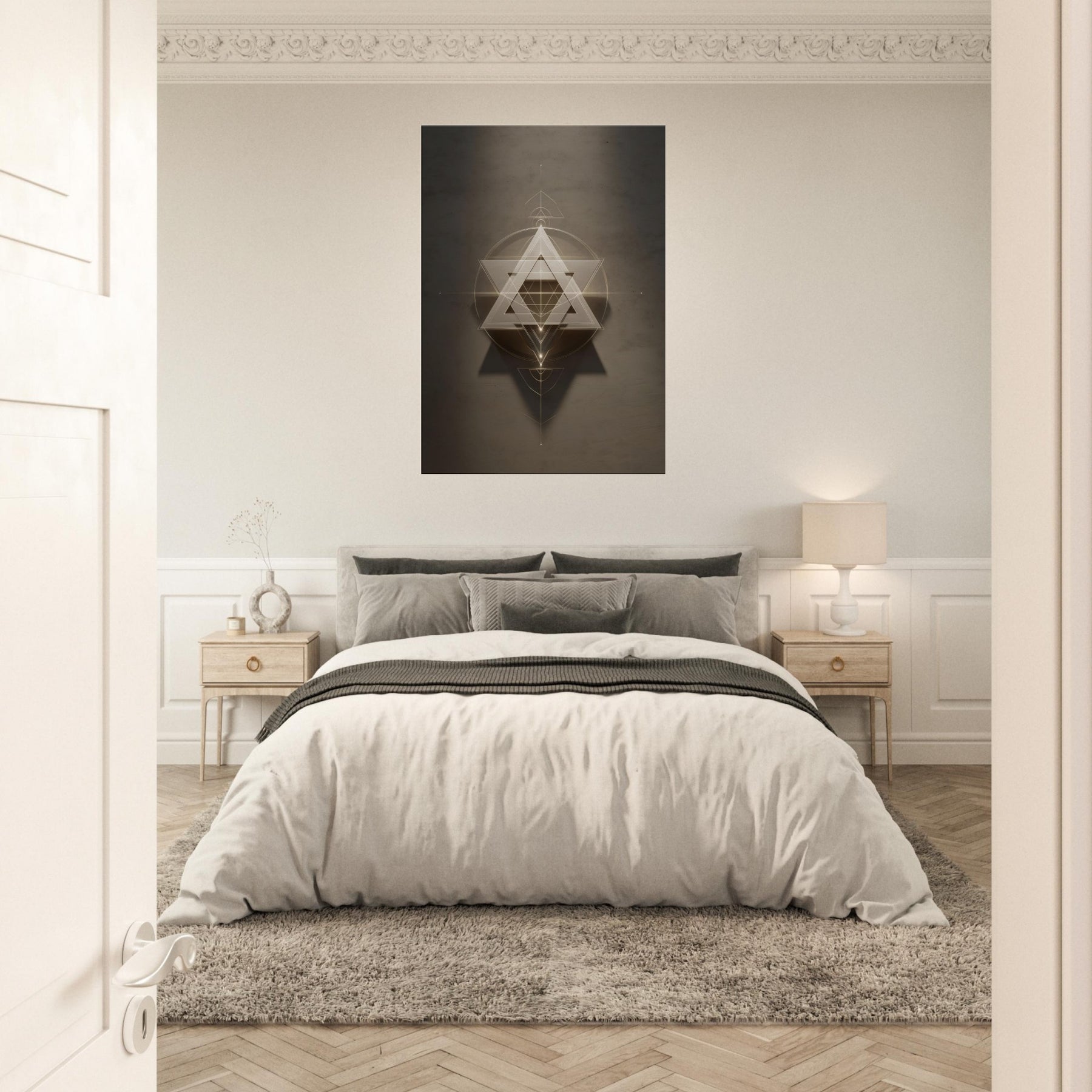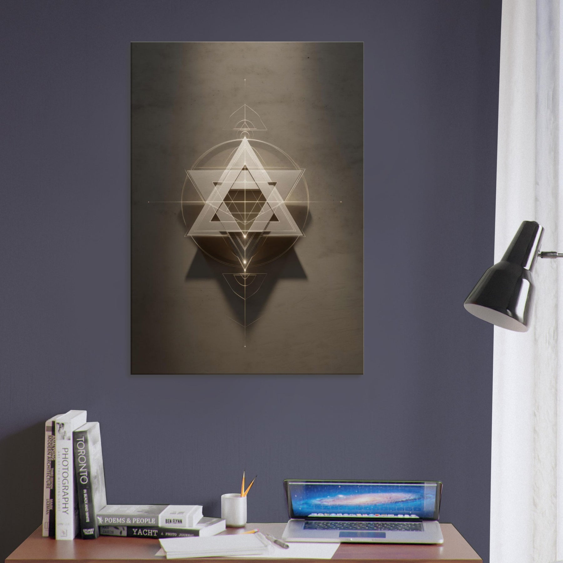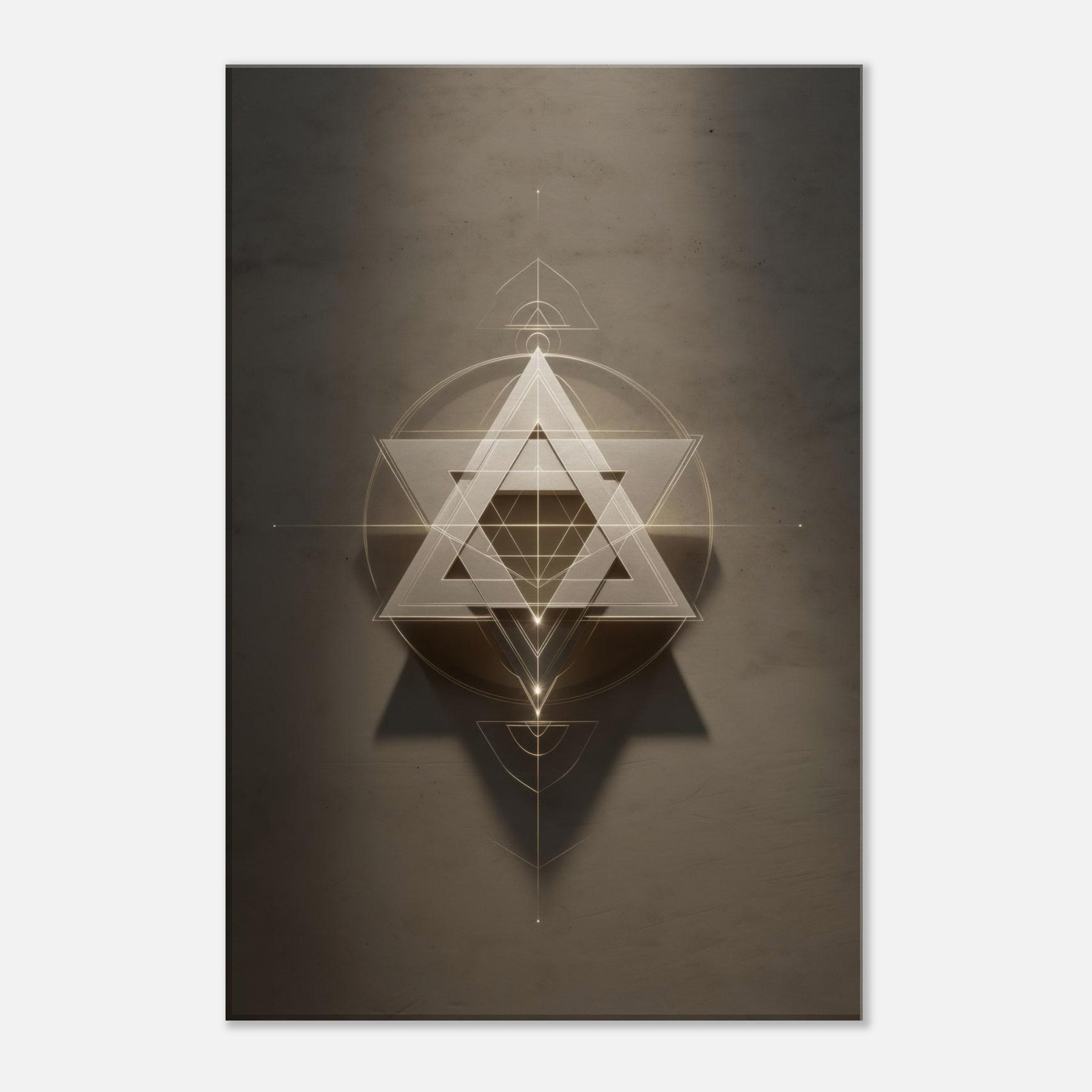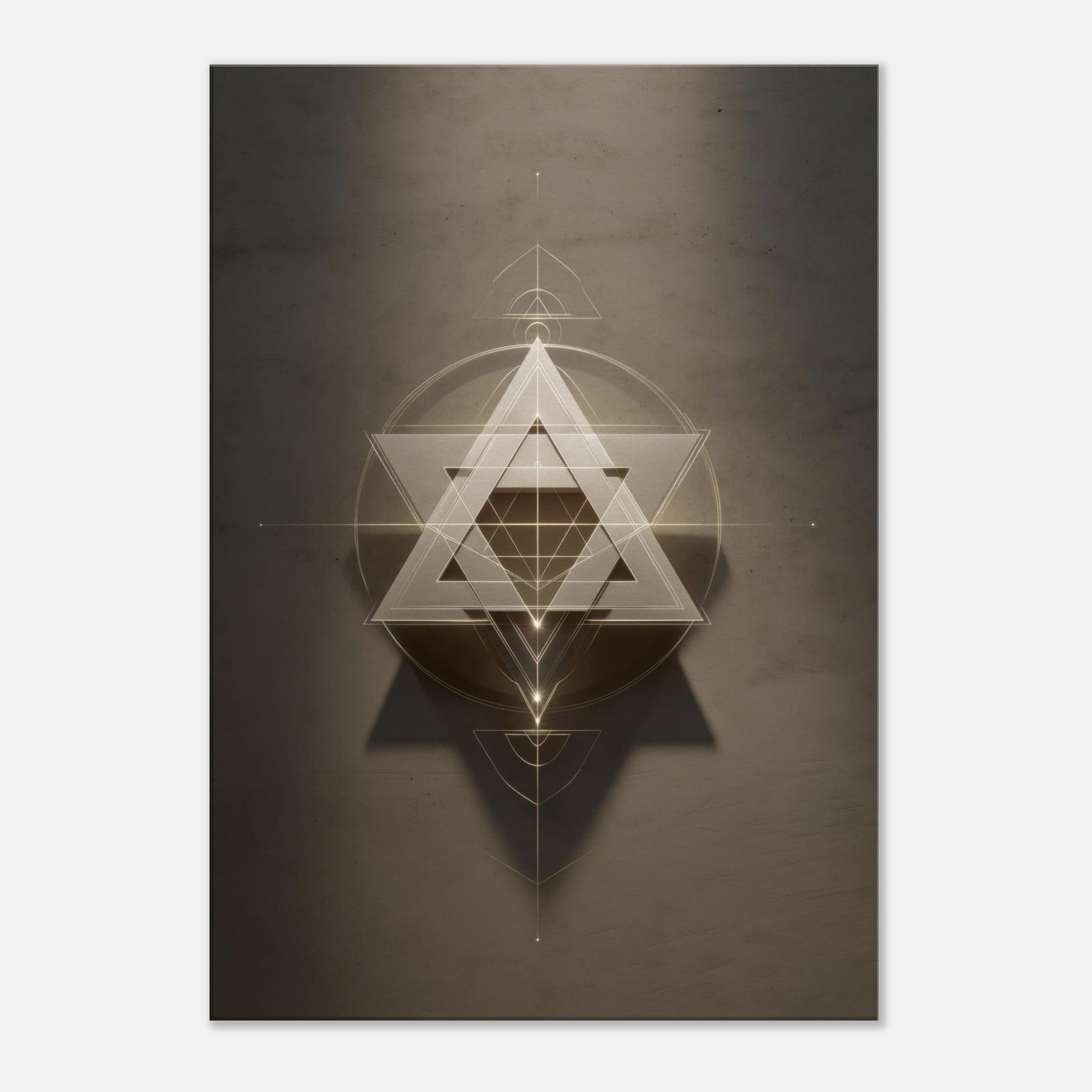 Star of David (Minimal Line) unfurls like a celestial sigil, a whisper of light carved into space. This piece layers glowing triangles and precise circles into a hypnotic lattice, inviting quiet reflection and dreamlike movement across your wall. The restrained palette and delicate lines soften a room with haloed warmth, turning a sofa or entryway into a sanctuary of balance. In living spaces, it acts as a luminous compass, guiding conversation and contemplation without shouting, making your walls feel intentional and alive.