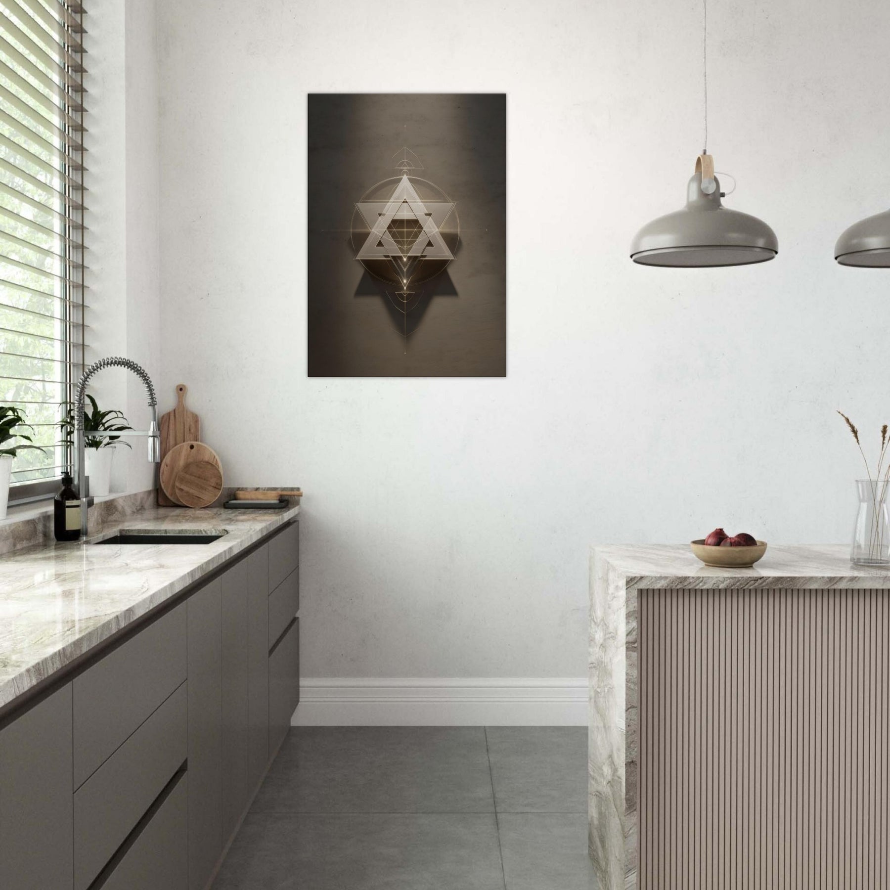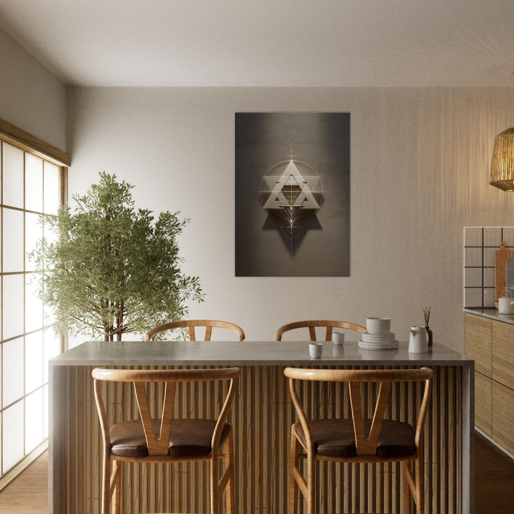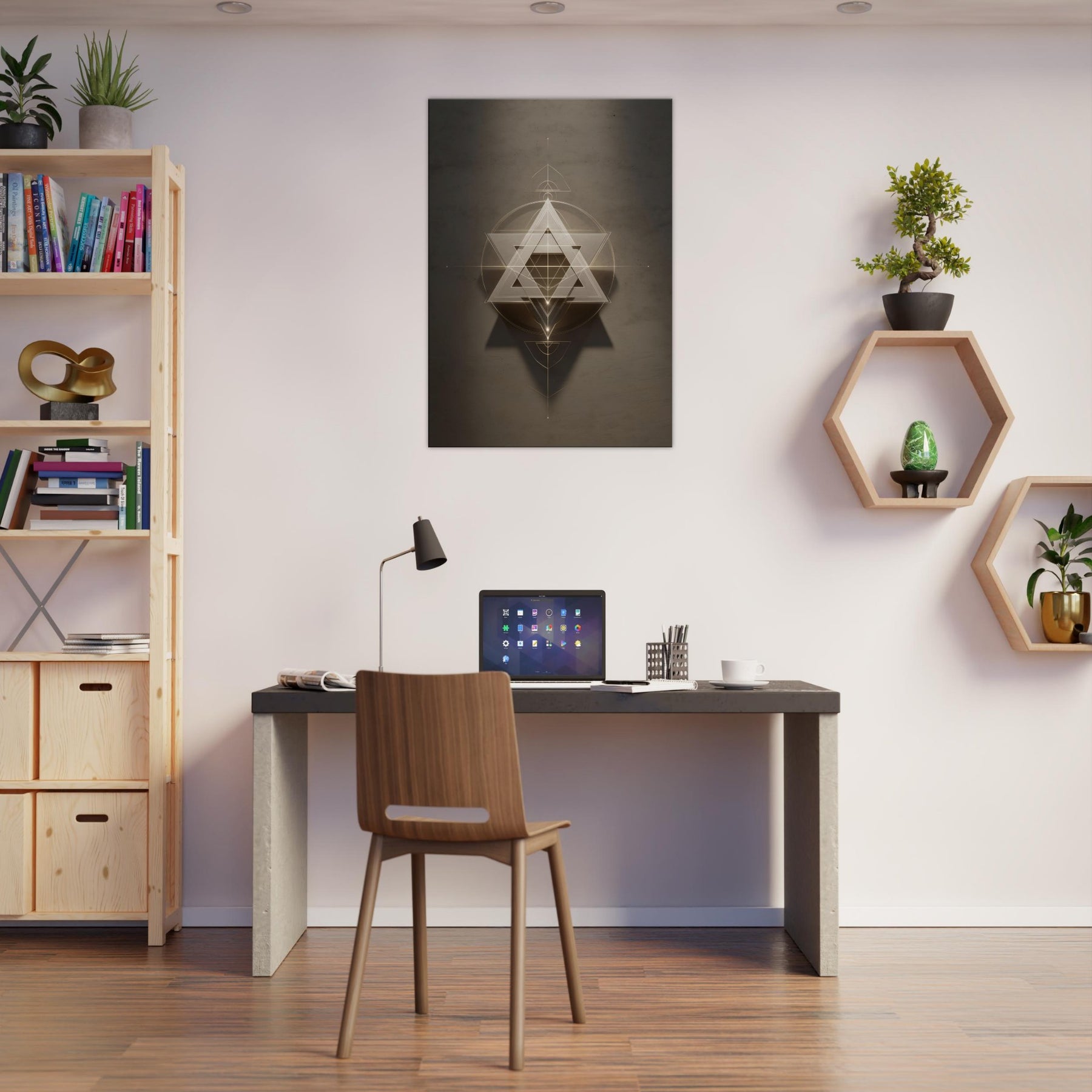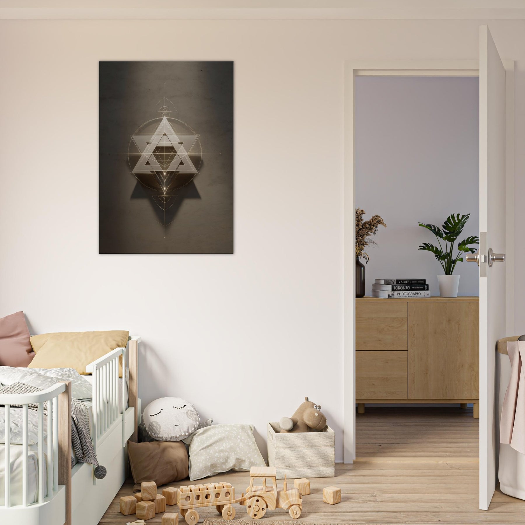 Star of David (Minimal Line) unfurls like a celestial sigil, a whisper of light carved into space. This piece layers glowing triangles and precise circles into a hypnotic lattice, inviting quiet reflection and dreamlike movement across your wall. The restrained palette and delicate lines soften a room with haloed warmth, turning a sofa or entryway into a sanctuary of balance. In living spaces, it acts as a luminous compass, guiding conversation and contemplation without shouting, making your walls feel intentional and alive.