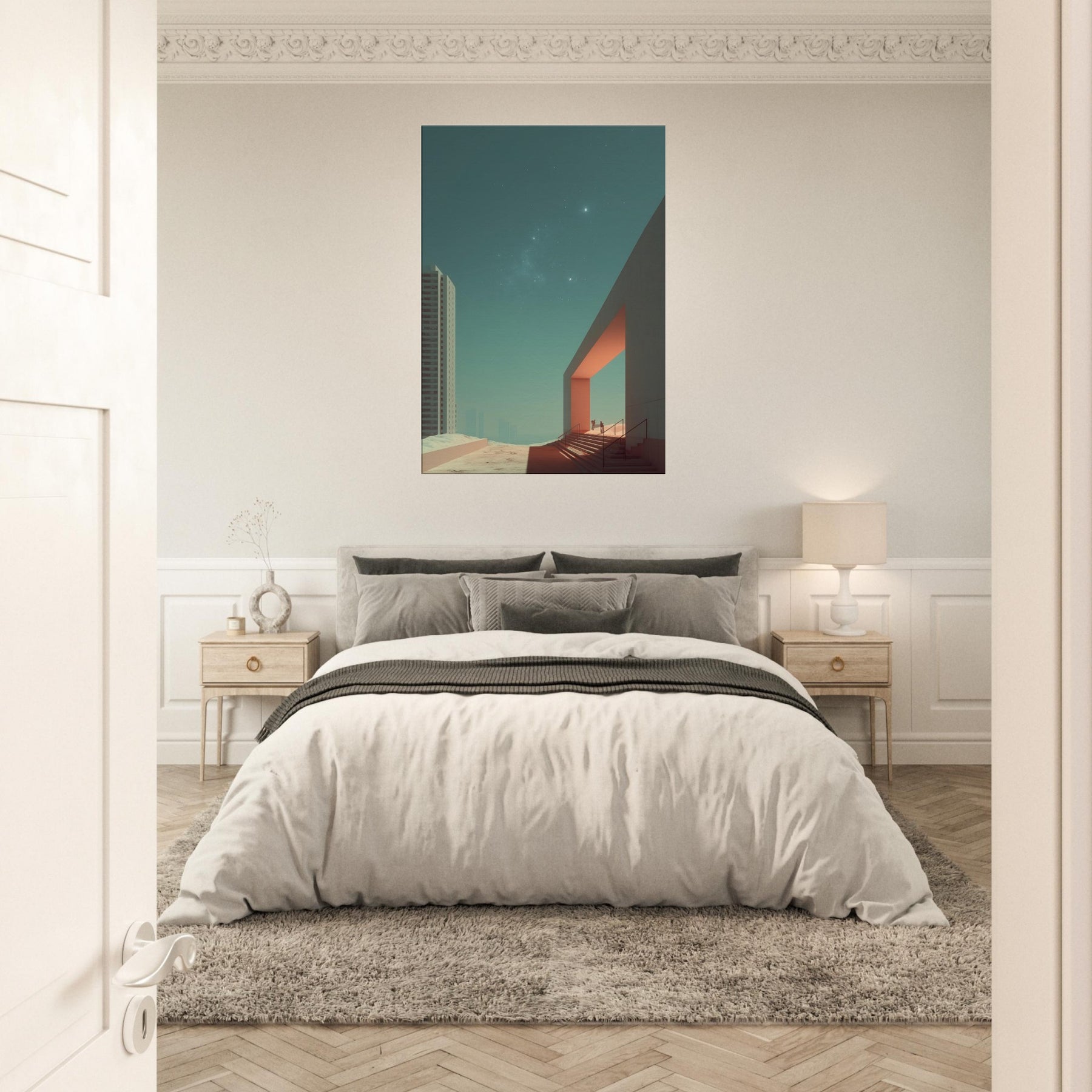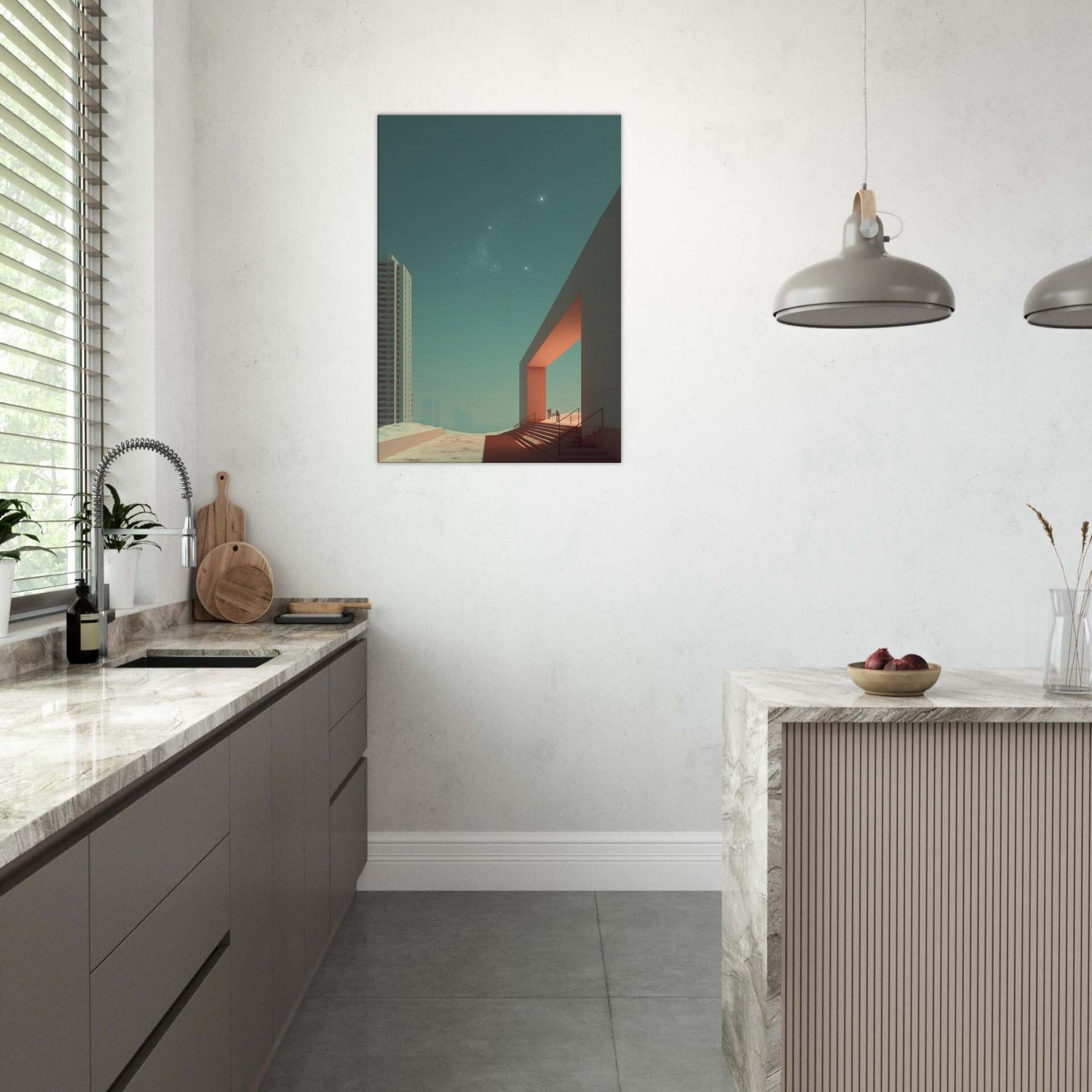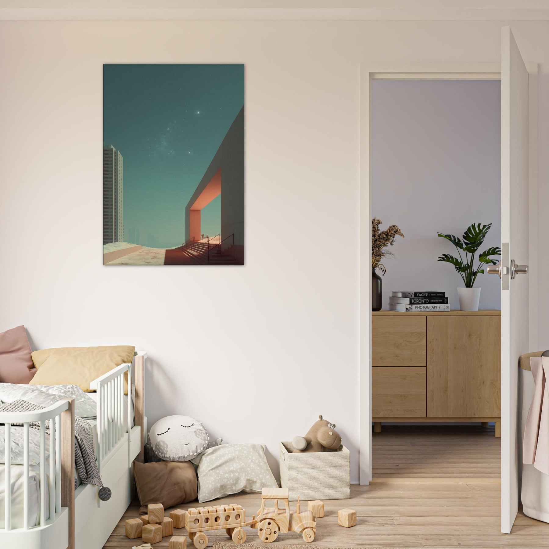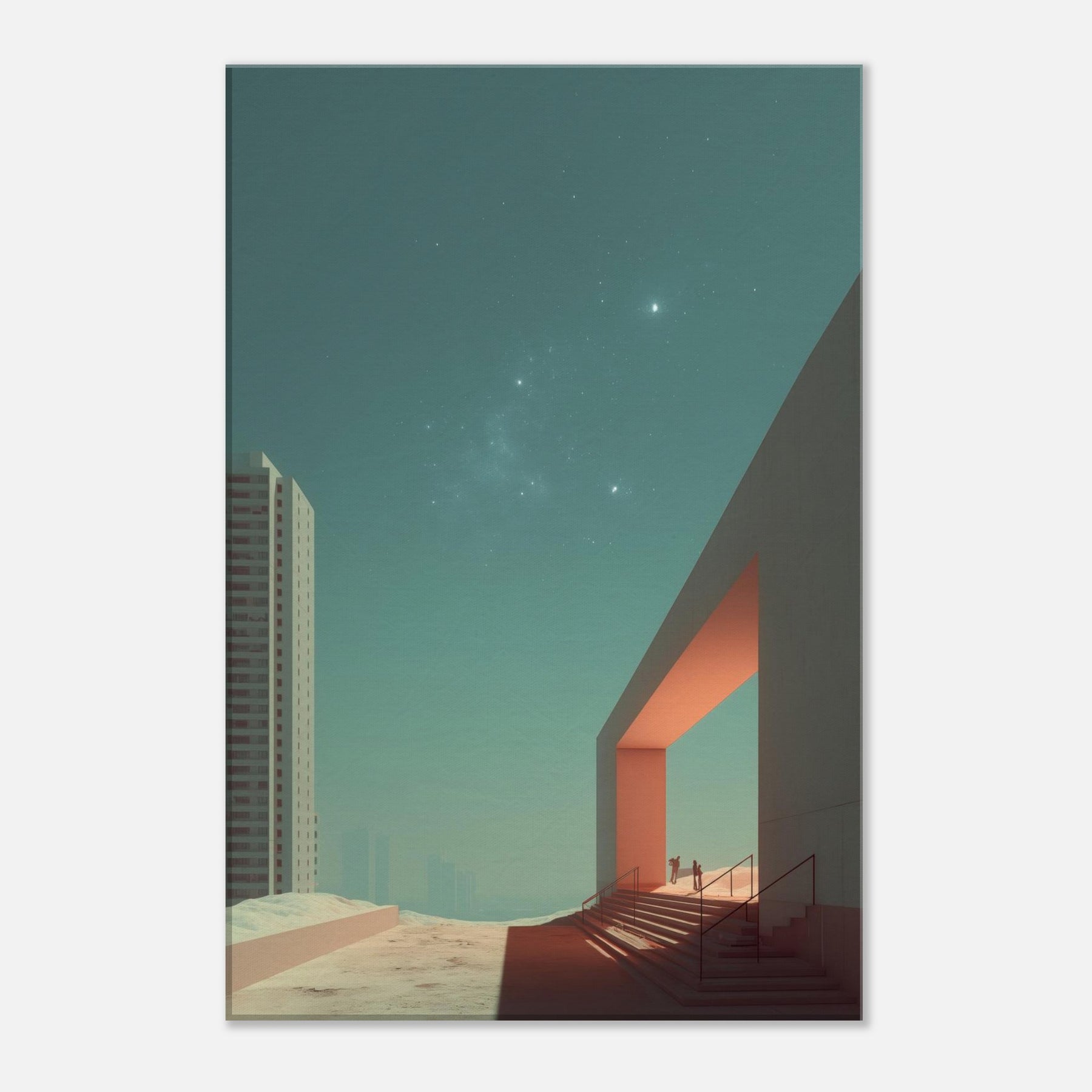 Alley Perspective invites the viewer into a dreamlike boulevard where geometry leans toward the horizon and light carves quiet pathways. The surreal merges city and sky, with a stark doorway becoming a portal between ordinary brick and a distant, star touched calm. This print bathes a room in cool teal and warm orange accents, turning walls into a soft stage for contemplation. A striking focal point for living rooms or studios, it elevates everyday space with cinematic stillness and wonder.