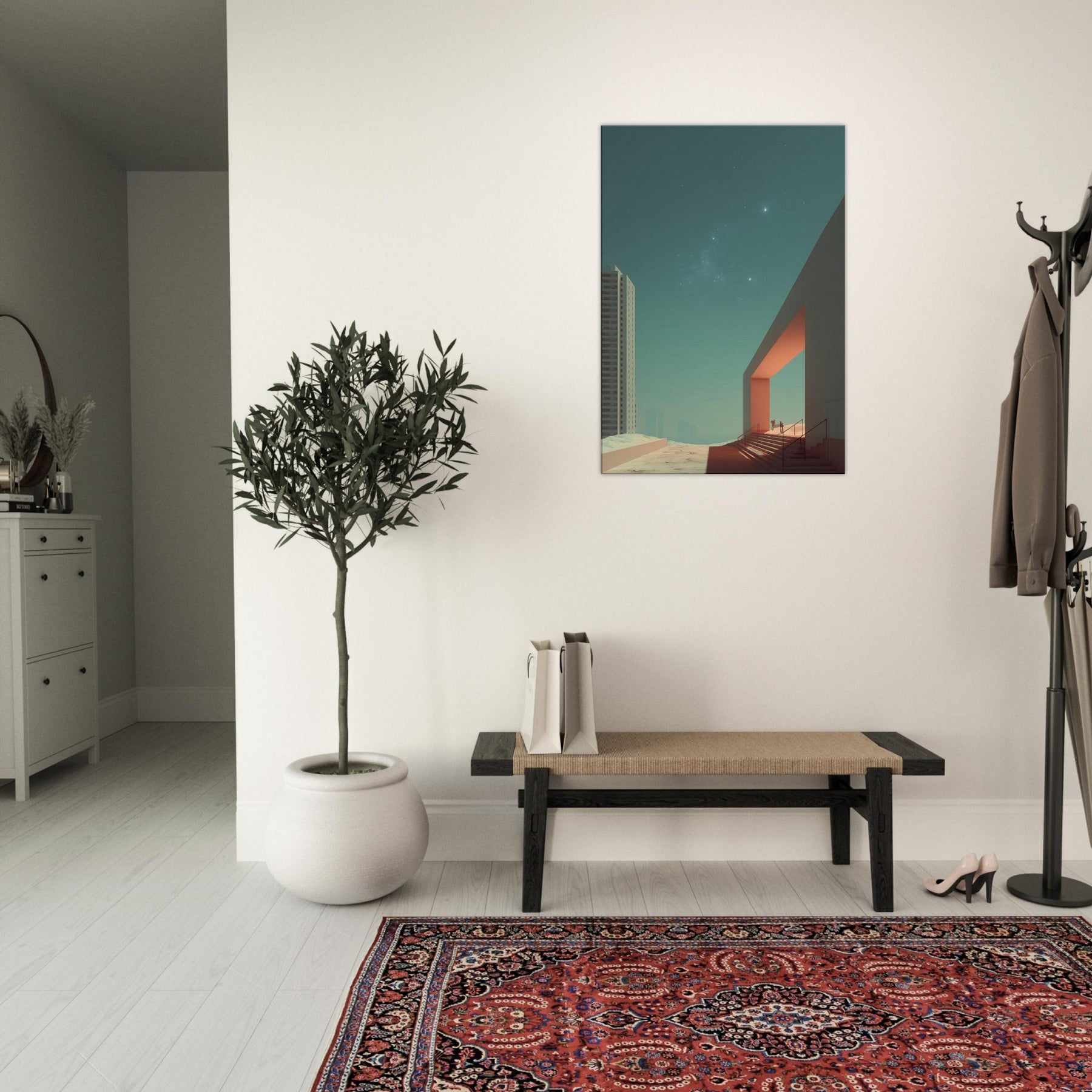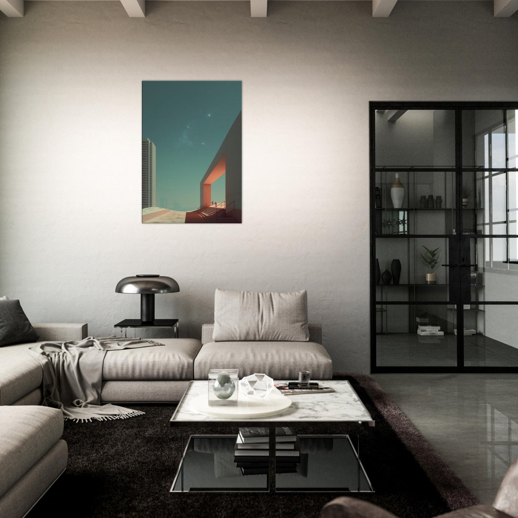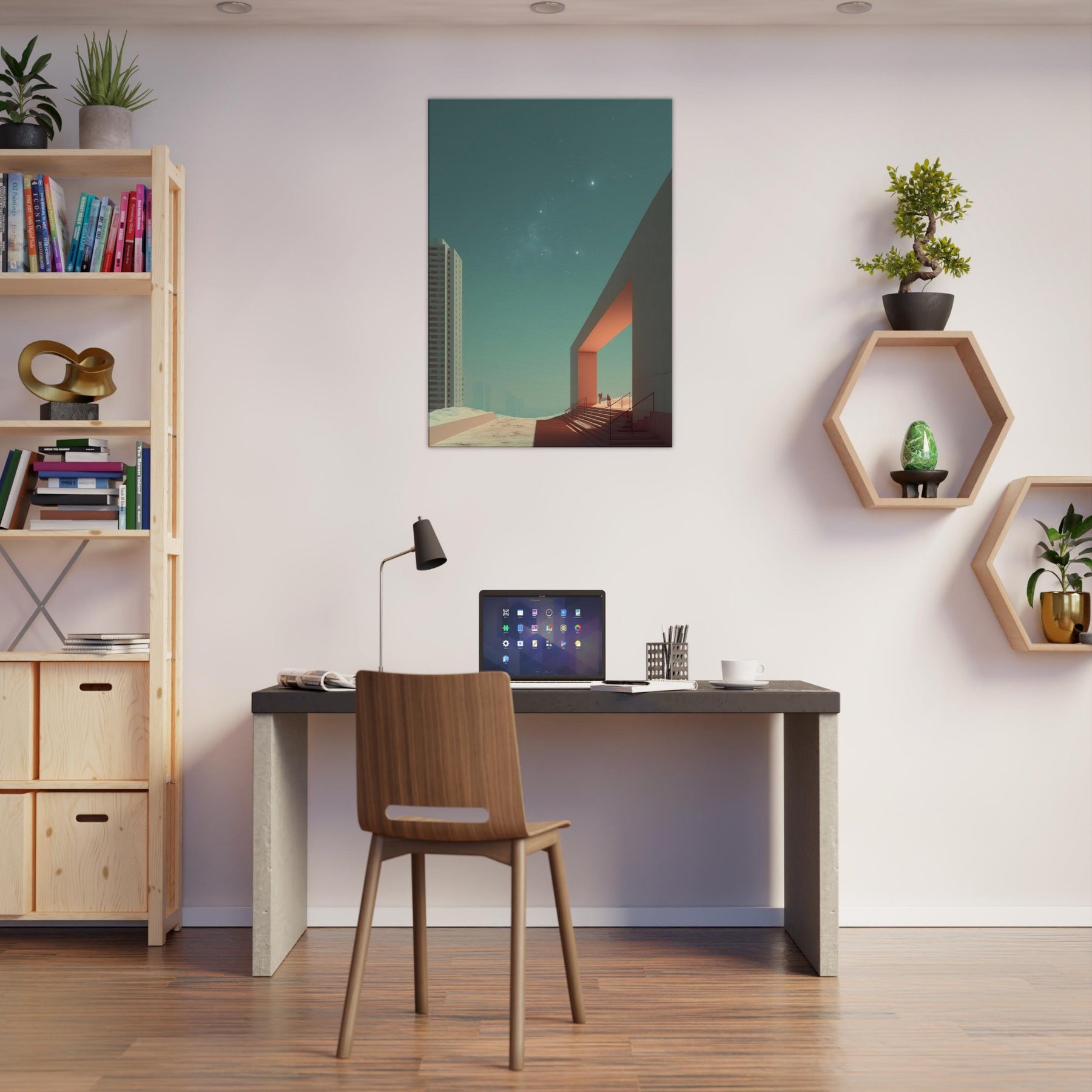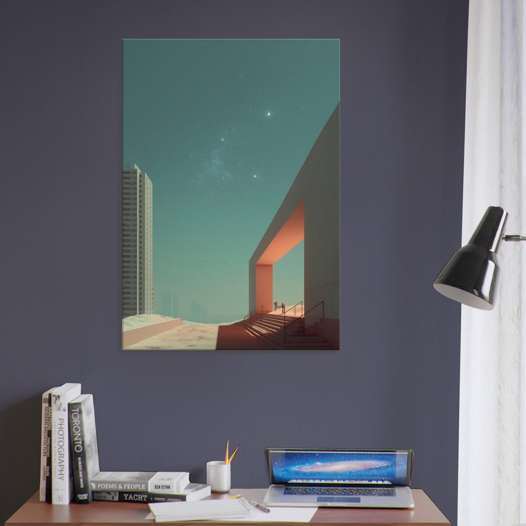 Alley Perspective invites the viewer into a dreamlike boulevard where geometry leans toward the horizon and light carves quiet pathways. The surreal merges city and sky, with a stark doorway becoming a portal between ordinary brick and a distant, star touched calm. This print bathes a room in cool teal and warm orange accents, turning walls into a soft stage for contemplation. A striking focal point for living rooms or studios, it elevates everyday space with cinematic stillness and wonder.