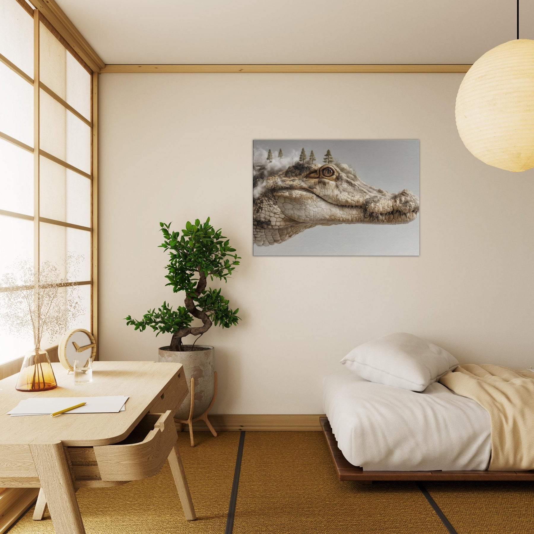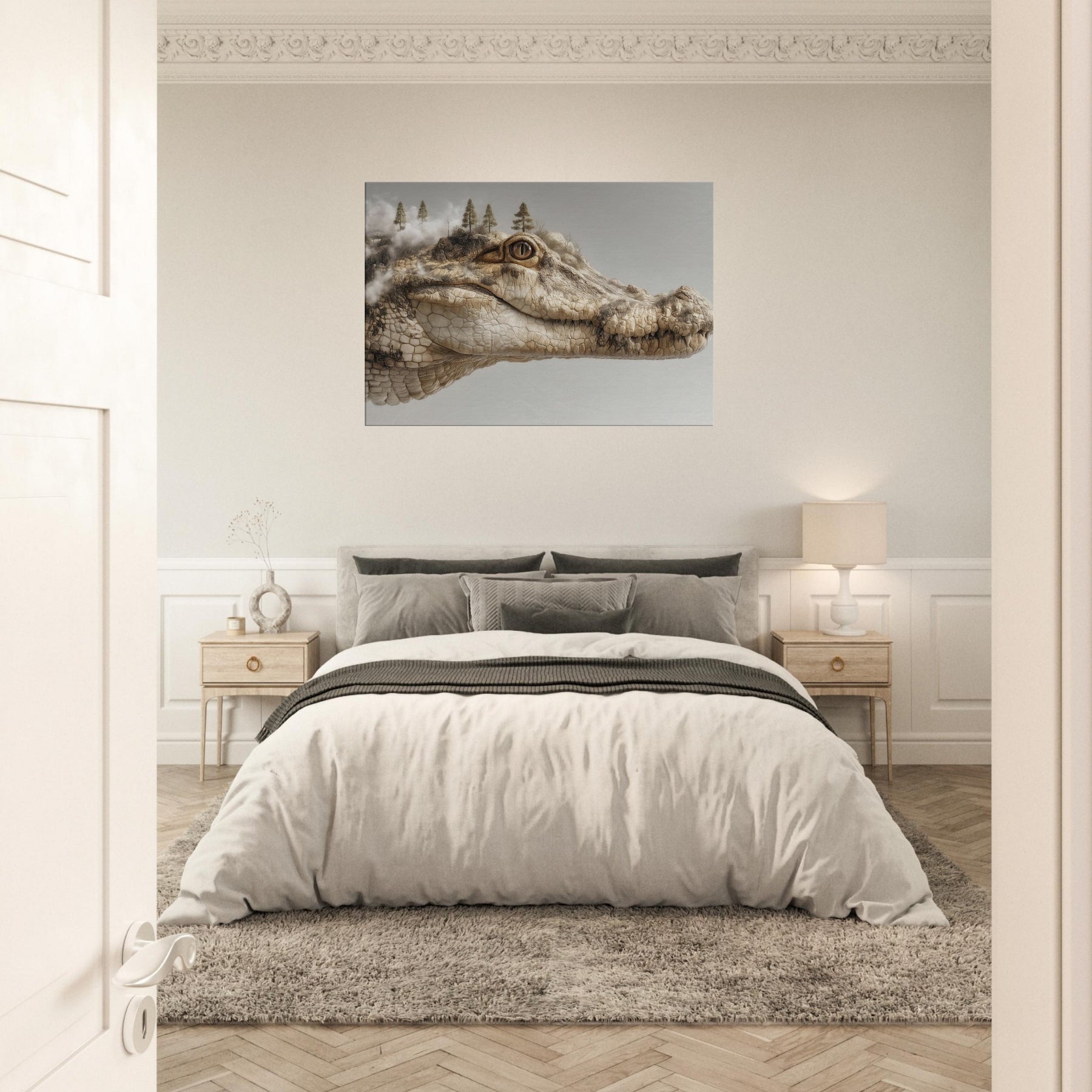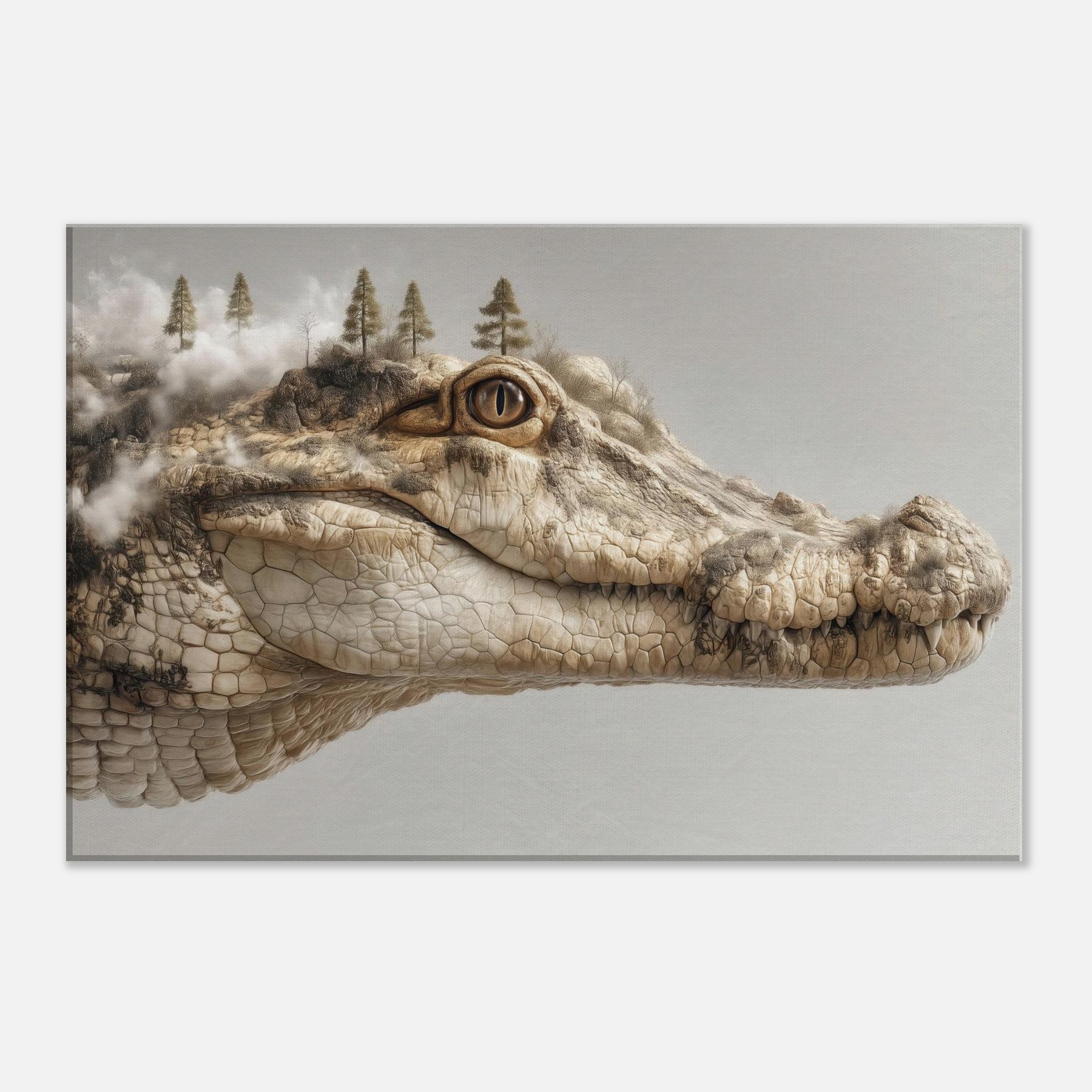 On this canvas, a Crocodile lounges between dream and dawn, its scales a mosaic of river fog and rock. Surreal trees crown its brow as steam of memory curls from the shoreline, inviting a room to pause, inhale, and listen. The piece hums with quiet tension and warmth earthy beige, sunlit ochre, and a whisper of charcoal. Hang it to spark reflection or inspire whispered conversations at night, transforming any living space into a tranquil, enigmatic .