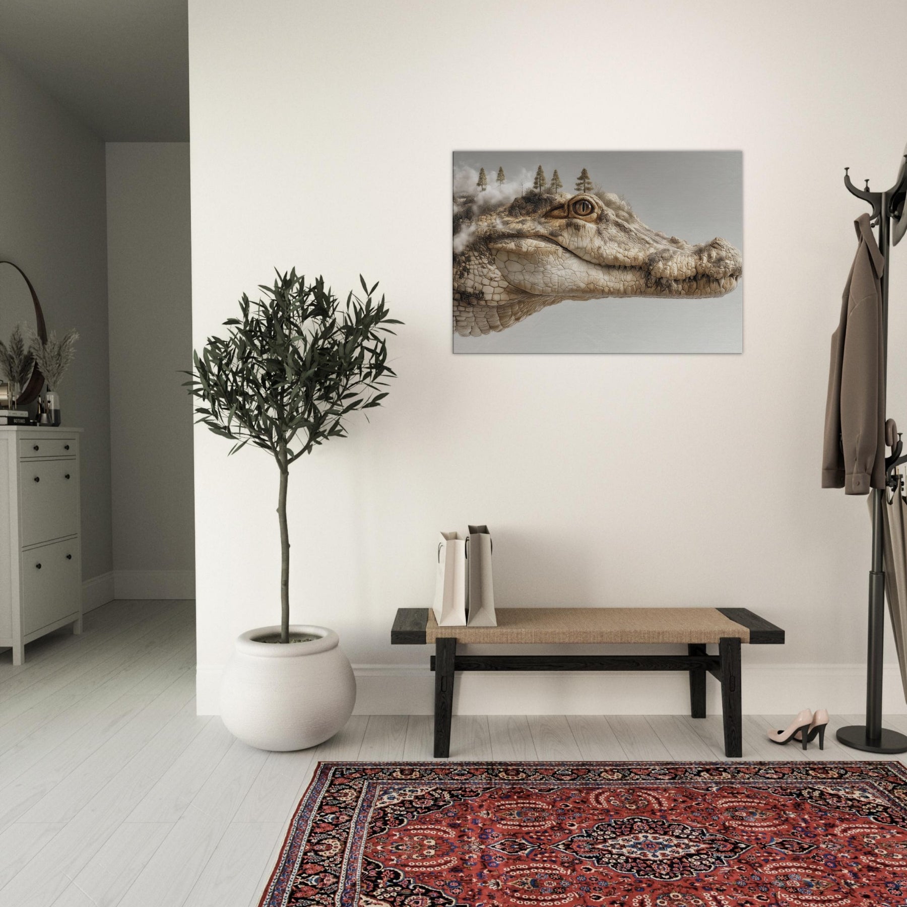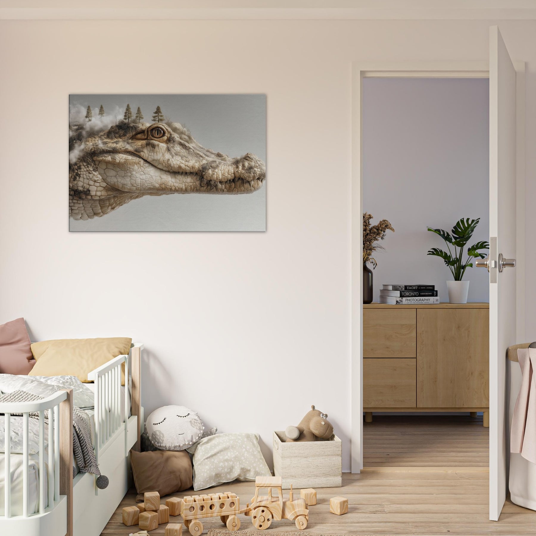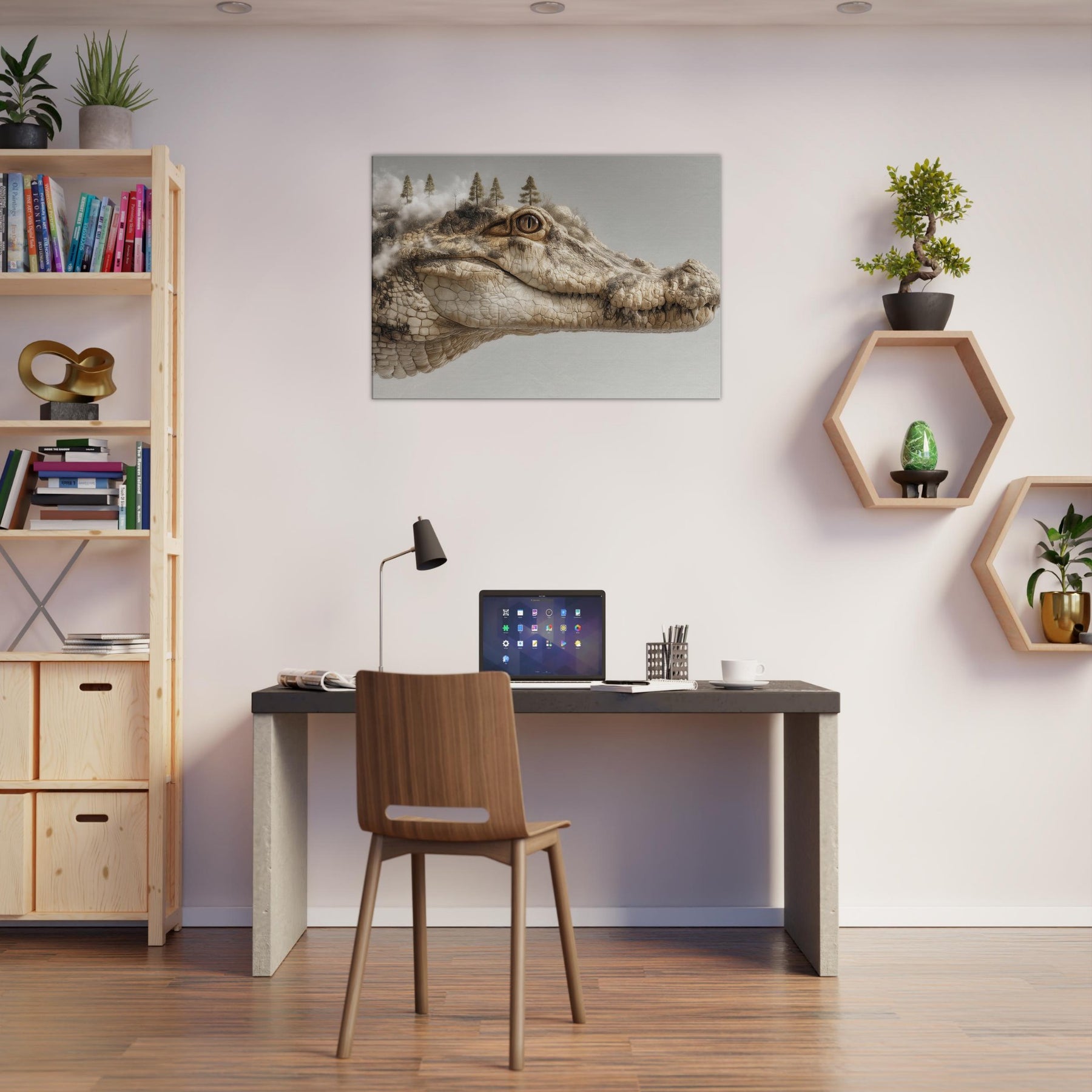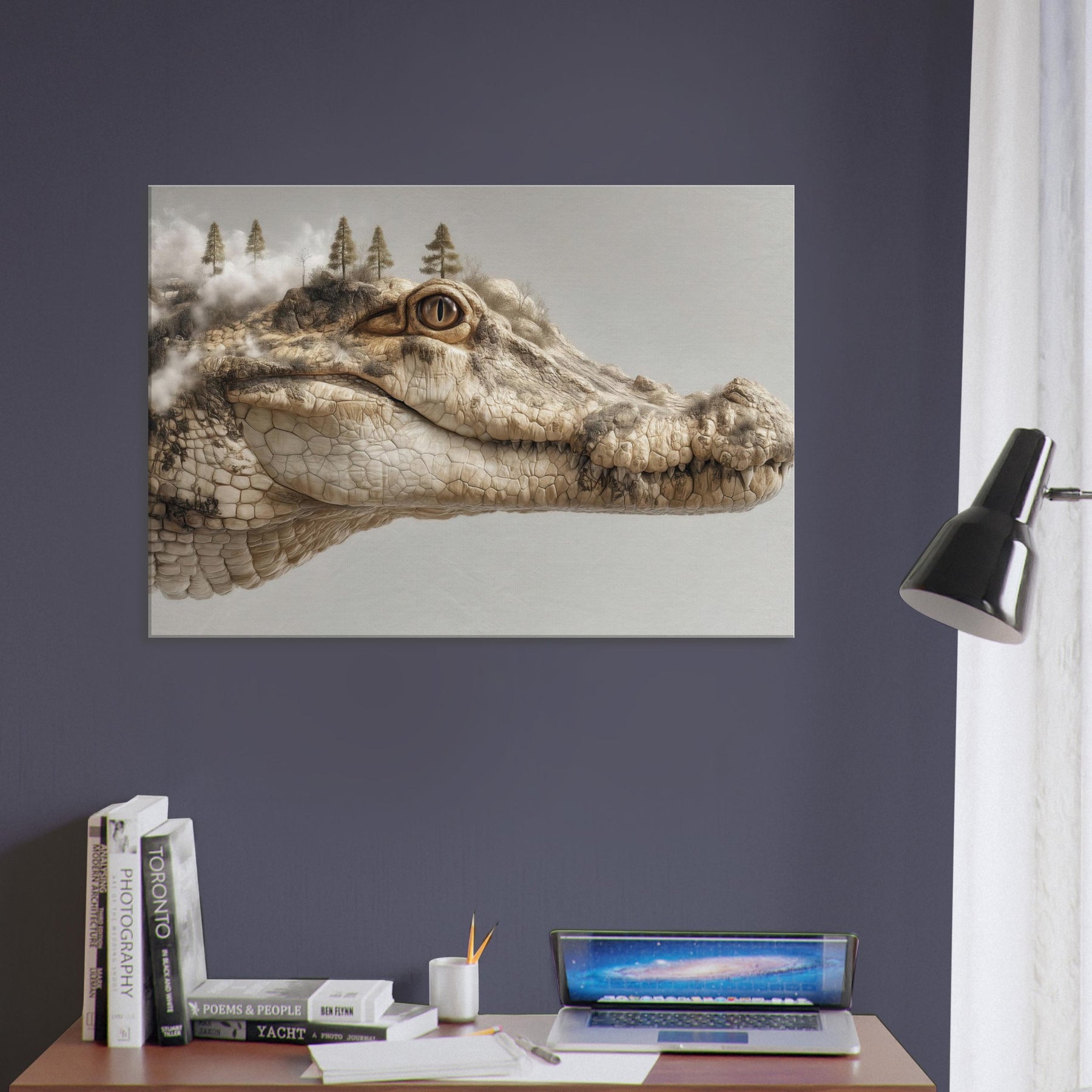 On this canvas, a Crocodile lounges between dream and dawn, its scales a mosaic of river fog and rock. Surreal trees crown its brow as steam of memory curls from the shoreline, inviting a room to pause, inhale, and listen. The piece hums with quiet tension and warmth earthy beige, sunlit ochre, and a whisper of charcoal. Hang it to spark reflection or inspire whispered conversations at night, transforming any living space into a tranquil, enigmatic .