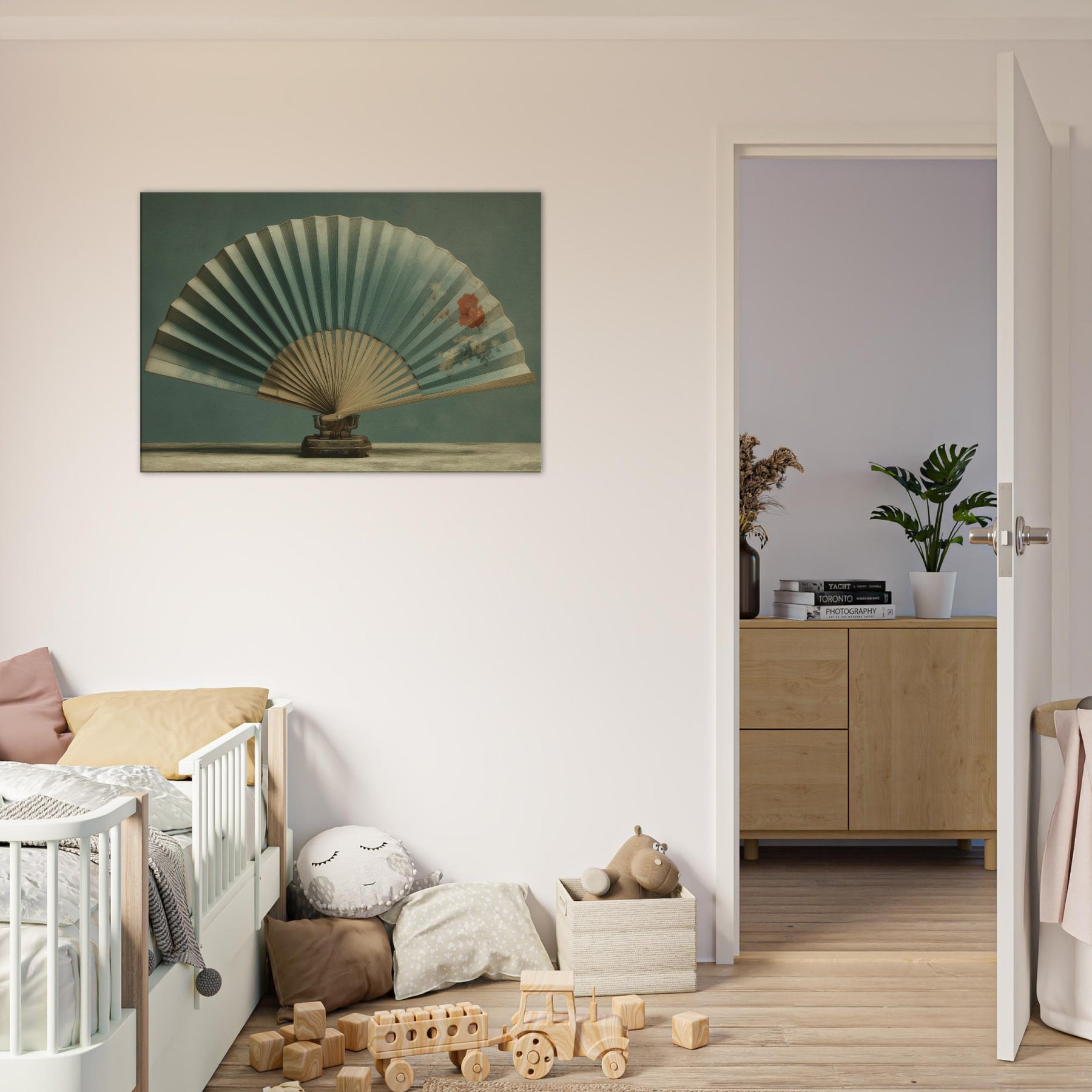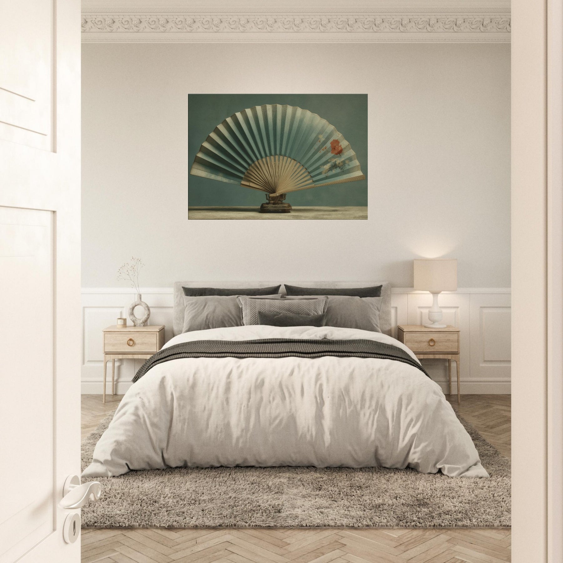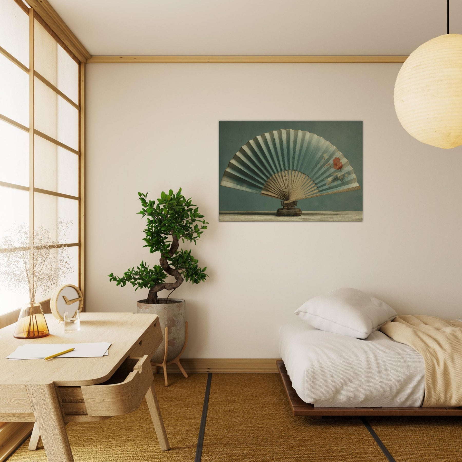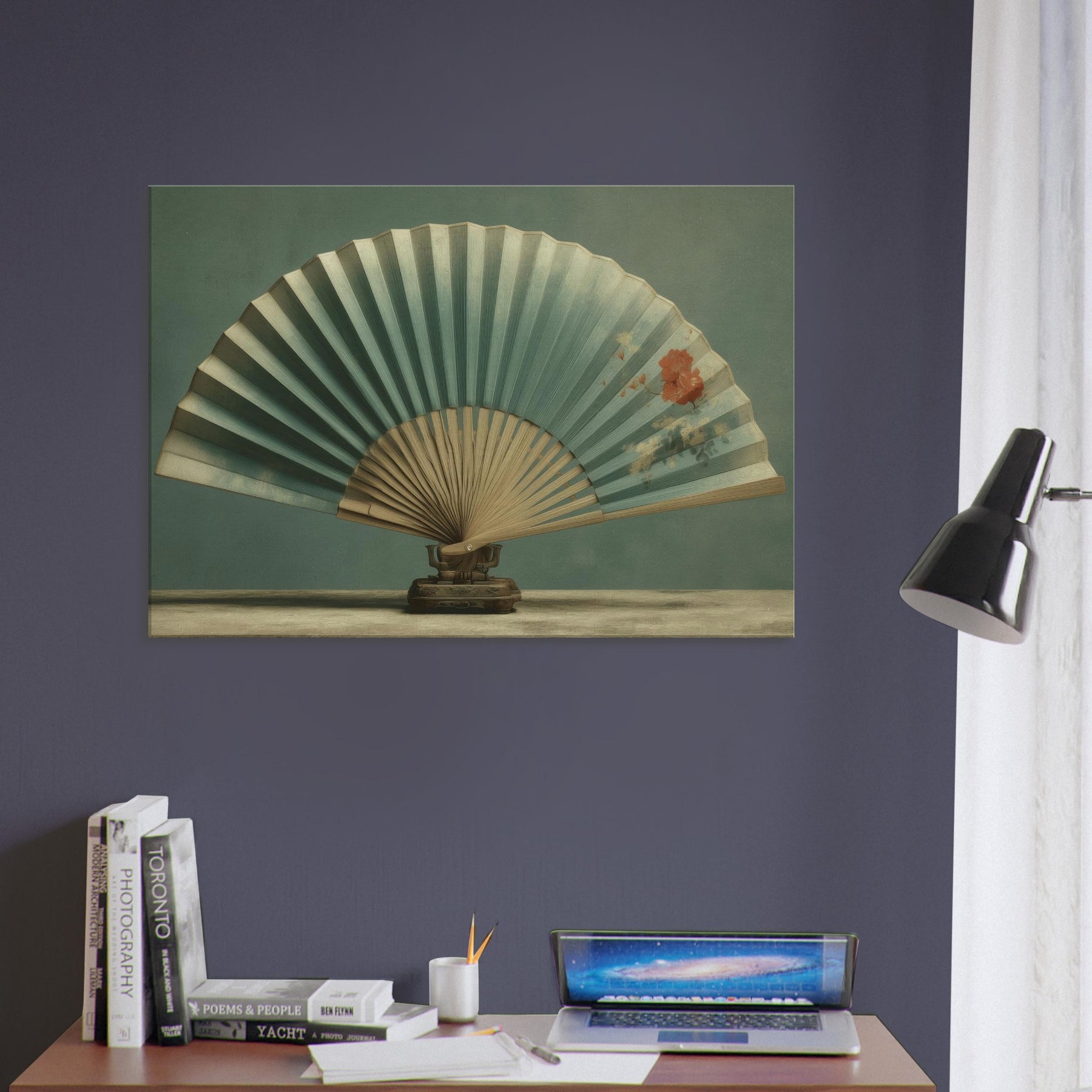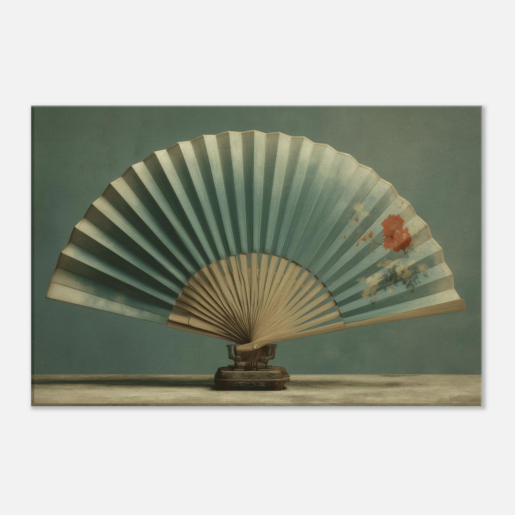 Shaped by patient stillness, this piece centers on a Folding Fan on Table, suspended between memory and dream. The fan’s soft teal pleats unfold like a quiet horizon, while a delicate bloom hums in the air, as if pressed into the moment. A surreal still life that invites contemplation and conversation, it invites warmth and calm into a living space. Place it where light lingers above a console, beside a sofa and let its gentle geometry refract everyday stillness into wonder.