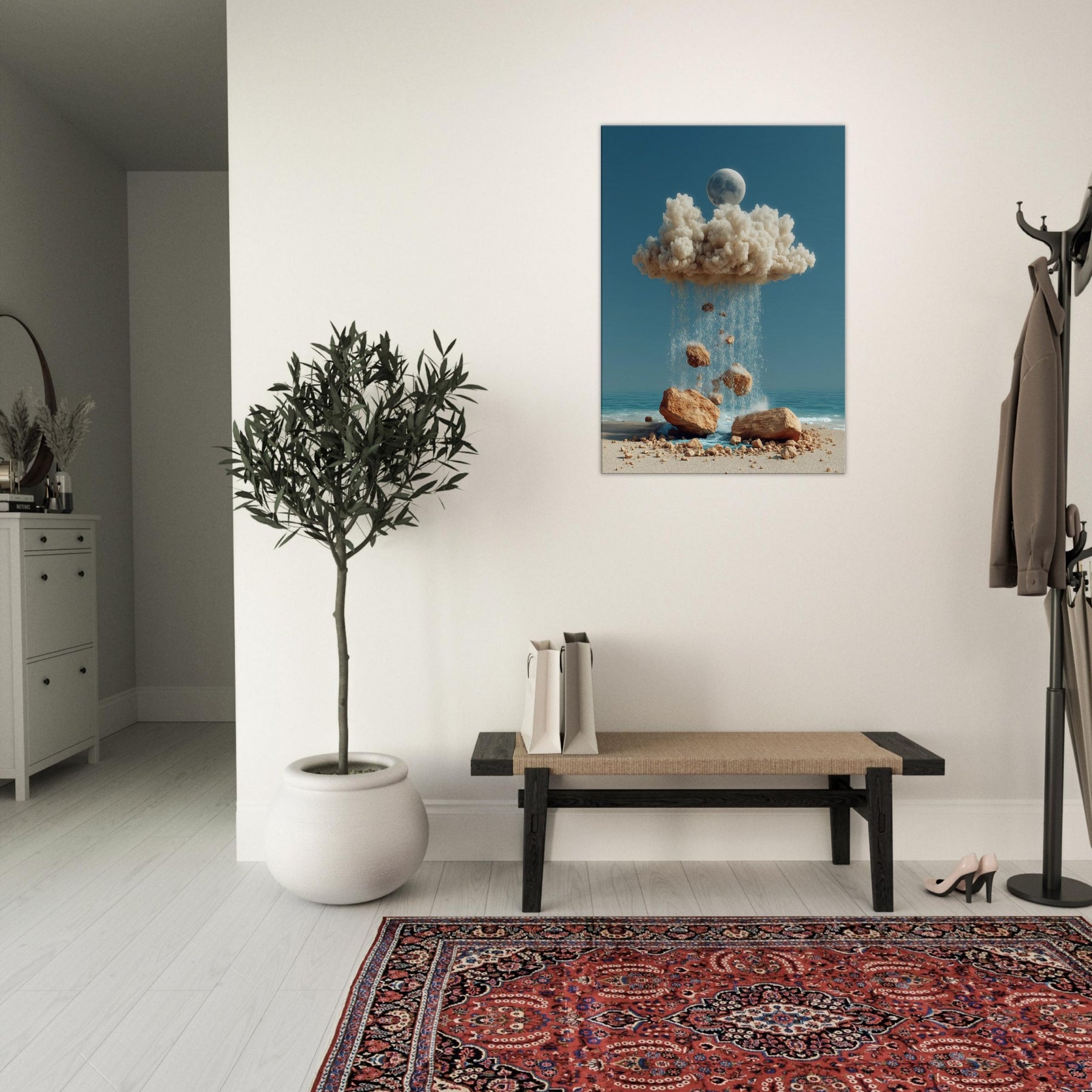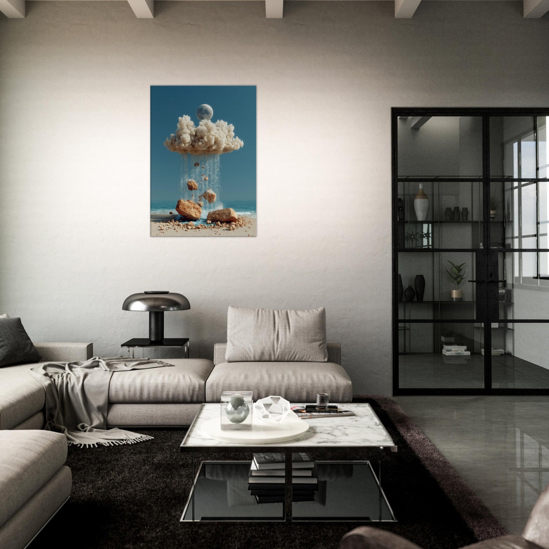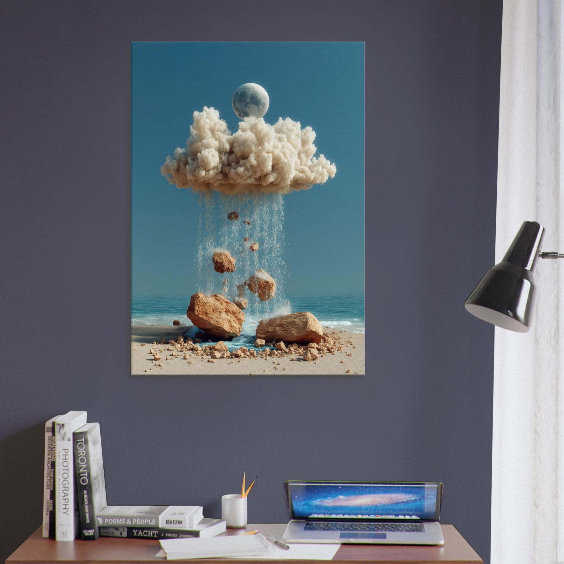 Sandstorm arrives as a slow, luminous eruption against a quiet horizon. A cloud, heavy with memory, hovers over a shoreline, crowned by a pale moon, while stones drift downward like suspended time. The scene folds the senses, the warm scent of sea spray, the grit of mineral rain, the hush of wind bending light. In a living room, this artwork becomes a doorway to contemplation, softening hard edges with dreamlike scale and tranquil tension. It invites slow breaths, expansive walls, and conversations that drift beyond the ordinary.