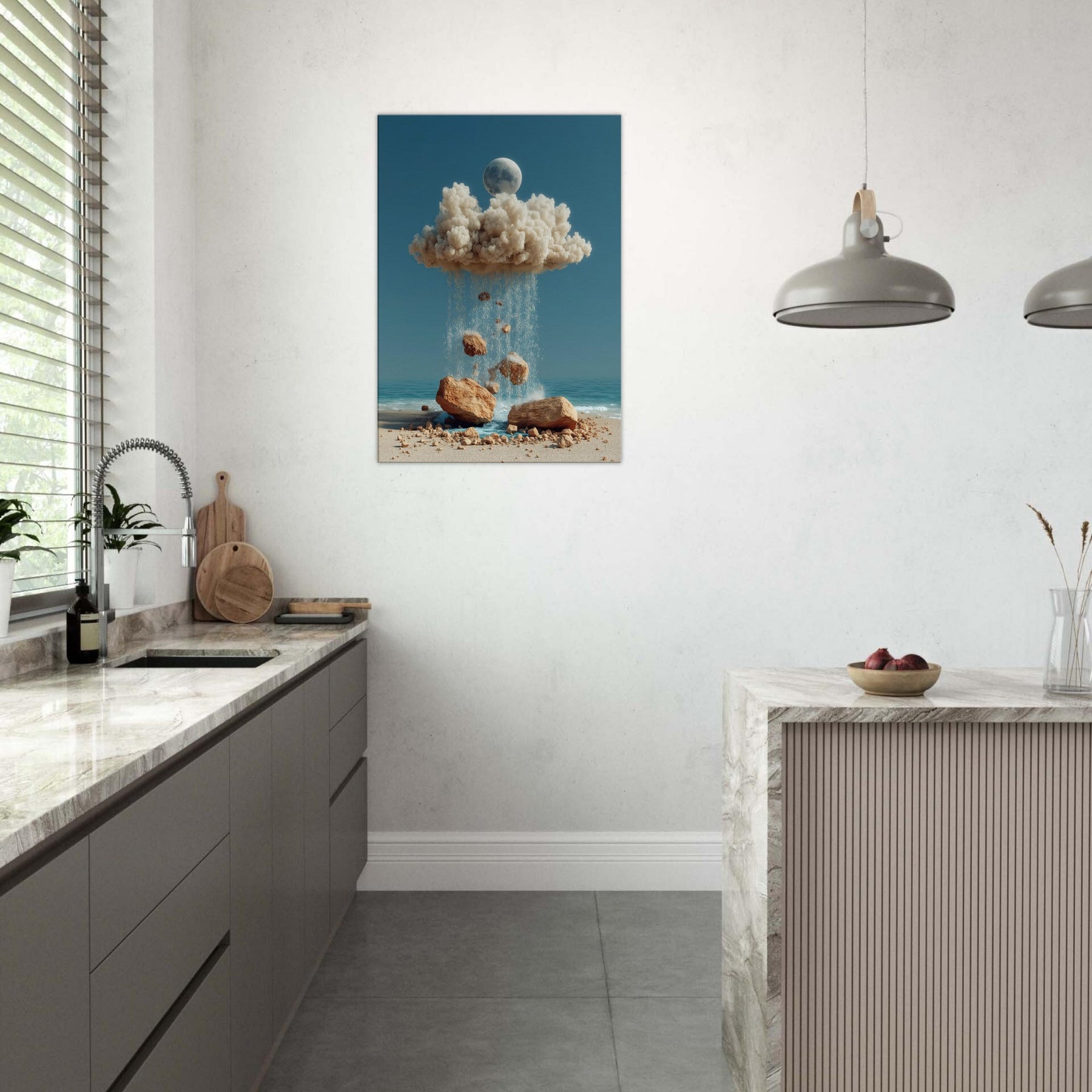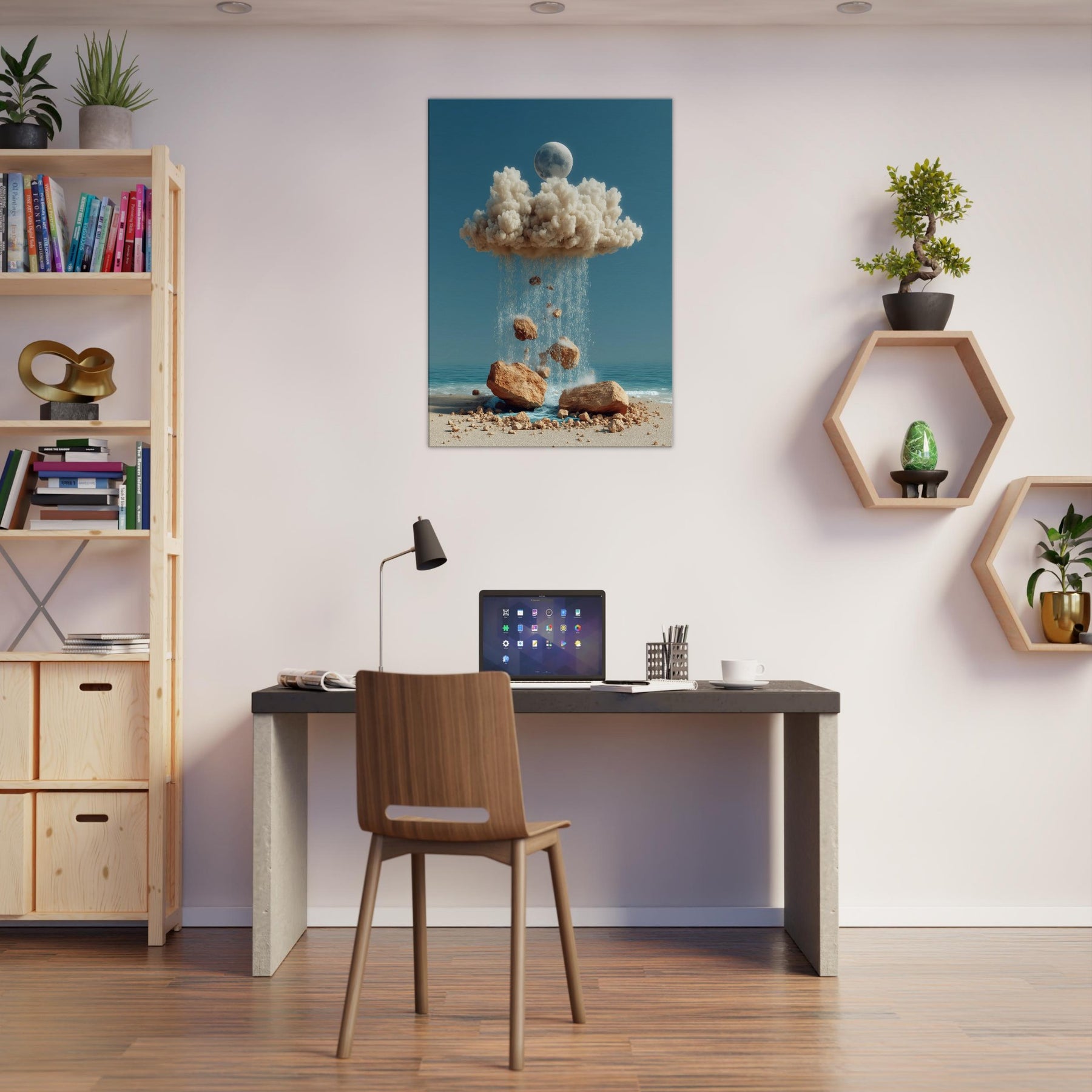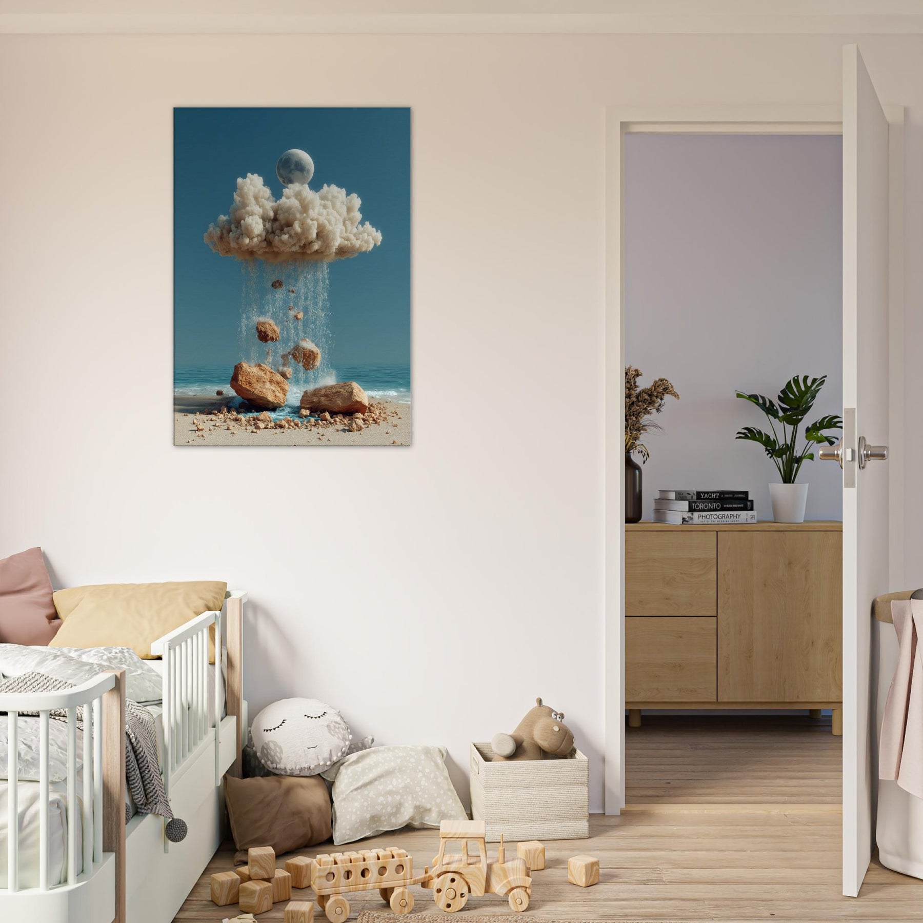 Sandstorm arrives as a slow, luminous eruption against a quiet horizon. A cloud, heavy with memory, hovers over a shoreline, crowned by a pale moon, while stones drift downward like suspended time. The scene folds the senses, the warm scent of sea spray, the grit of mineral rain, the hush of wind bending light. In a living room, this artwork becomes a doorway to contemplation, softening hard edges with dreamlike scale and tranquil tension. It invites slow breaths, expansive walls, and conversations that drift beyond the ordinary.