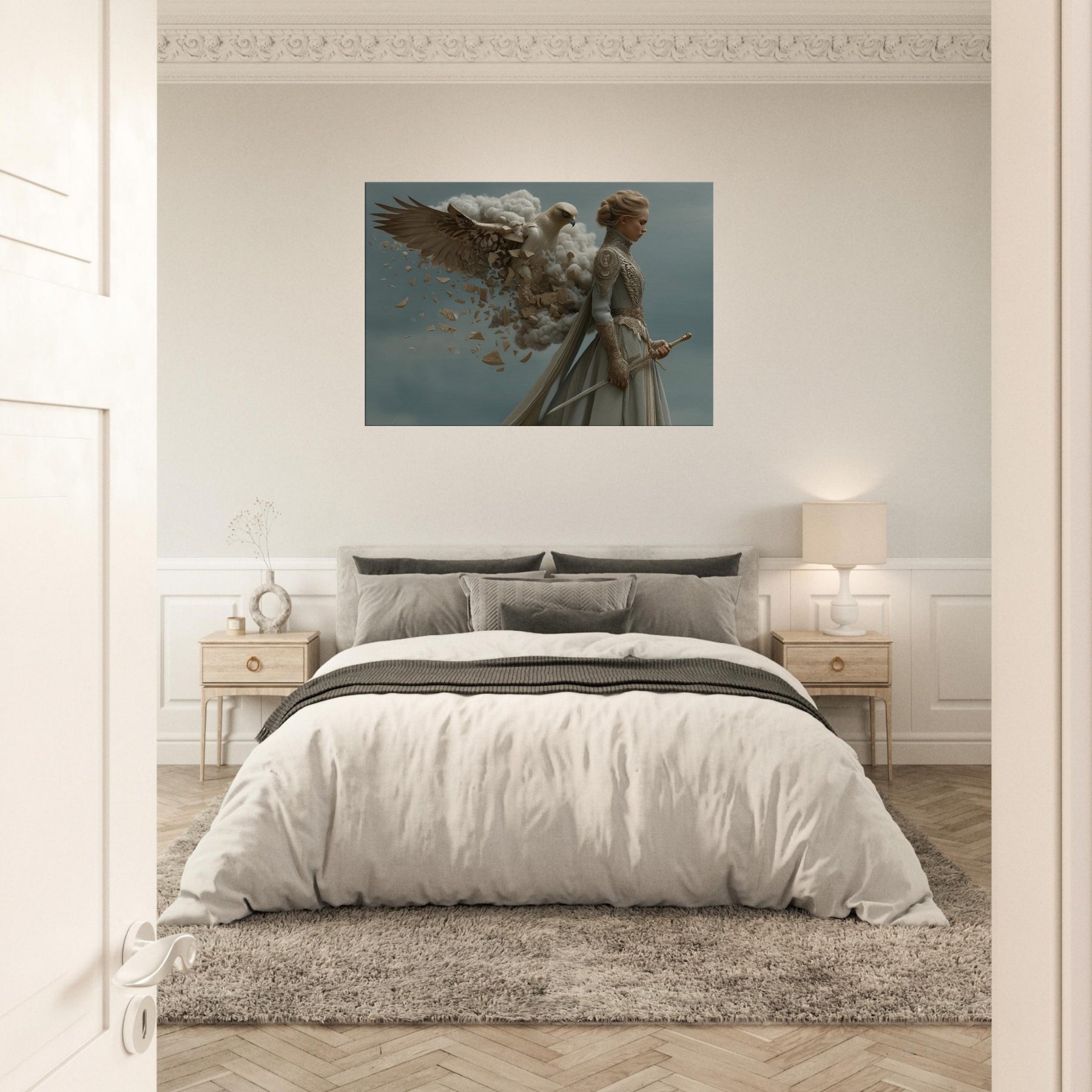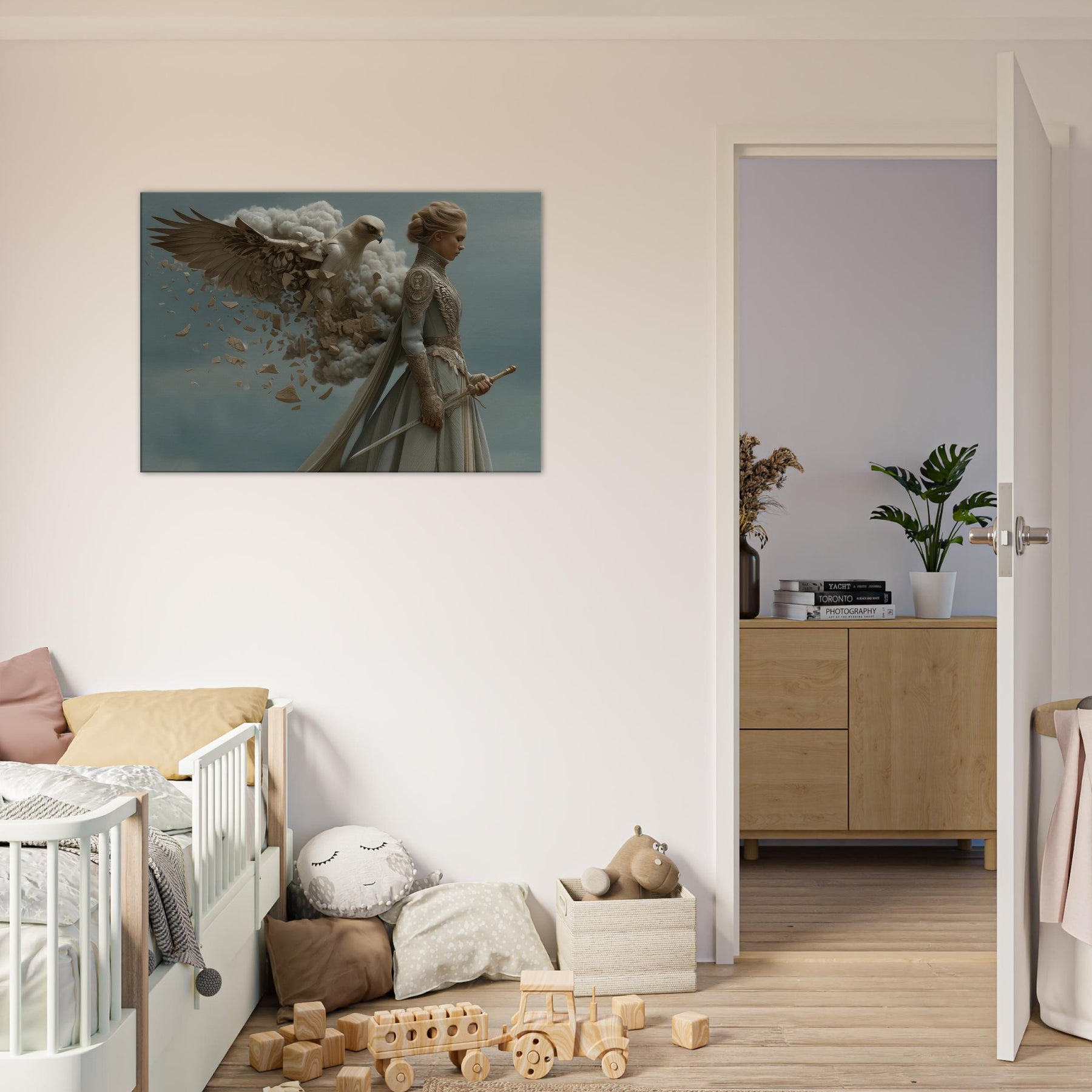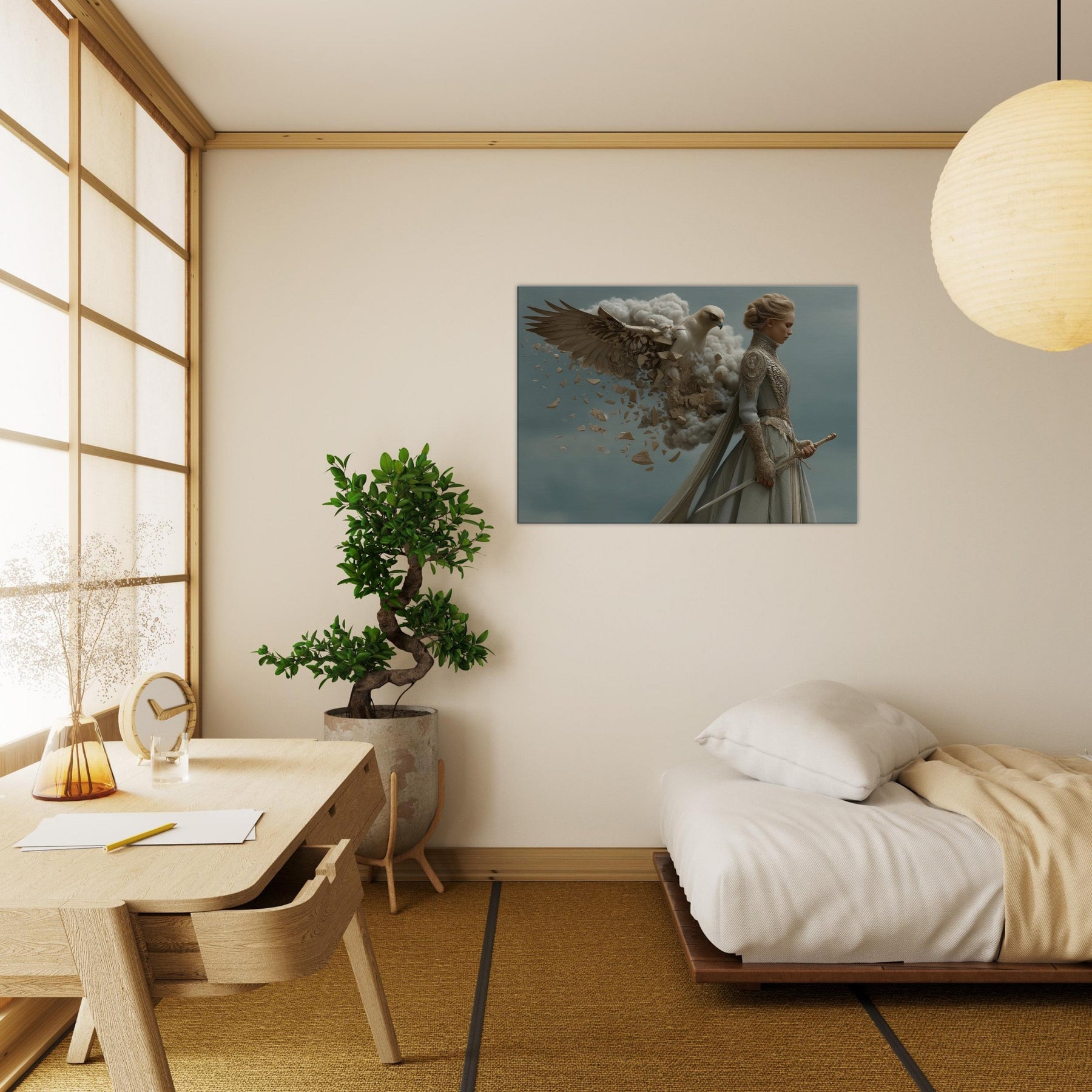 Freyja, Goddess of Love, Beauty, and War, steps from dream into your living space, where the air is perfumed with iron and honey. This Surreal composition threads a goddess of extraordinary presence with a cathedral of shattered stone, as a massive wing unfurls and disperses like fallen petals. The cool palette and sculpted armor fuse mythic authority with intimate grace, turning walls into a shrine of courage and allure. Place it where light lingers to invite quiet wonder and fearless daydreams.