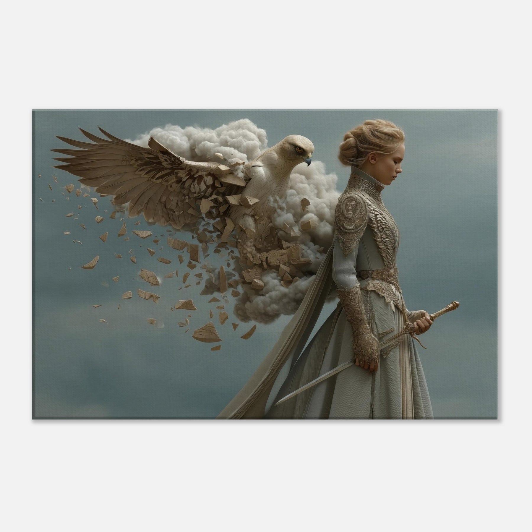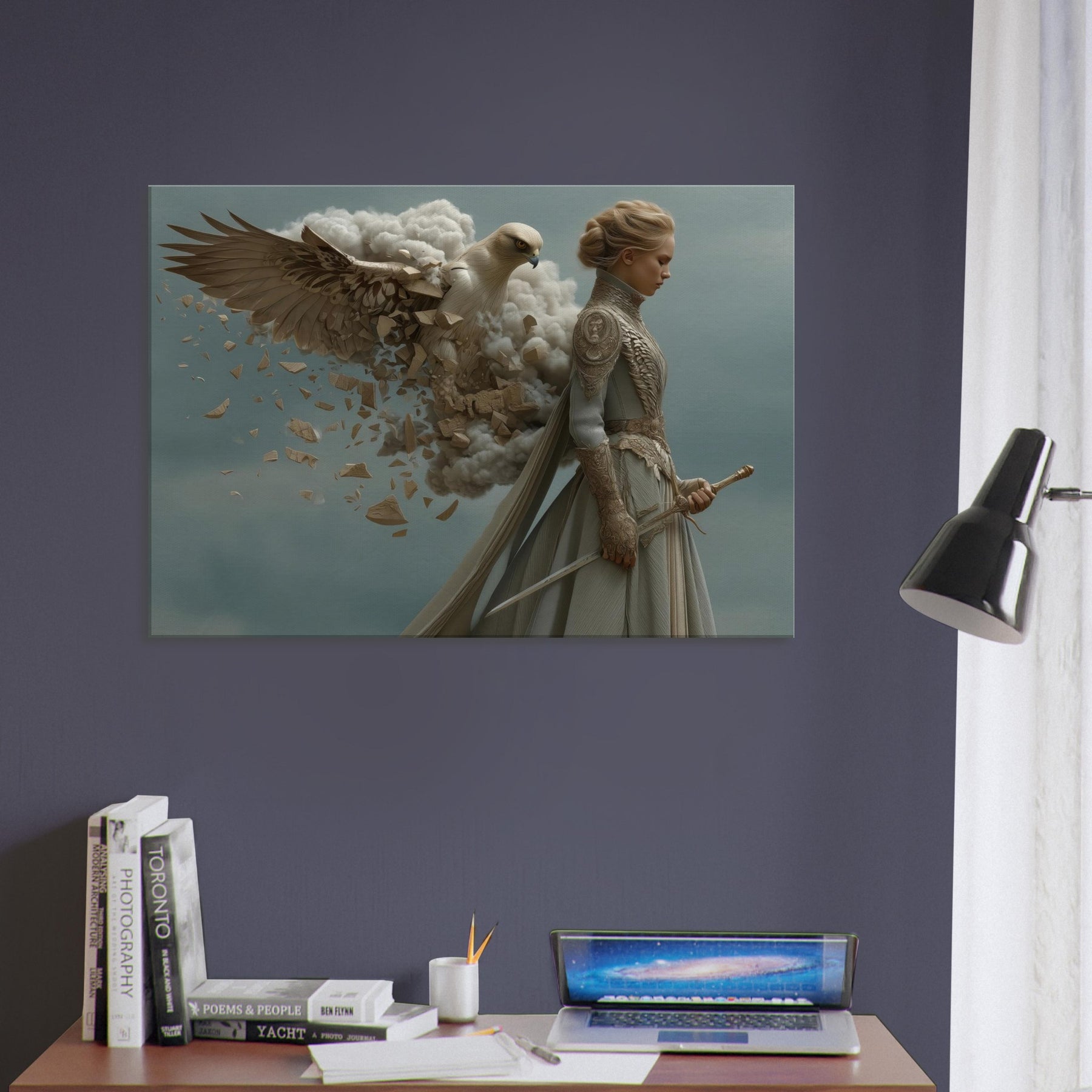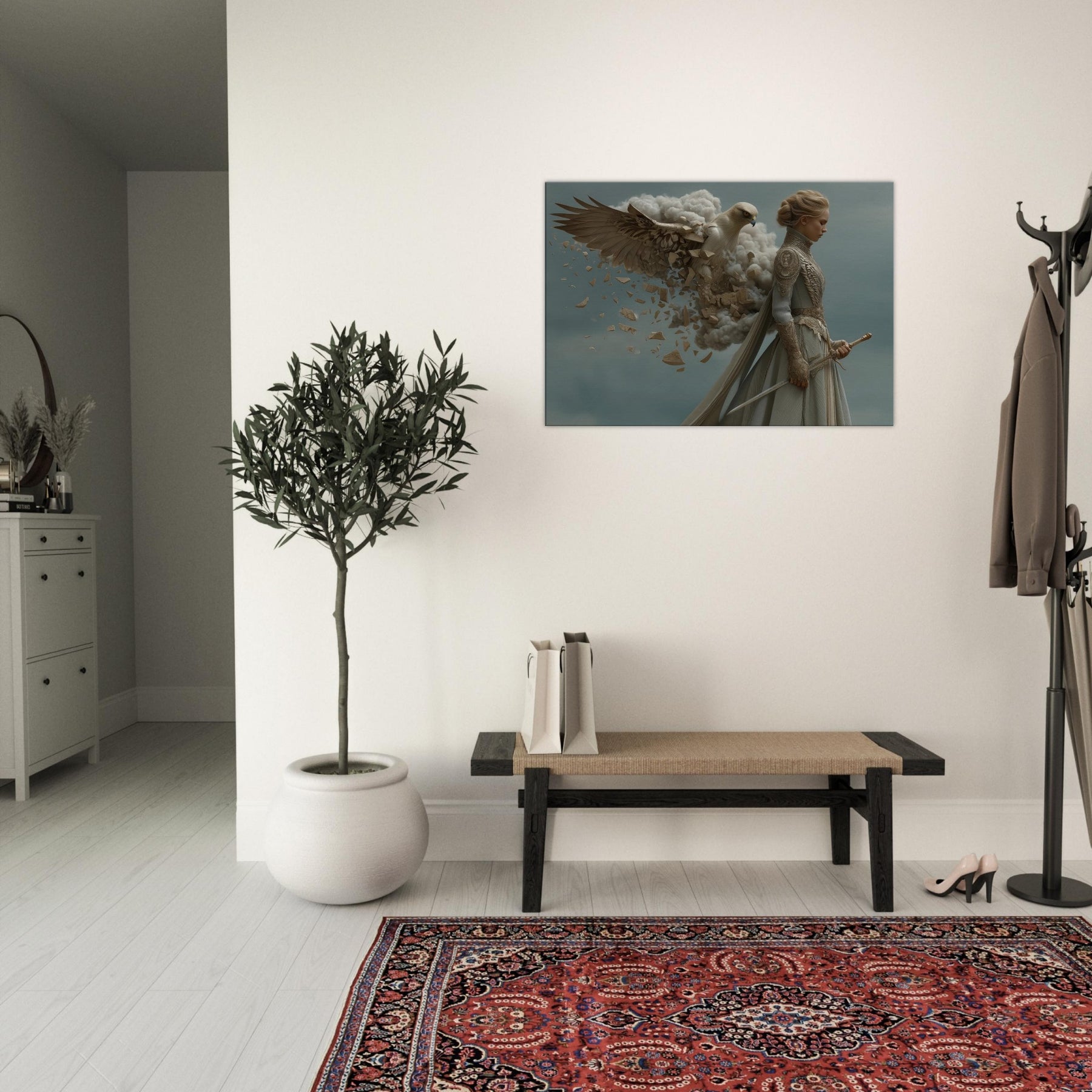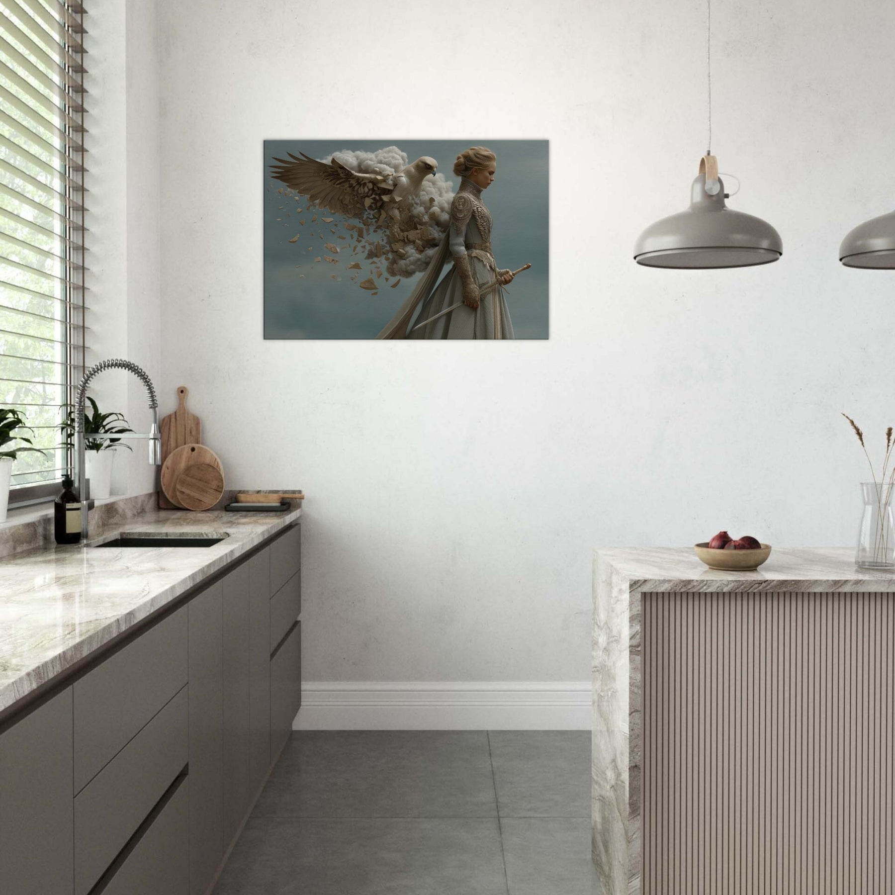 Freyja, Goddess of Love, Beauty, and War, steps from dream into your living space, where the air is perfumed with iron and honey. This Surreal composition threads a goddess of extraordinary presence with a cathedral of shattered stone, as a massive wing unfurls and disperses like fallen petals. The cool palette and sculpted armor fuse mythic authority with intimate grace, turning walls into a shrine of courage and allure. Place it where light lingers to invite quiet wonder and fearless daydreams.