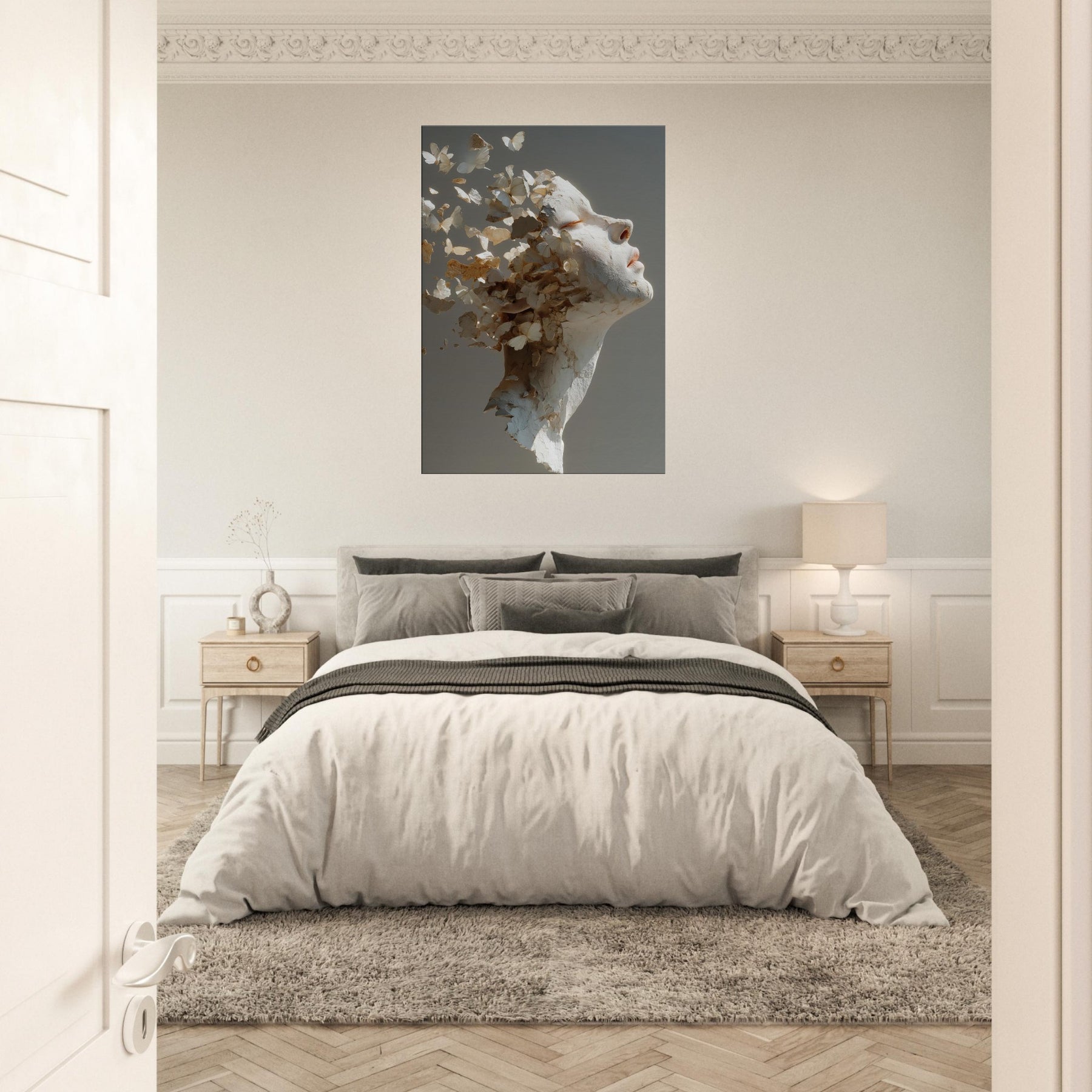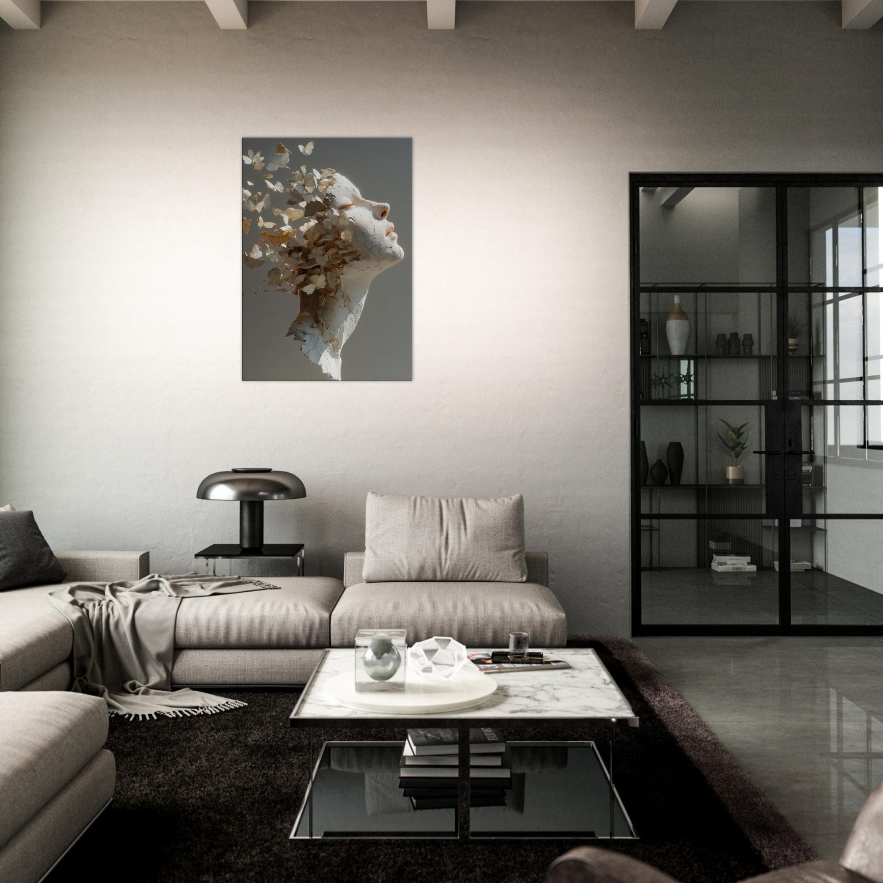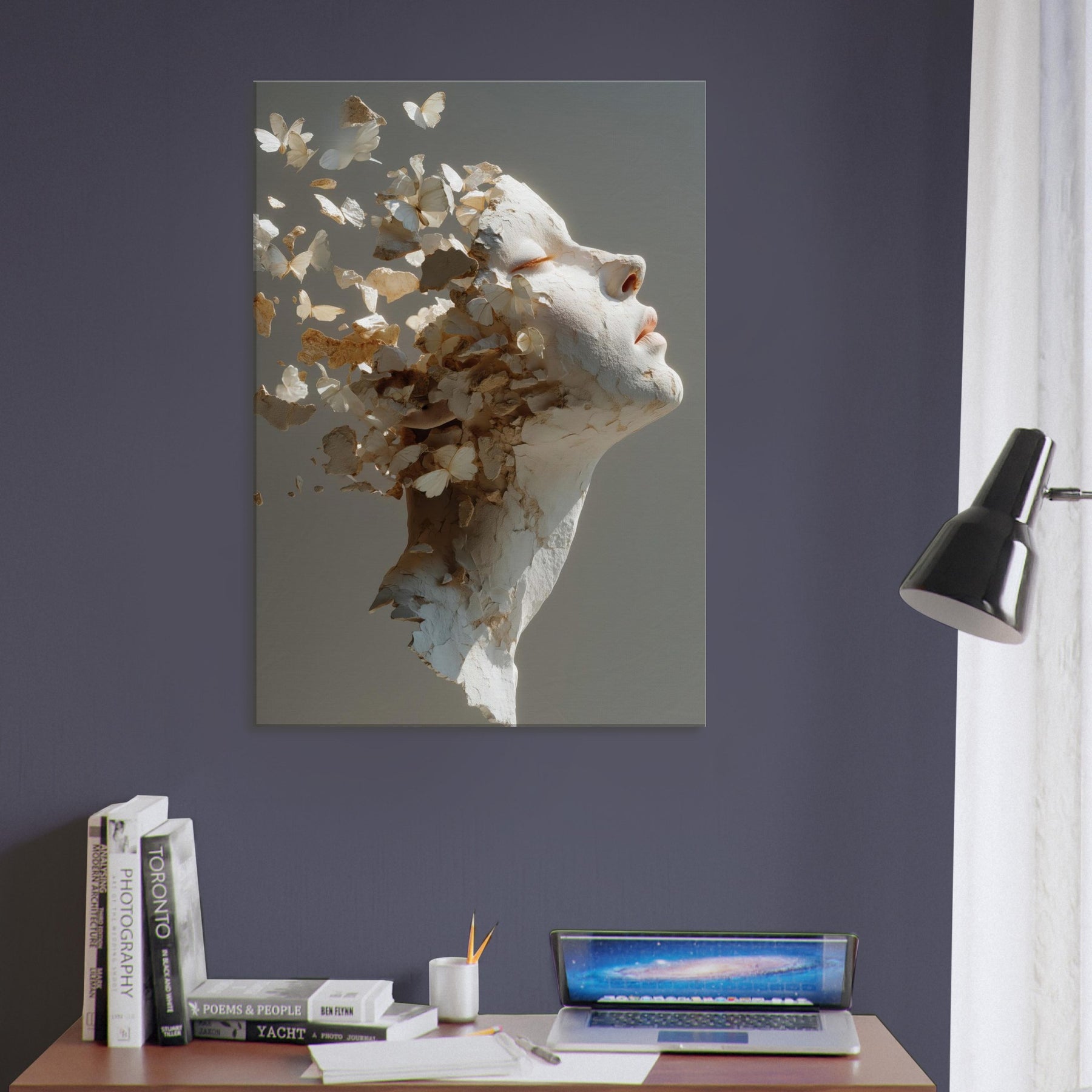 This Sculptural Bust dissolves into a chorus of papery petals and butterfly fragments, an illusion where memory peels away to reveal sensation. Dreamlike and tactile, it invites the viewer to drift between form and flight, light and shadow. The alabaster skin catches warm tones, while the edges crumble into delicate motes that seem to release time itself. Placed in a living room or hallway, it casts a subtle, surreal glow a conversation piece that invites reflection, curiosity, and a gentler, artful awe.