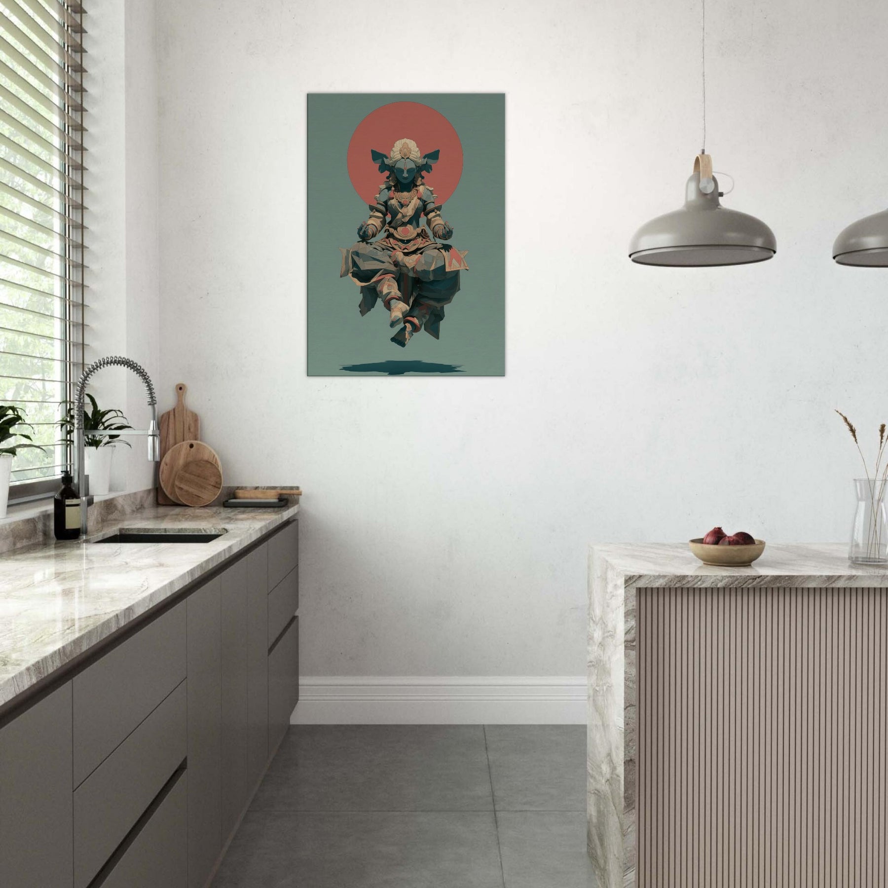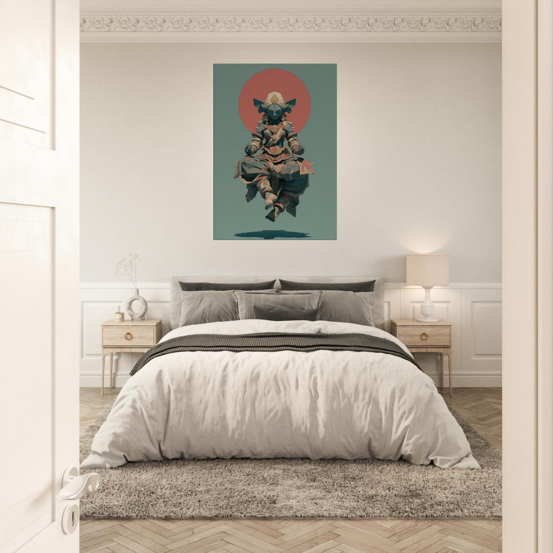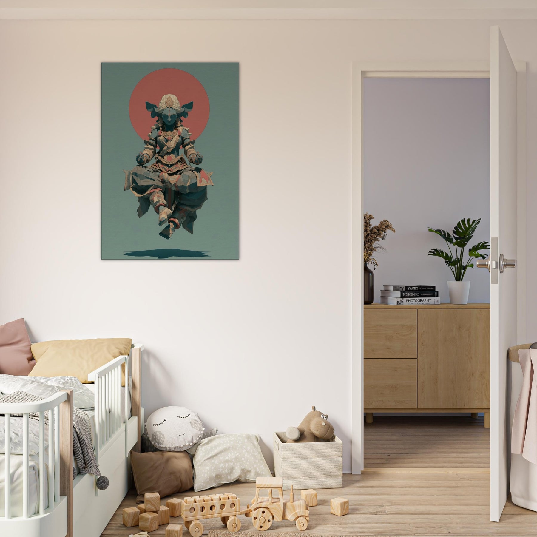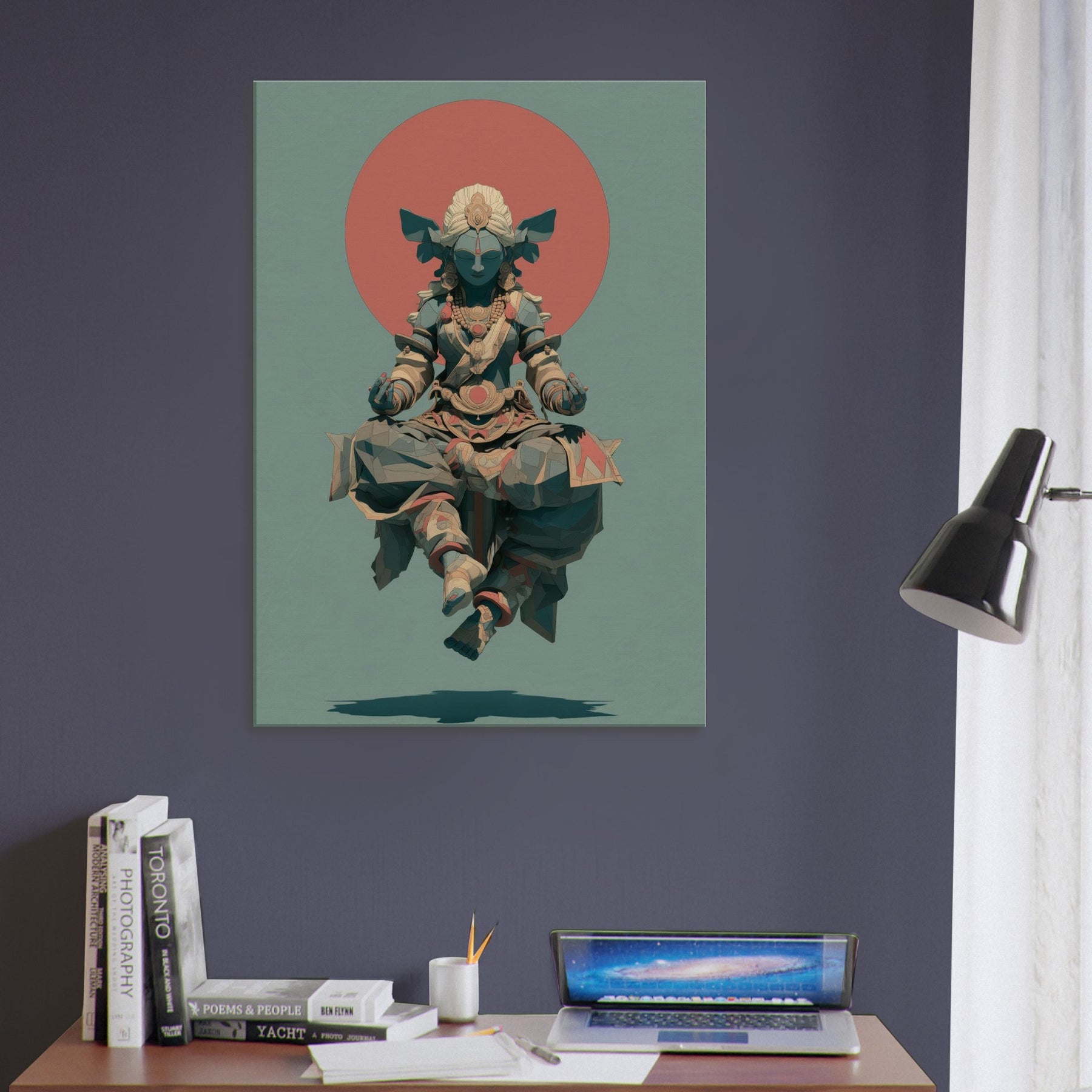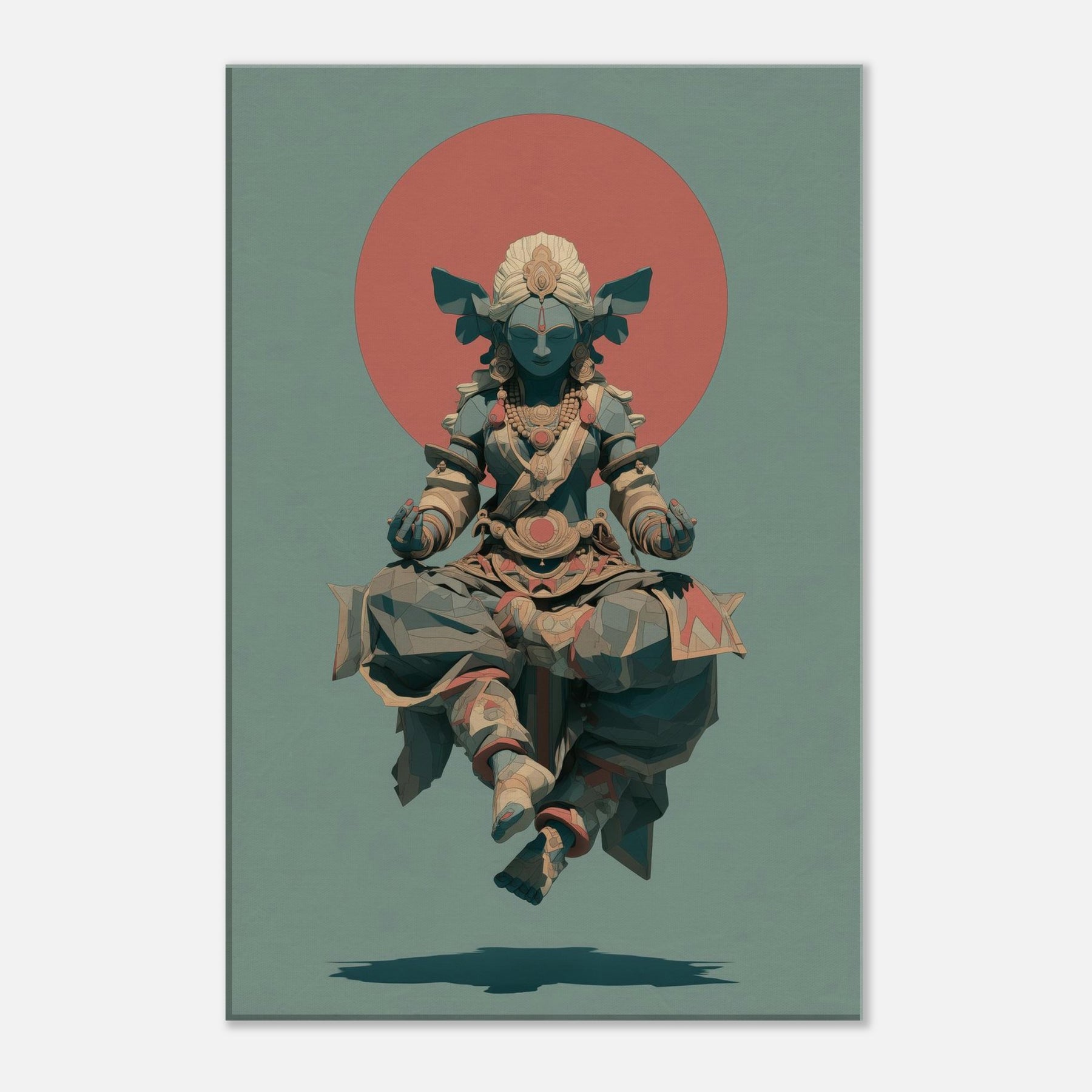 Float into a dream where Lakshmi sits in suspended calm, a sculpted deity transcended into a dreamscape of facets and halos. The image blends myth and memory, weaving warm golds with cool sea cerulean tones as if temple light leaks into a modern room. This surreal, mystical composition invites quiet reflection, turning walls into a sanctuary of abundance and balance. Perfect for living rooms and bedrooms, it casts a serene aura that softens chatter and invites contemplation.