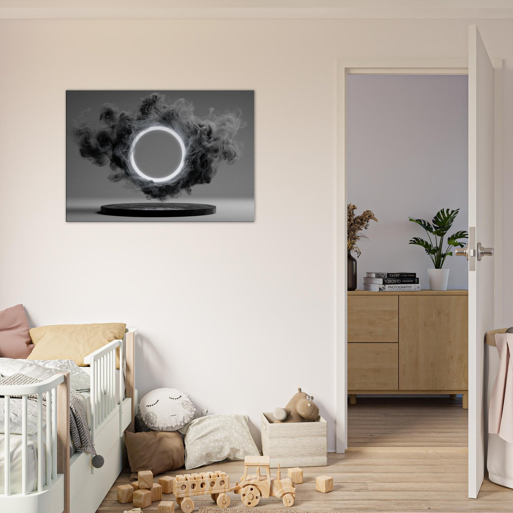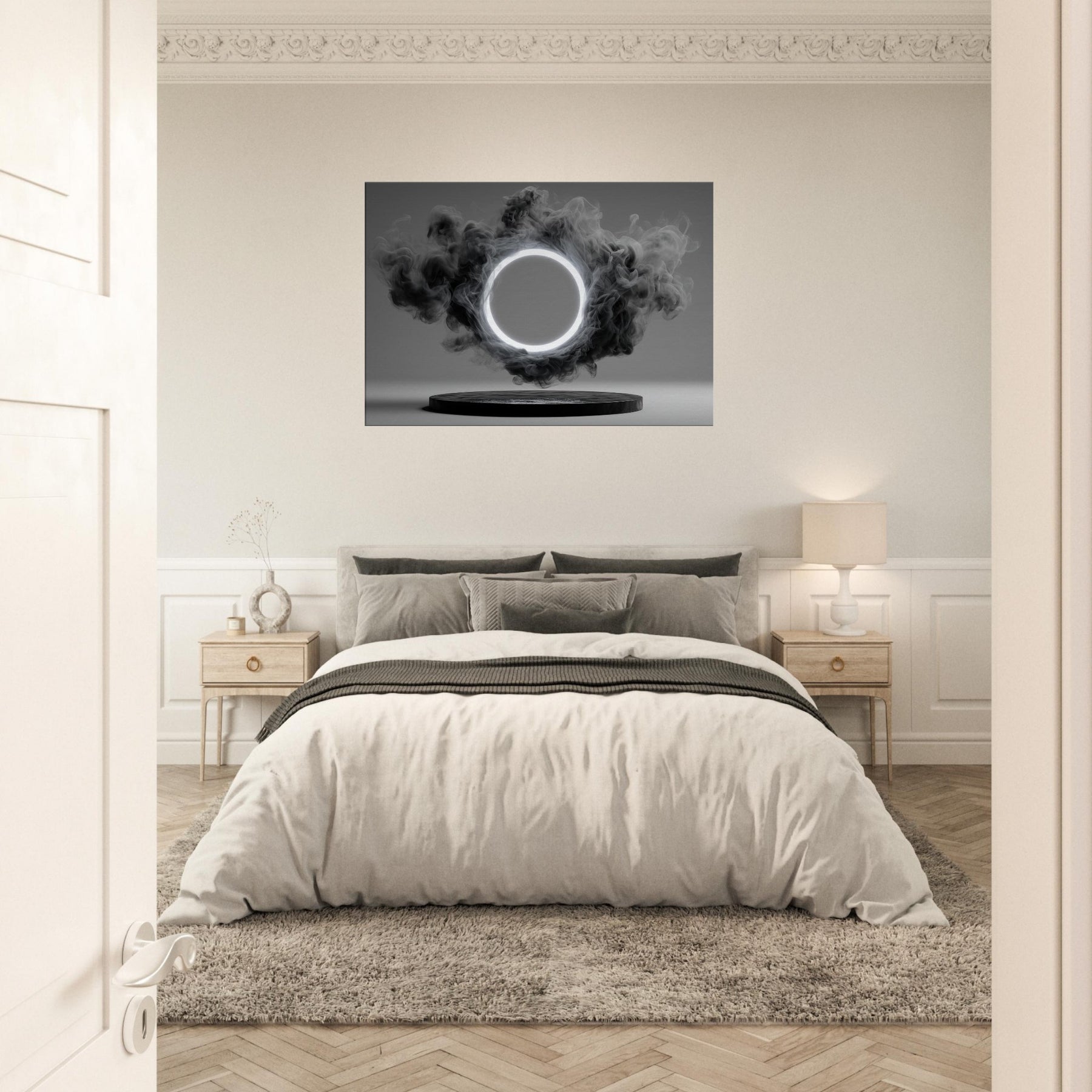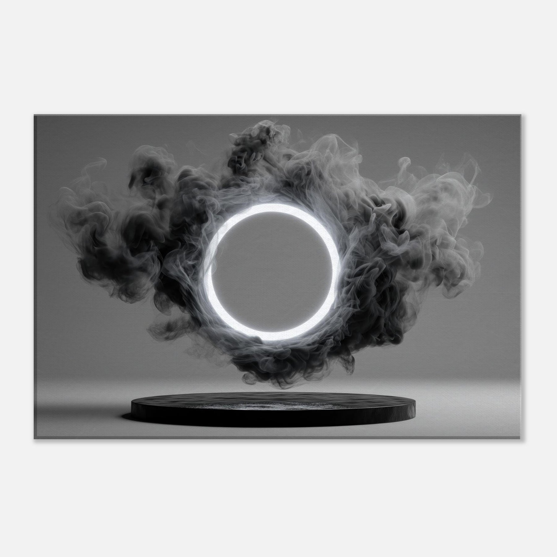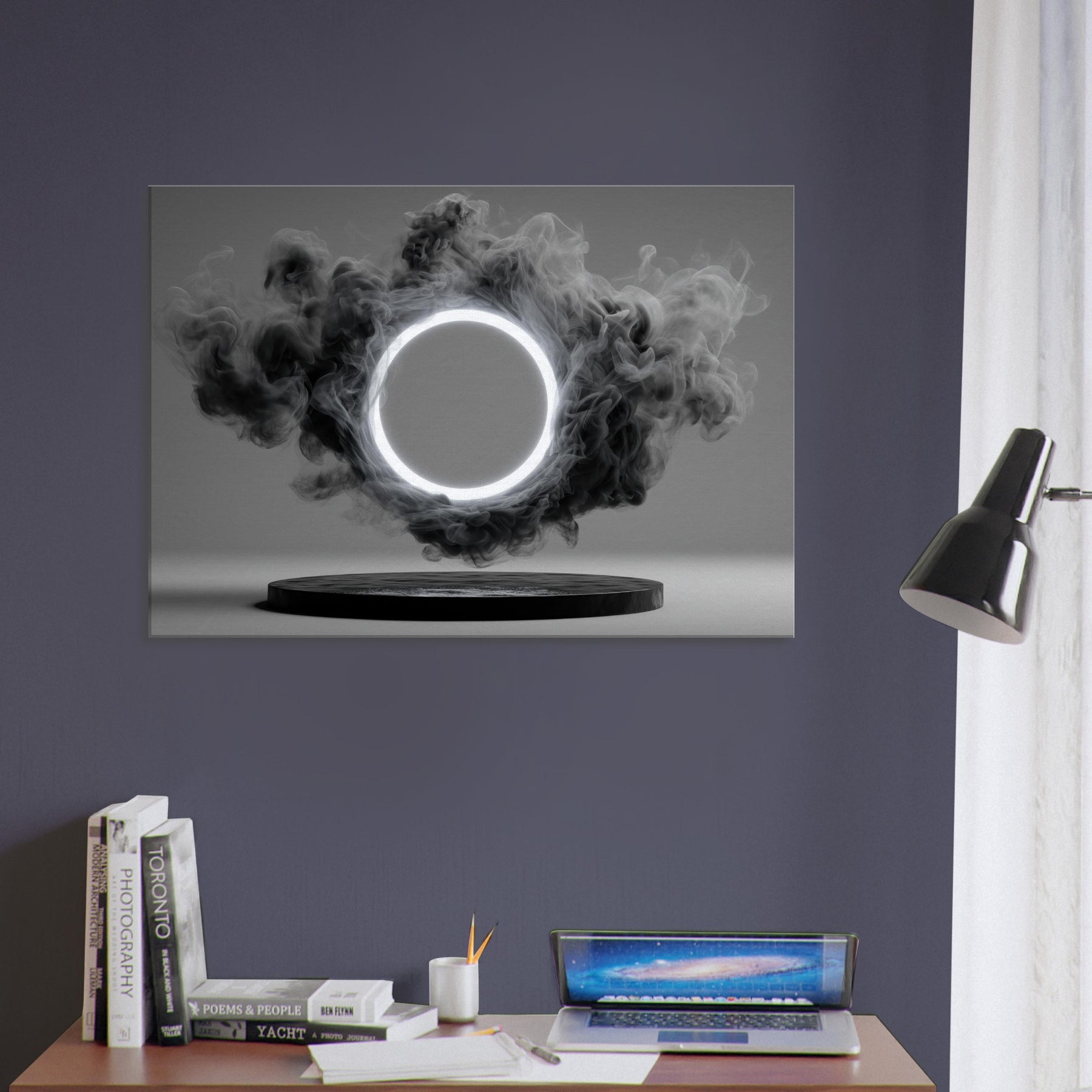 Smudge Smoke Swirl unfurls like a dream translating fog into form, a circle of light hovering above a quiet stage of shadow. This surreal, mystical composition invites stillness, drawing the eye into a soft vortex that anchors a room with calm and wonder. Perfect for a living space, it pairs clean lines with atmospheric haze to create a focal point that feels both modern and ancient.