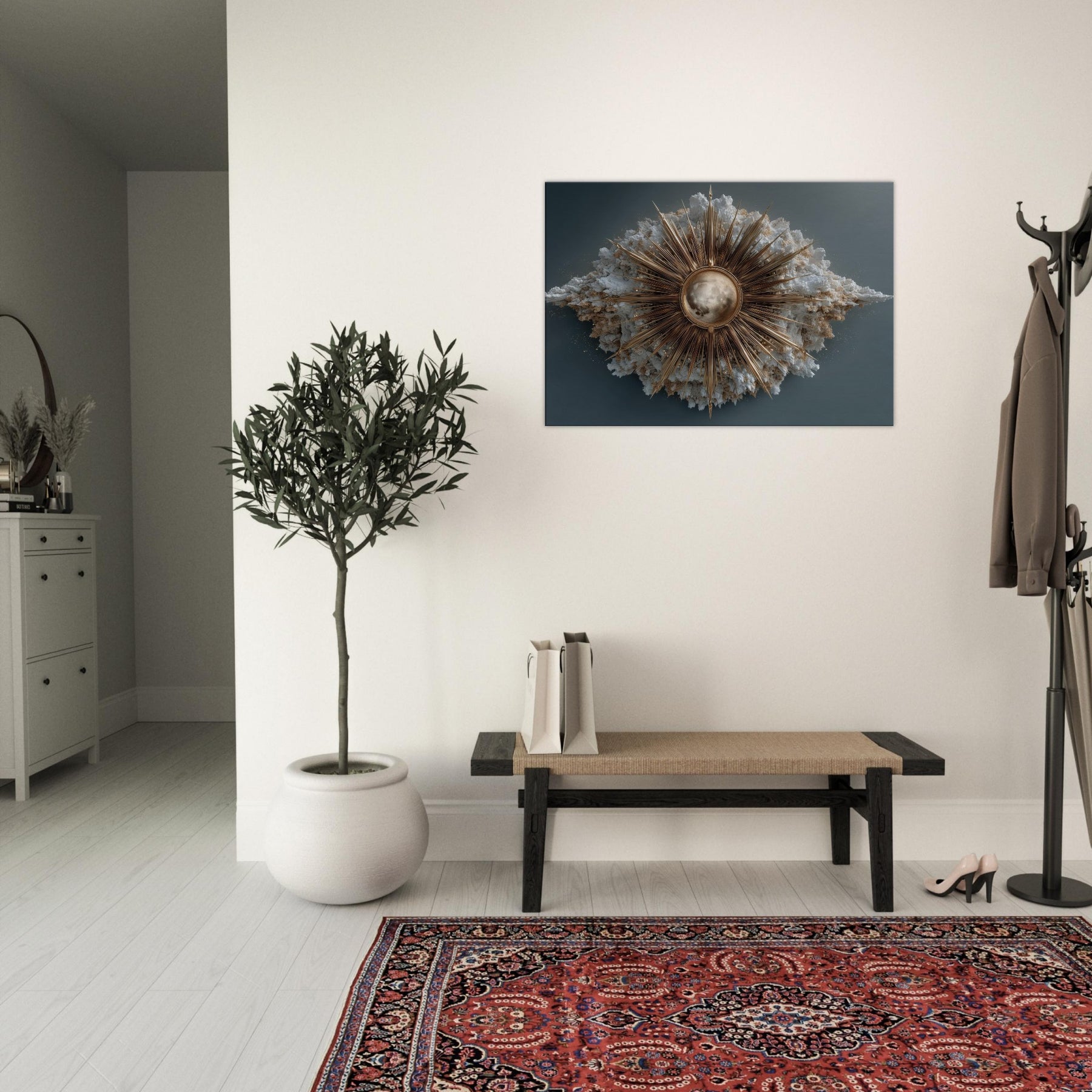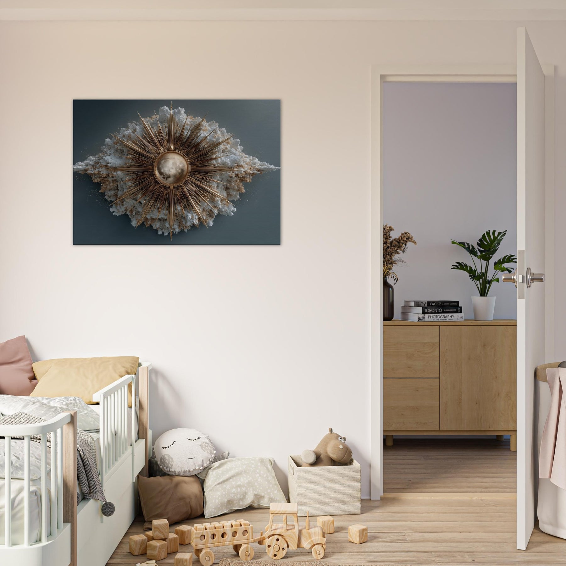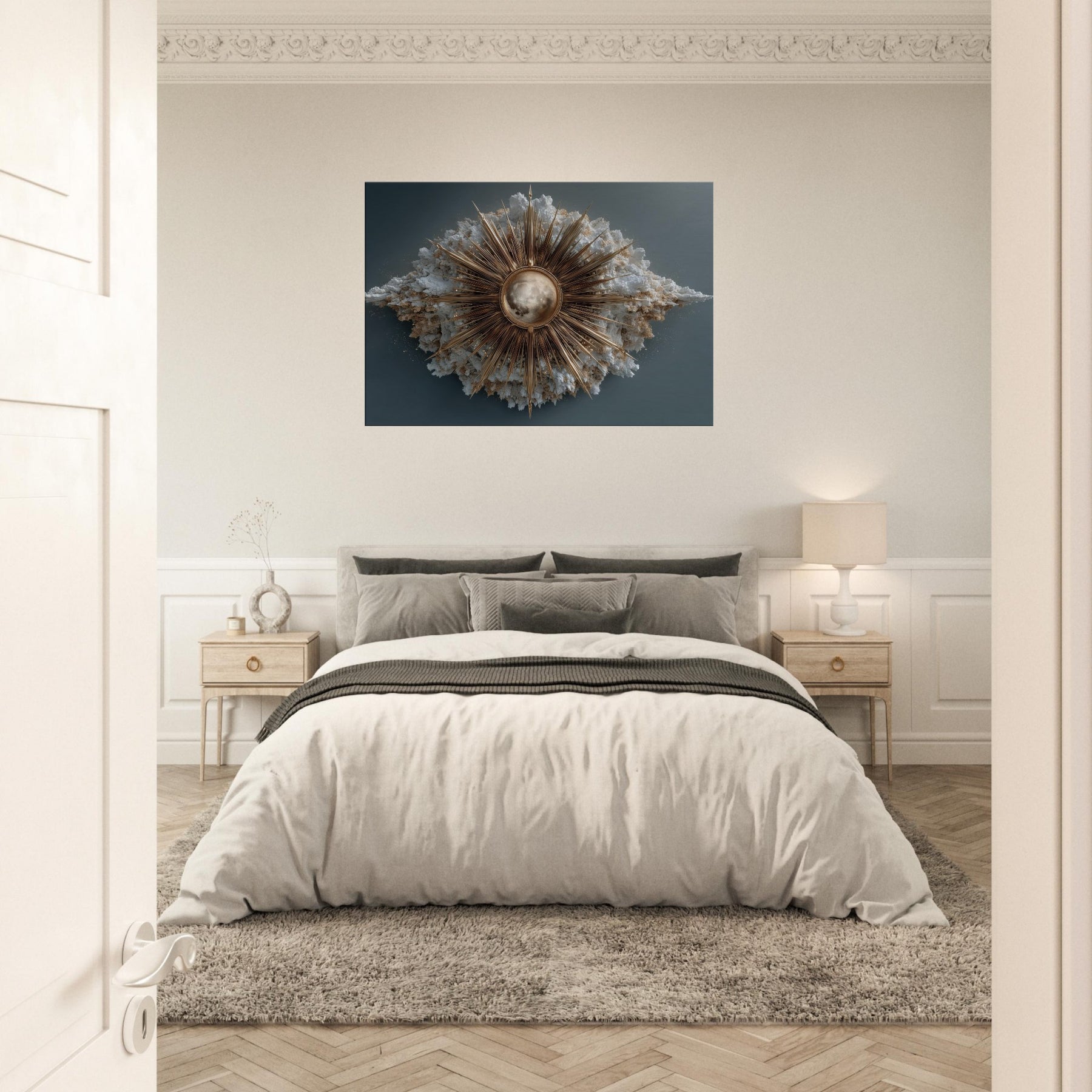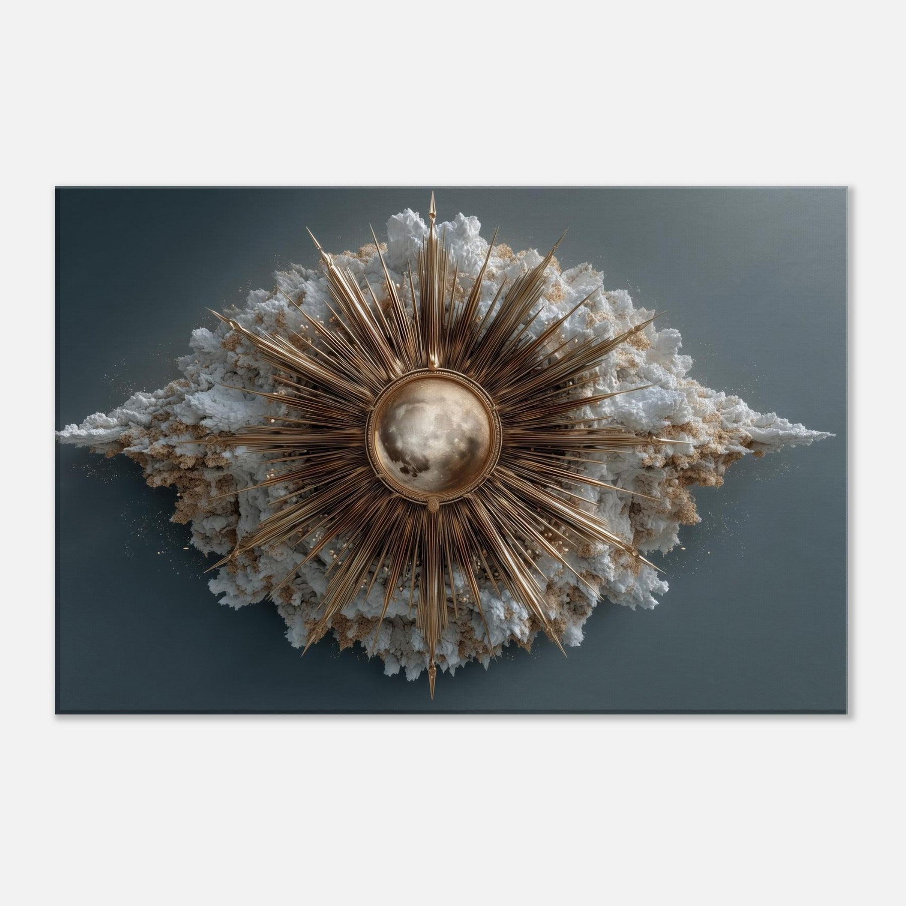 Immerse your space in a radiant dream where the Sun radiates beyond the horizon, bursting into a halo of gilded spikes that cradle a luminous orb. This surreal composition marries celestial warmth with earthly dust, a mystical breath that travels from wall to room, turning quiet afternoons into a ceremony of wonder. The central Sun glows with brushed metallic texture, while pale clouds of ash drift behind, hinting at memory and myth. Place it where daylight lingers, and watch the atmosphere become intimate, transformative, and serenely bold.