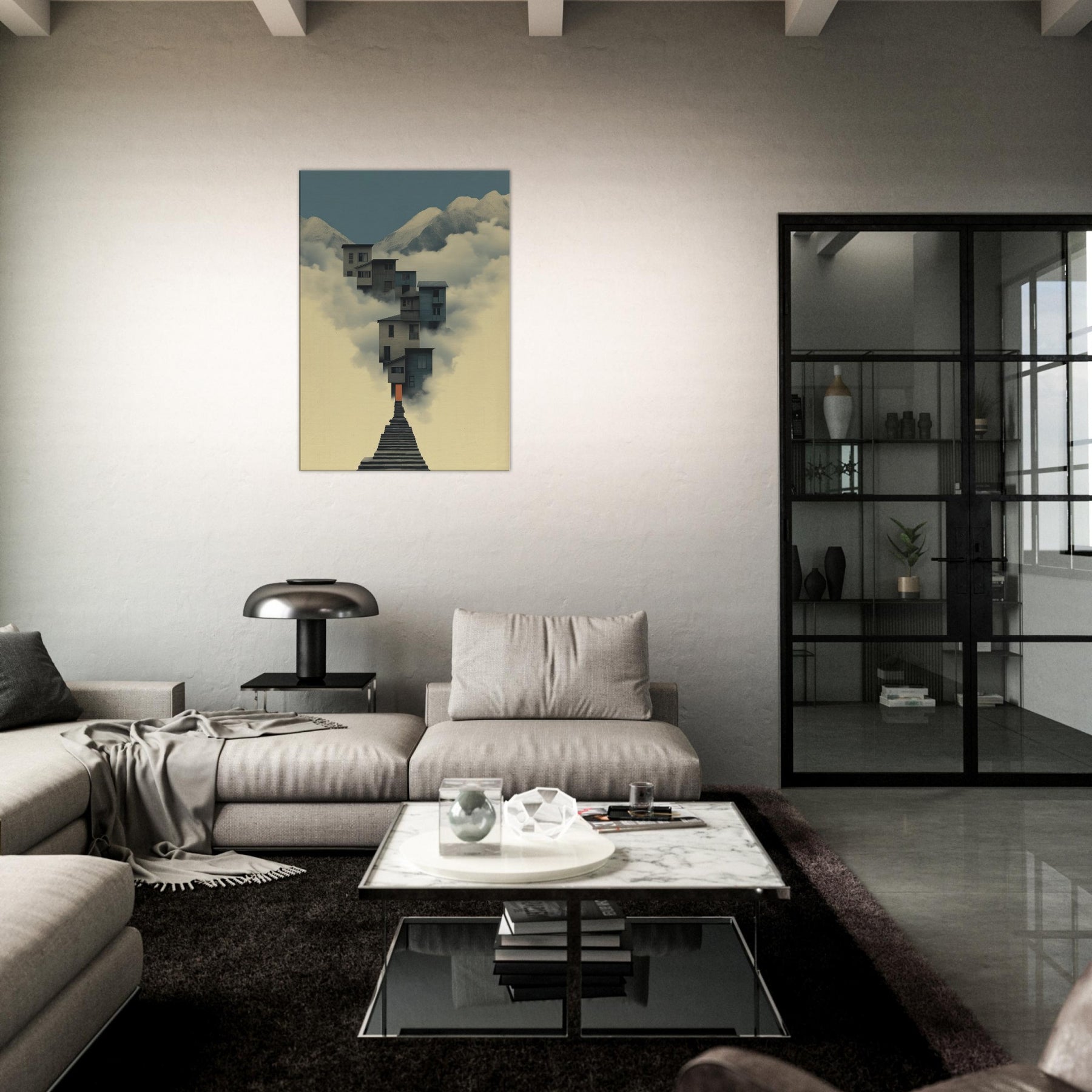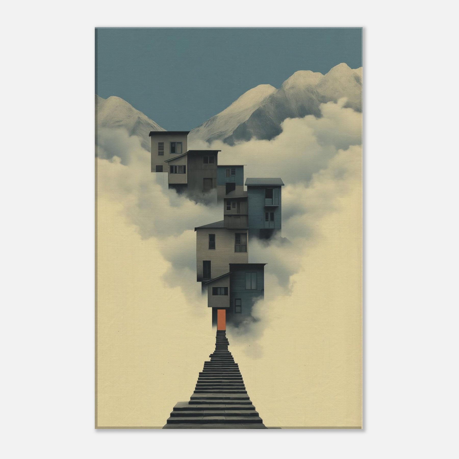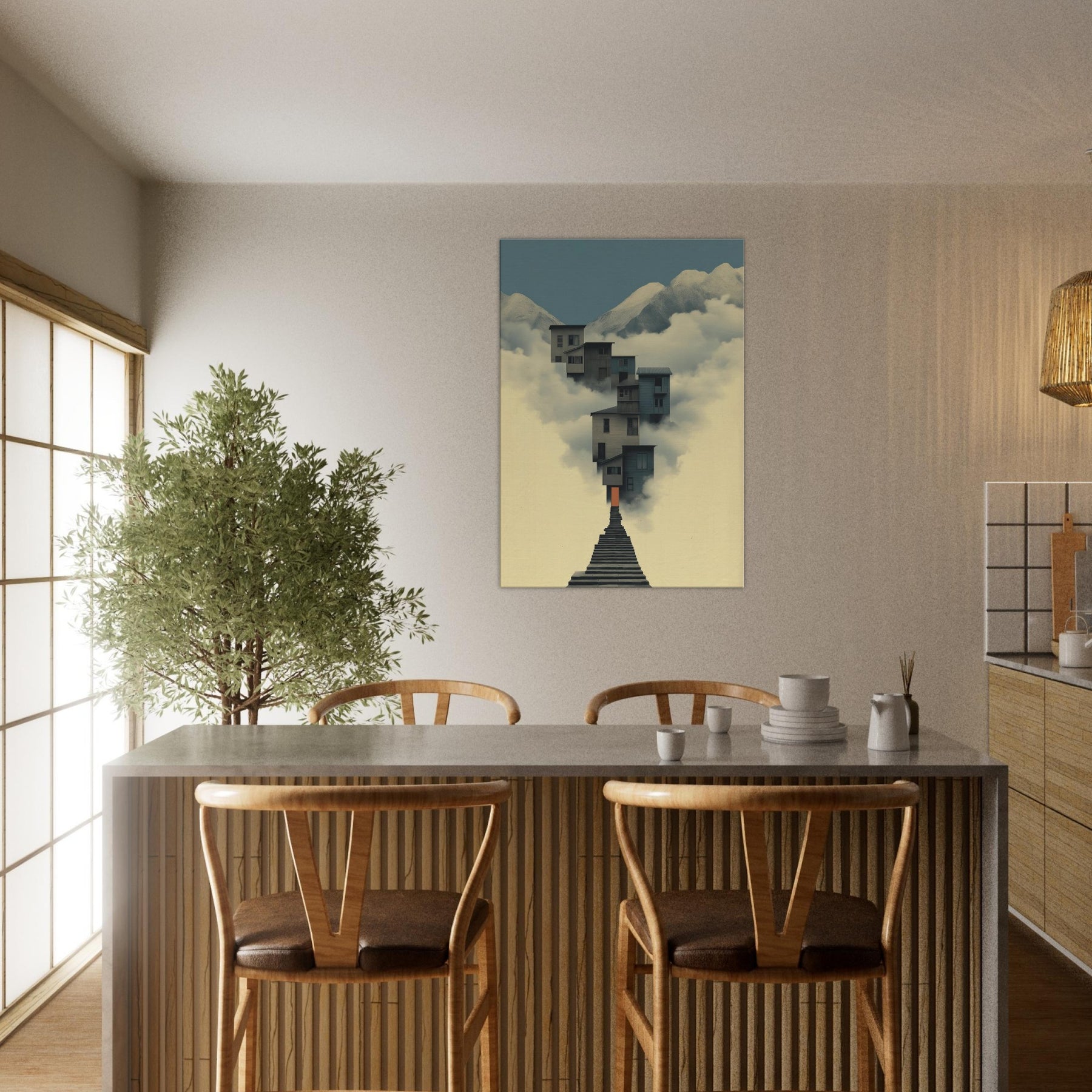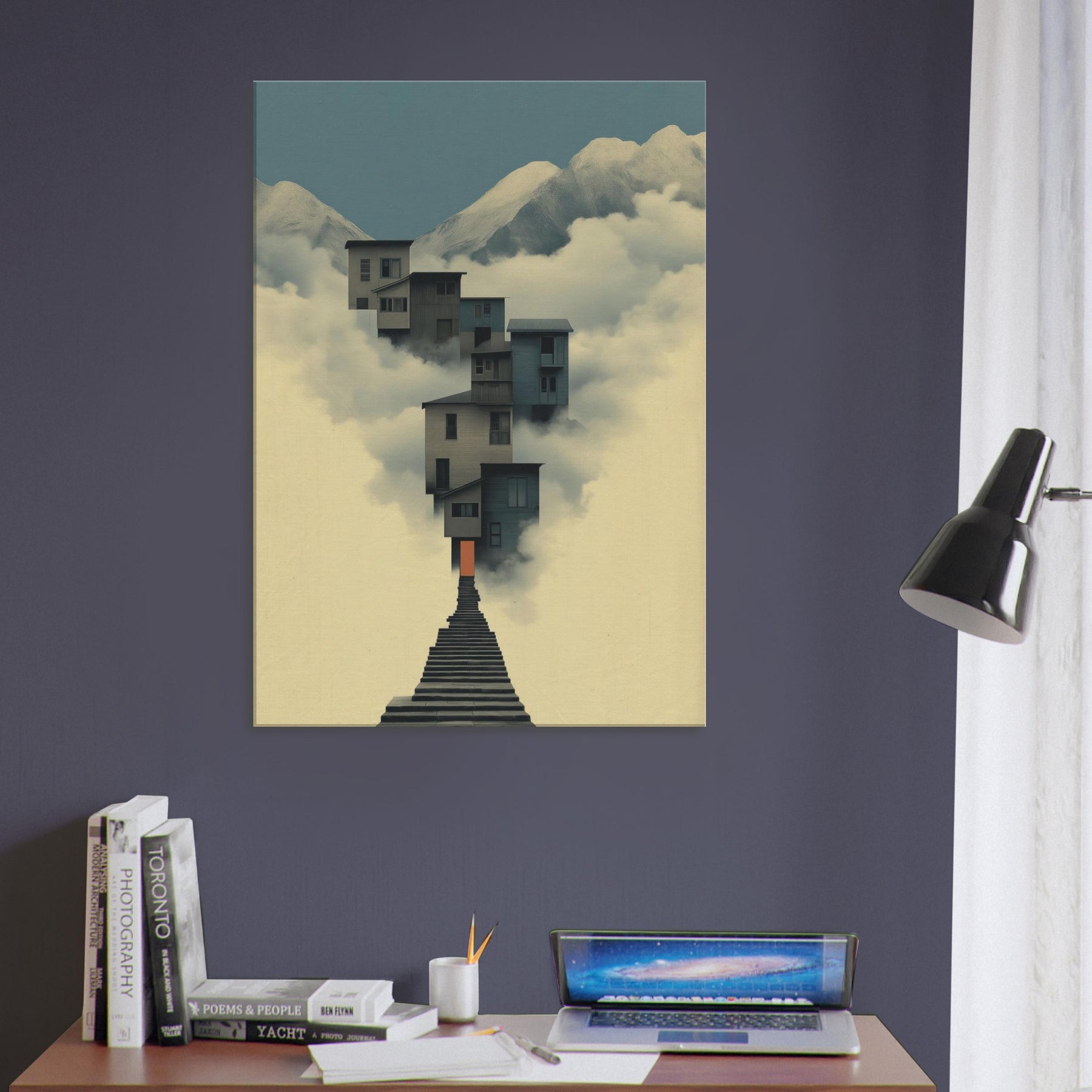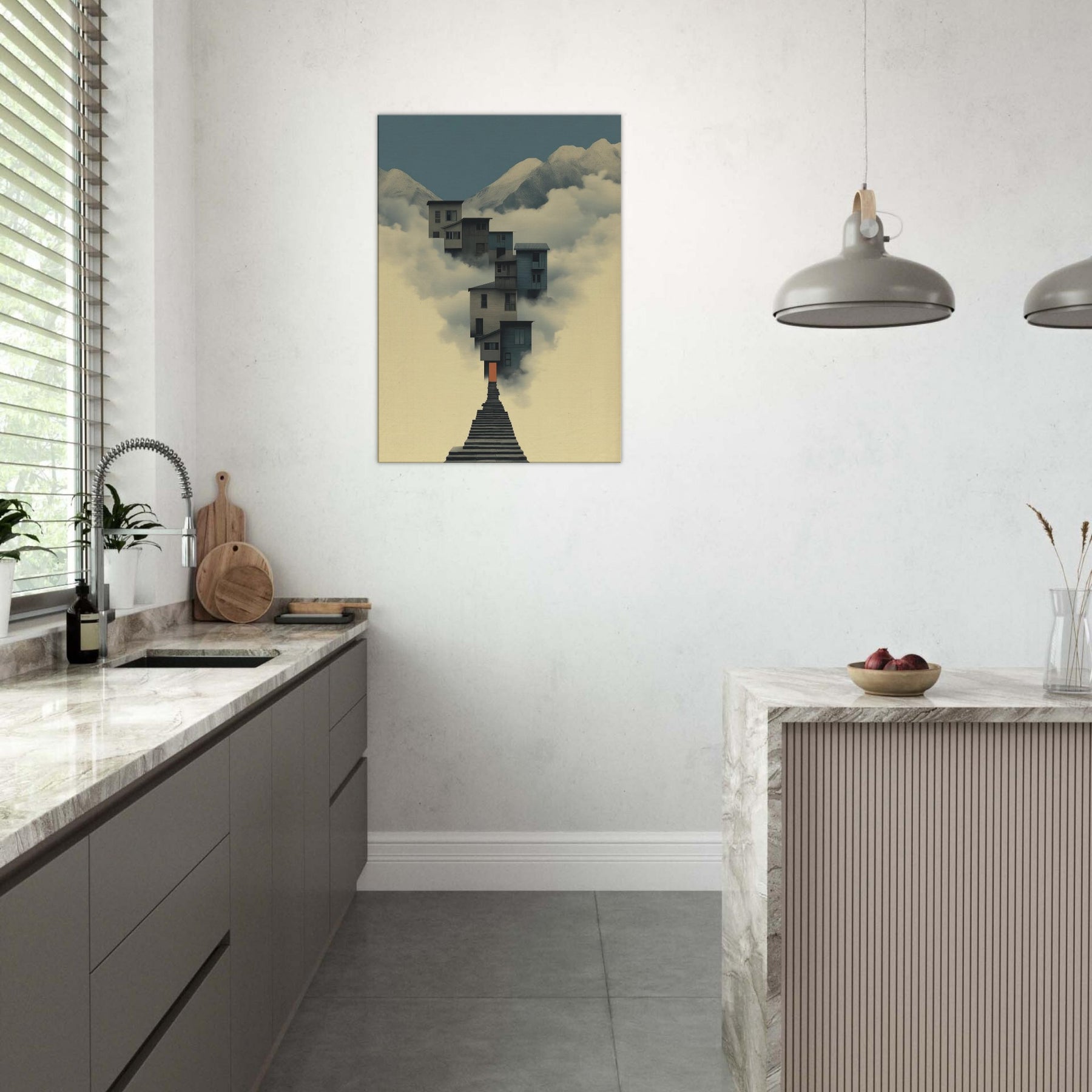 Towering like a dream, this scene blends a Mountain Village with a surreal ascent of stacked homes rising through mist toward a distant peak. The composition invites a lingering breath cool blues, warm creams, and a soft shadow play that shifts as you move past it. A staircase of intent climbs from earthly floors into ether, turning a hallway into horizon. In your living space, this image becomes a quiet portal creative, contemplative, and endlessly poetic.