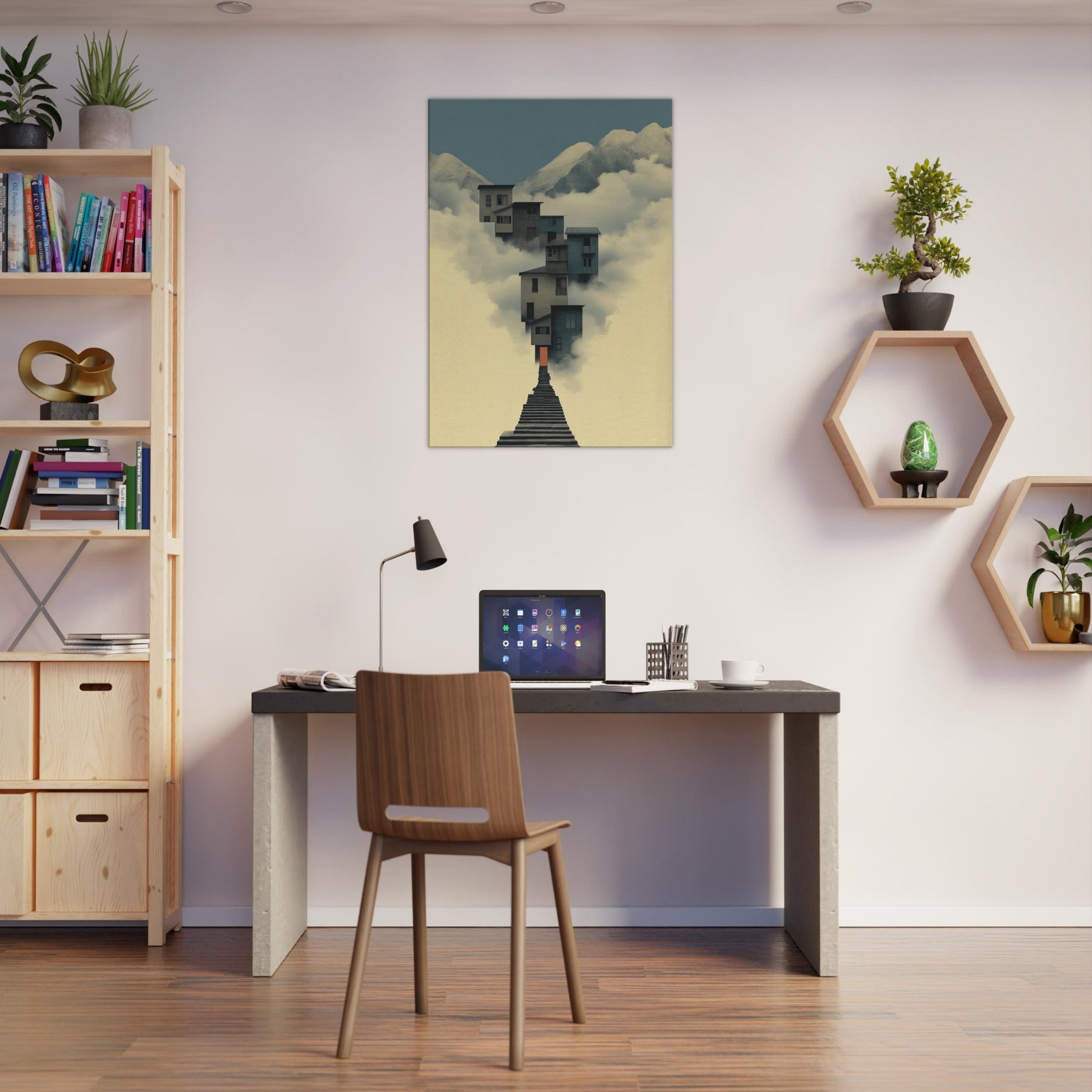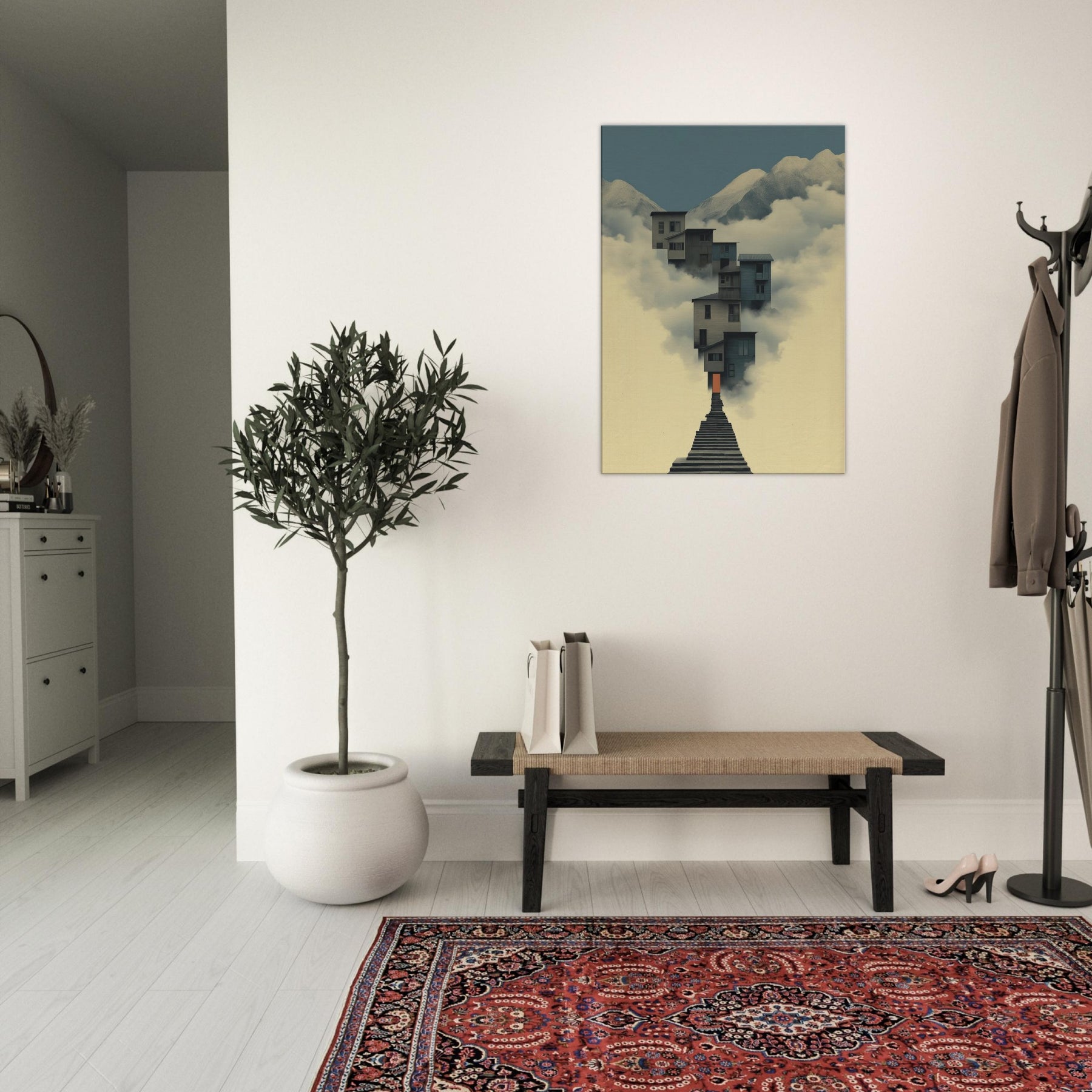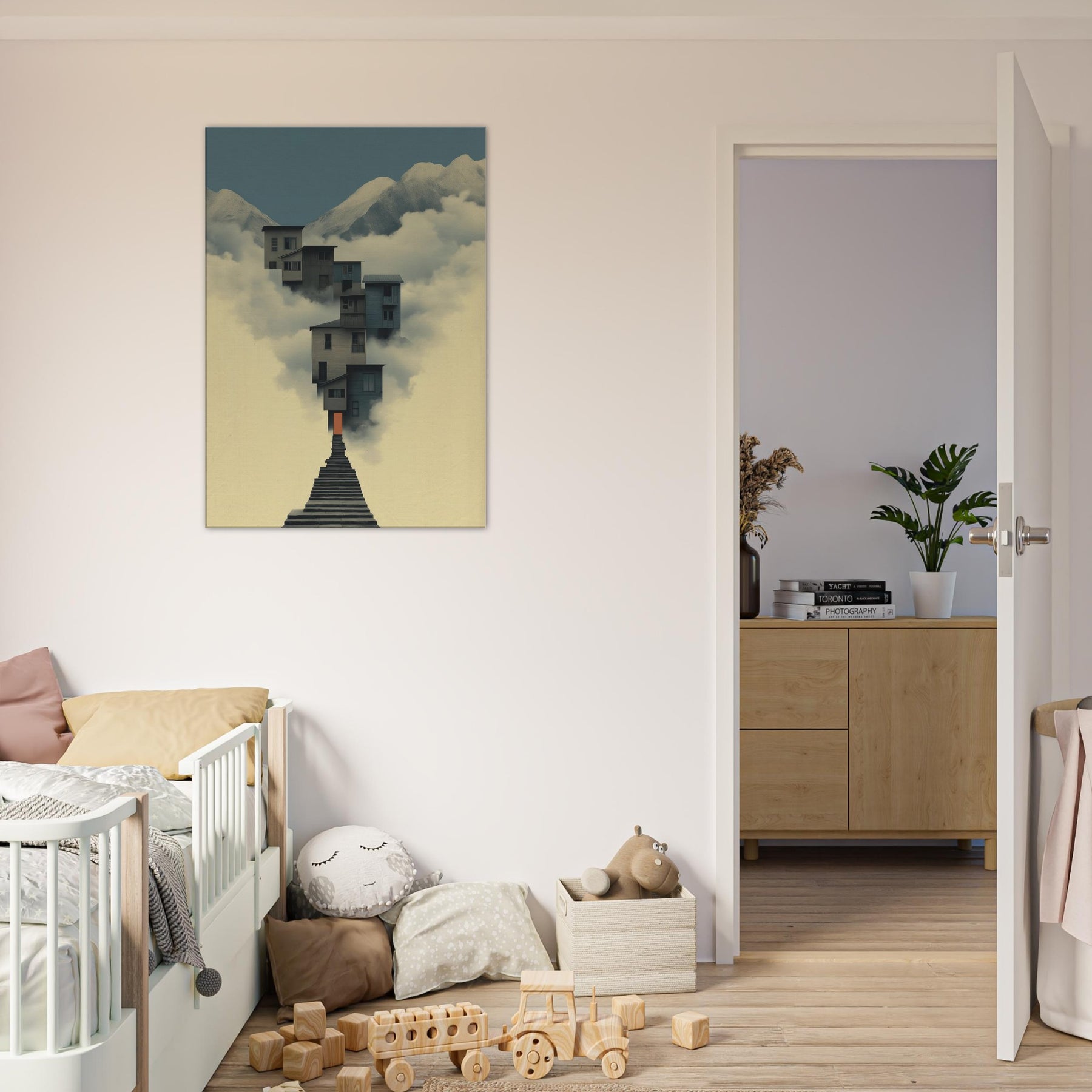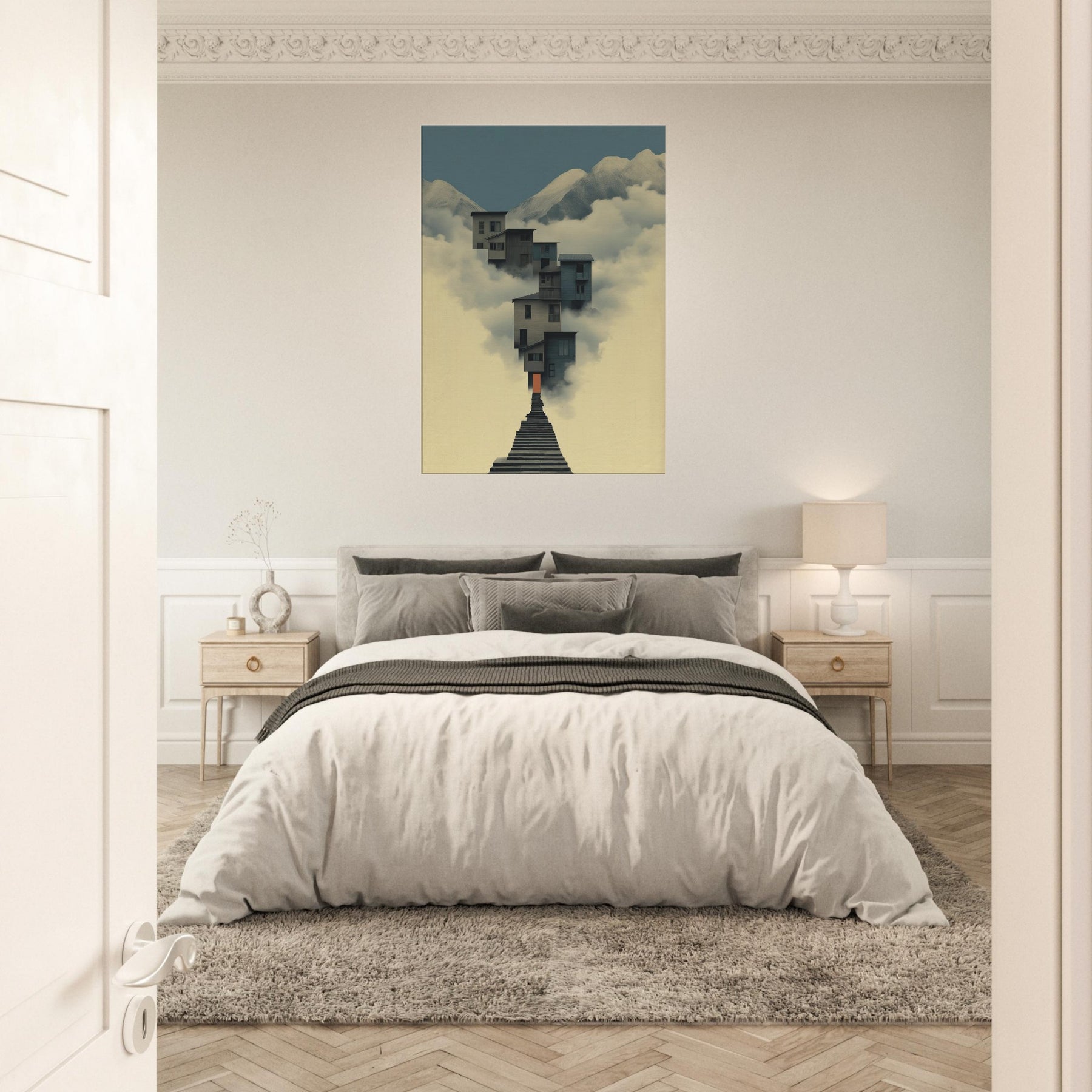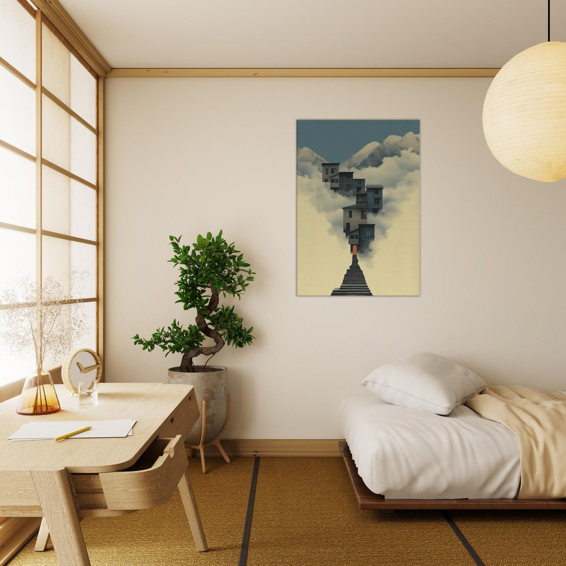 Towering like a dream, this scene blends a Mountain Village with a surreal ascent of stacked homes rising through mist toward a distant peak. The composition invites a lingering breath cool blues, warm creams, and a soft shadow play that shifts as you move past it. A staircase of intent climbs from earthly floors into ether, turning a hallway into horizon. In your living space, this image becomes a quiet portal creative, contemplative, and endlessly poetic.