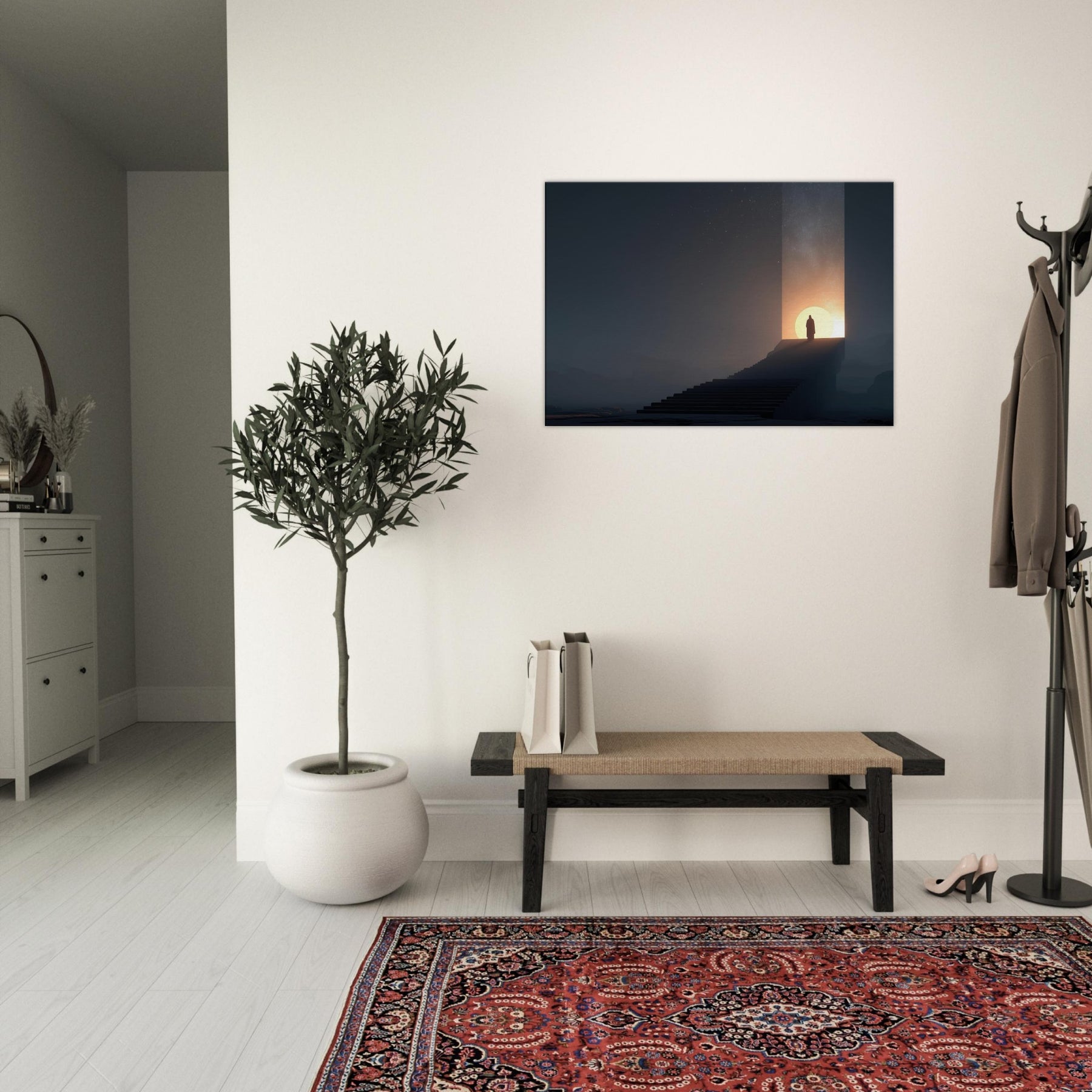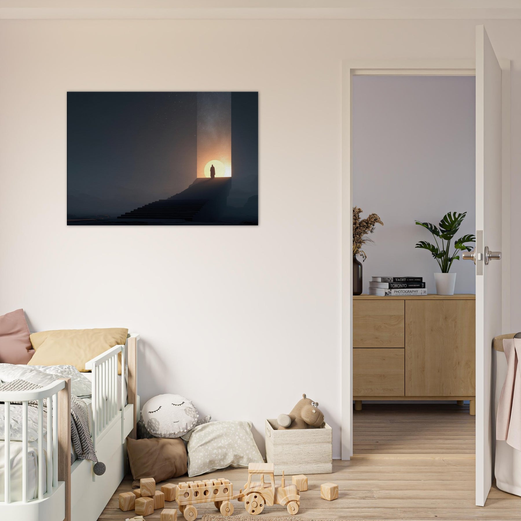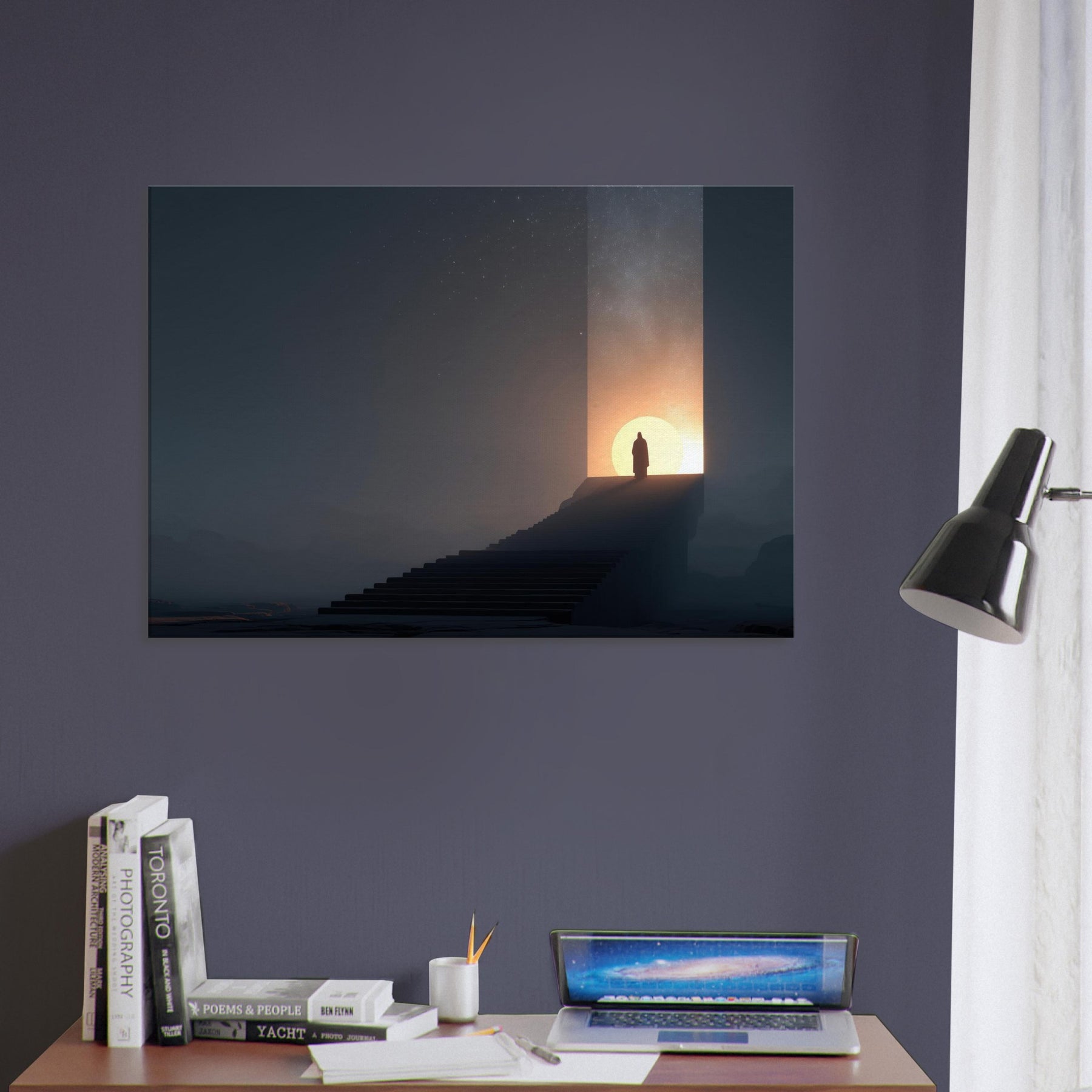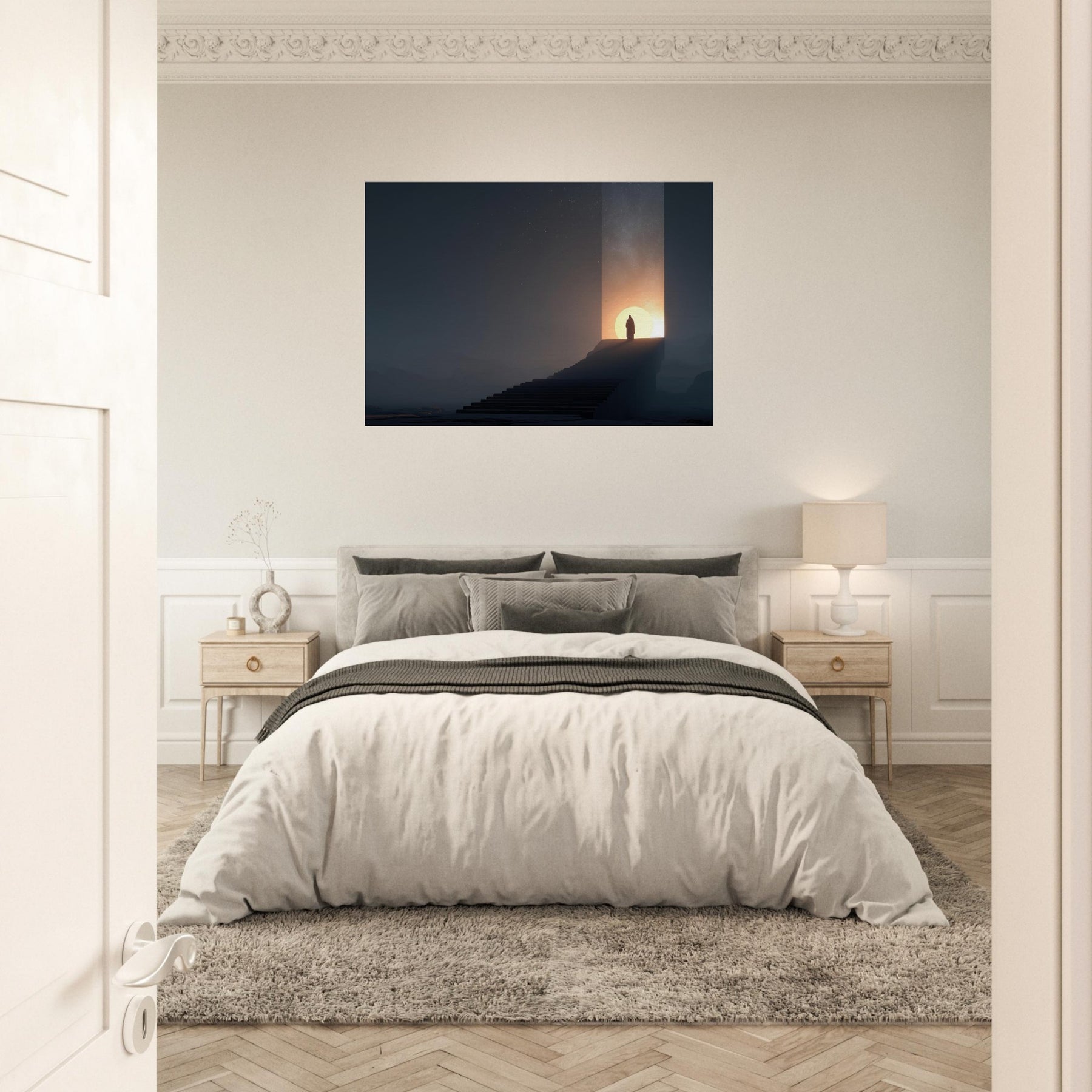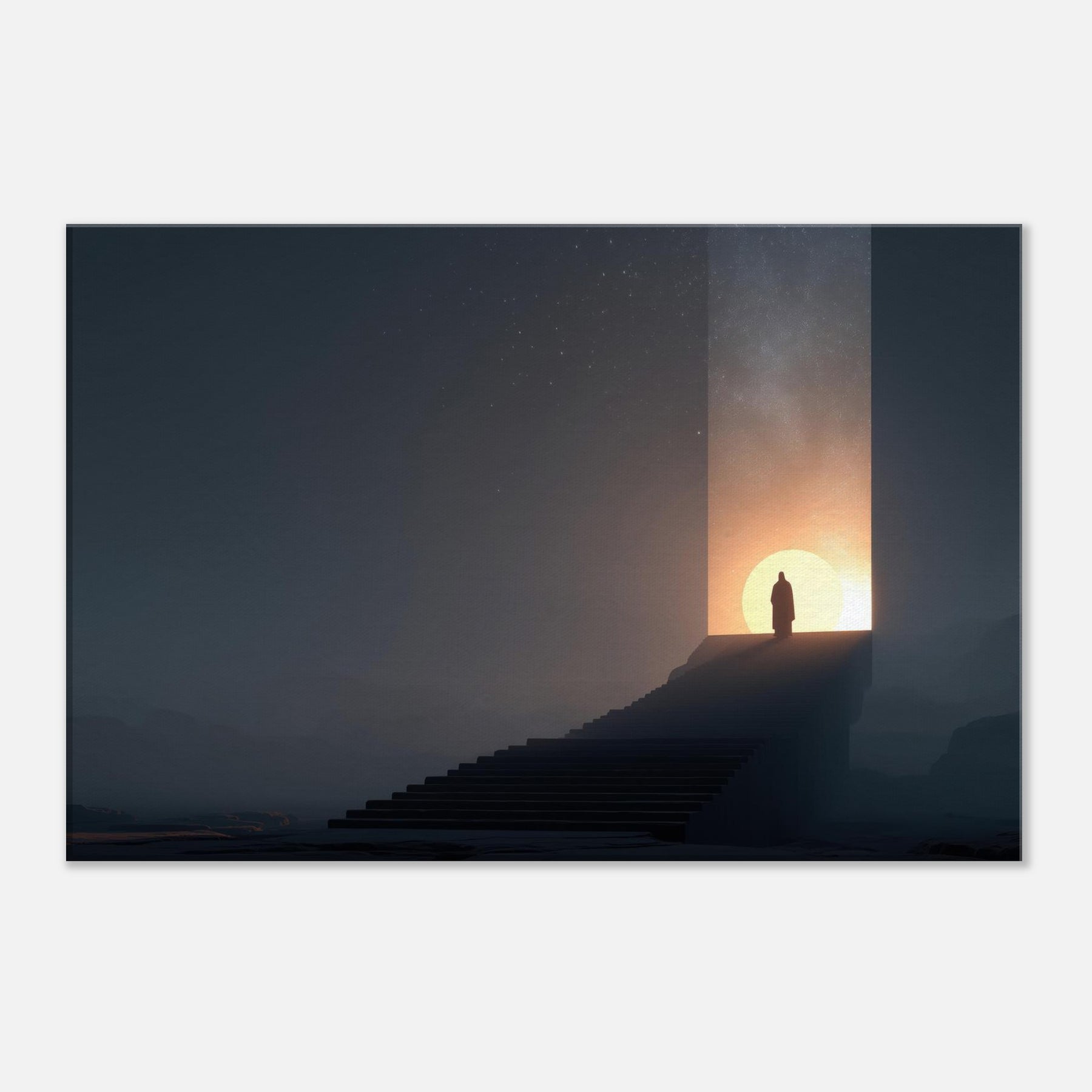 Christ the Redeemer emerges as the quiet epicenter of a dreamlike cityscape, where staircases rise into a door of light and time loosens its grip. Surreal and serene, this piece folds architecture, distant horizons, and a halo of warmth into one contemplative scene. The soft gradient of dusk, the silhouette of a solitary figure, and the vast, star spangled sky invite slow, lingering glances. Hang it in a living room or study to evoke wonder, calm, and a sense that every room is a threshold to possibility.