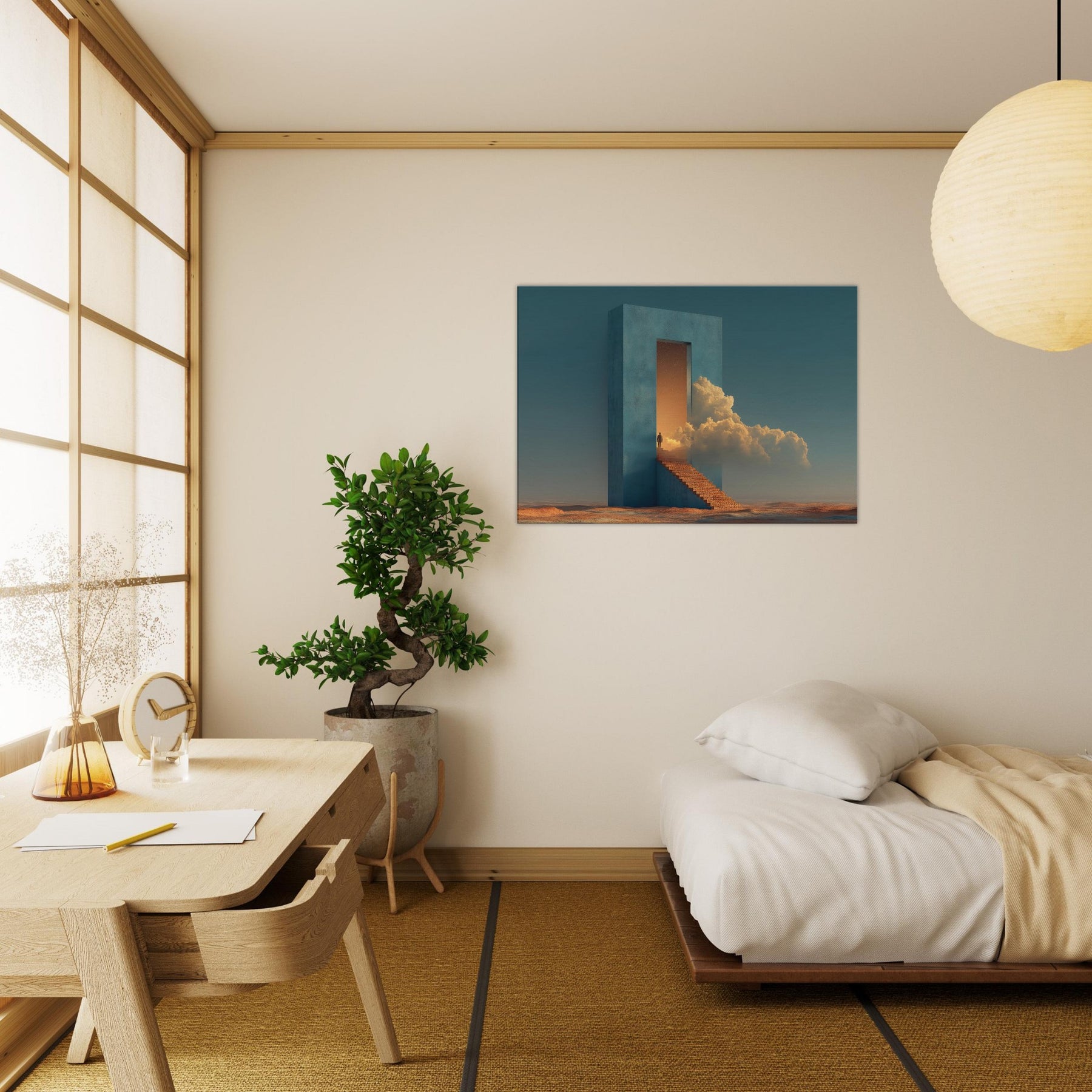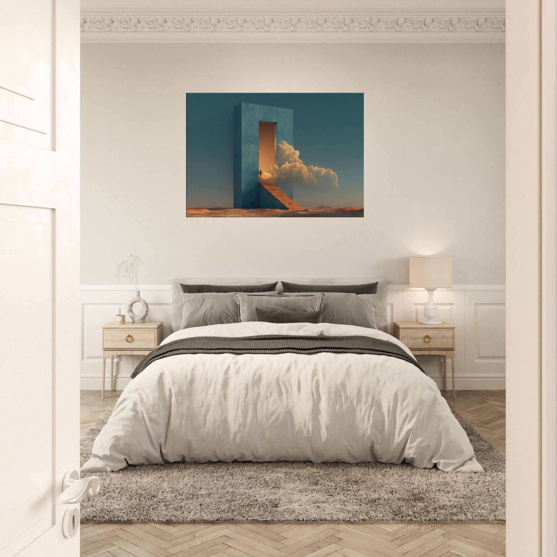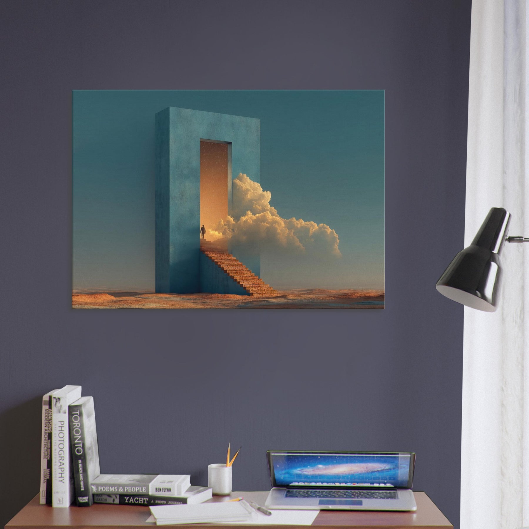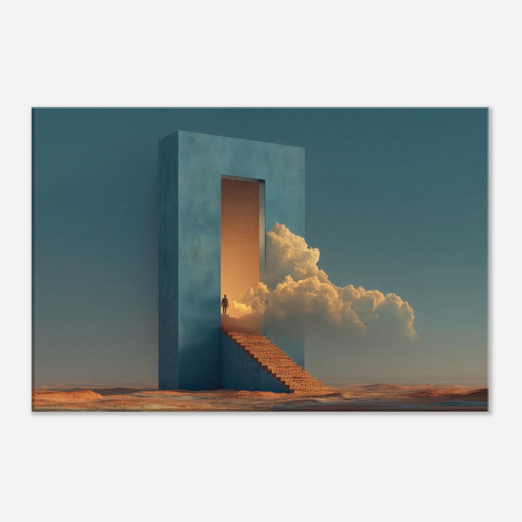 A solitary fortress rises from a desert seabed, its azure walls framing a doorway that opens into a glowing dream. Surrounded by warm light and billowing clouds, the surreal staircase invites quiet ascent, turning everyday living spaces into a corridor of wonder. This piece evokes a tranquil, otherworldly mood perfect for a living room or study, where calm, curiosity, and architectural poetry mingle in soft, cinematic tones.