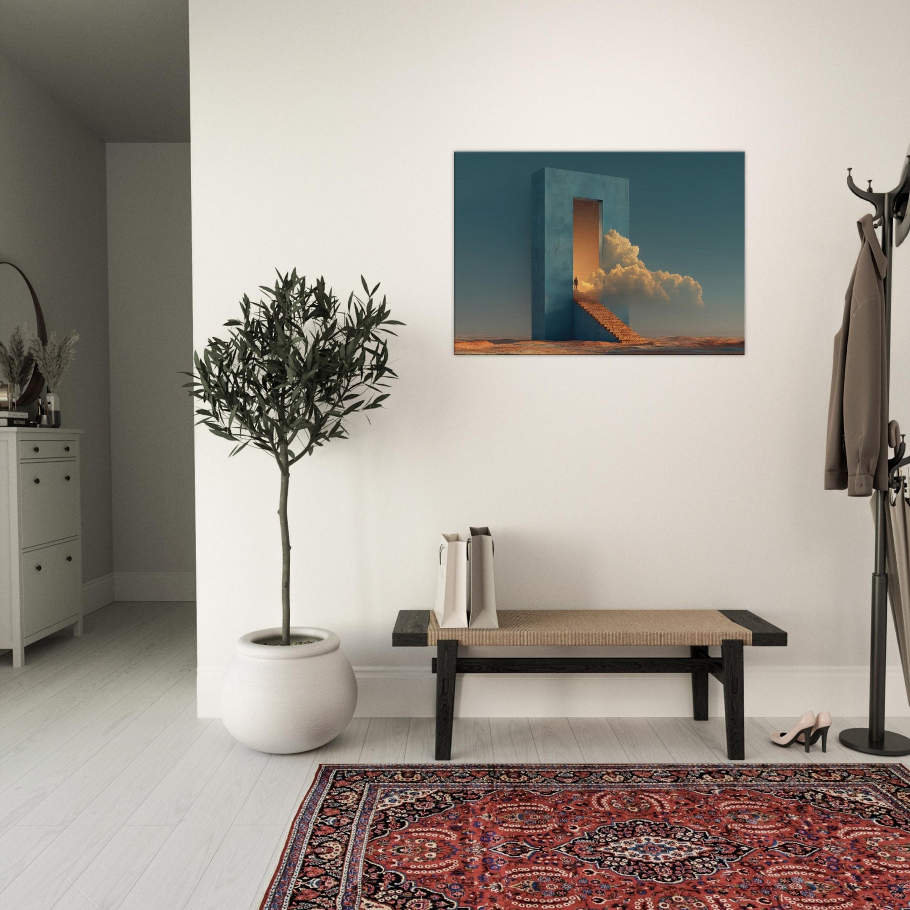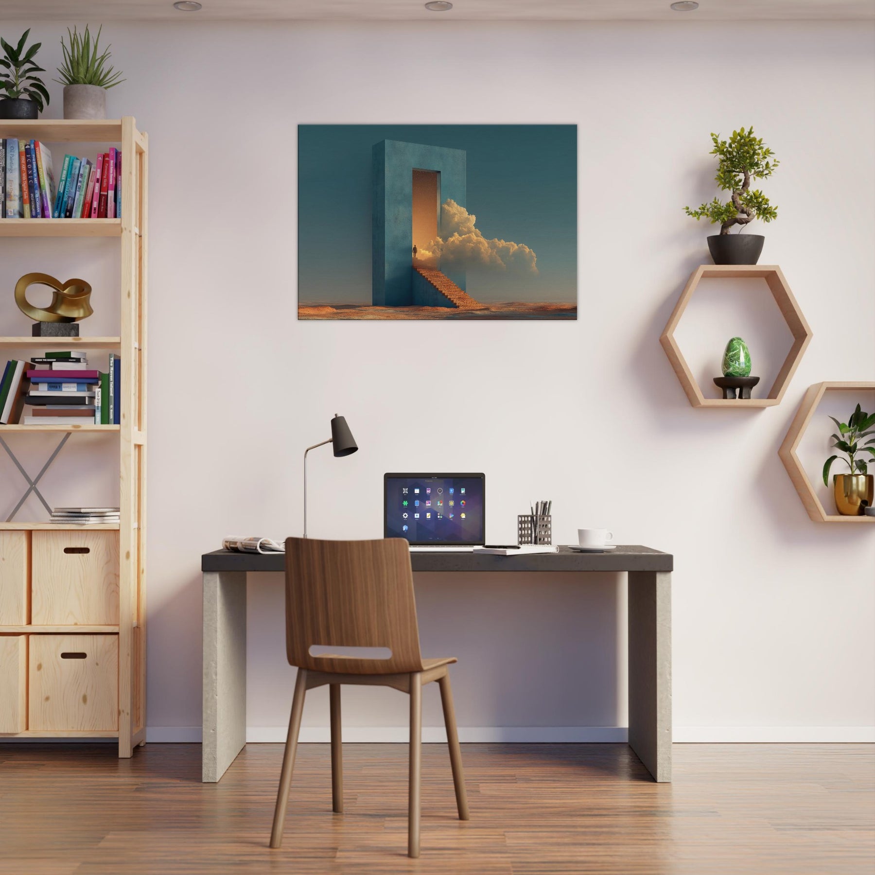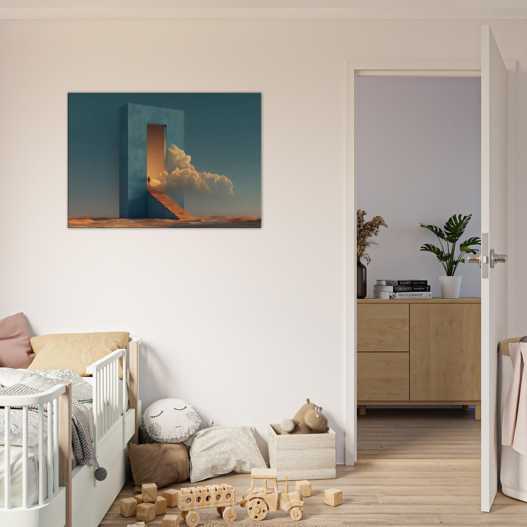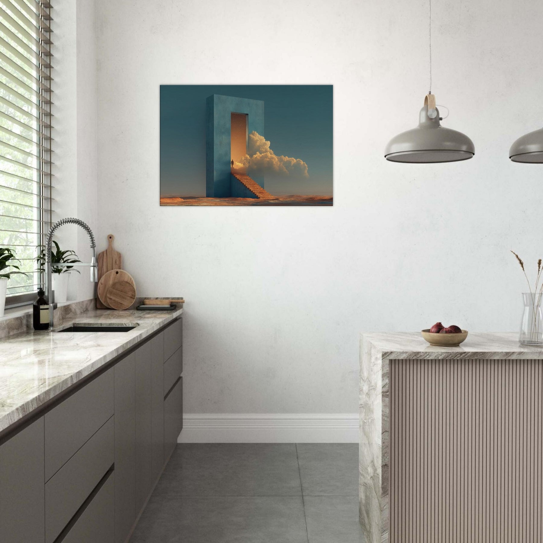 A solitary fortress rises from a desert seabed, its azure walls framing a doorway that opens into a glowing dream. Surrounded by warm light and billowing clouds, the surreal staircase invites quiet ascent, turning everyday living spaces into a corridor of wonder. This piece evokes a tranquil, otherworldly mood perfect for a living room or study, where calm, curiosity, and architectural poetry mingle in soft, cinematic tones.