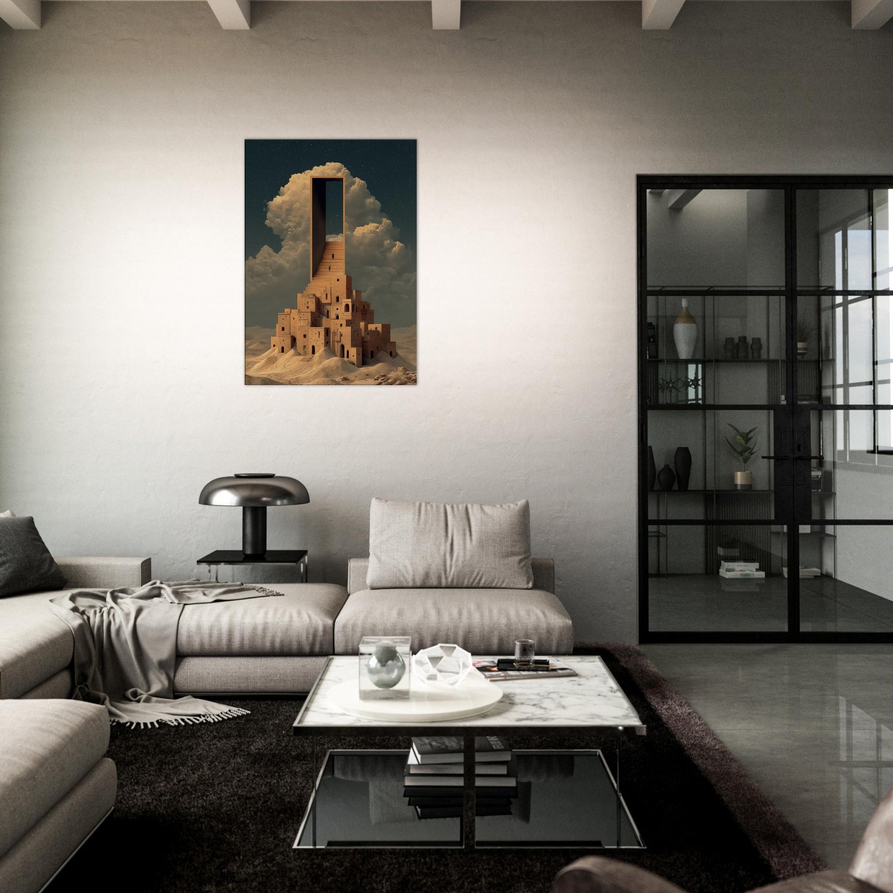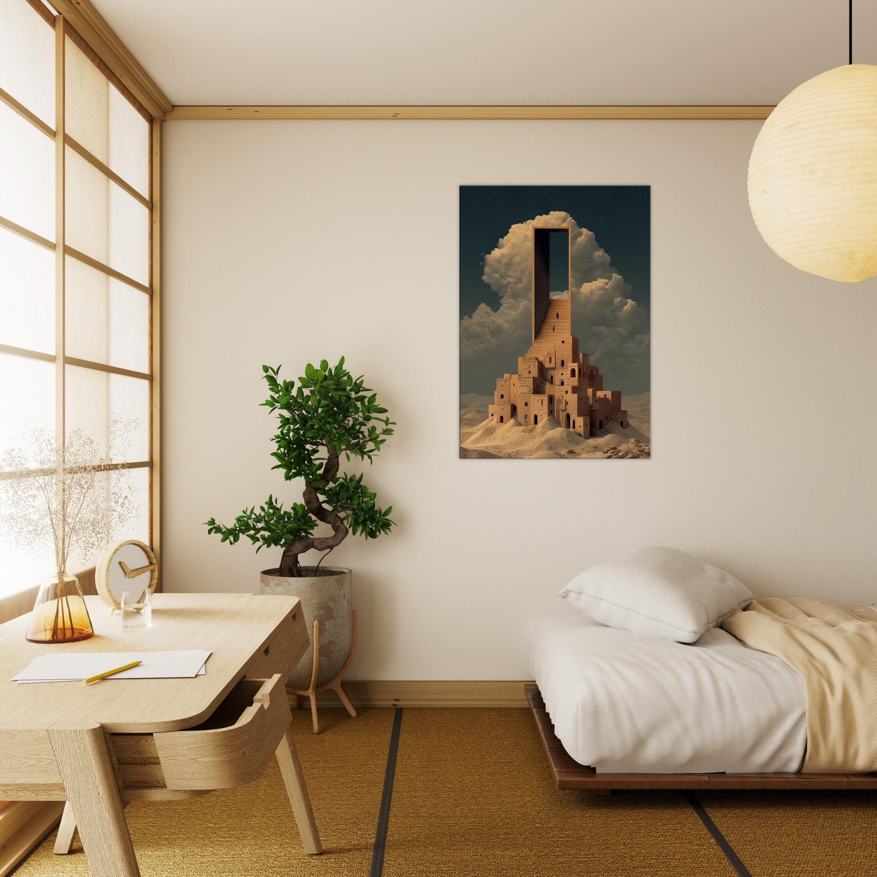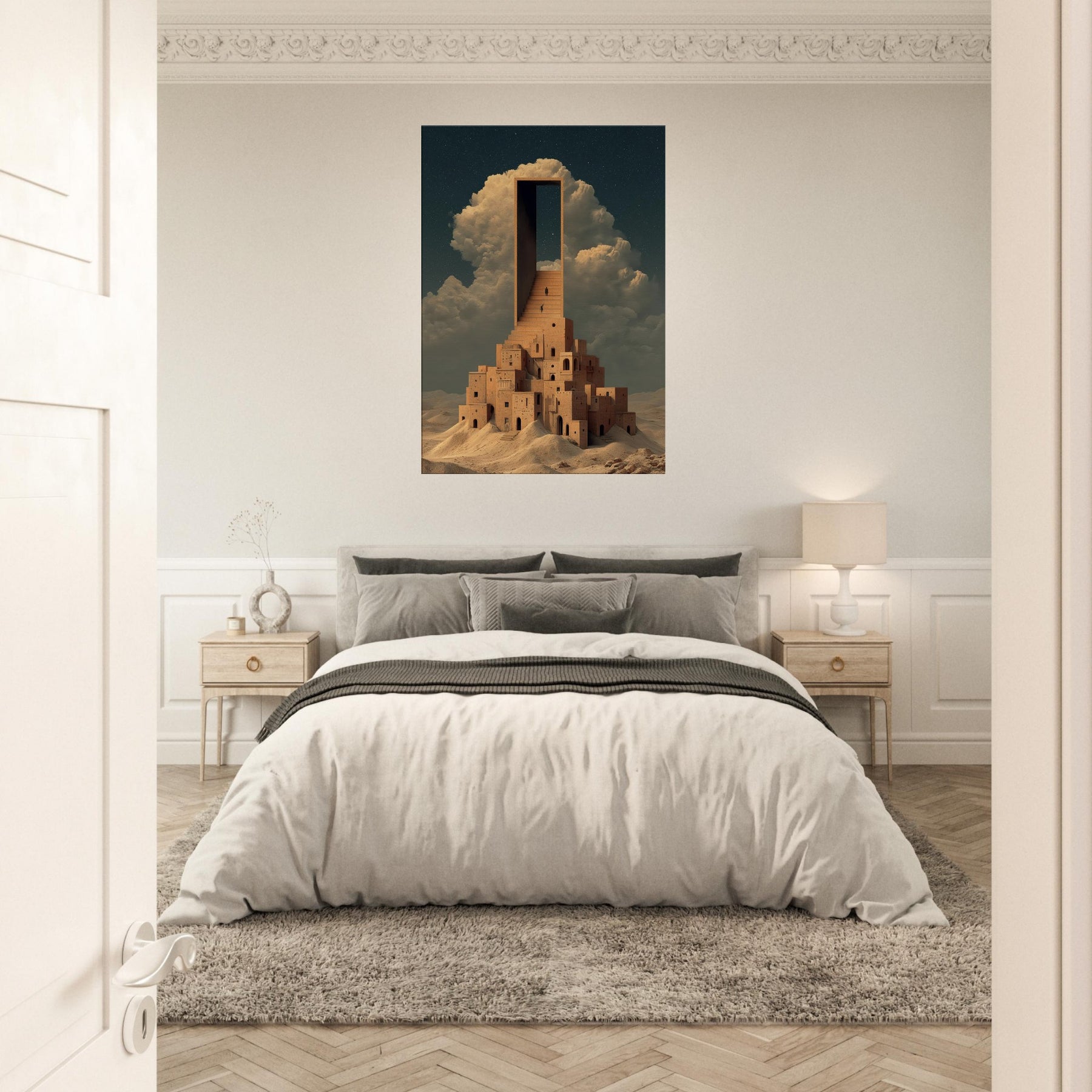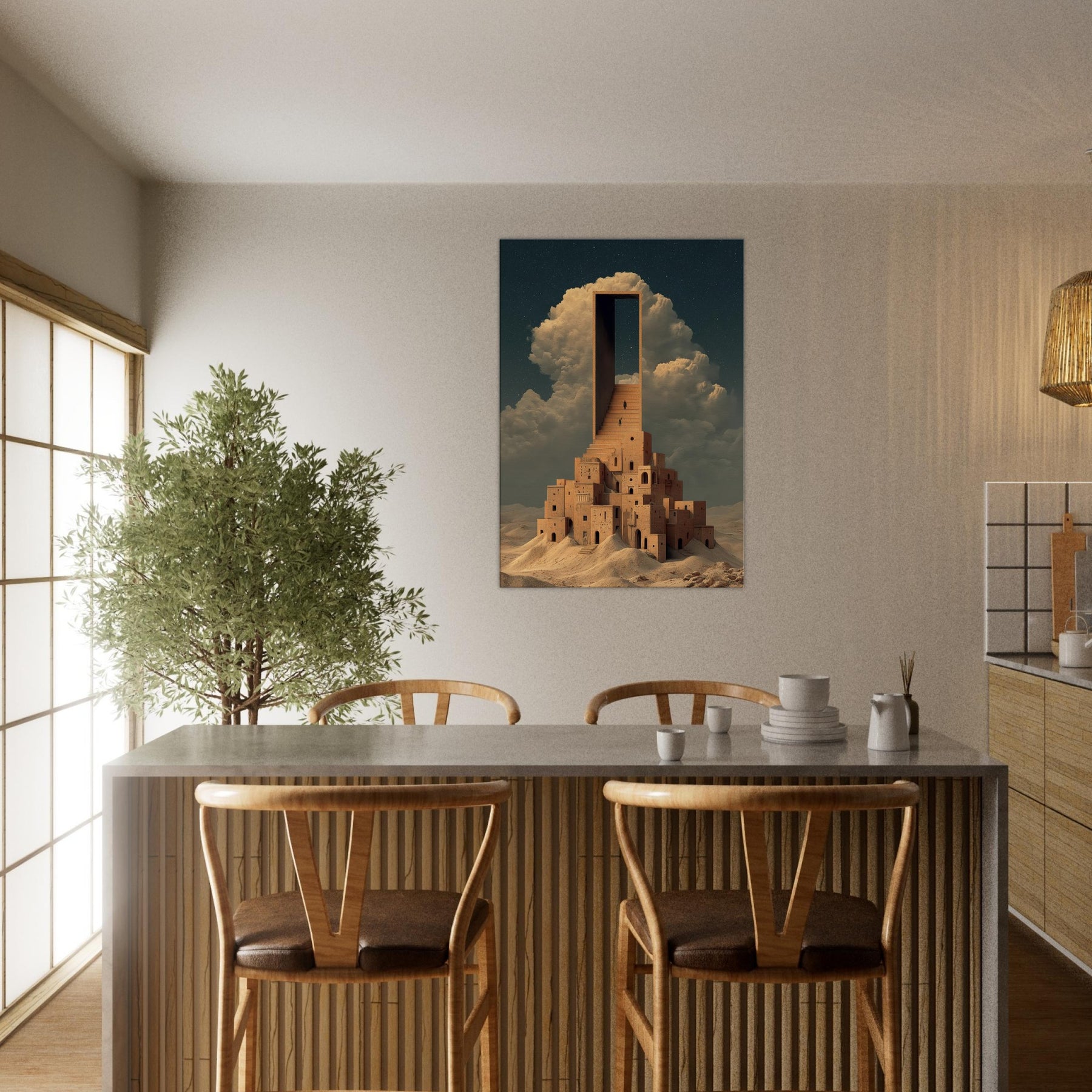 A surreal Medieval Castle rises from sun warmed dunes, its stairways spiraling toward a doorway that opens to the sky. The scene hums with quiet contemplation, where warm stone tones meet cool, cloud lit air. As a centerpiece, it invites convo and quiet focus, transforming a living room into a horizon of imagination. This piece carries the stillness of ancient architecture with dreamlike scale, perfect for creating mood, wonder, and depth in any contemporary space.