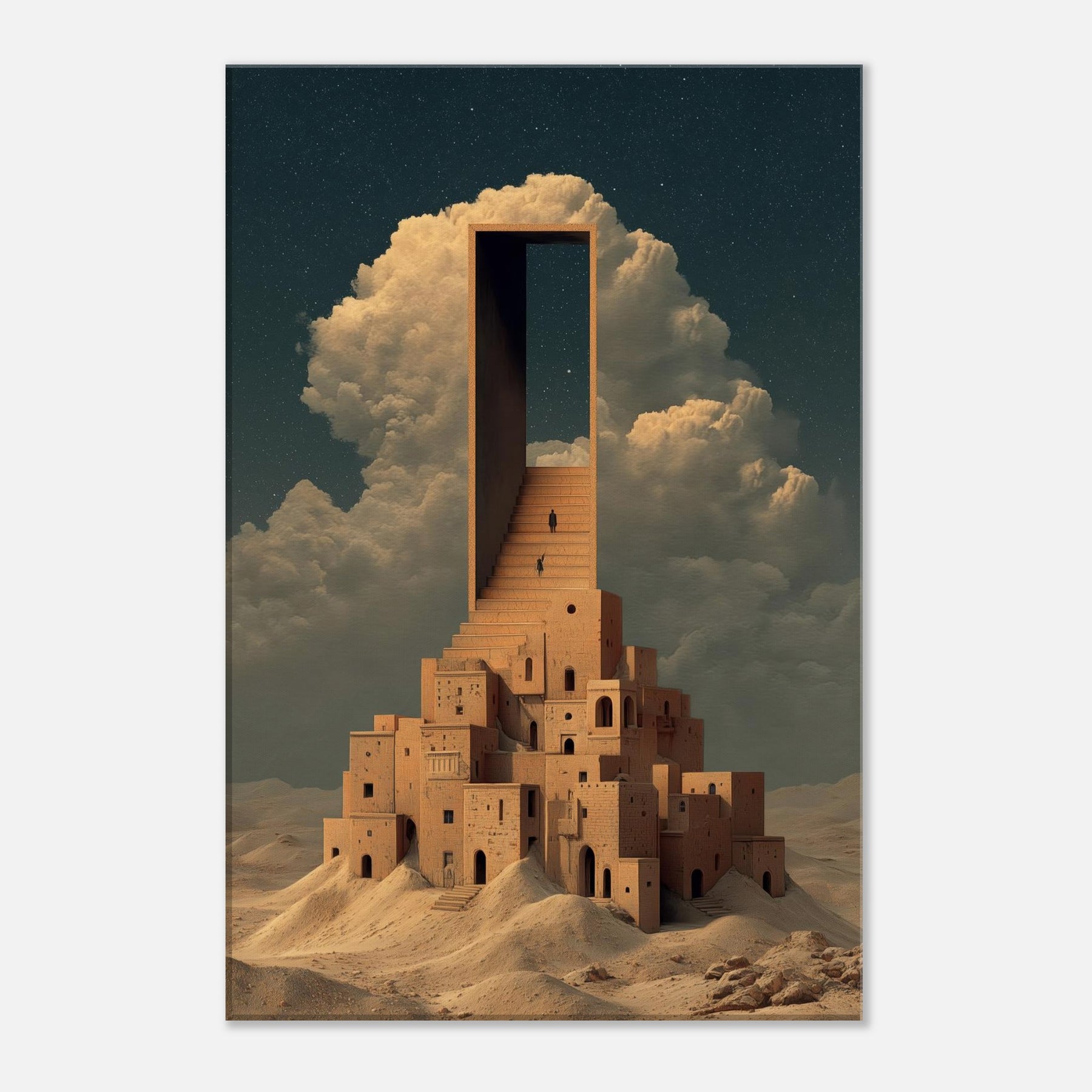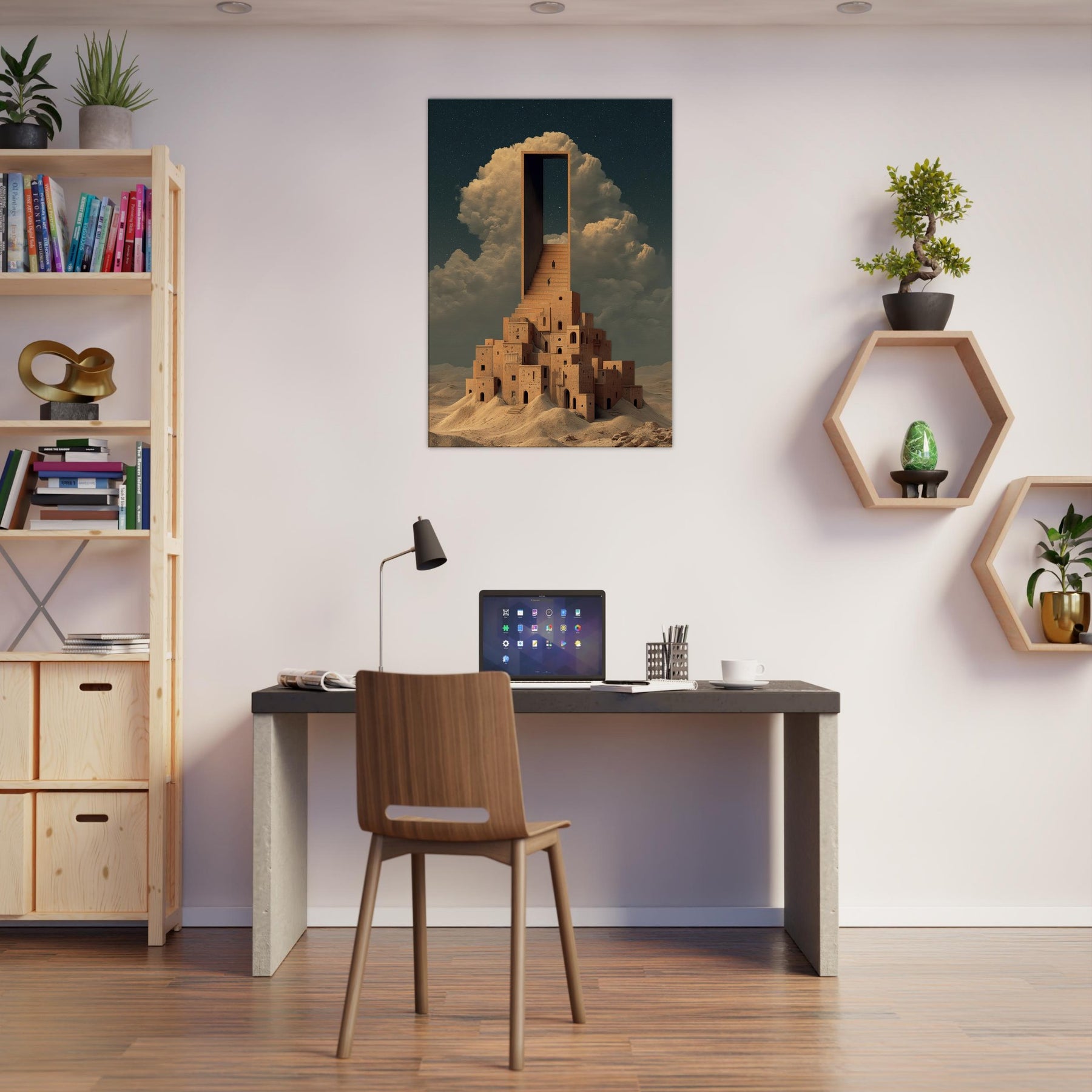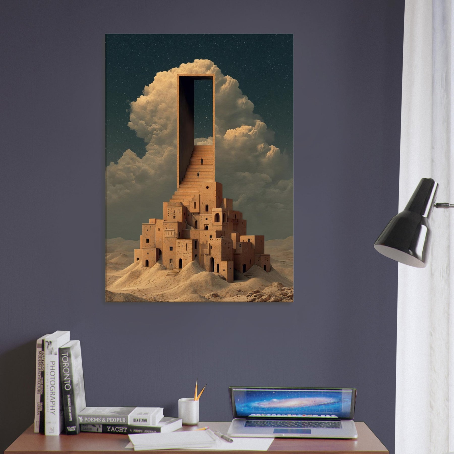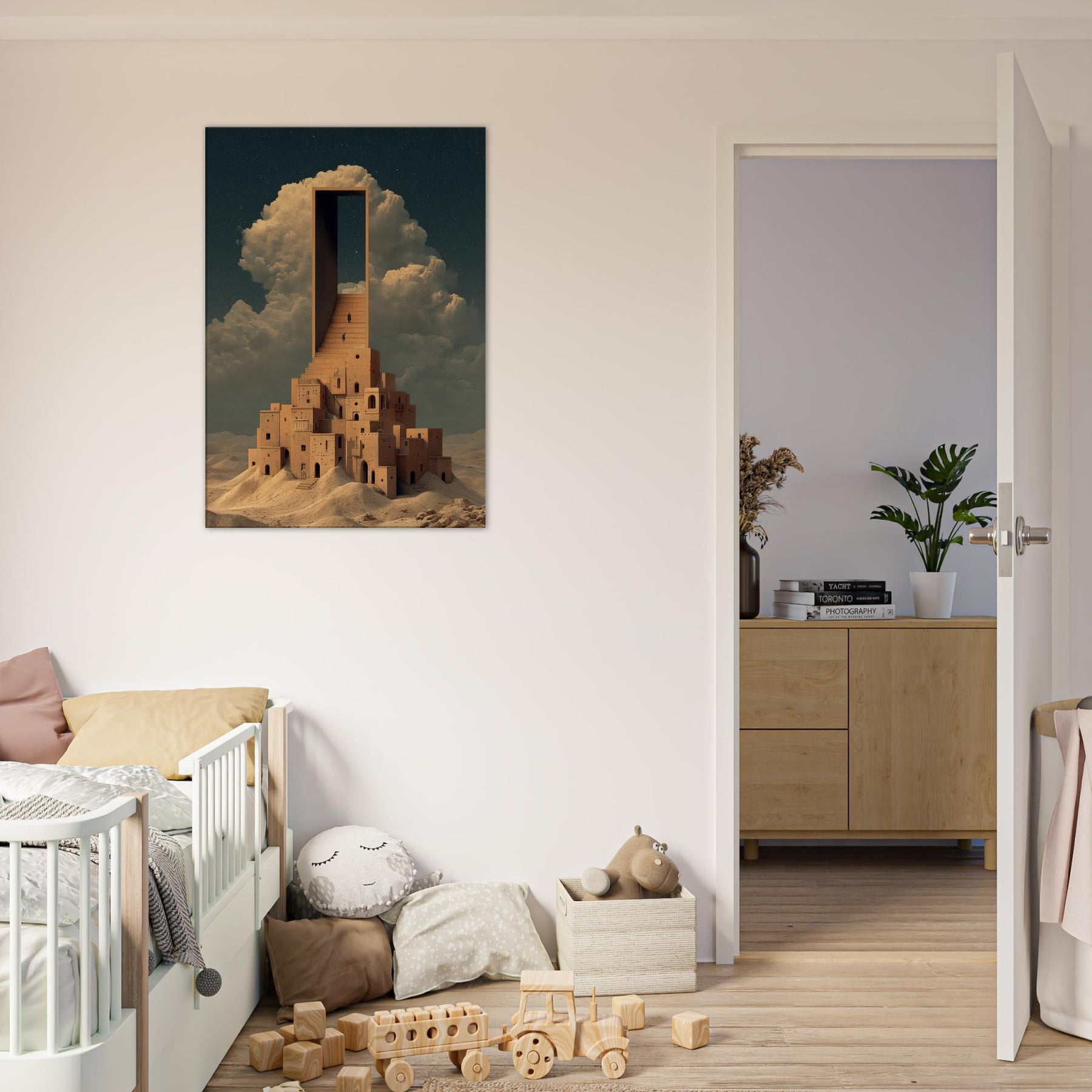 A surreal Medieval Castle rises from sun warmed dunes, its stairways spiraling toward a doorway that opens to the sky. The scene hums with quiet contemplation, where warm stone tones meet cool, cloud lit air. As a centerpiece, it invites convo and quiet focus, transforming a living room into a horizon of imagination. This piece carries the stillness of ancient architecture with dreamlike scale, perfect for creating mood, wonder, and depth in any contemporary space.
