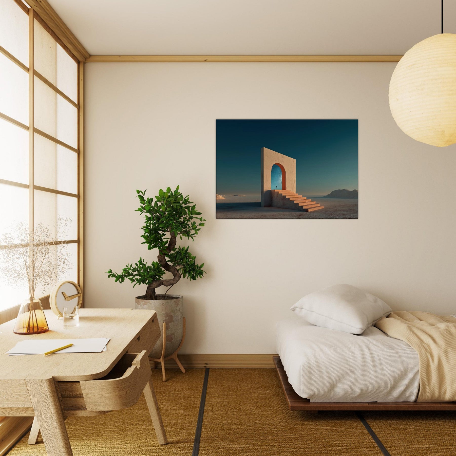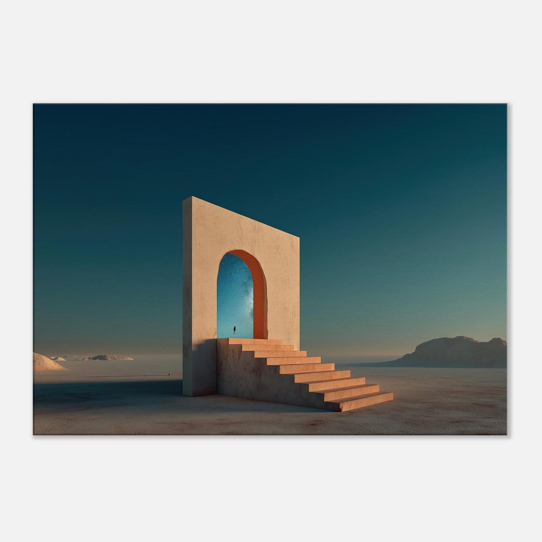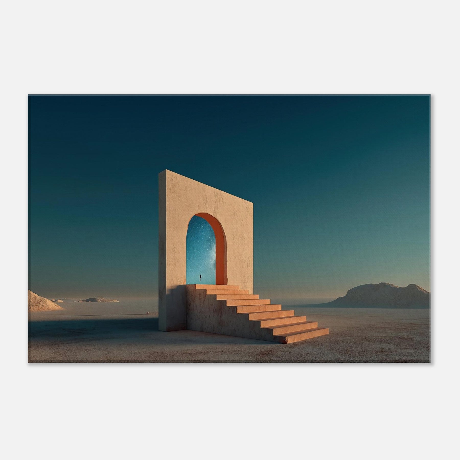 Step into Marrakech's sun warmed mirage with this quiet, architectural dream. A colossal arch stands in an endless sea of sand, its steps inviting you to ascend toward a star filled sky. The image blends memory and wonder, where a lone figure unfolds a path between what is and what could be. The palette terracotta light and cool cerulean dusk wraps living rooms with warmth and space, turning walls into a doorway to travel, reflection, and everyday wonder.