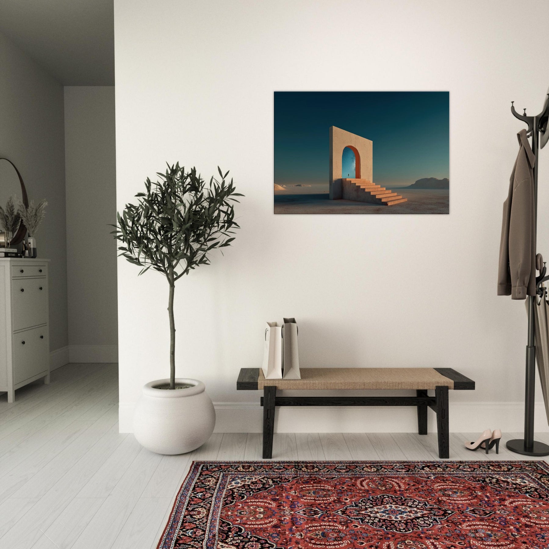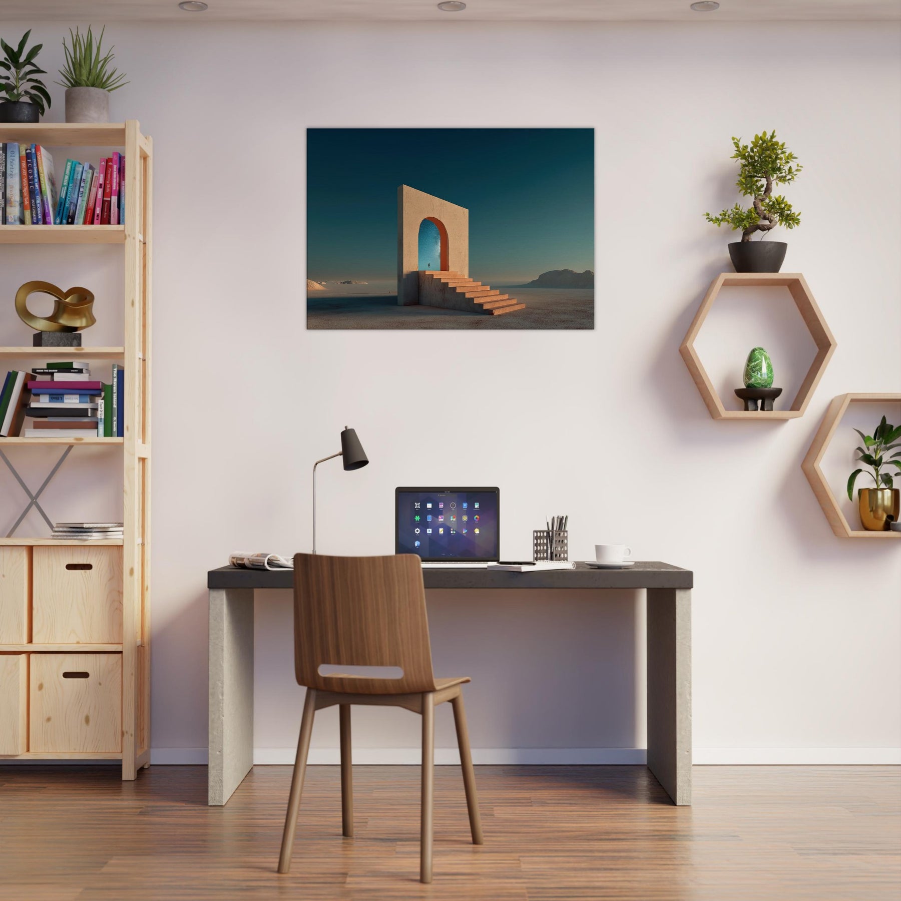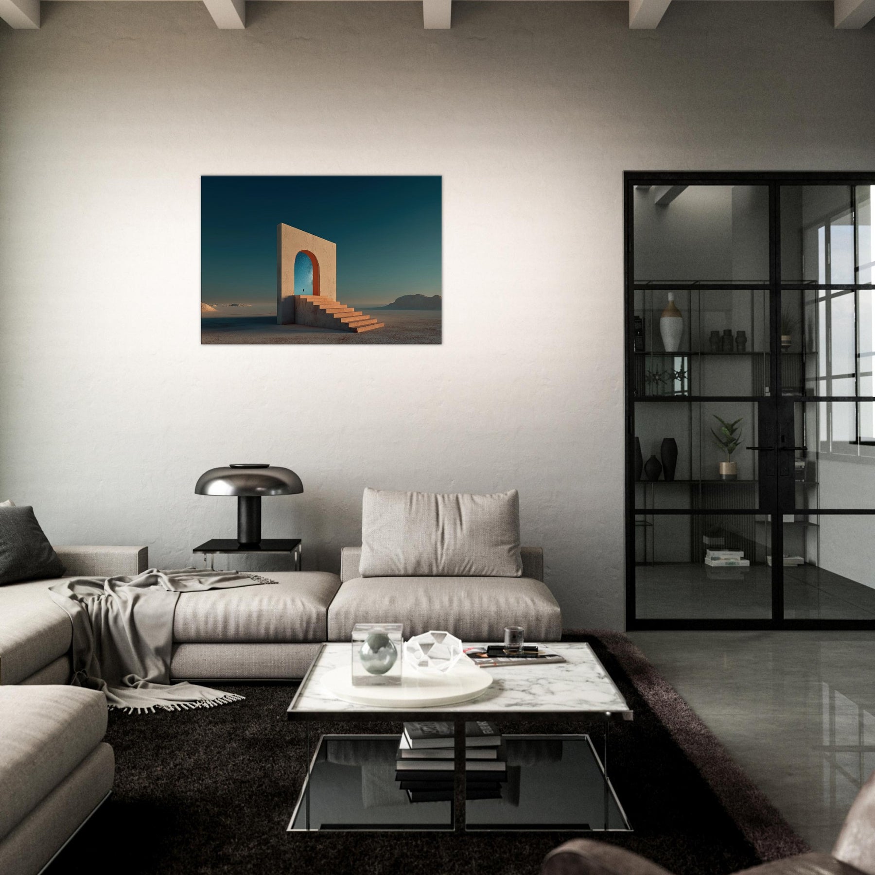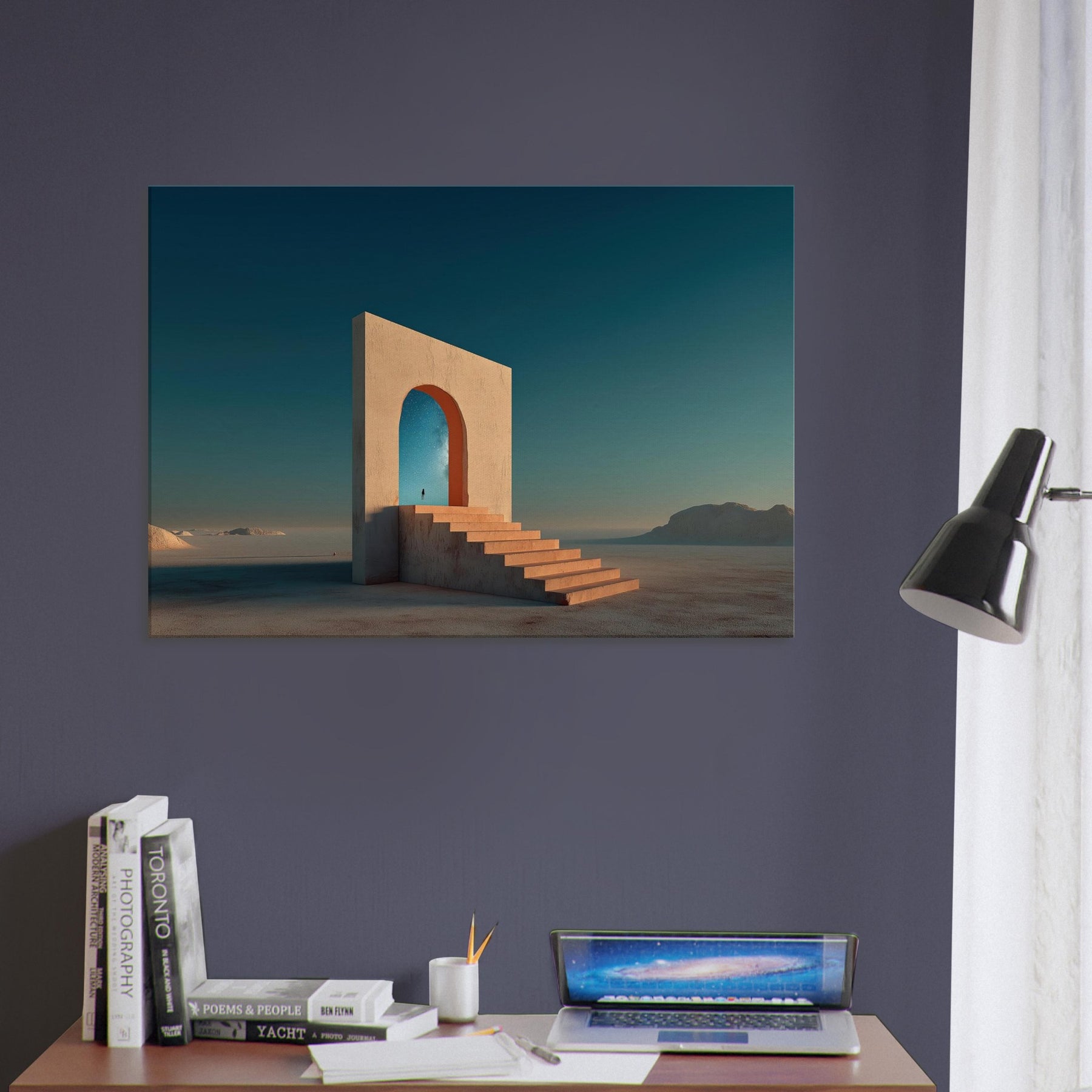 Step into Marrakech's sun warmed mirage with this quiet, architectural dream. A colossal arch stands in an endless sea of sand, its steps inviting you to ascend toward a star filled sky. The image blends memory and wonder, where a lone figure unfolds a path between what is and what could be. The palette terracotta light and cool cerulean dusk wraps living rooms with warmth and space, turning walls into a doorway to travel, reflection, and everyday wonder.