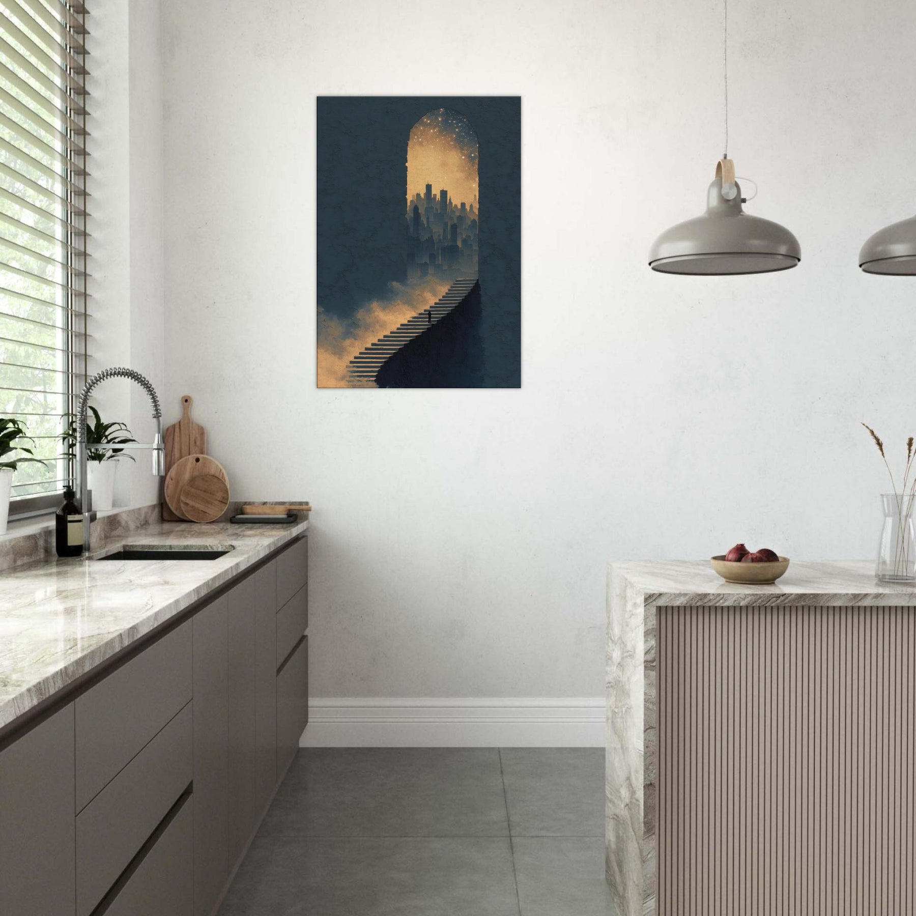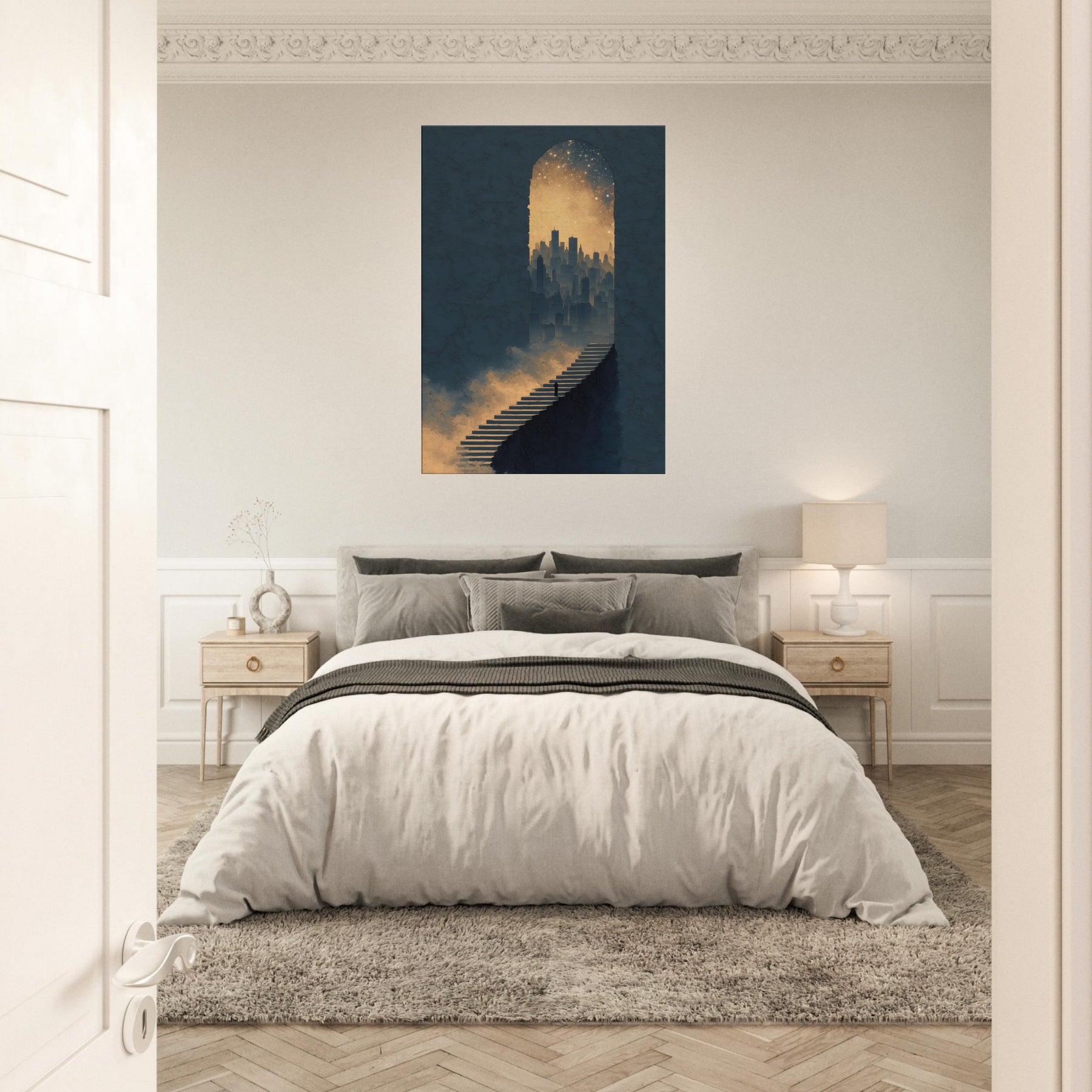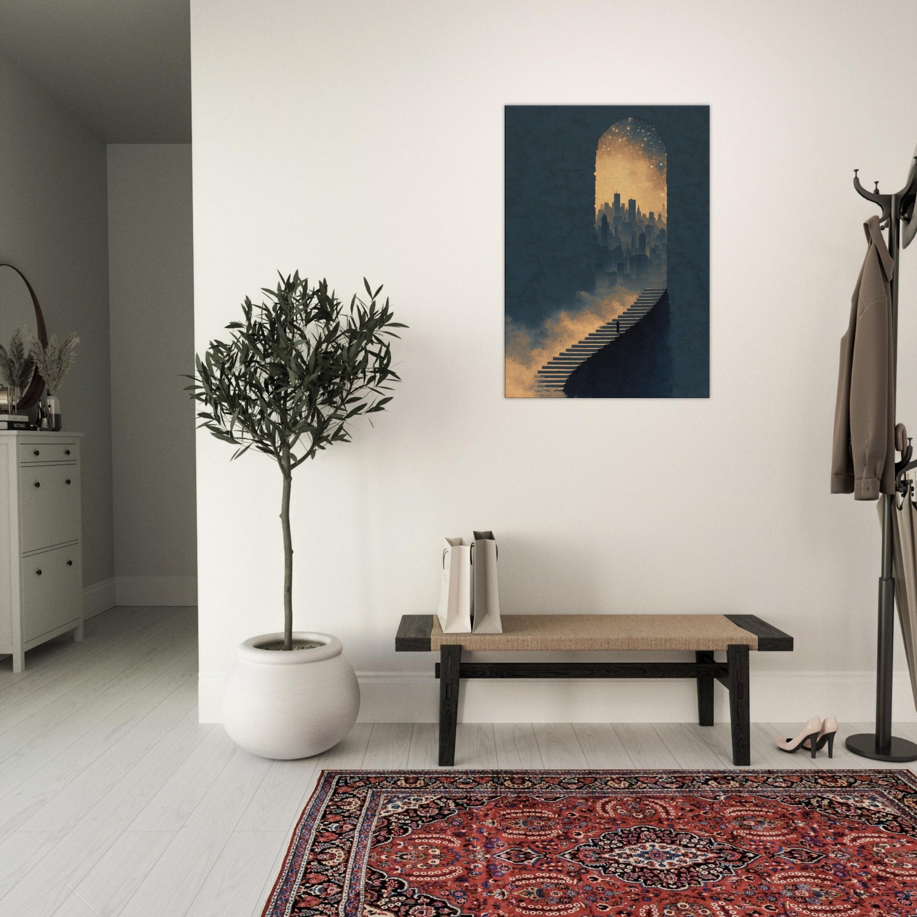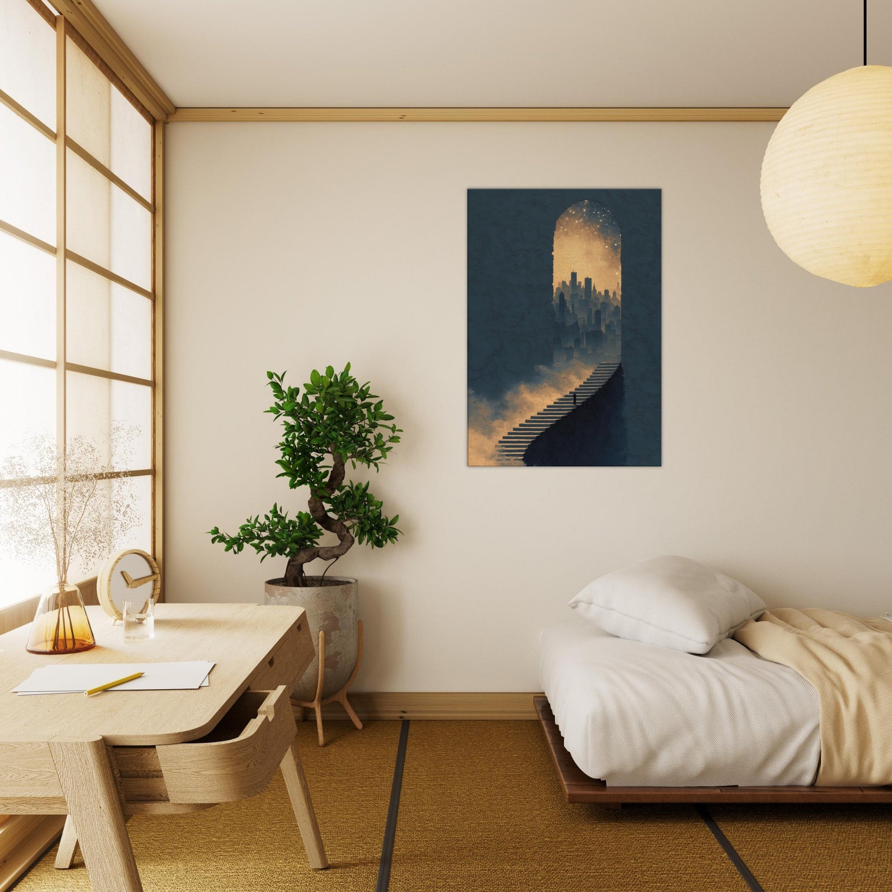 Singapore unfurls beyond a solemn arch, where a monumental staircase climbs through twilight toward a radiant metropolis. The air tastes of copper and rain as distant engines murmur beneath a sky dotted with starlight. Surreal shadows sculpt the towers, and a warm, amber haze settles like whispered memory, inviting the eye to wander, to linger, to dream. This piece transforms a wall into a portal, softening modern corners with lyrical height and distance, making living spaces feel aspirational, intimate, and eternally curious about the city that never stops listening.