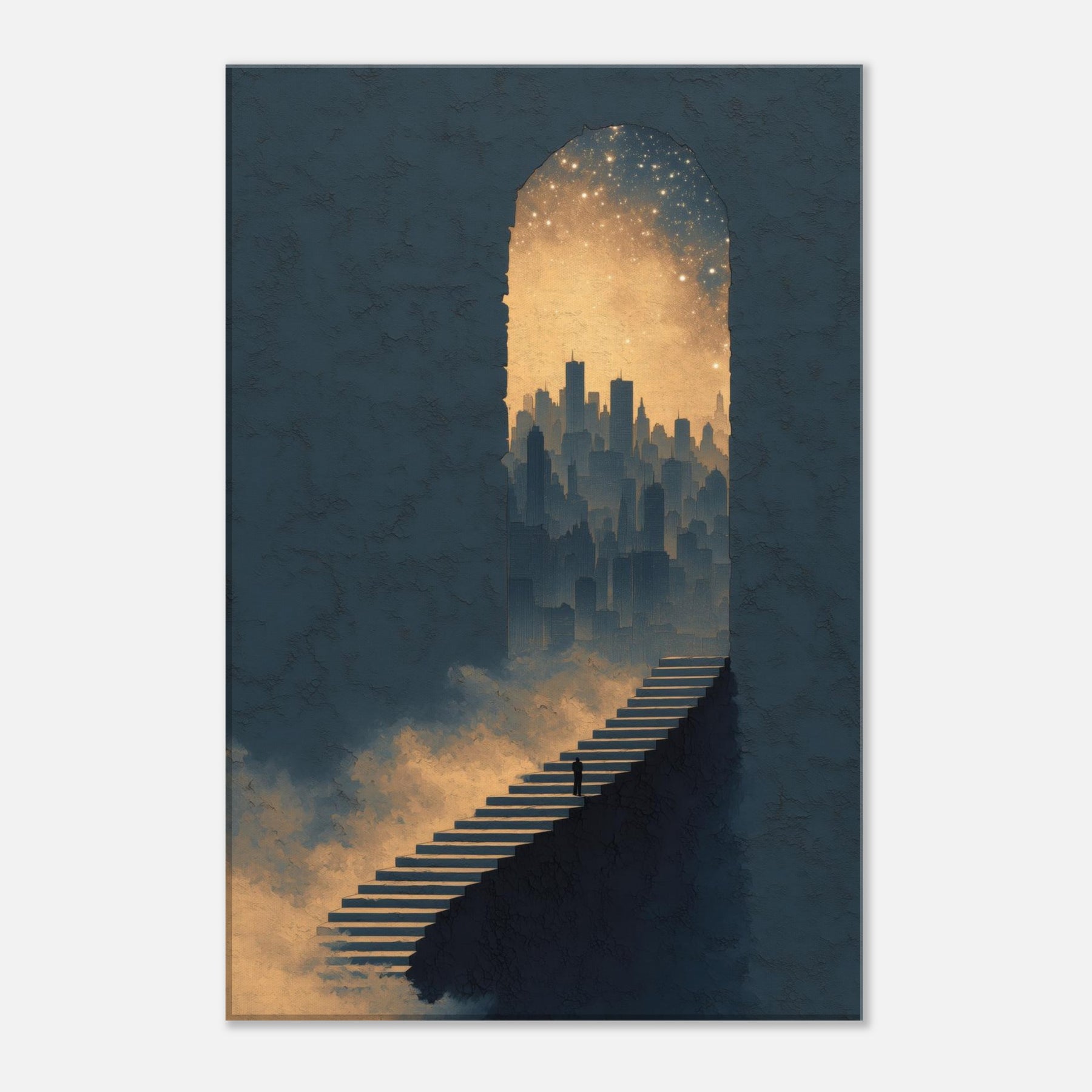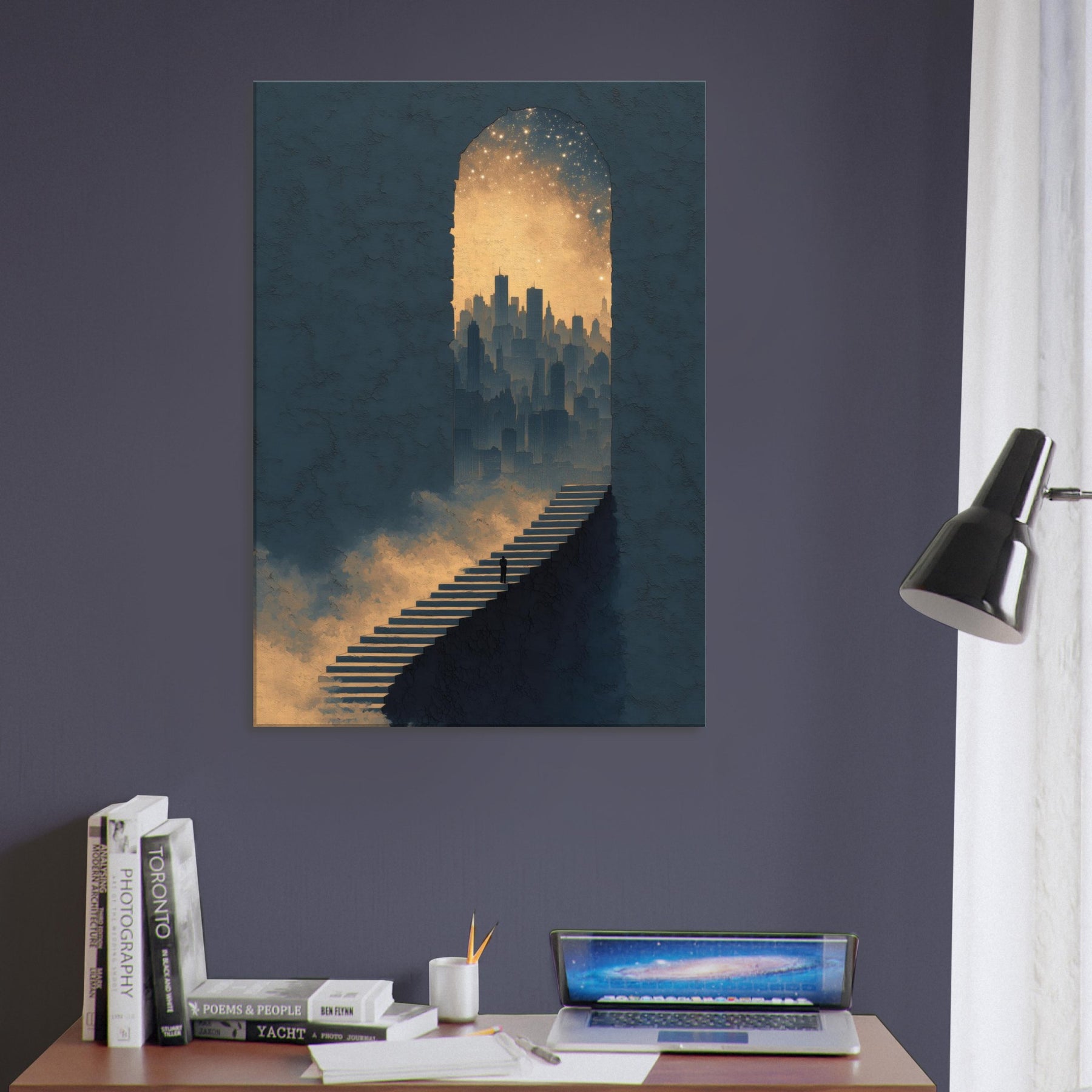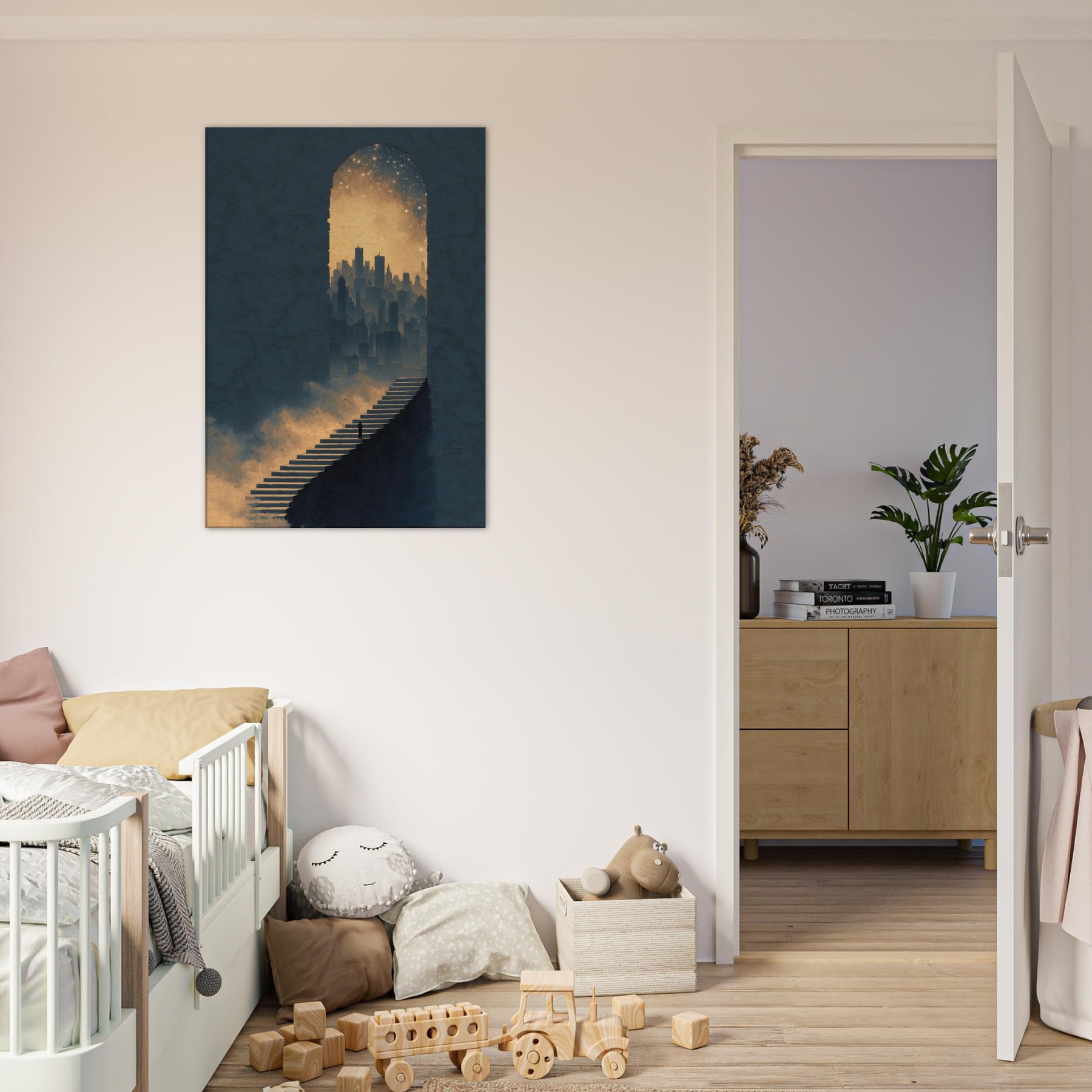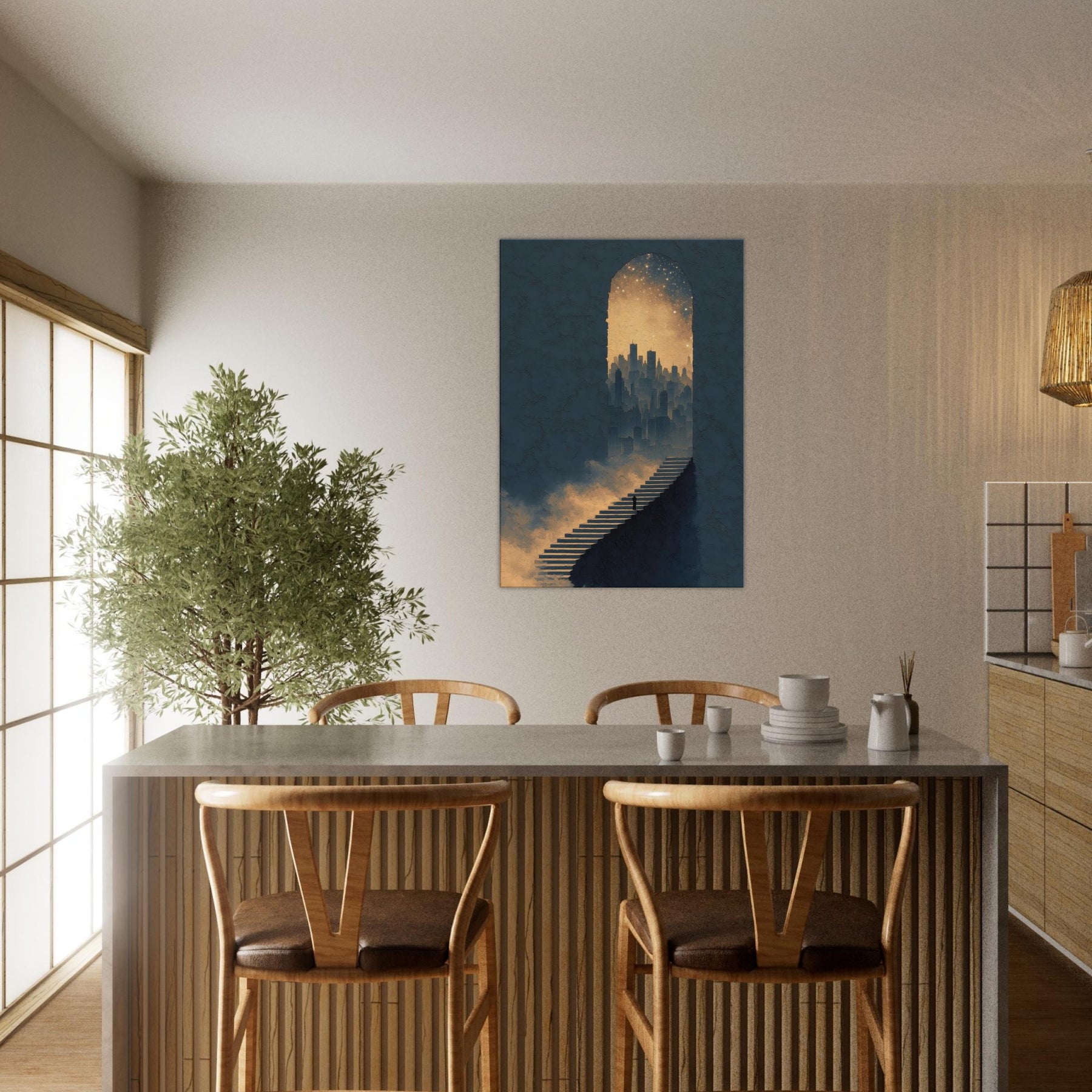 Singapore unfurls beyond a solemn arch, where a monumental staircase climbs through twilight toward a radiant metropolis. The air tastes of copper and rain as distant engines murmur beneath a sky dotted with starlight. Surreal shadows sculpt the towers, and a warm, amber haze settles like whispered memory, inviting the eye to wander, to linger, to dream. This piece transforms a wall into a portal, softening modern corners with lyrical height and distance, making living spaces feel aspirational, intimate, and eternally curious about the city that never stops listening.