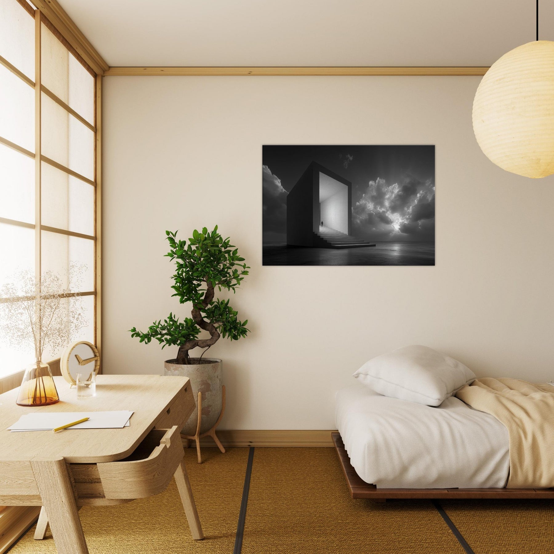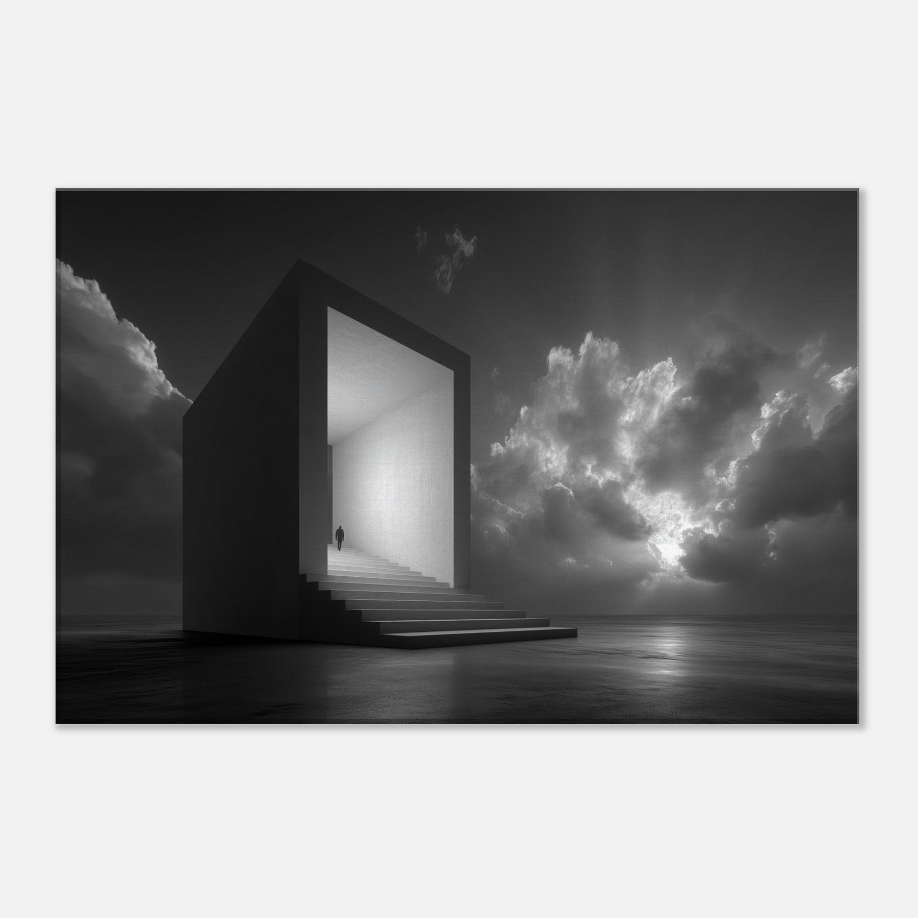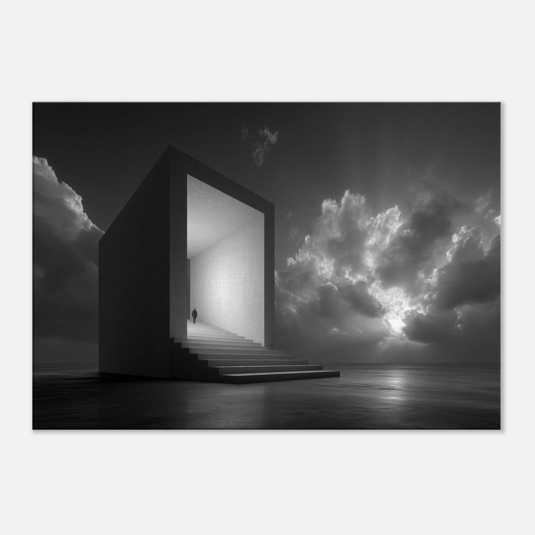 Step into Amsterdam as if through a dream portal: a monumental, hollow frame standing on still water, its white interior softly radiant. A gradual staircase climbs into light, while a lone figure moves toward the glow, weightless and contemplative. This surreal composition fuses city and architecture into a sculpture of possibility, turning any room into a contemplative sanctuary. Hang it to invite calm conversations, quiet mornings, and the feeling of a horizon kept just out of reach.