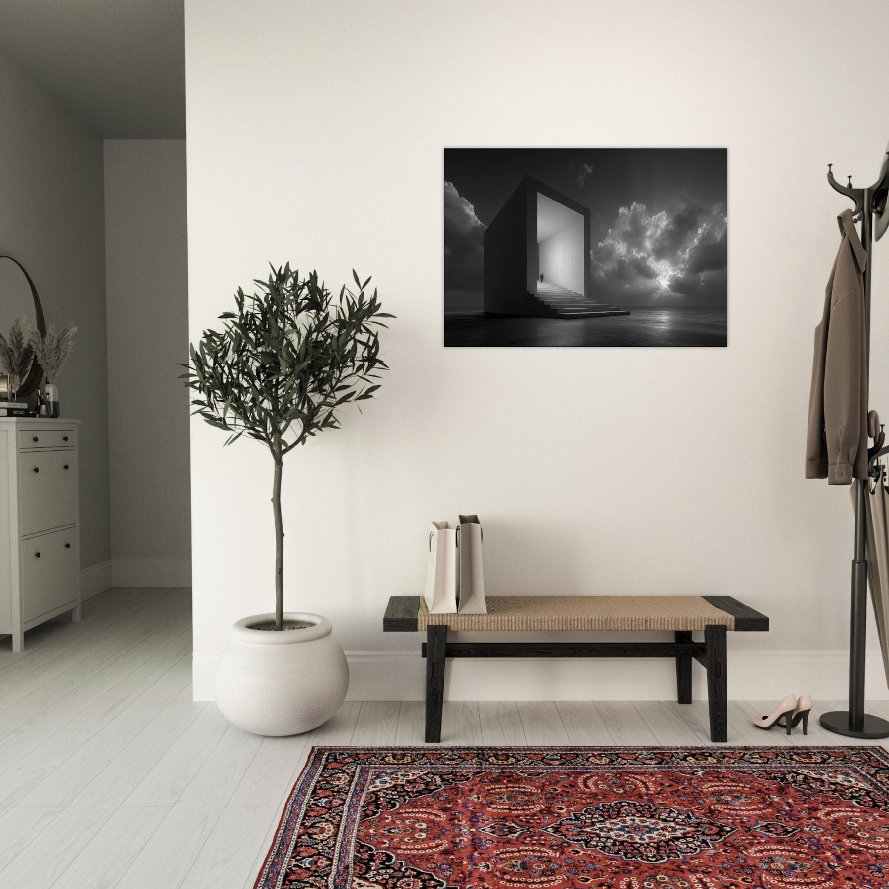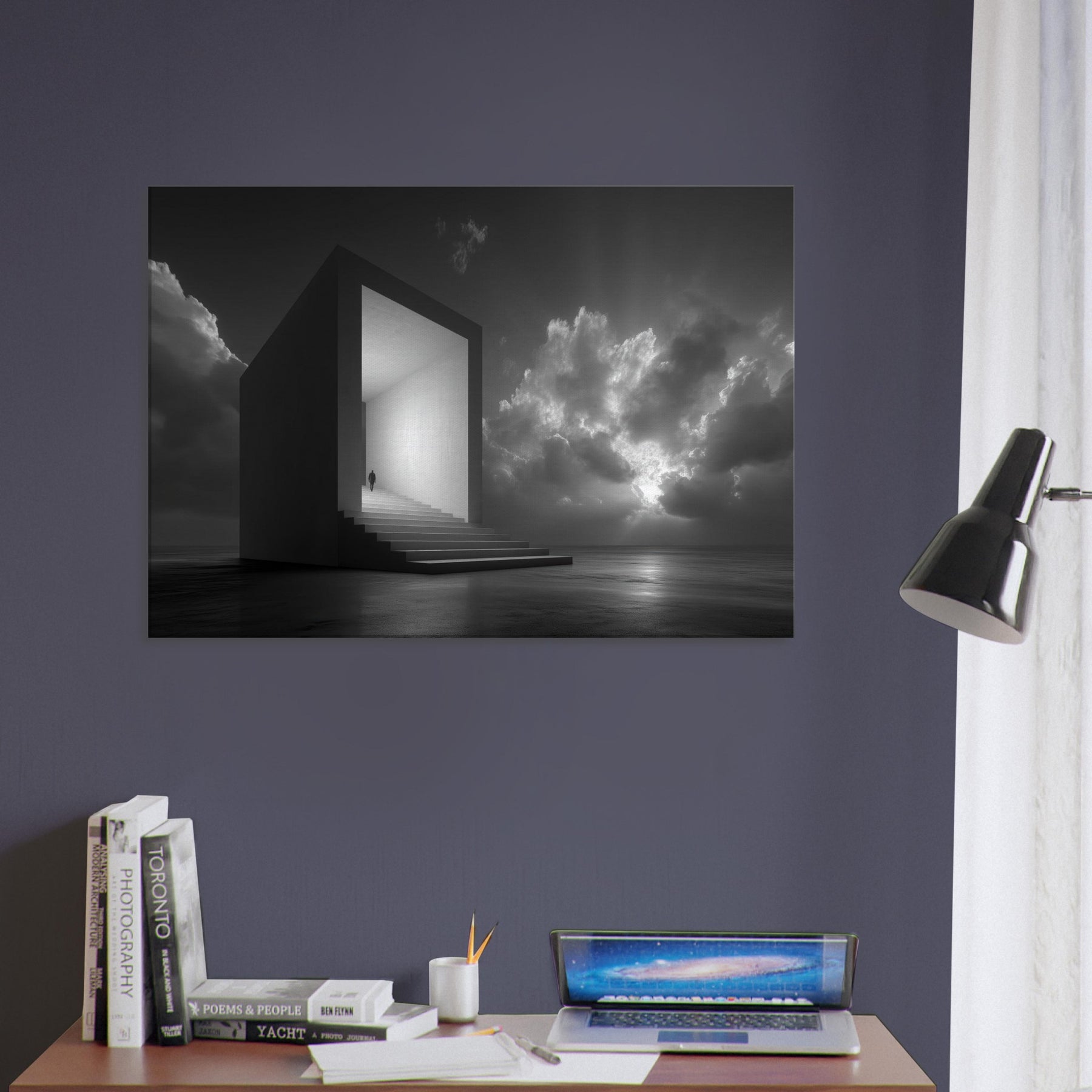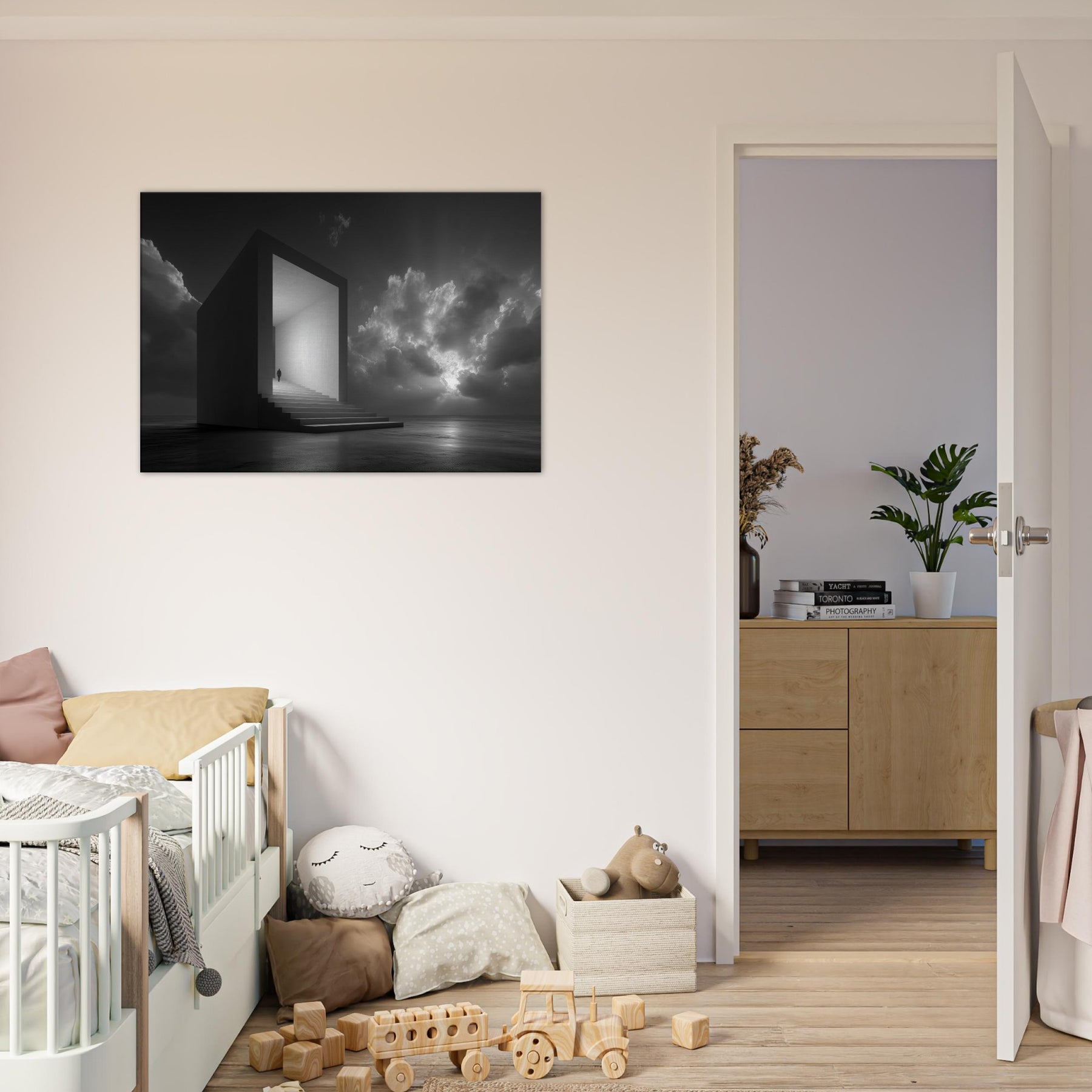 Step into Amsterdam as if through a dream portal: a monumental, hollow frame standing on still water, its white interior softly radiant. A gradual staircase climbs into light, while a lone figure moves toward the glow, weightless and contemplative. This surreal composition fuses city and architecture into a sculpture of possibility, turning any room into a contemplative sanctuary. Hang it to invite calm conversations, quiet mornings, and the feeling of a horizon kept just out of reach.
