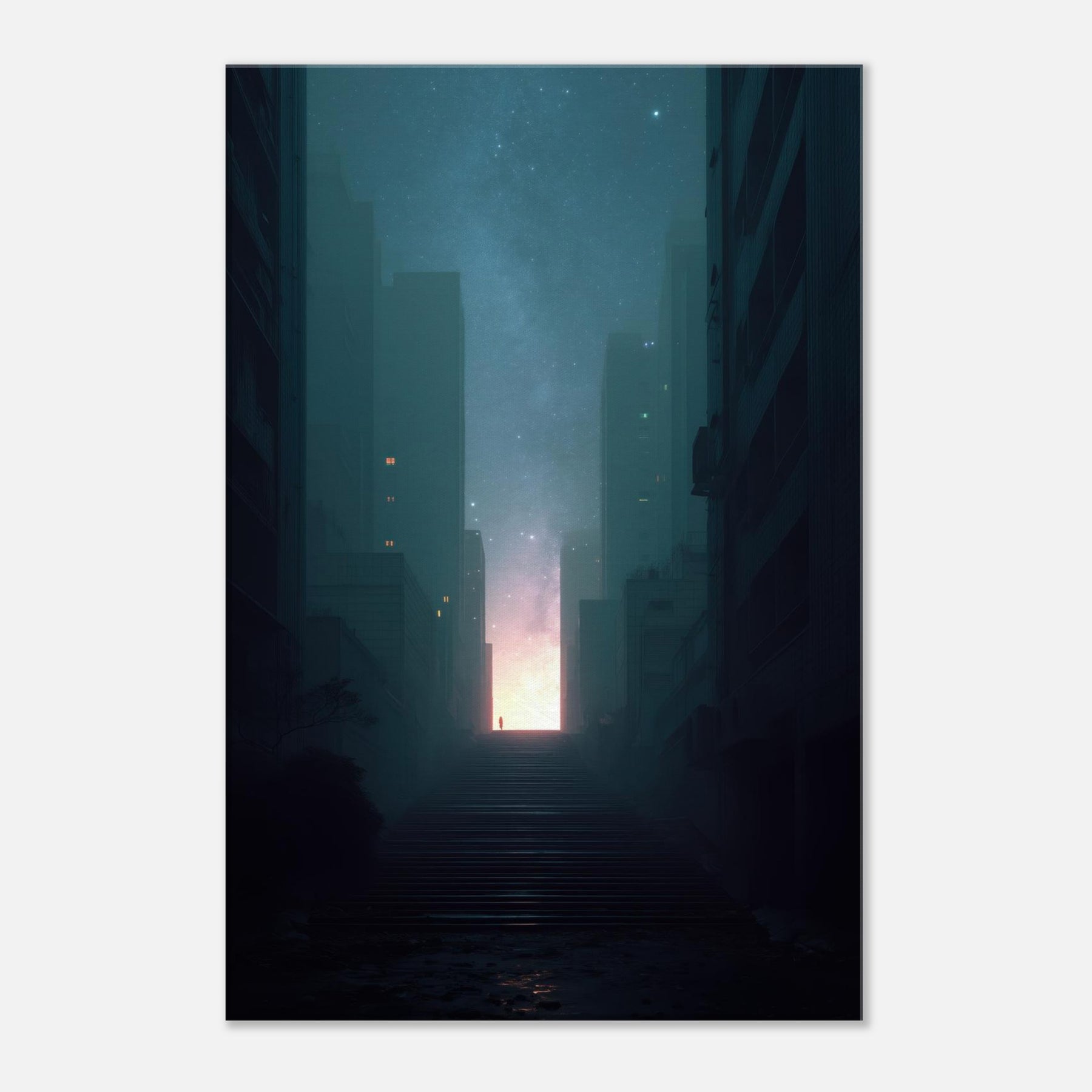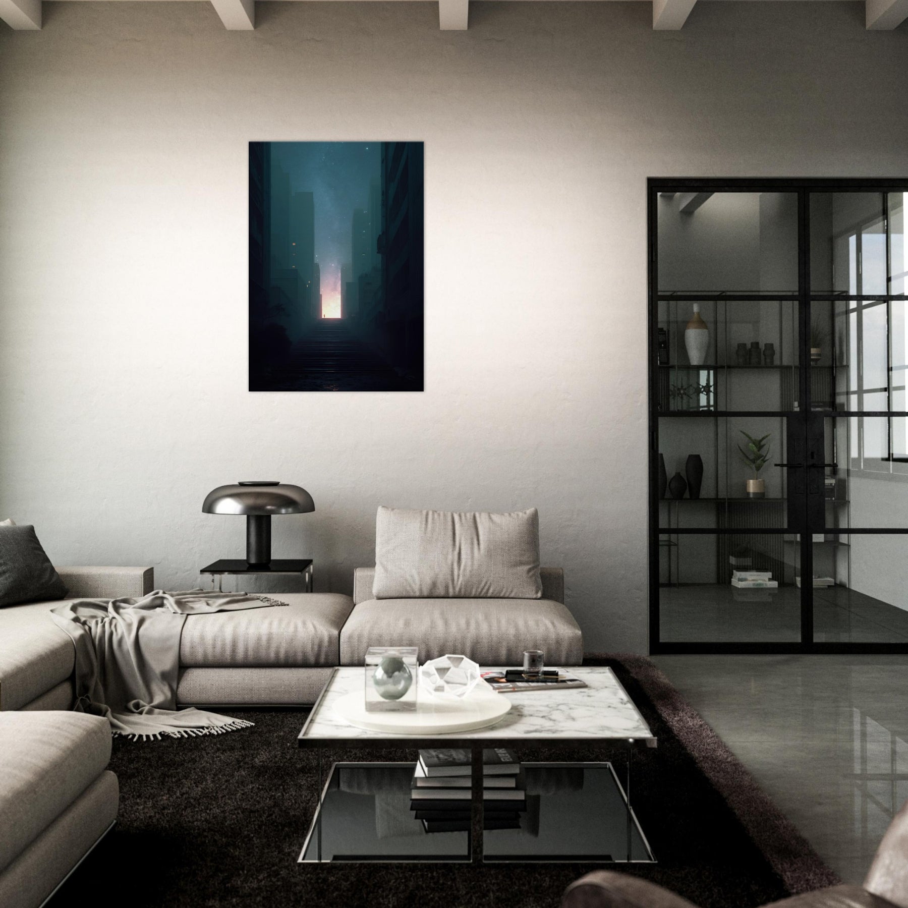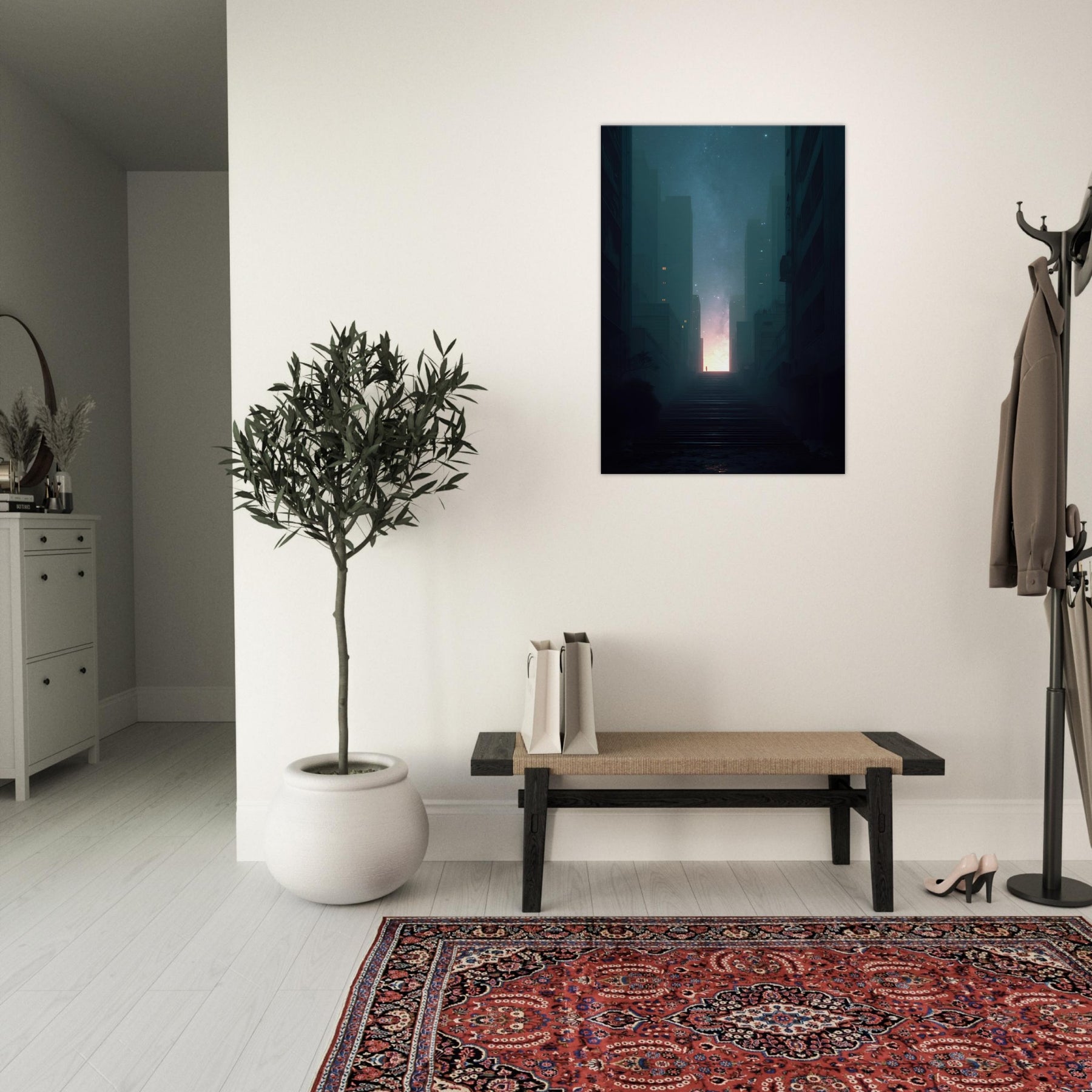 Tokyo rises like a breath of neon between twilight and stars. This image invites contemplation as a lone figure ascends a monumental stair toward a luminous doorway, where limited light spills into a city that feels both intimate and infinite. The air is cool and electric, the atmosphere a soft hum of distant traffic and constellations. Hang it to transform a living room into a nocturnal sanctuary, where memory and possibility mingle in velvet shadows.