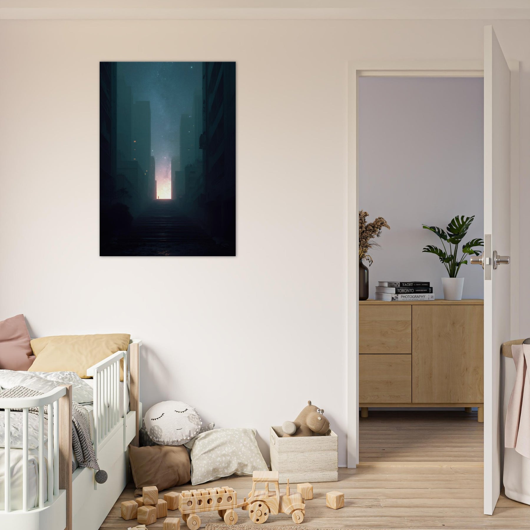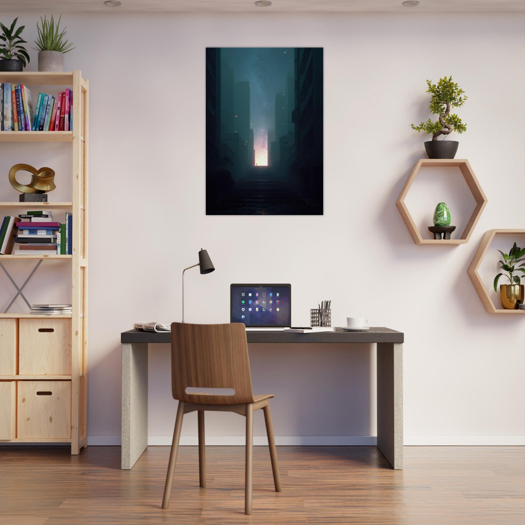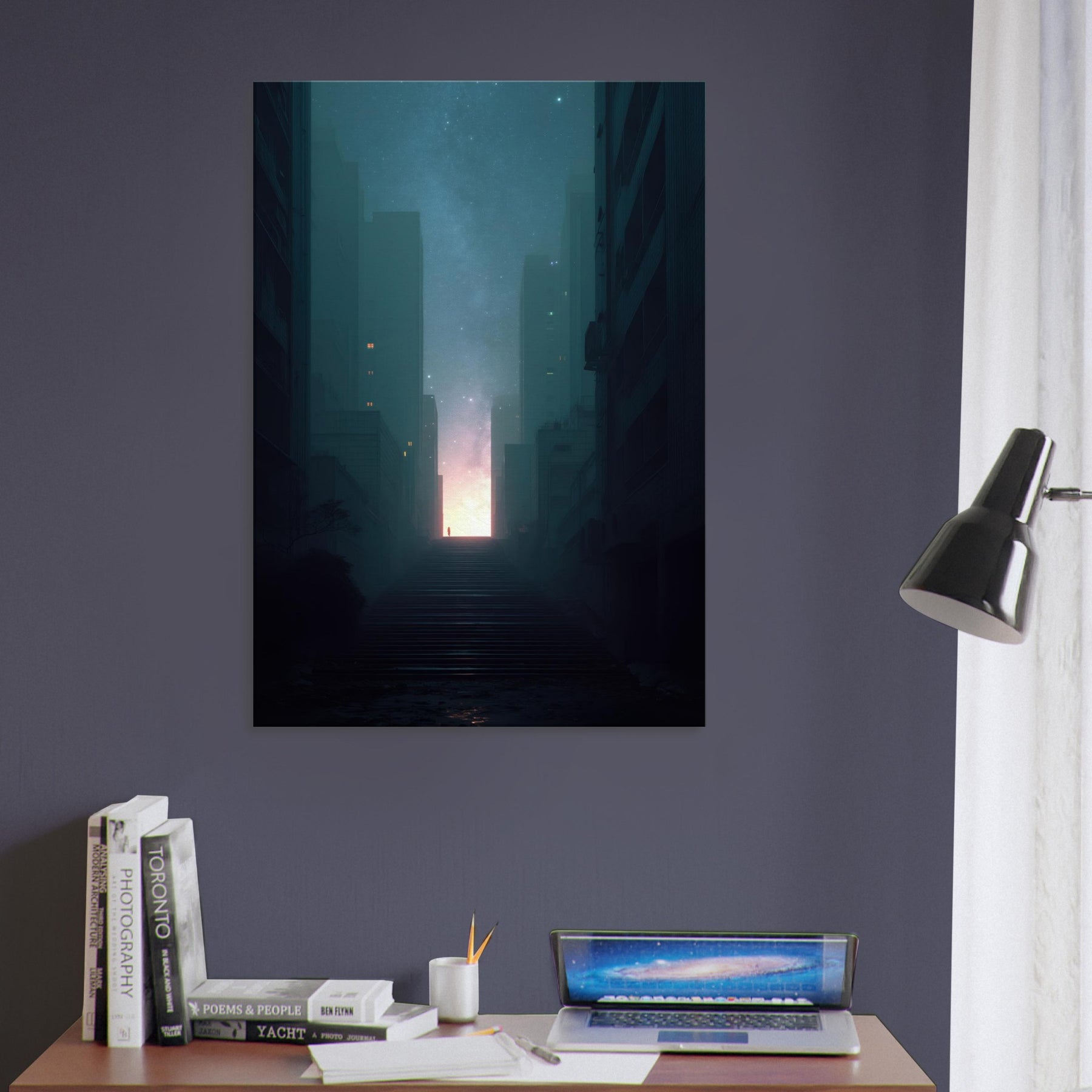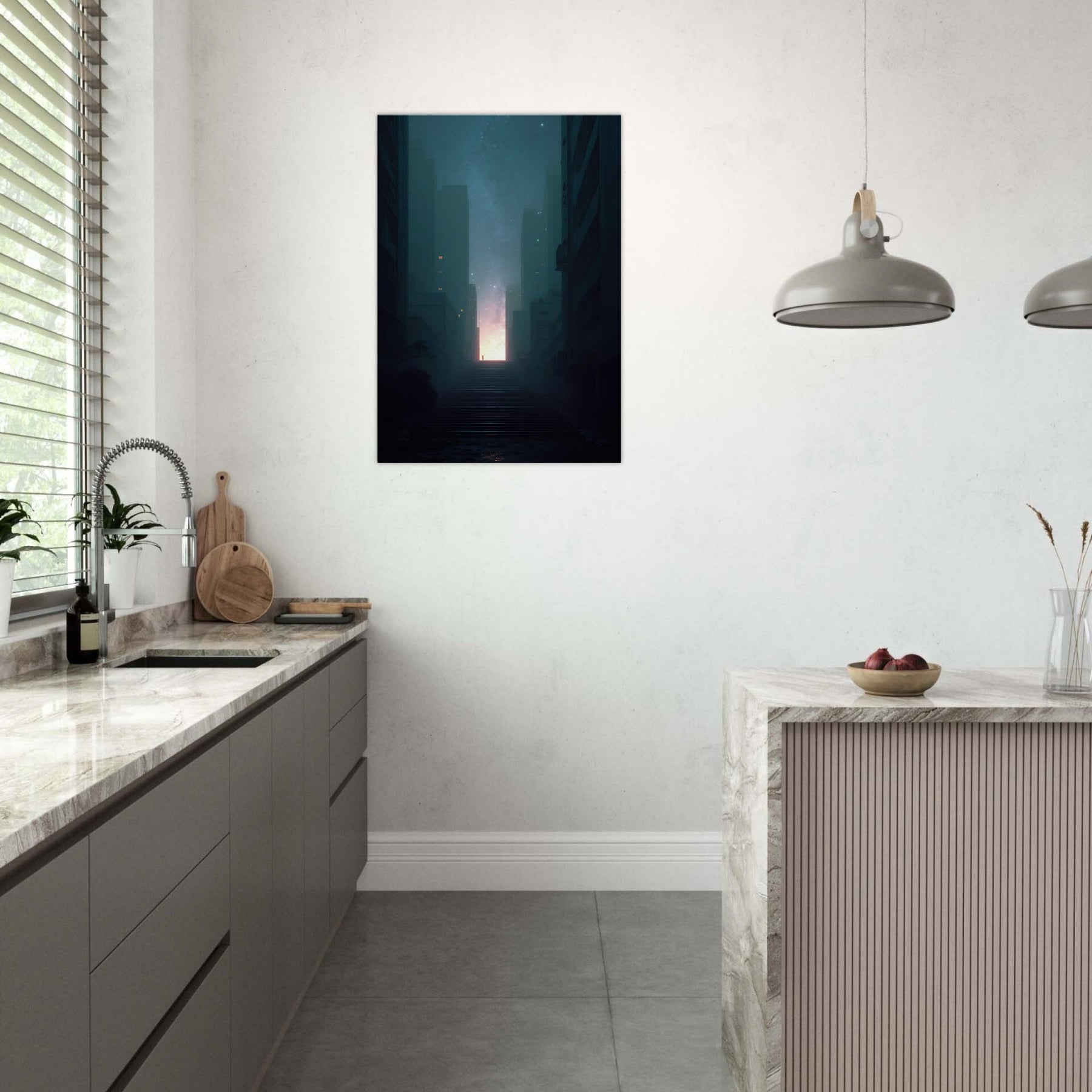 Tokyo rises like a breath of neon between twilight and stars. This image invites contemplation as a lone figure ascends a monumental stair toward a luminous doorway, where limited light spills into a city that feels both intimate and infinite. The air is cool and electric, the atmosphere a soft hum of distant traffic and constellations. Hang it to transform a living room into a nocturnal sanctuary, where memory and possibility mingle in velvet shadows.
