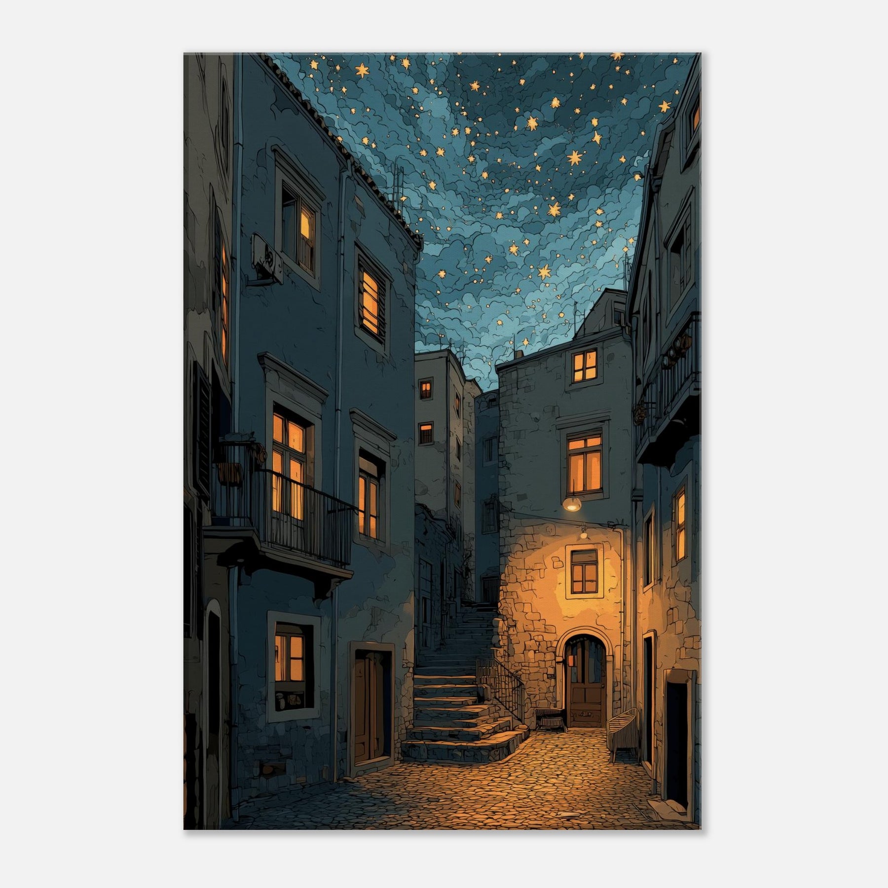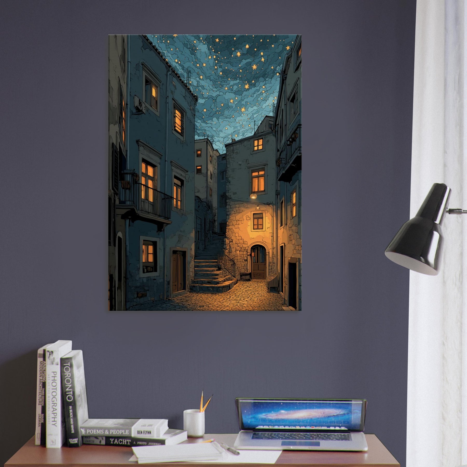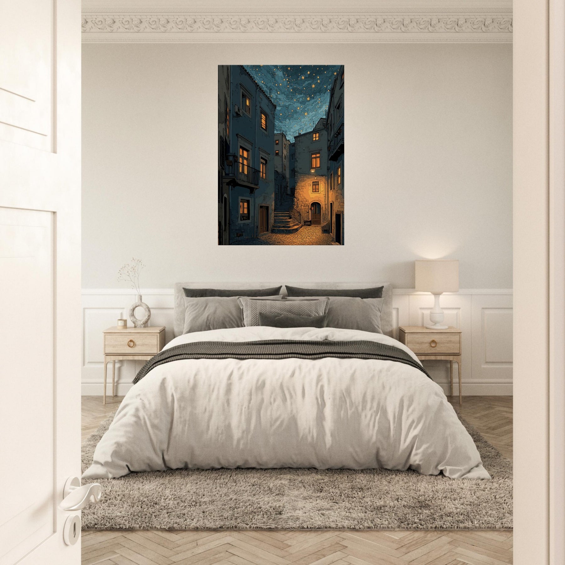European Streets unfold into a dreamlike tapestry, where moonlit clouds weave between forget me not stars and aged façades. This Surreal composition invites a quiet immersion: warm window light spills onto cobblestones, and stairwells spiral toward unknown horizons. The atmosphere is intimate yet expansive, turning a hall into a nocturnal promenade. In your living space, the piece becomes a soft conversation between memory and invention an emblem of urban poetry that elevates everyday rituals with cinematic intimacy and a sense of wonder.
