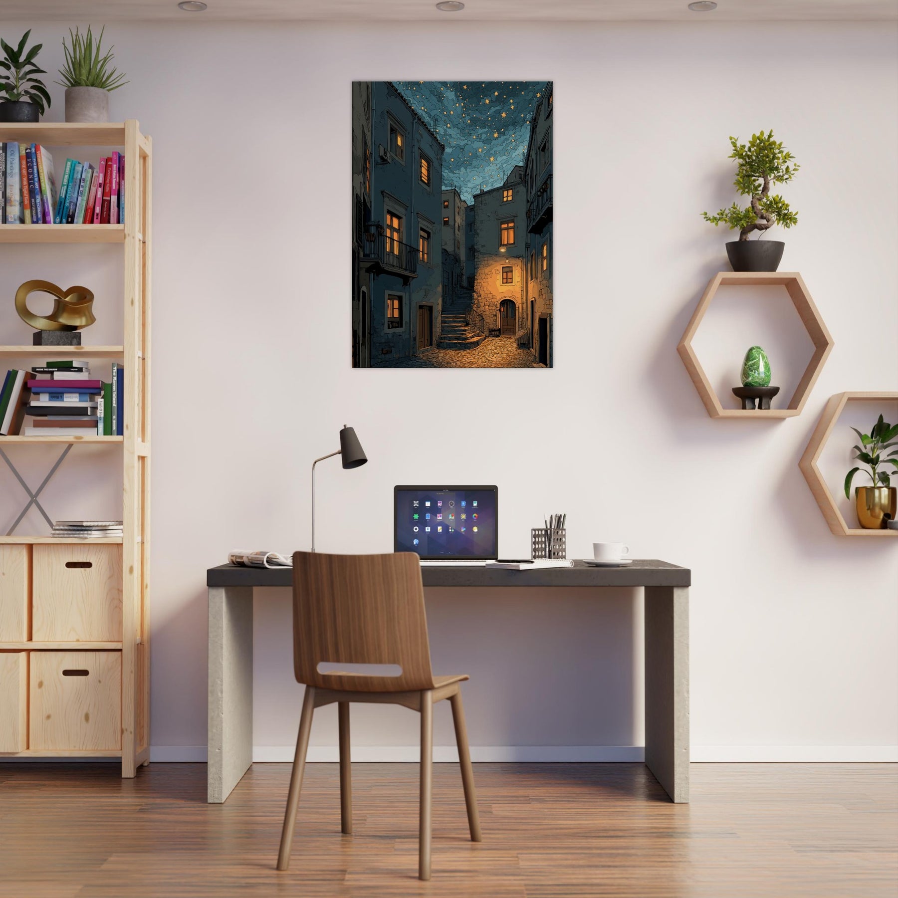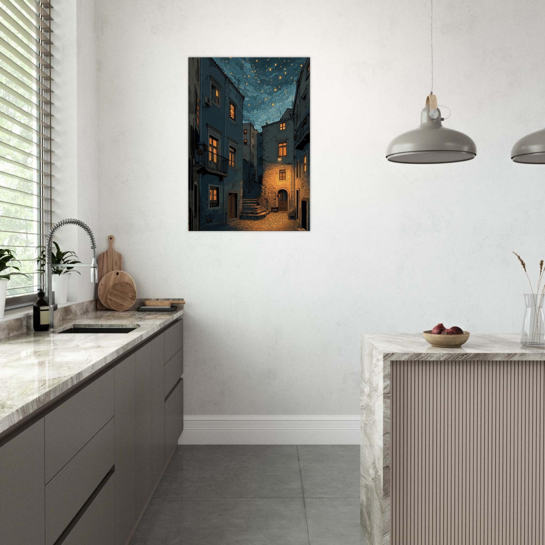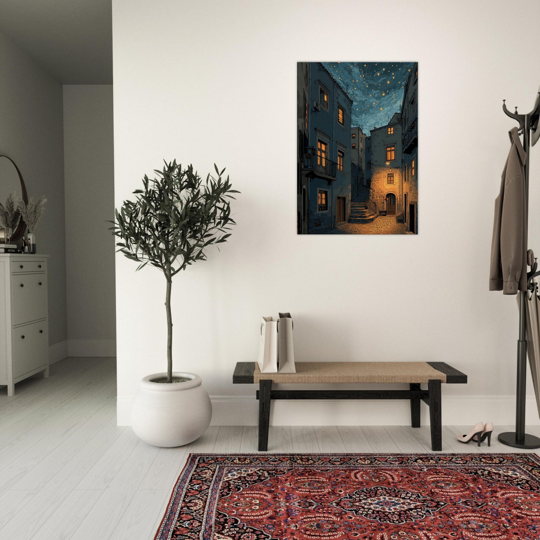 European Streets unfold into a dreamlike tapestry, where moonlit clouds weave between forget me not stars and aged façades. This Surreal composition invites a quiet immersion: warm window light spills onto cobblestones, and stairwells spiral toward unknown horizons. The atmosphere is intimate yet expansive, turning a hall into a nocturnal promenade. In your living space, the piece becomes a soft conversation between memory and invention an emblem of urban poetry that elevates everyday rituals with cinematic intimacy and a sense of wonder.