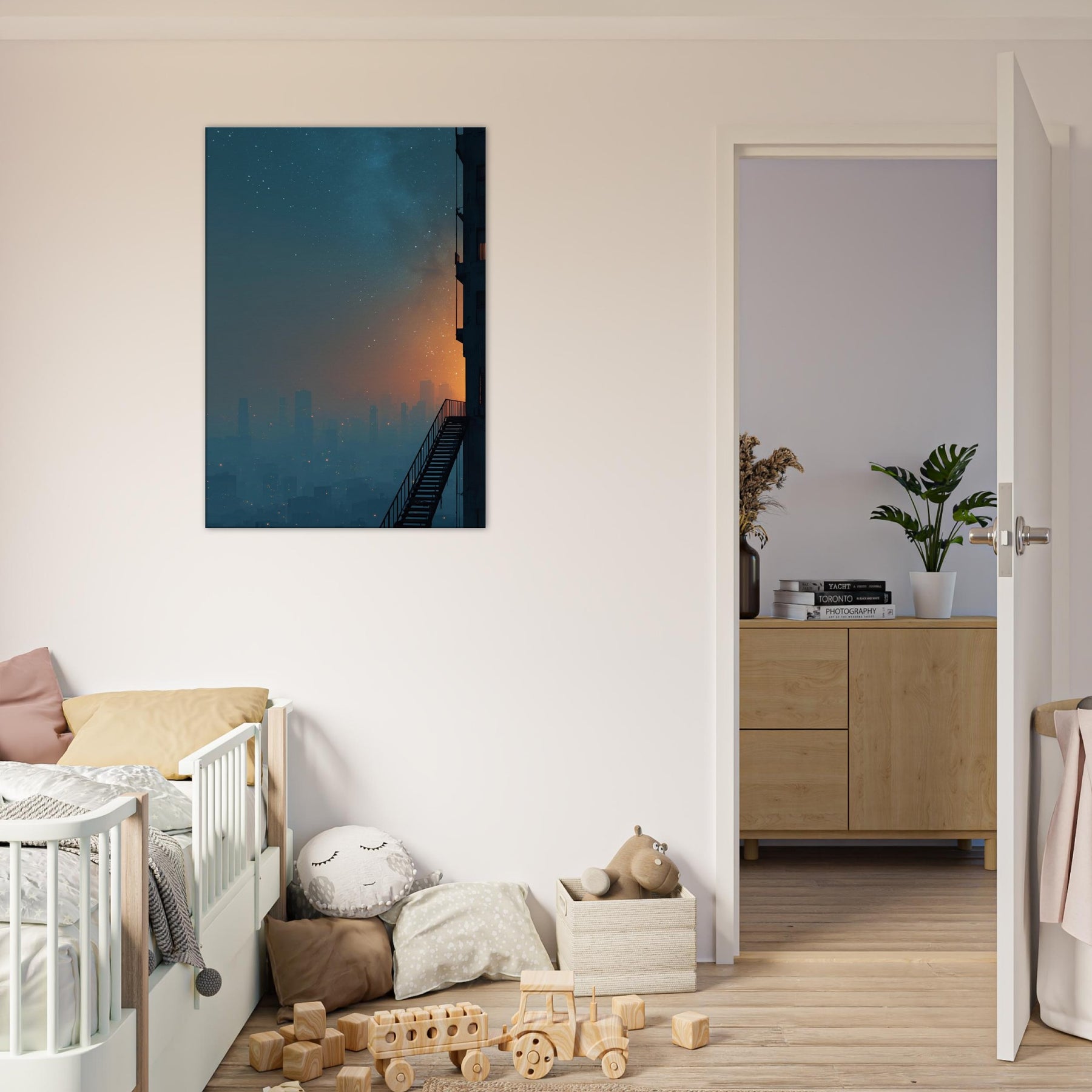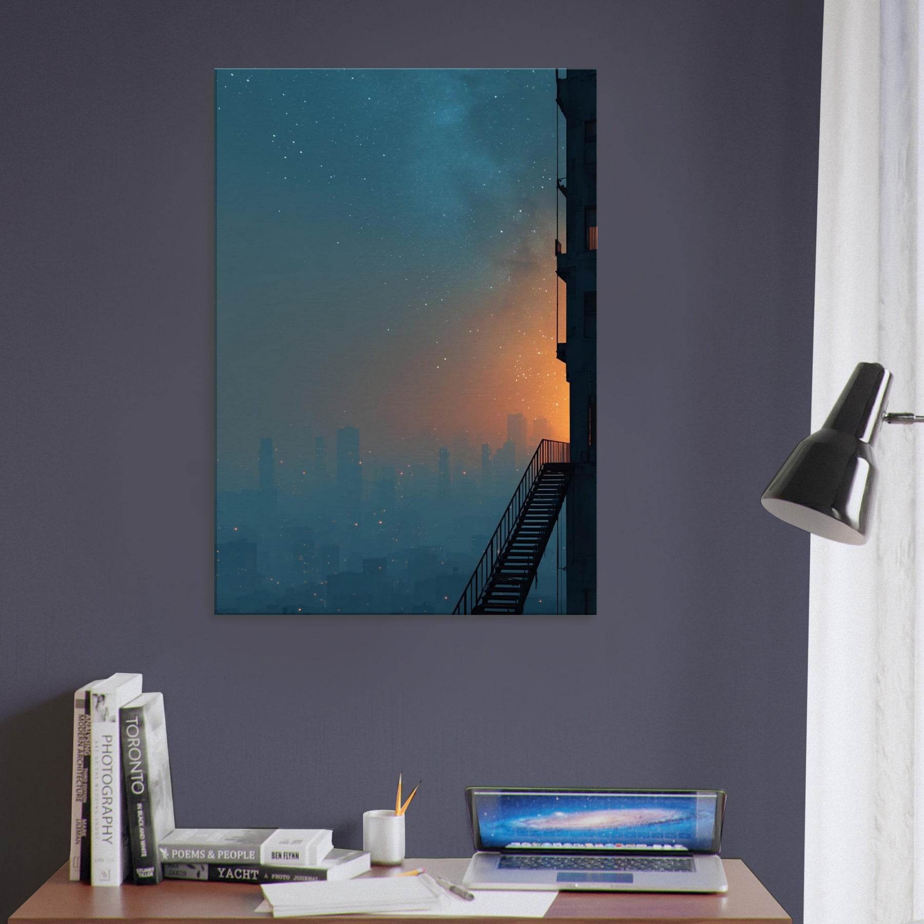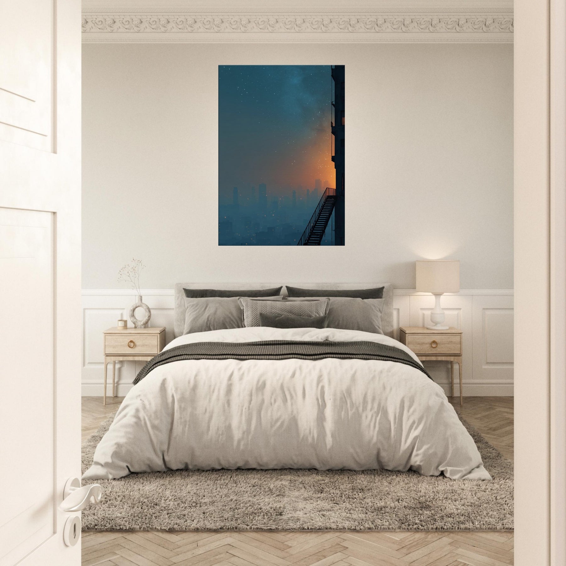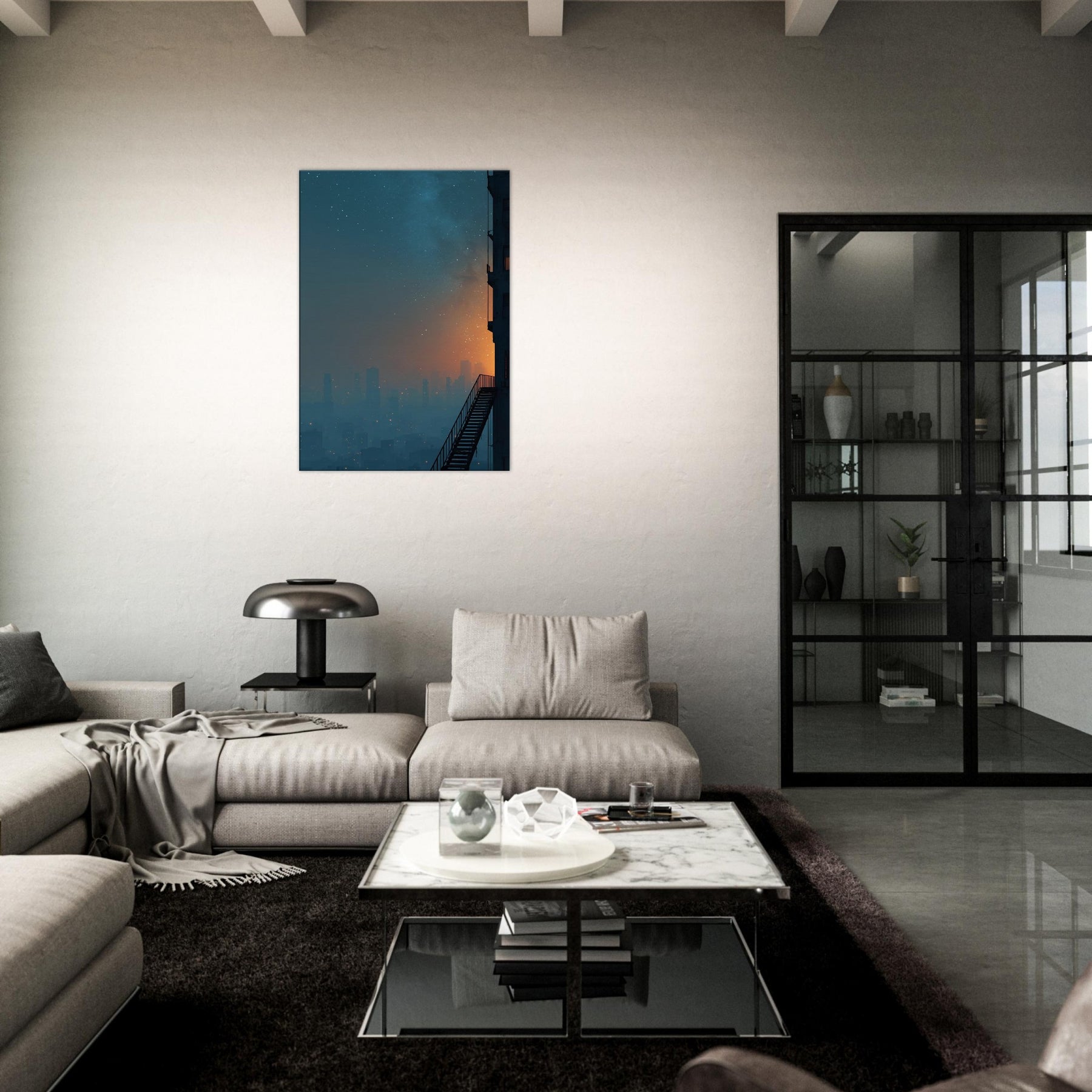 This surreal vista invites you into a Cyberpunk City where dusk falls in ribbons of electric orange and midnight blue. The skyline dissolves into dreamlike silhouettes, while a fire escape climbs the frame like a melody of steel. In this tableau, the ordinary becomes extraordinary, gifting your living space a quiet hum of neon, rain slick streets, and secret horizons. Hang it above a sofa or desk to anchor conversations with a mood of wonder, contemplation, and urban nocturne that glows from within.