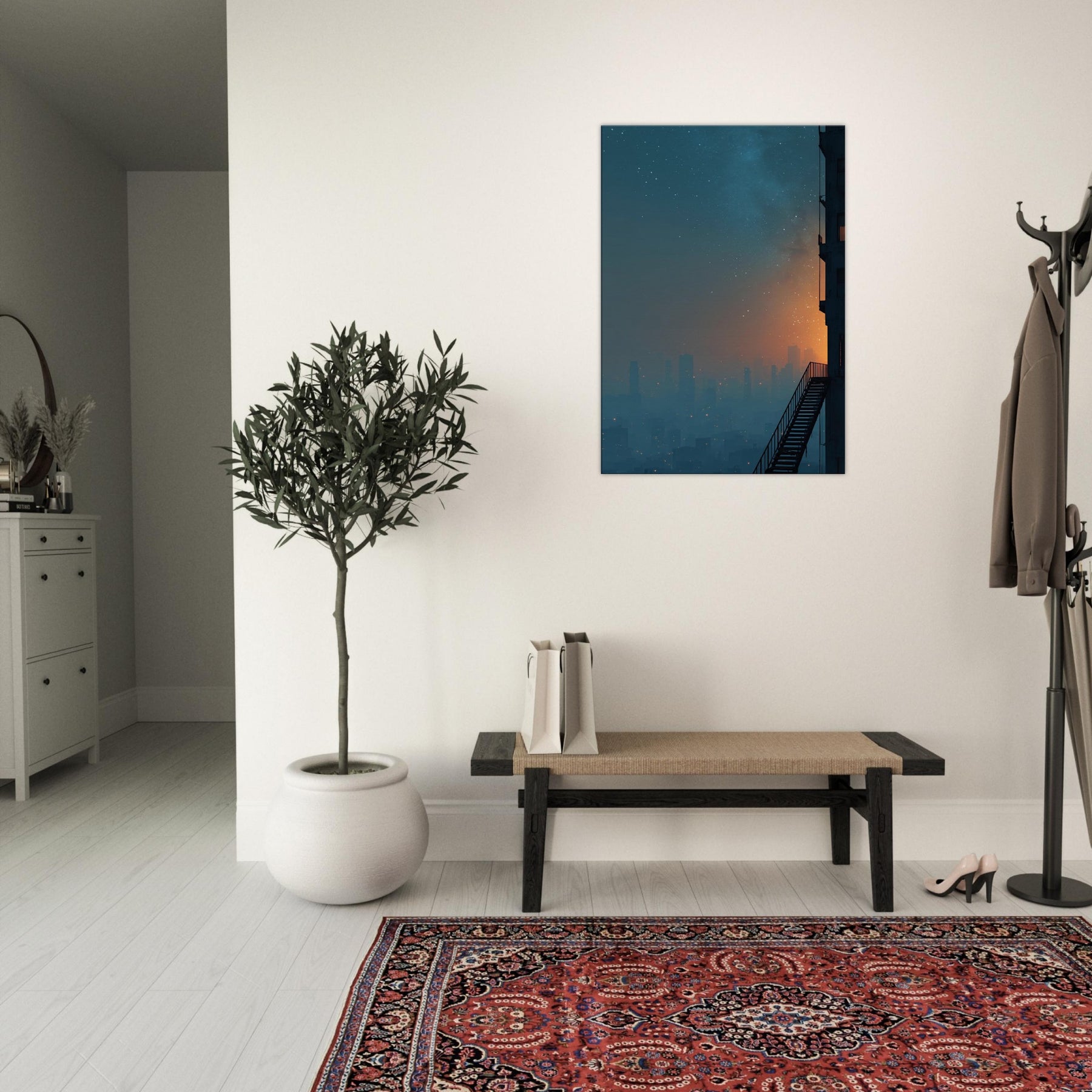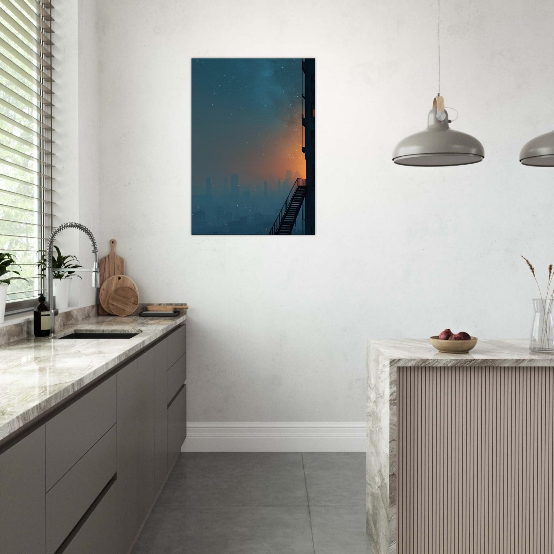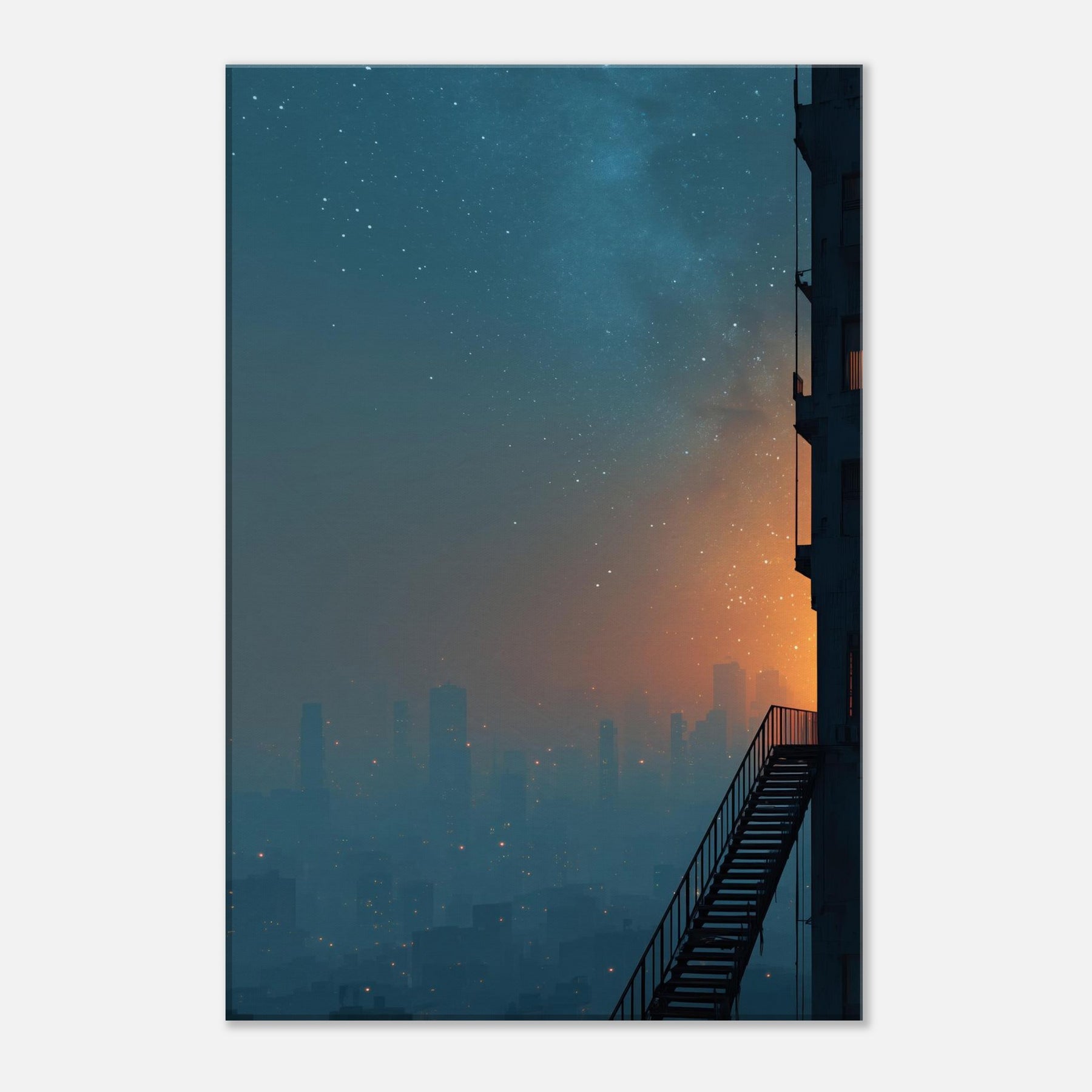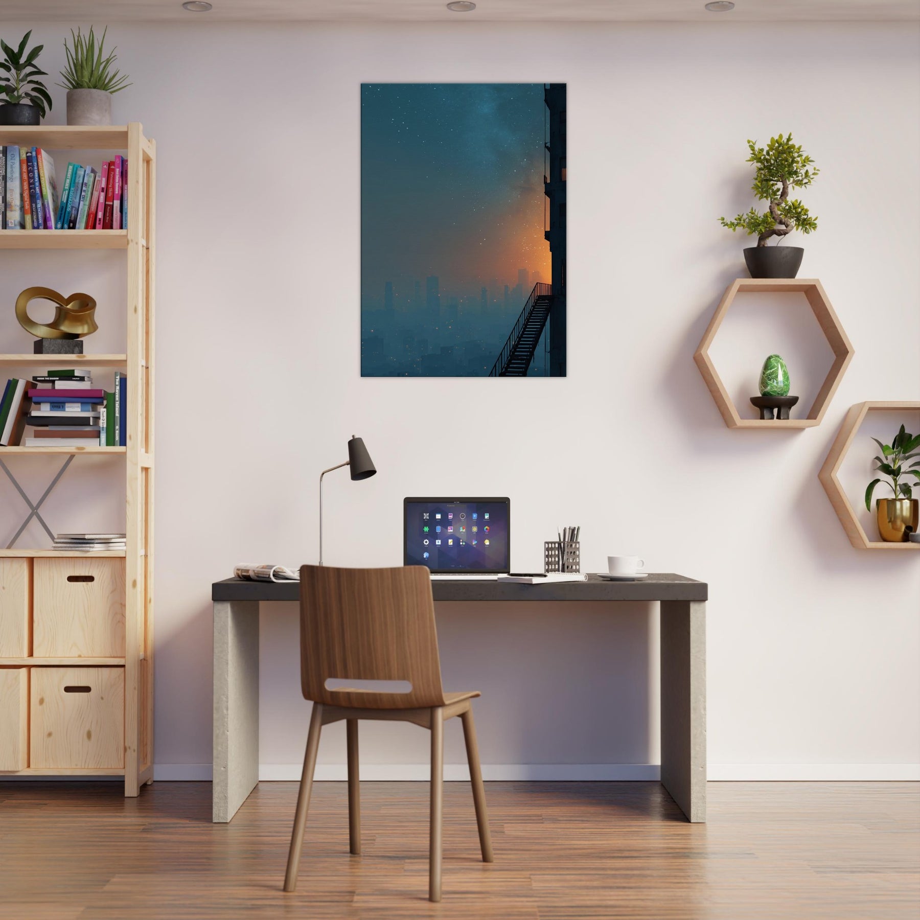 This surreal vista invites you into a Cyberpunk City where dusk falls in ribbons of electric orange and midnight blue. The skyline dissolves into dreamlike silhouettes, while a fire escape climbs the frame like a melody of steel. In this tableau, the ordinary becomes extraordinary, gifting your living space a quiet hum of neon, rain slick streets, and secret horizons. Hang it above a sofa or desk to anchor conversations with a mood of wonder, contemplation, and urban nocturne that glows from within.