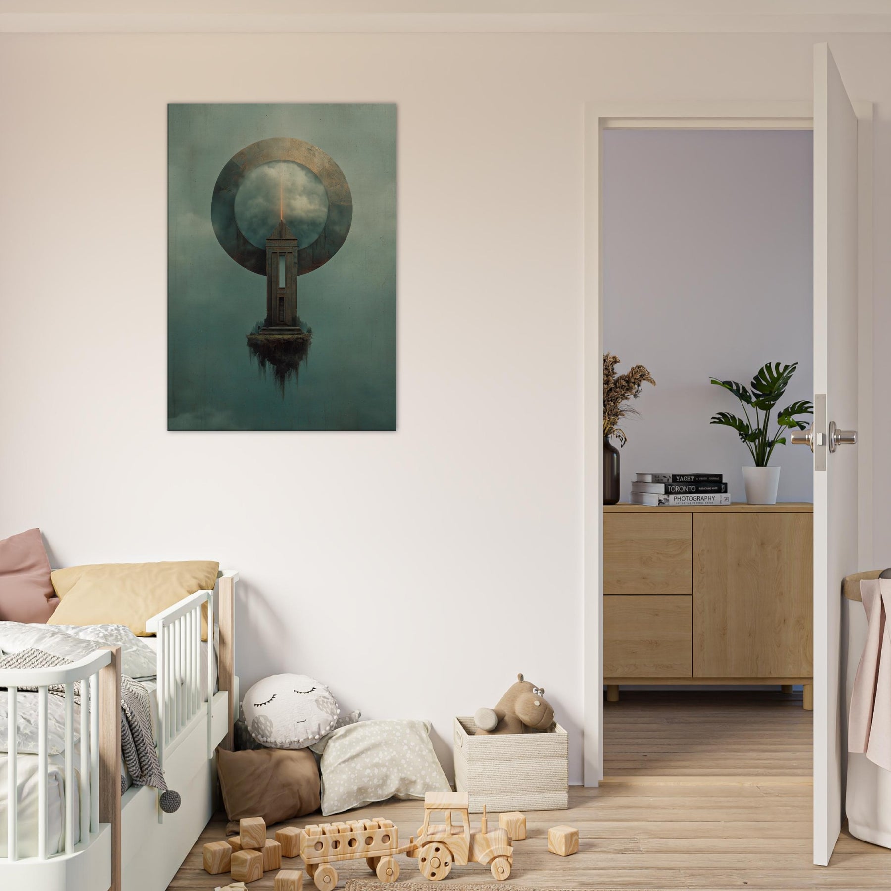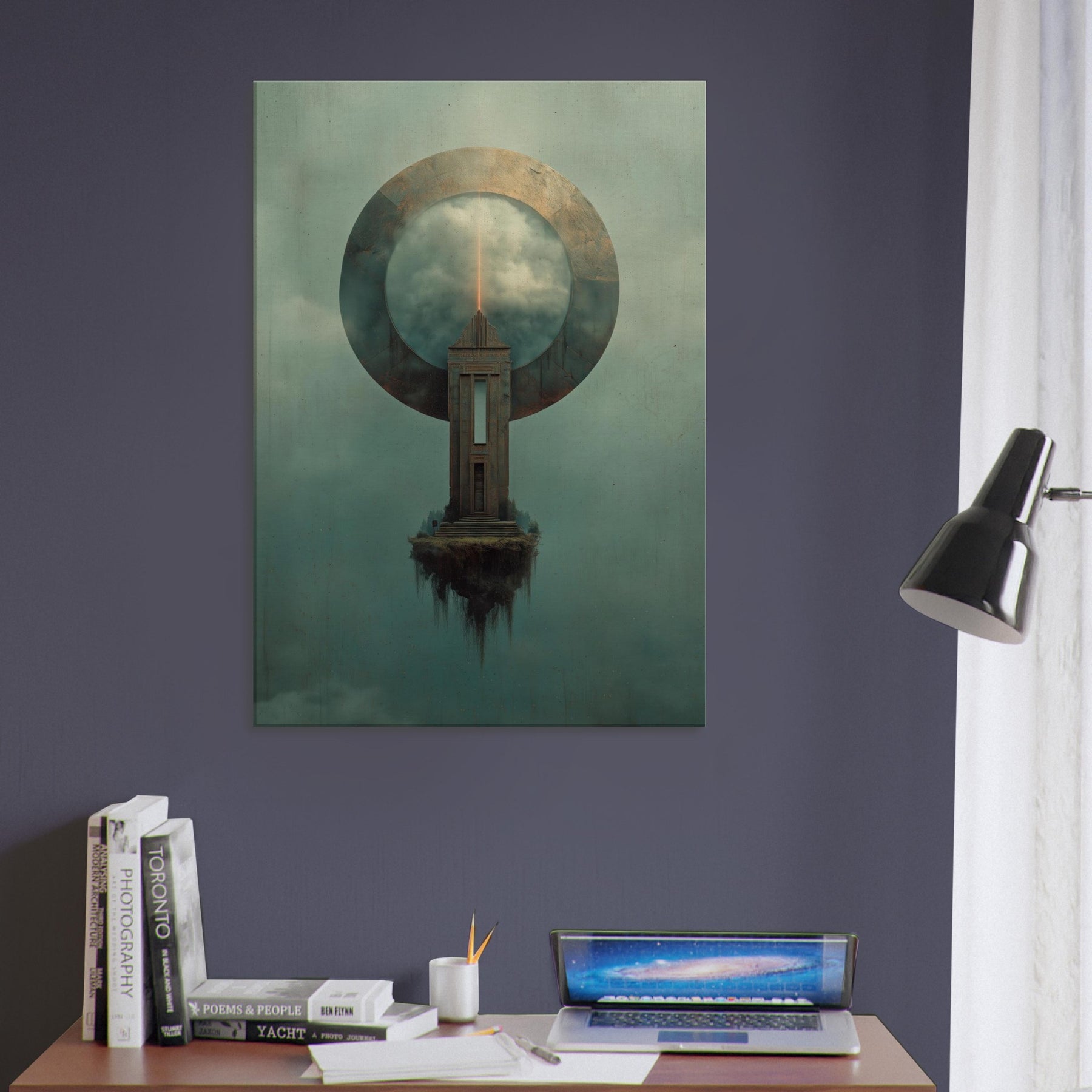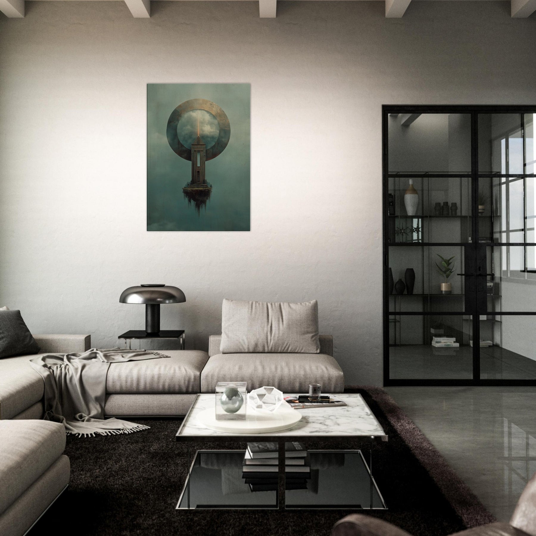 Let this surreal portal incline your living room toward wonder. A weathered arch rises from a misty void, crowned by a circular ring that cradles a pale dawn. A single beacon climbs the gate, inviting quiet reflection as if time paused to listen. The Ankh, rendered not as symbol but as breath eternity tethered to the present imbues the space with mystery and calm. Hang it above a sofa or console; let the atmosphere soften walls and awaken conversation.