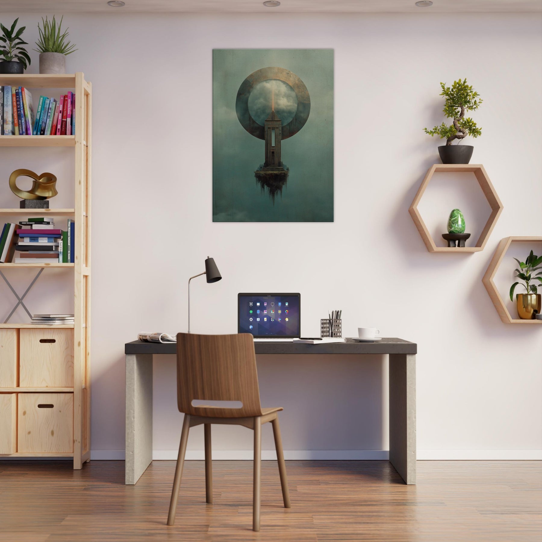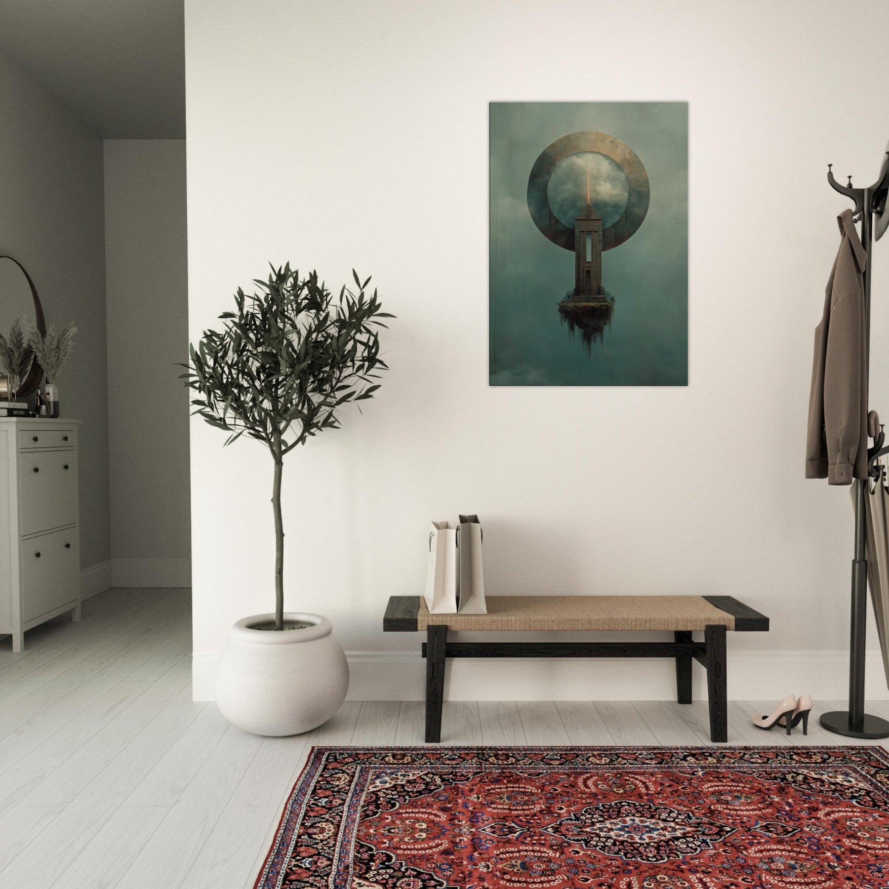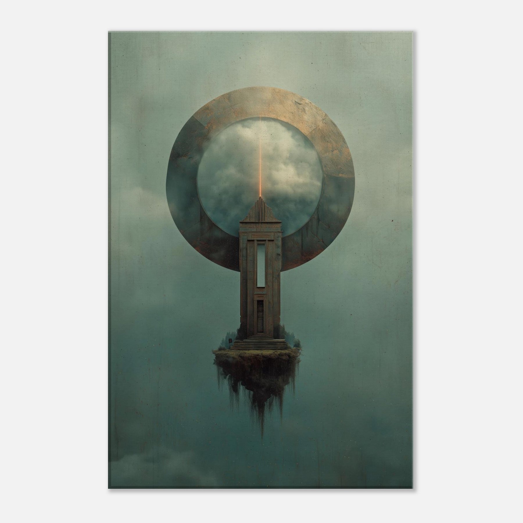Let this surreal portal incline your living room toward wonder. A weathered arch rises from a misty void, crowned by a circular ring that cradles a pale dawn. A single beacon climbs the gate, inviting quiet reflection as if time paused to listen. The Ankh, rendered not as symbol but as breath eternity tethered to the present imbues the space with mystery and calm. Hang it above a sofa or console; let the atmosphere soften walls and awaken conversation.